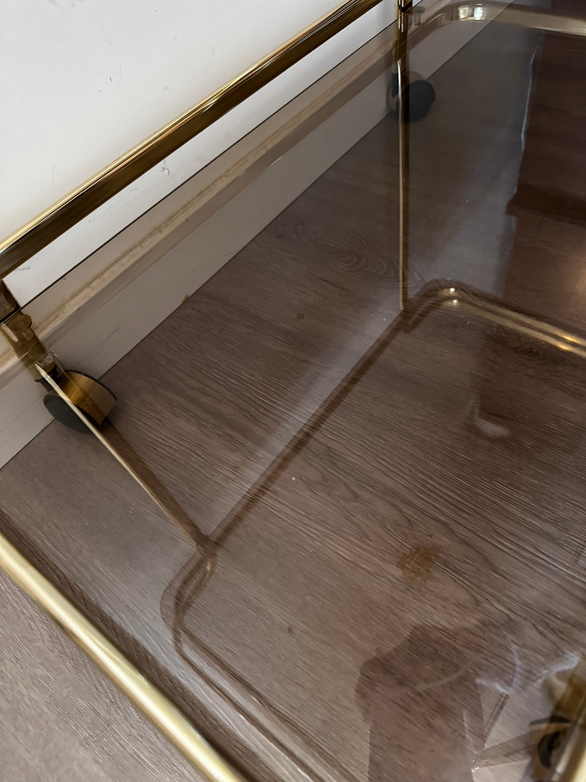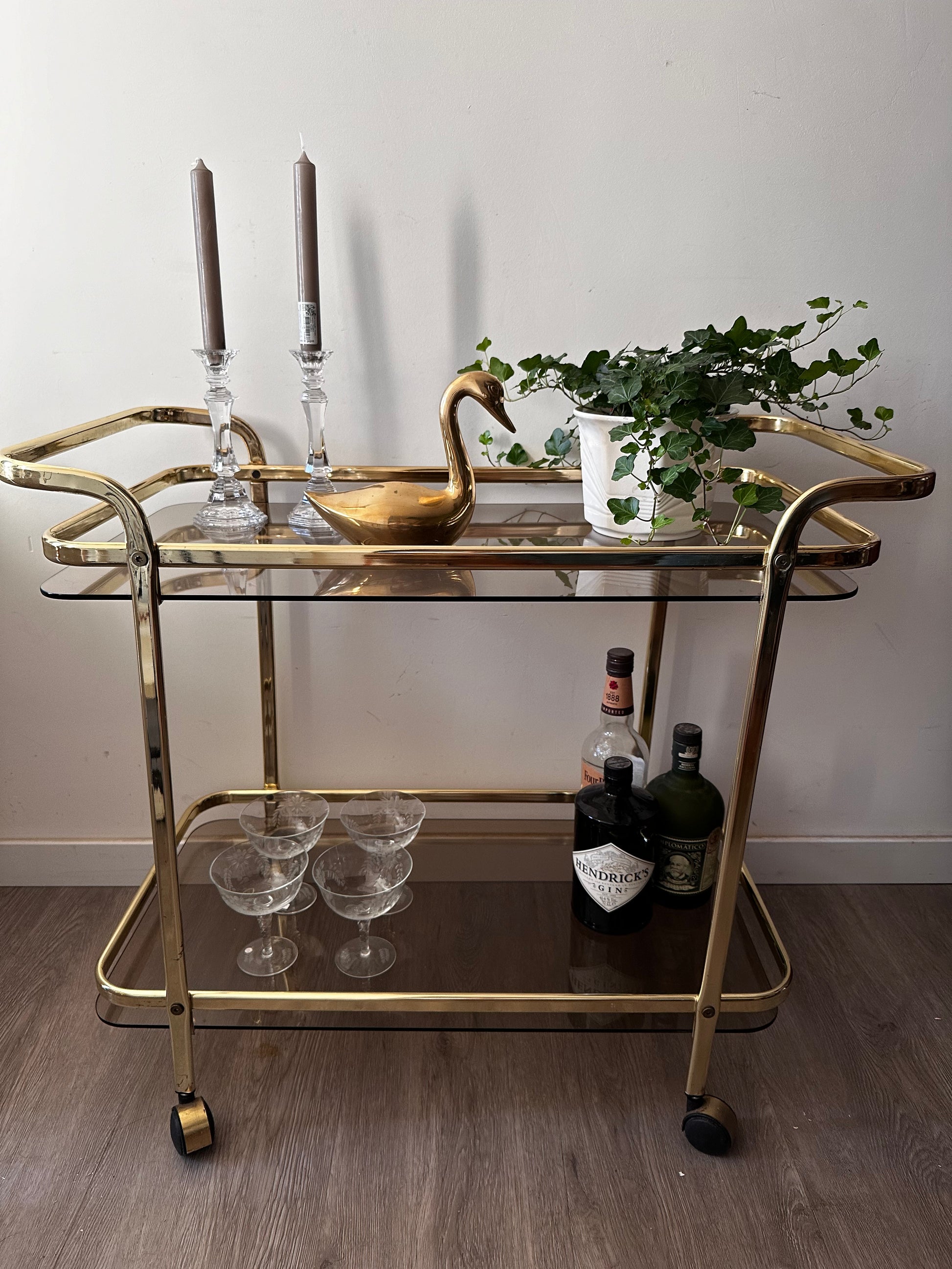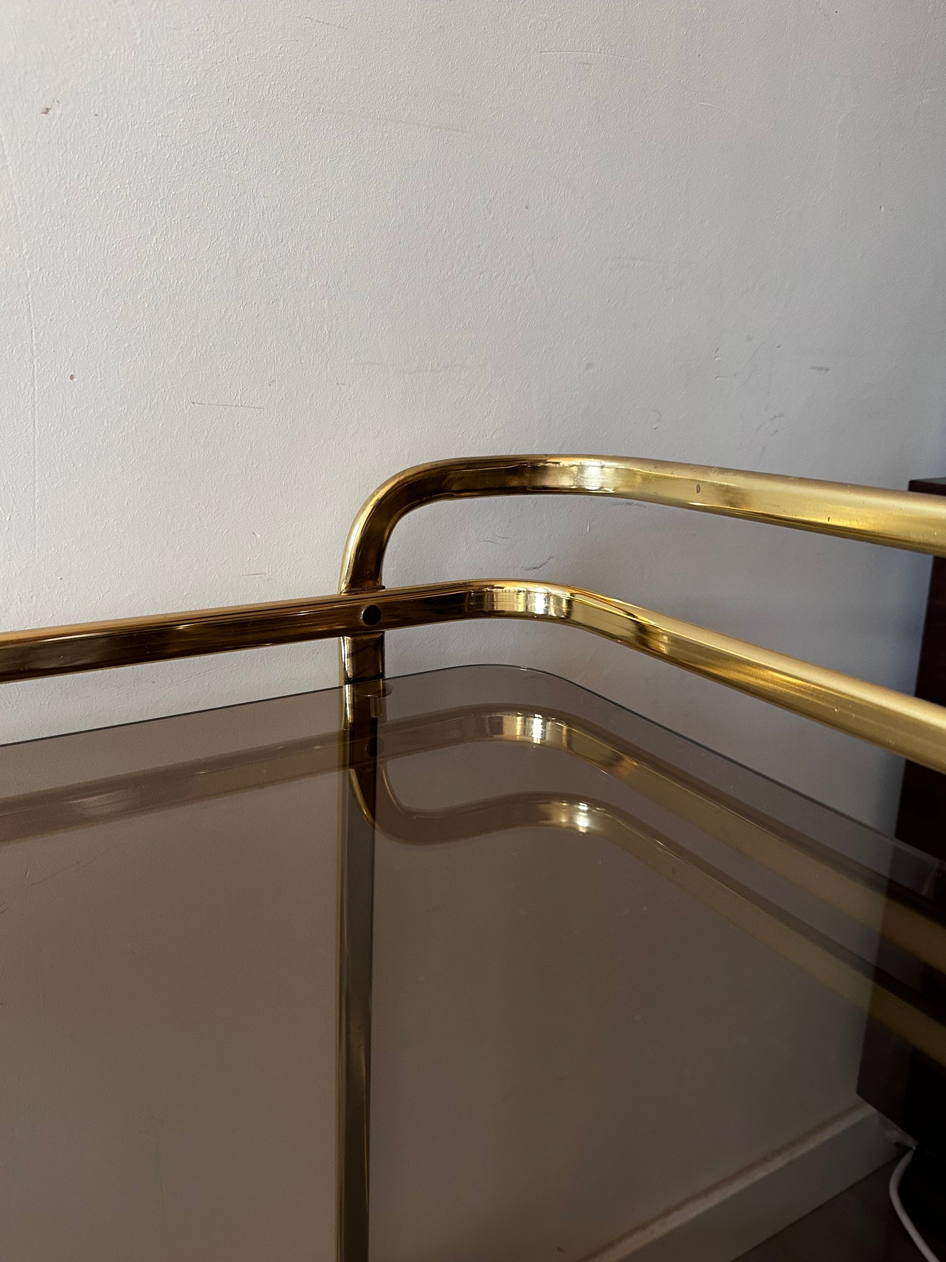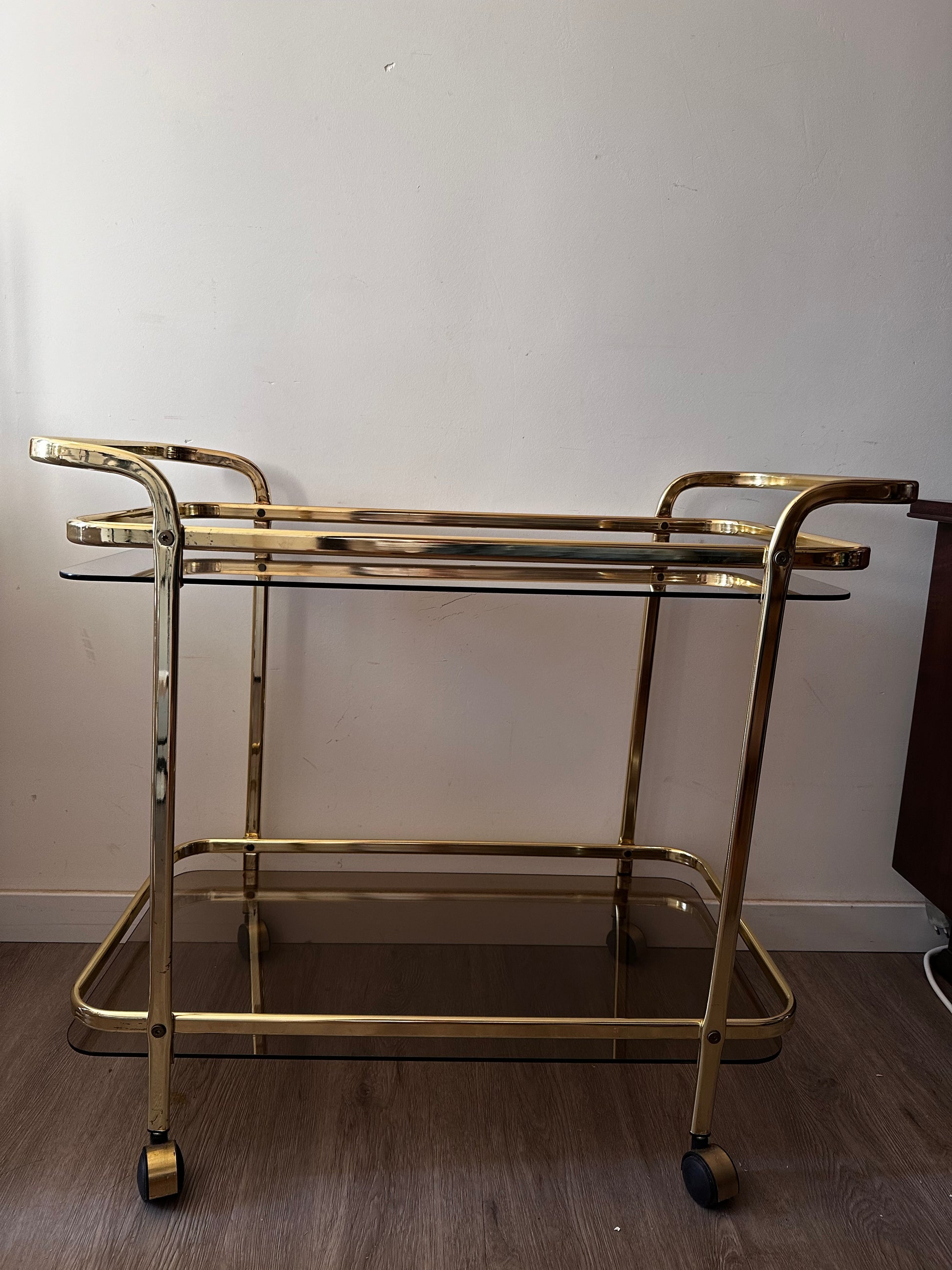 Te gekke Hollywood Regency serveerwagen. Deze serveertrolley is in een mooie vintage staat. Heeft lichte gebruiksporen op het messing en op het rookglas. Serveerwagen staat op wieltjes die nog uitstekend rijden.