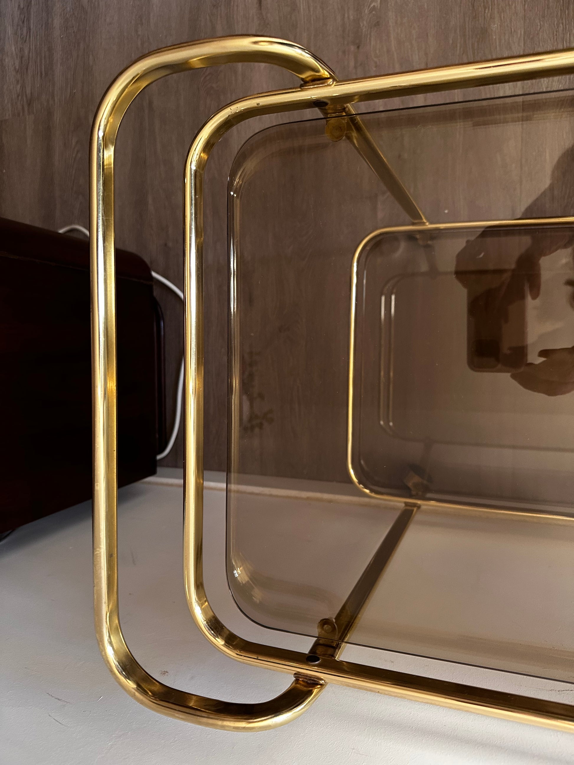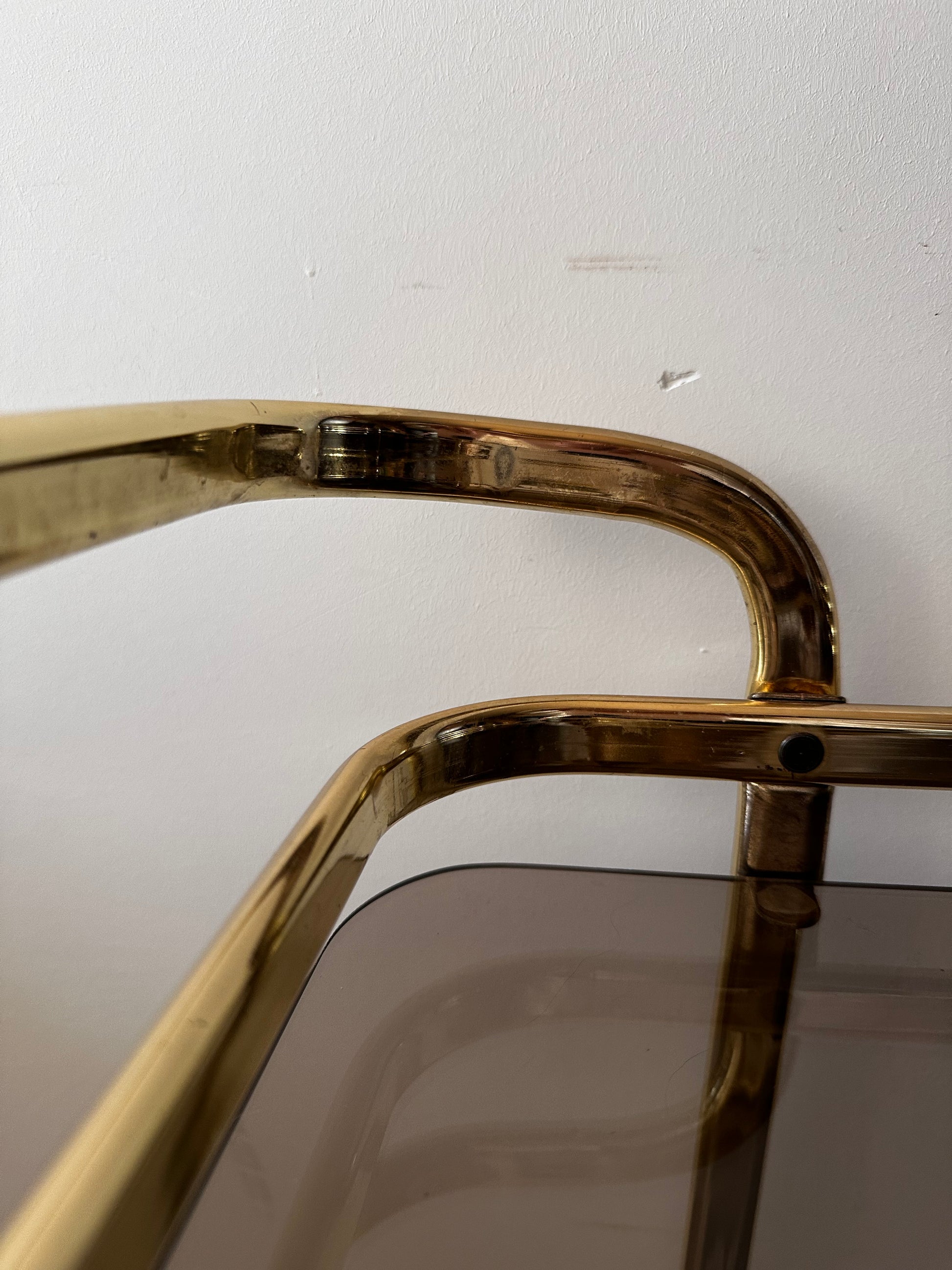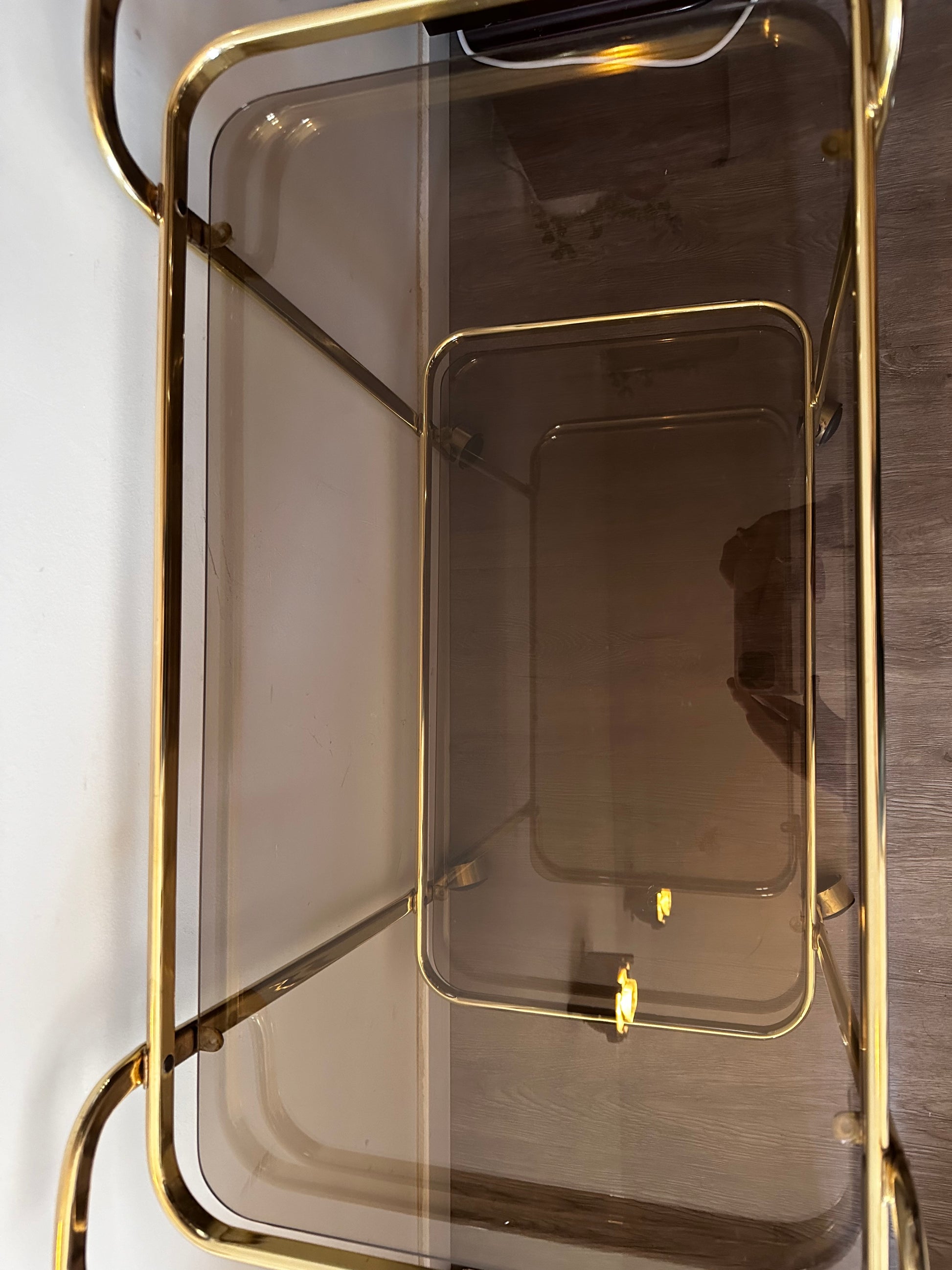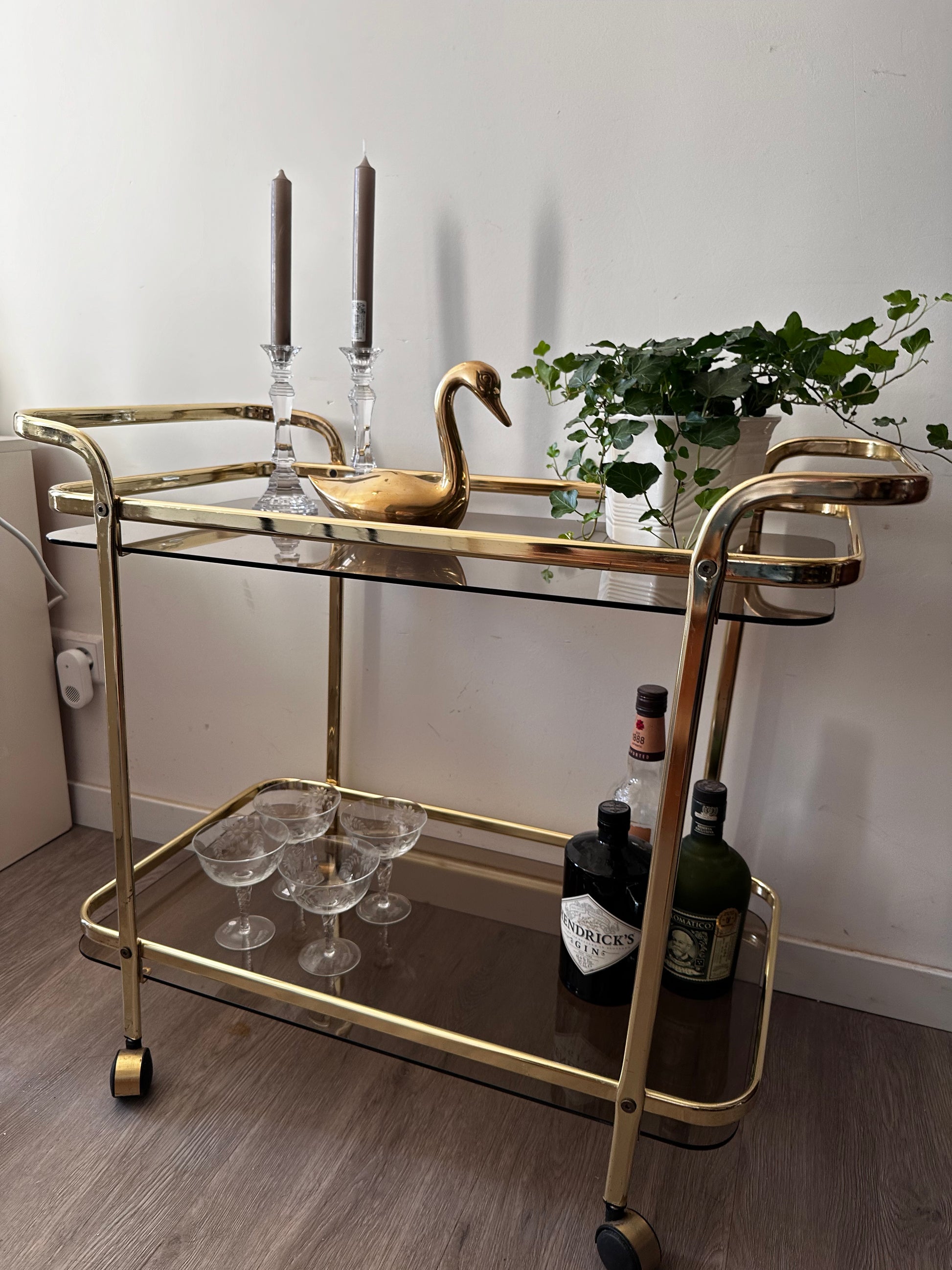 Te gekke Hollywood Regency serveerwagen. Deze serveertrolley is in een mooie vintage staat. Heeft lichte gebruiksporen op het messing en op het rookglas. Serveerwagen staat op wieltjes die nog uitstekend rijden.