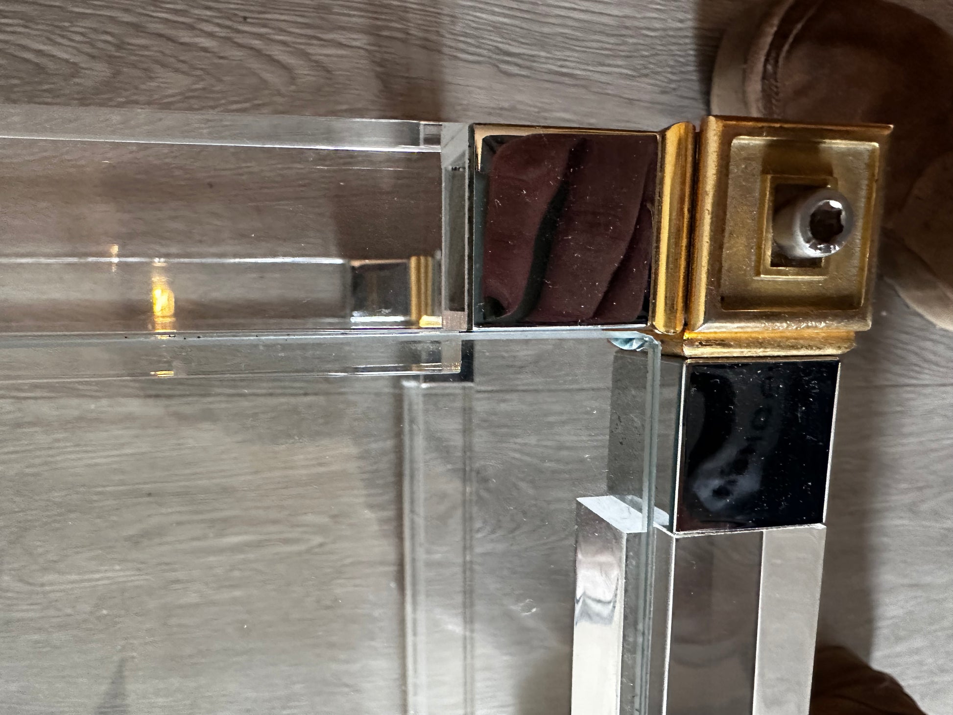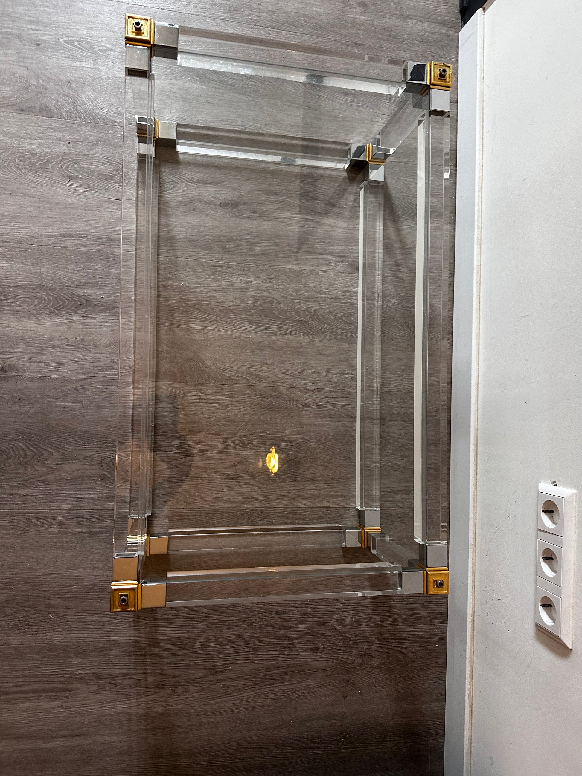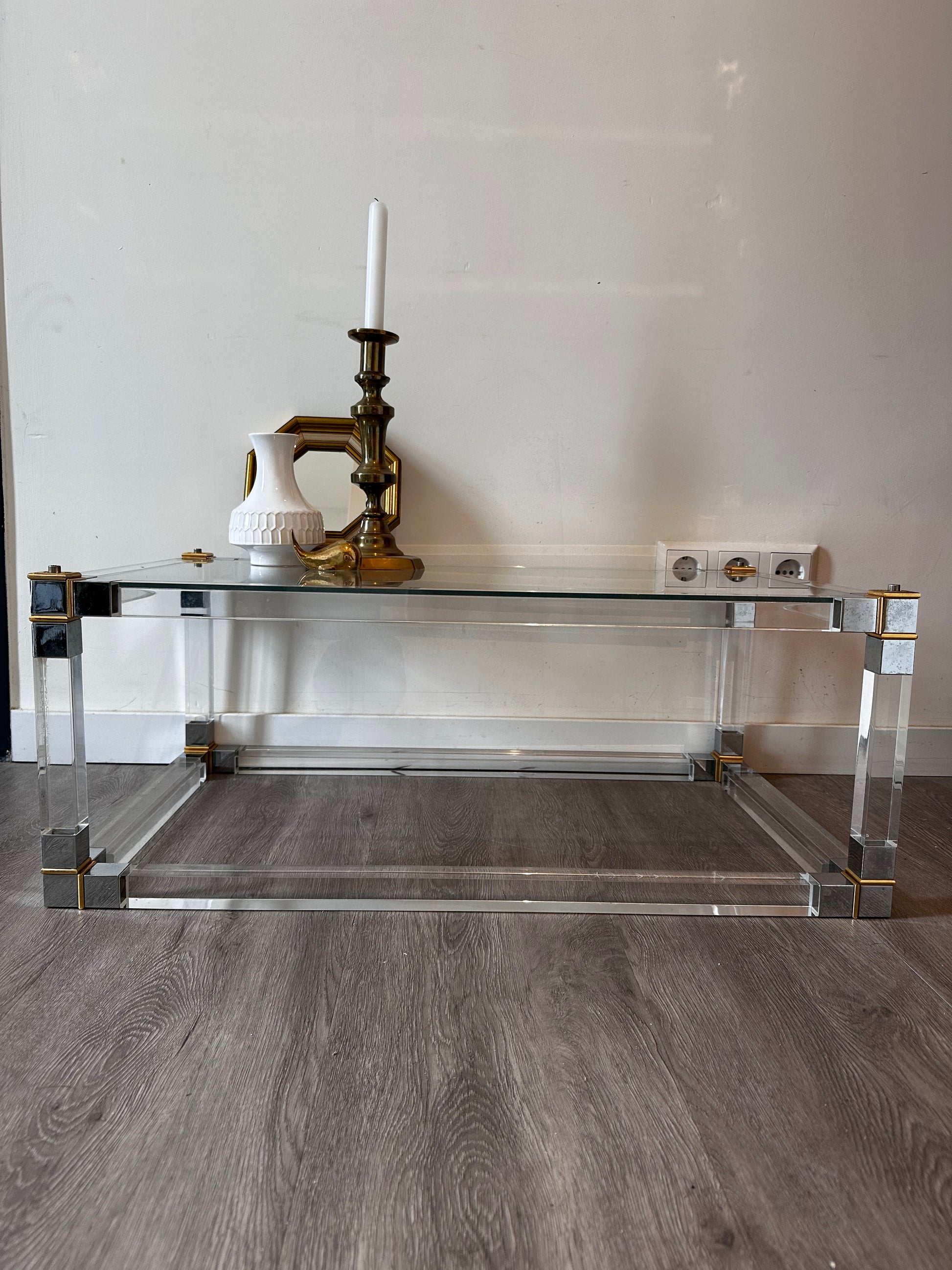 Super toffe salontafel in de stijl van Hollywood Regency. In een mooie vintage staat. Glas is nog super zit 1 klein chipje aan de onderkant maar de bovenkant is helemaal in tact. Goudkleurige details op de hoeken van de tafel. Plexiglas heeft wat lichte gebruikssporen.
