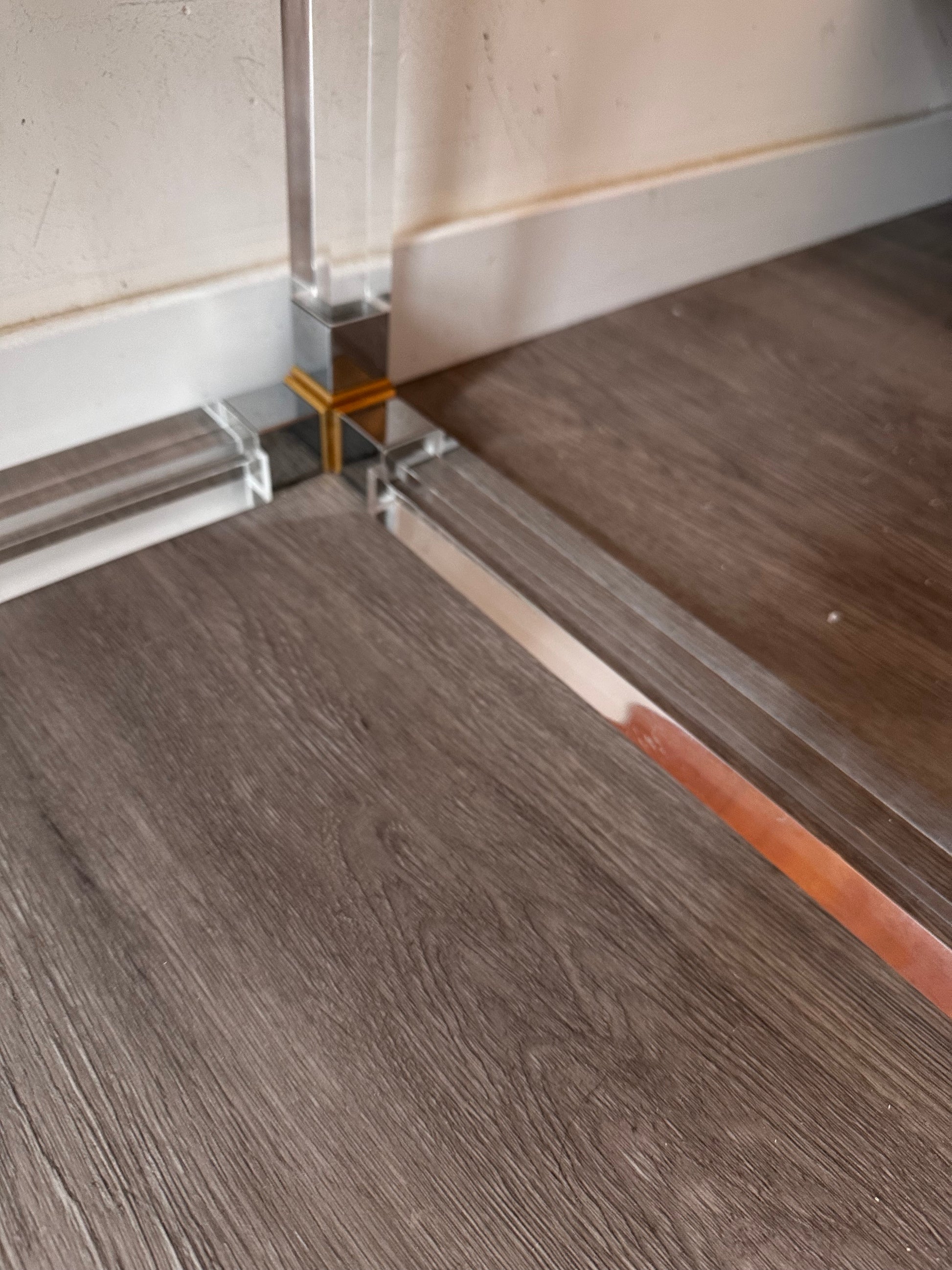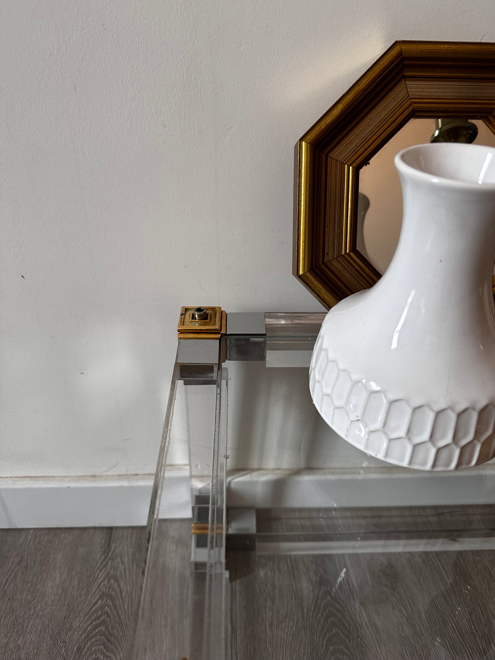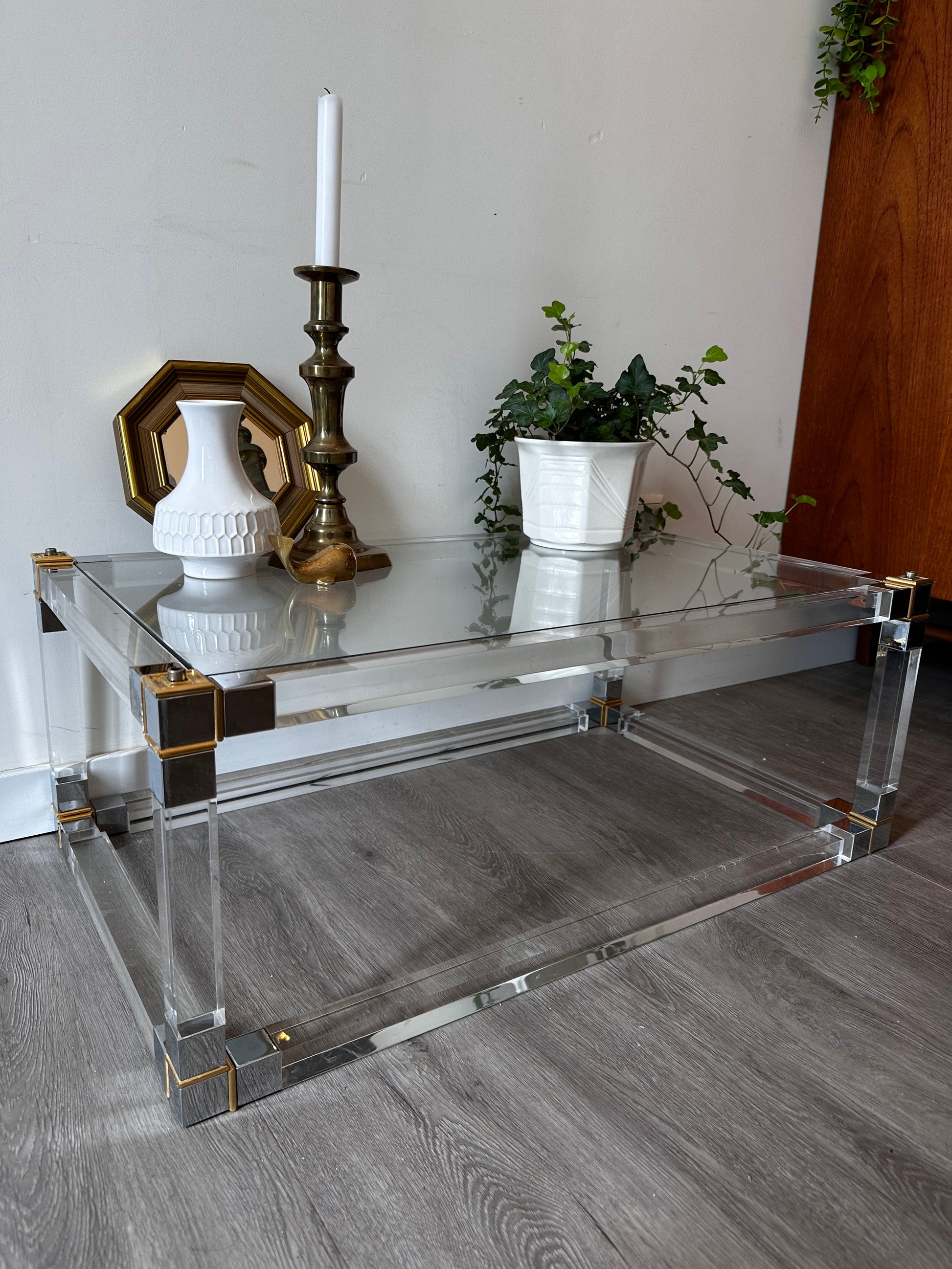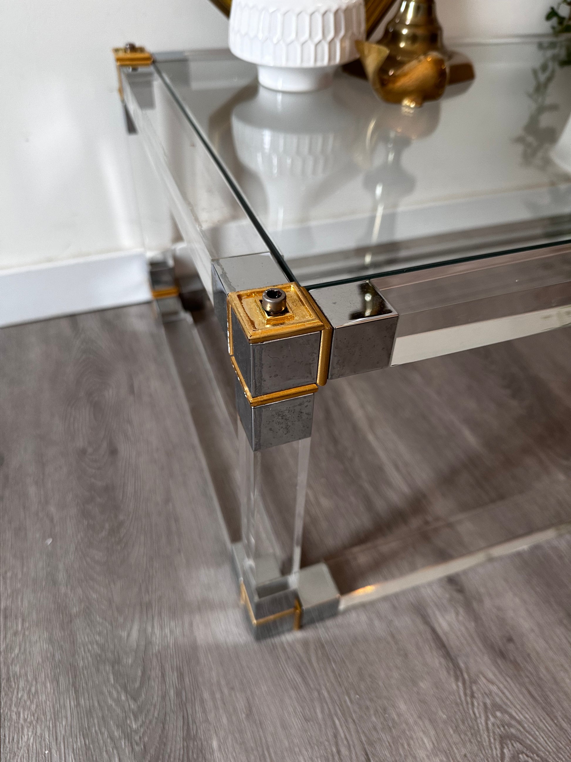 Super toffe salontafel in de stijl van Hollywood Regency. In een mooie vintage staat. Glas is nog super zit 1 klein chipje aan de onderkant maar de bovenkant is helemaal in tact. Goudkleurige details op de hoeken van de tafel. Plexiglas heeft wat lichte gebruikssporen.