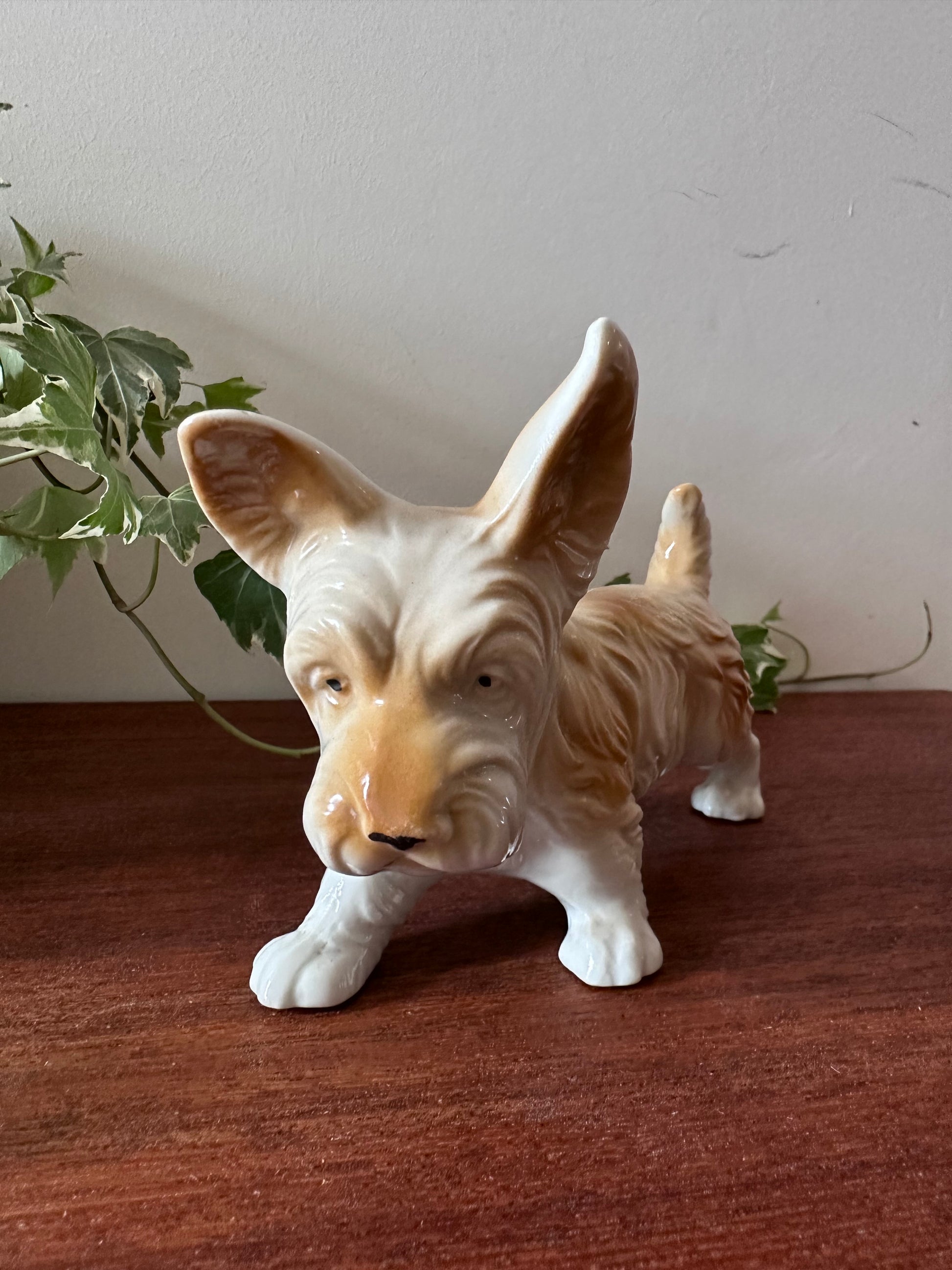 Wat een schat van een hondje. Dit prachtige beeldje is van keramiek. Wit met beige kleur en in een mooie vintage staat. Komt deze mooie terriër bij jou staan?