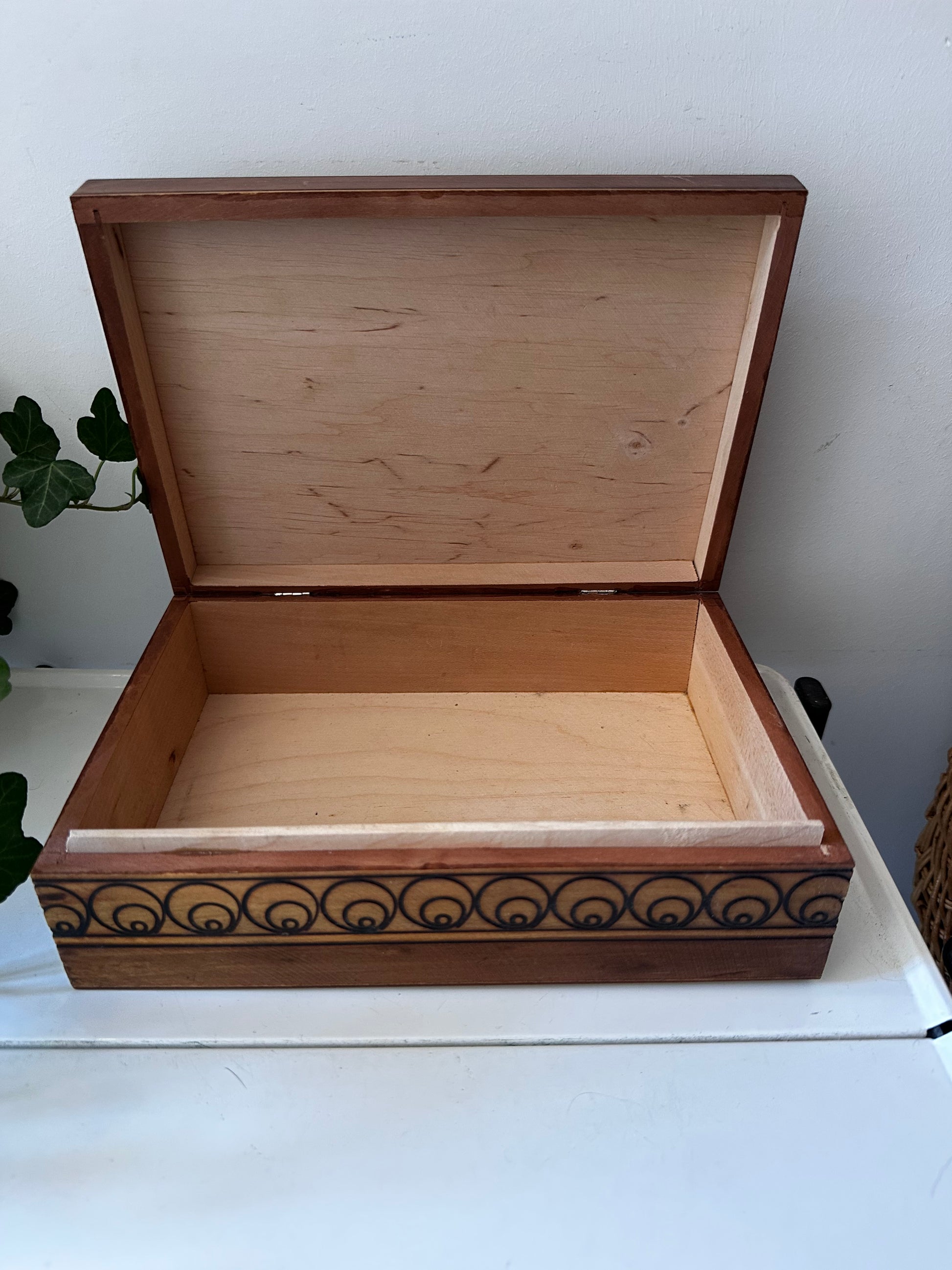 Uniek houten doosje met kleurrijk ingegraveerd patroon – perfect om je sieraden, herinneringen of andere schatten in te bewaren. Doos heeft een warme hout en gedetailleerde versieringen. Q882
