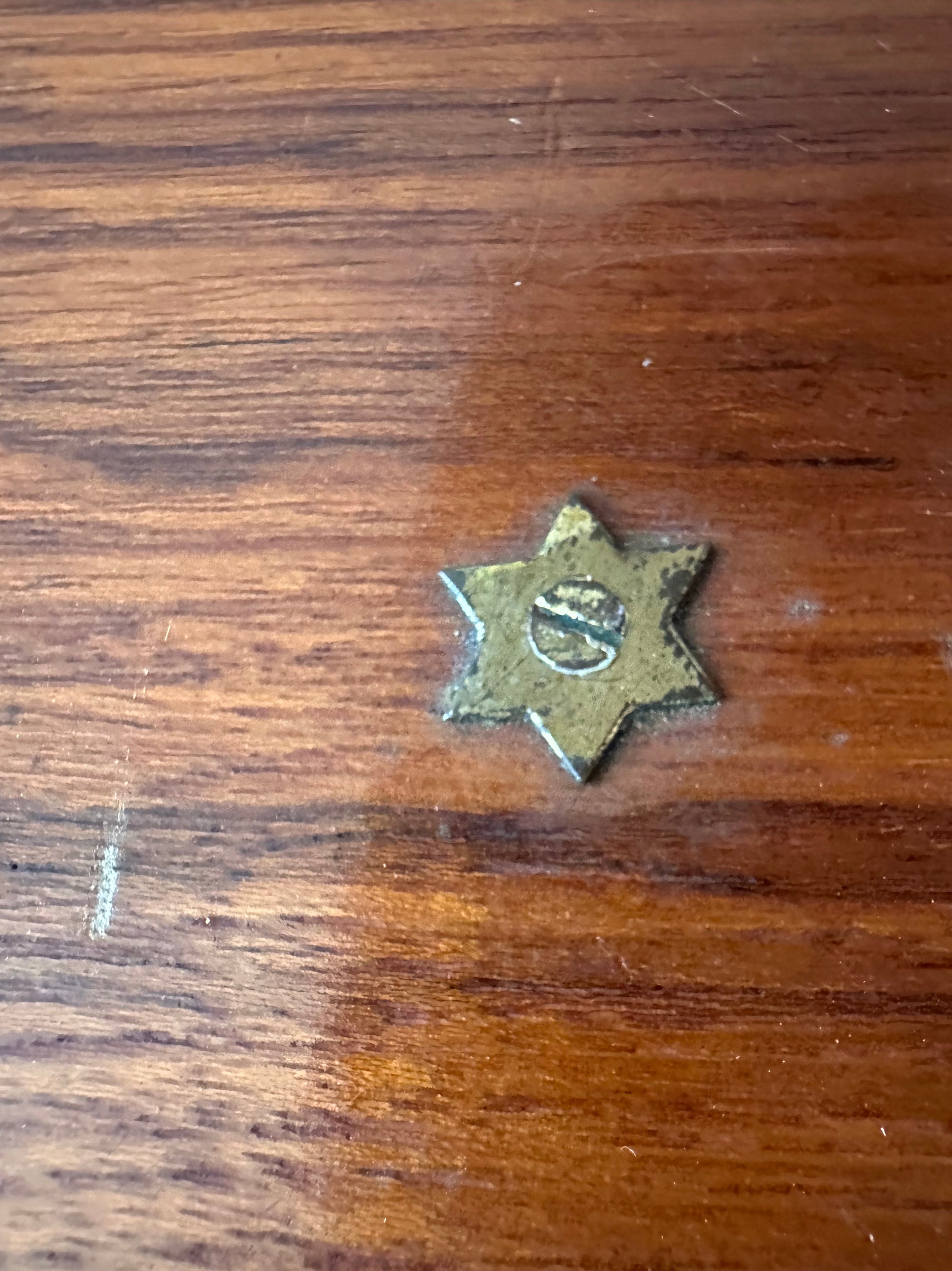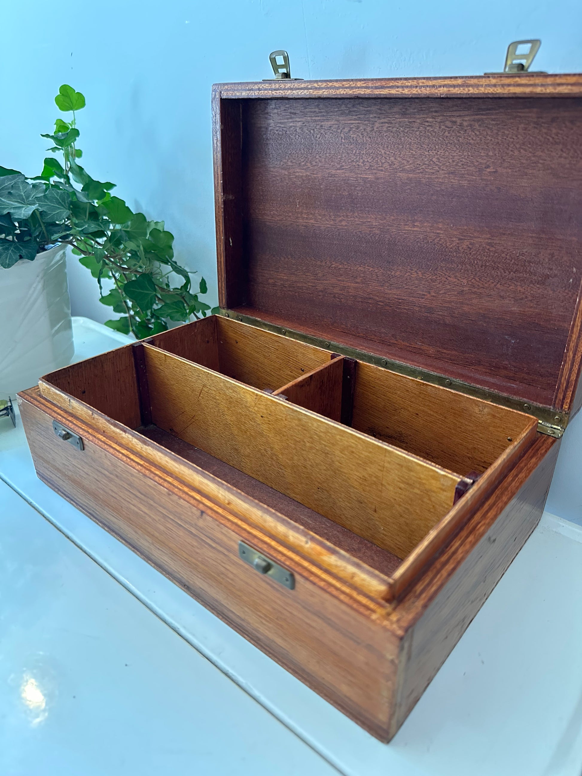 Stevige vintage houten bewaardoos met messing sluitingen en metalen hoekbeschermers. Binnenin verdeeld in meerdere vakken – ideaal om kleine spulletjes, naaigerei of papieren in op te bergen. Mooi patina en een stoere uitstraling door de metalen details. Q313