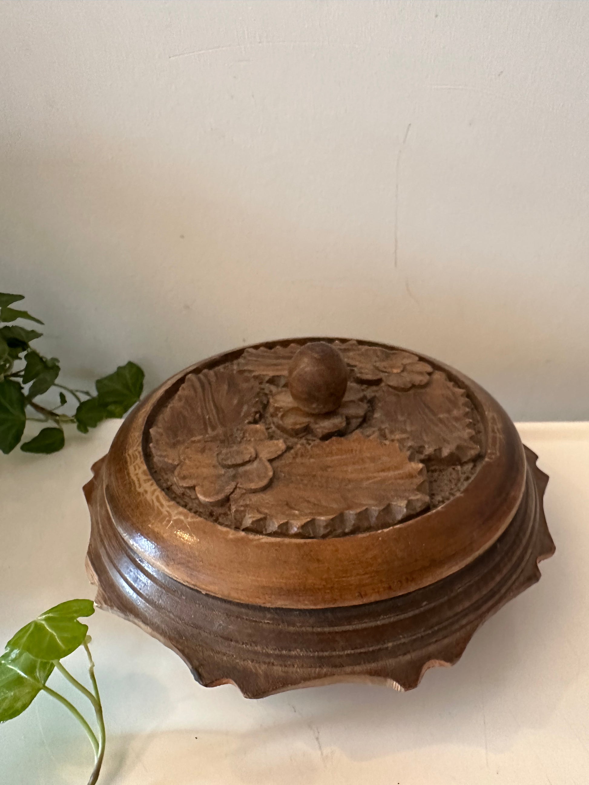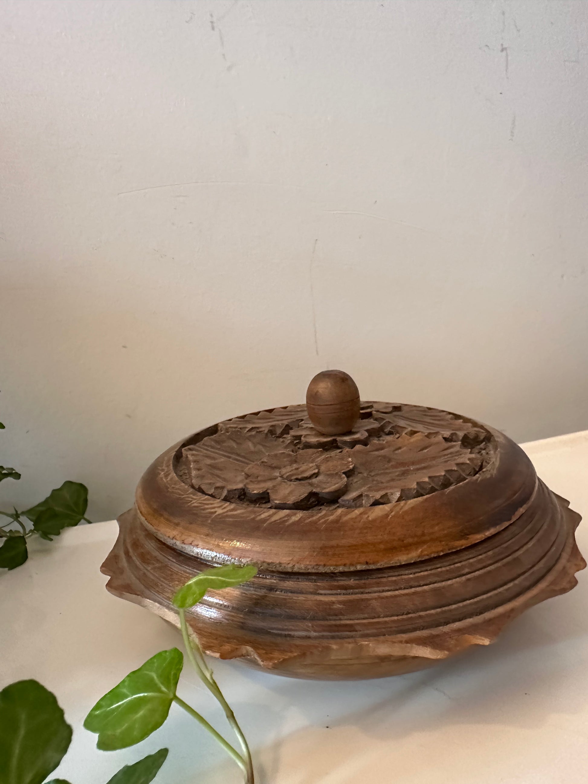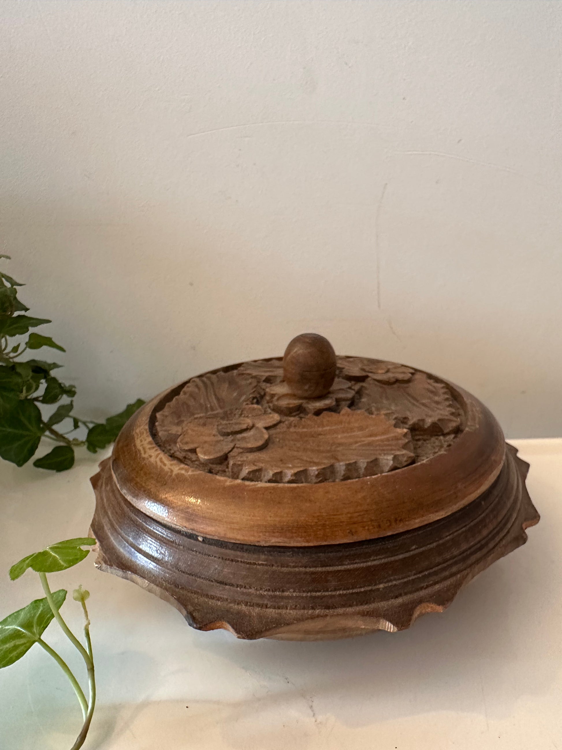 Superleuk handgesneden houten bewaardoosje met bloemmotief op het deksel. Mooie warme houtkleur en een sierlijk randje rondom. Ideaal voor sieraden, sleutels of gewoon als mooi stukje op je kast. Q596