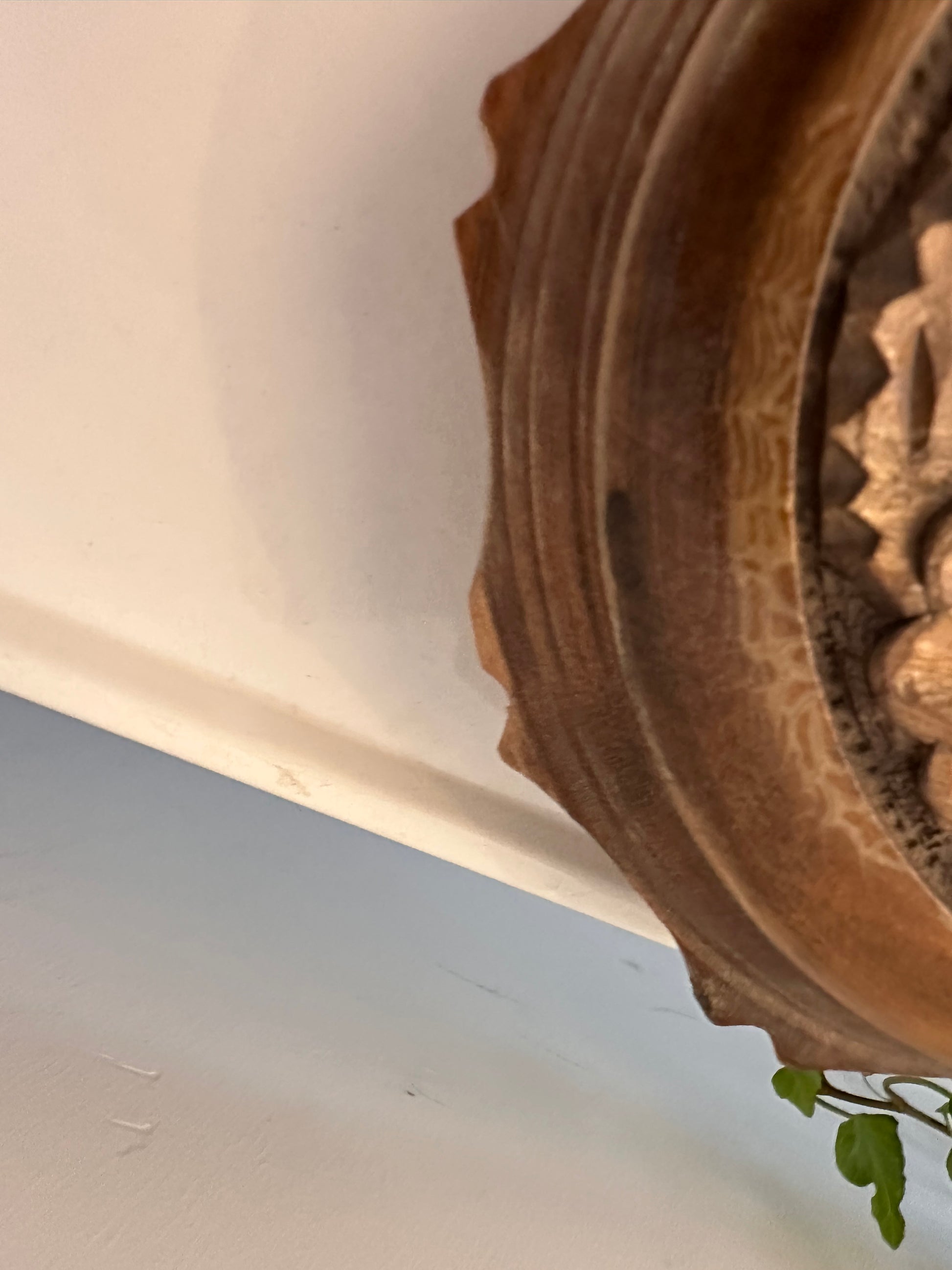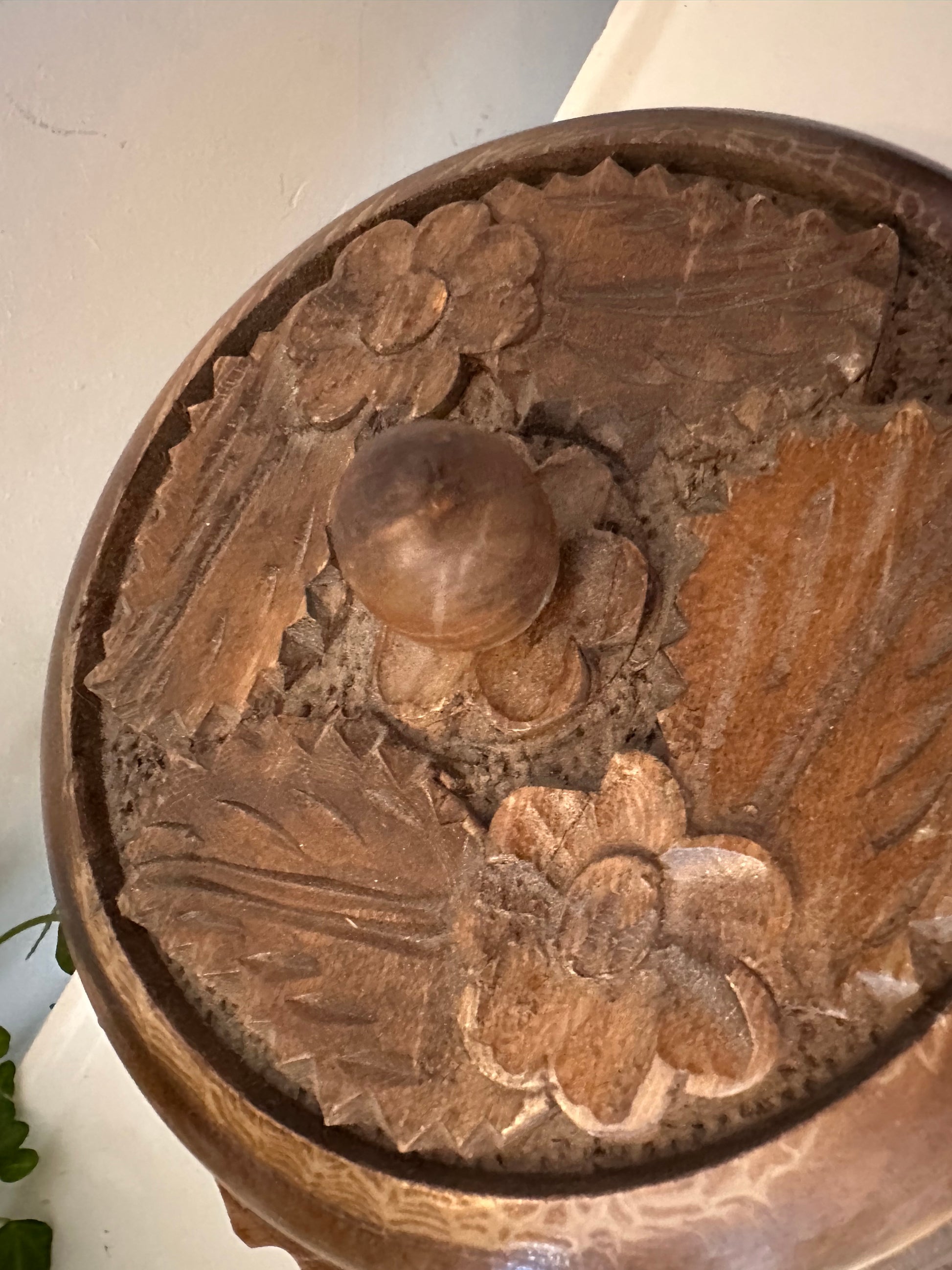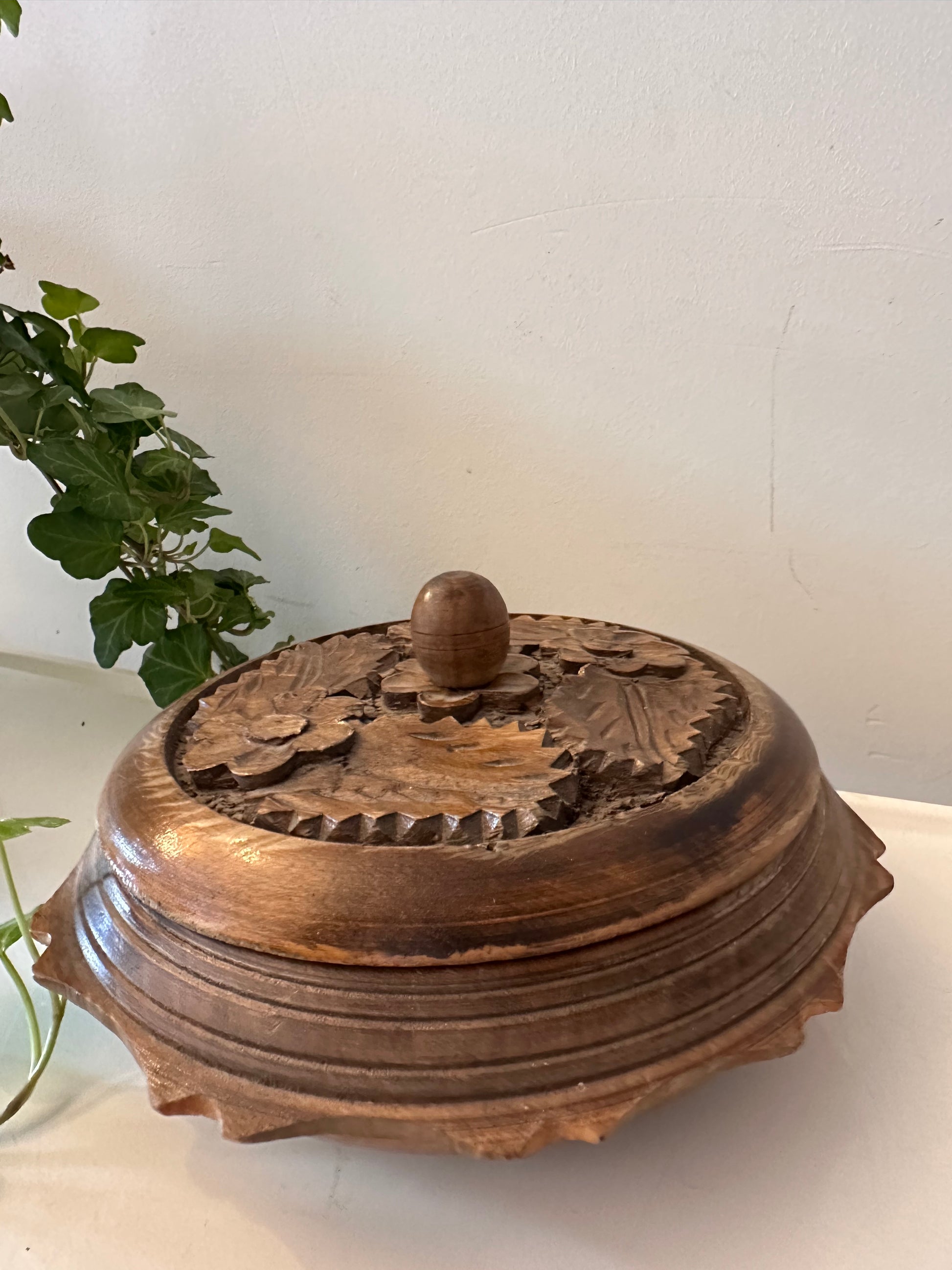 Superleuk handgesneden houten bewaardoosje met bloemmotief op het deksel. Mooie warme houtkleur en een sierlijk randje rondom. Ideaal voor sieraden, sleutels of gewoon als mooi stukje op je kast. Q596
