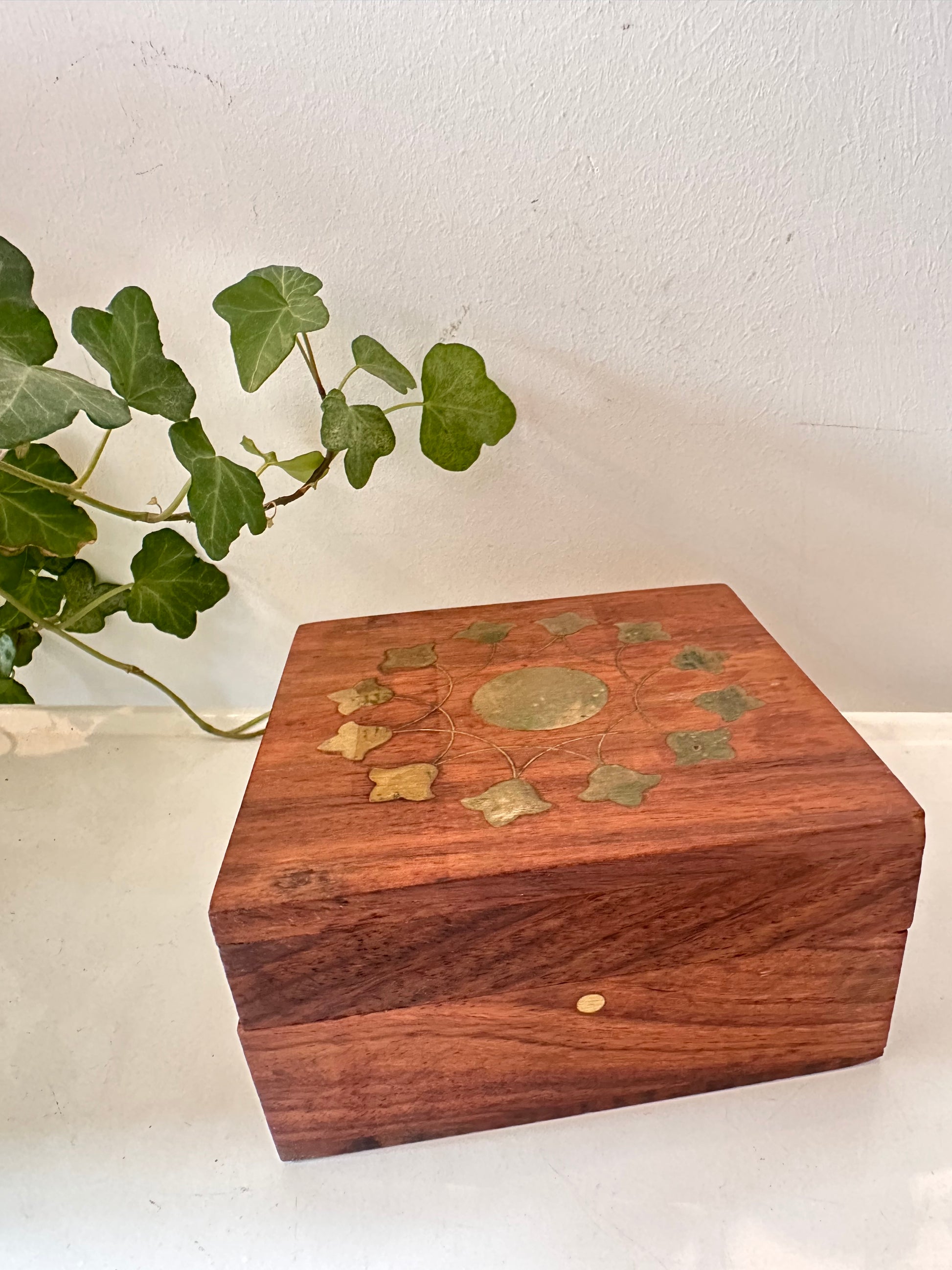 Compact en mooi afgewerkt doosje van donker hout, met ingelegd messing in de vorm van klimopblaadjes en een cirkel in het midden. Binnenkant bekleed met rood fluweelachtig stof. In mooie vintage staat. Q171