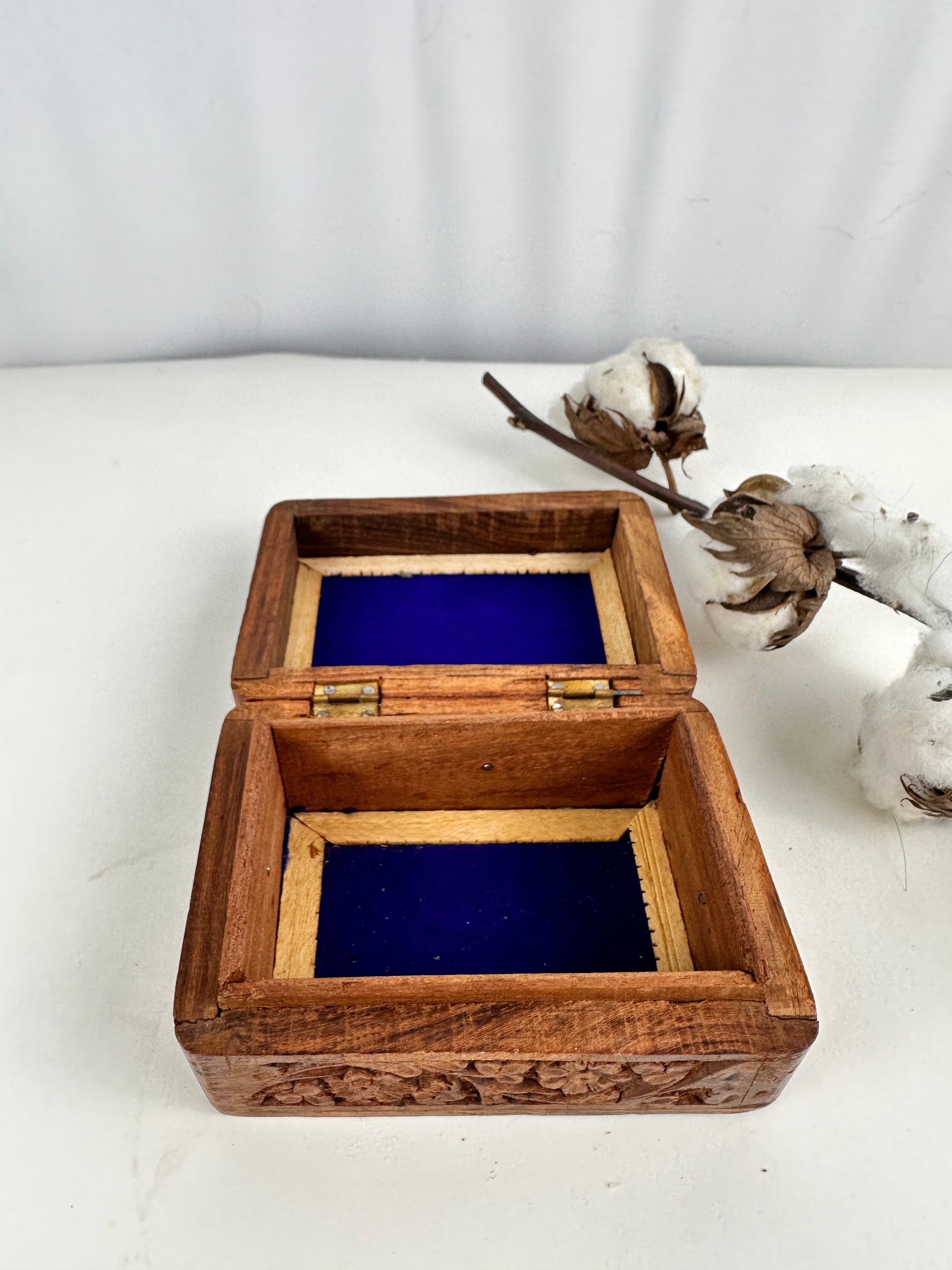 Prachtig doosje met heel mooi uitgesneden hout en wit ivoor ingelegde blaadjes in het motiefje. Binnenin met paars Bilt bekleed. In een hele mooie vintage staat.