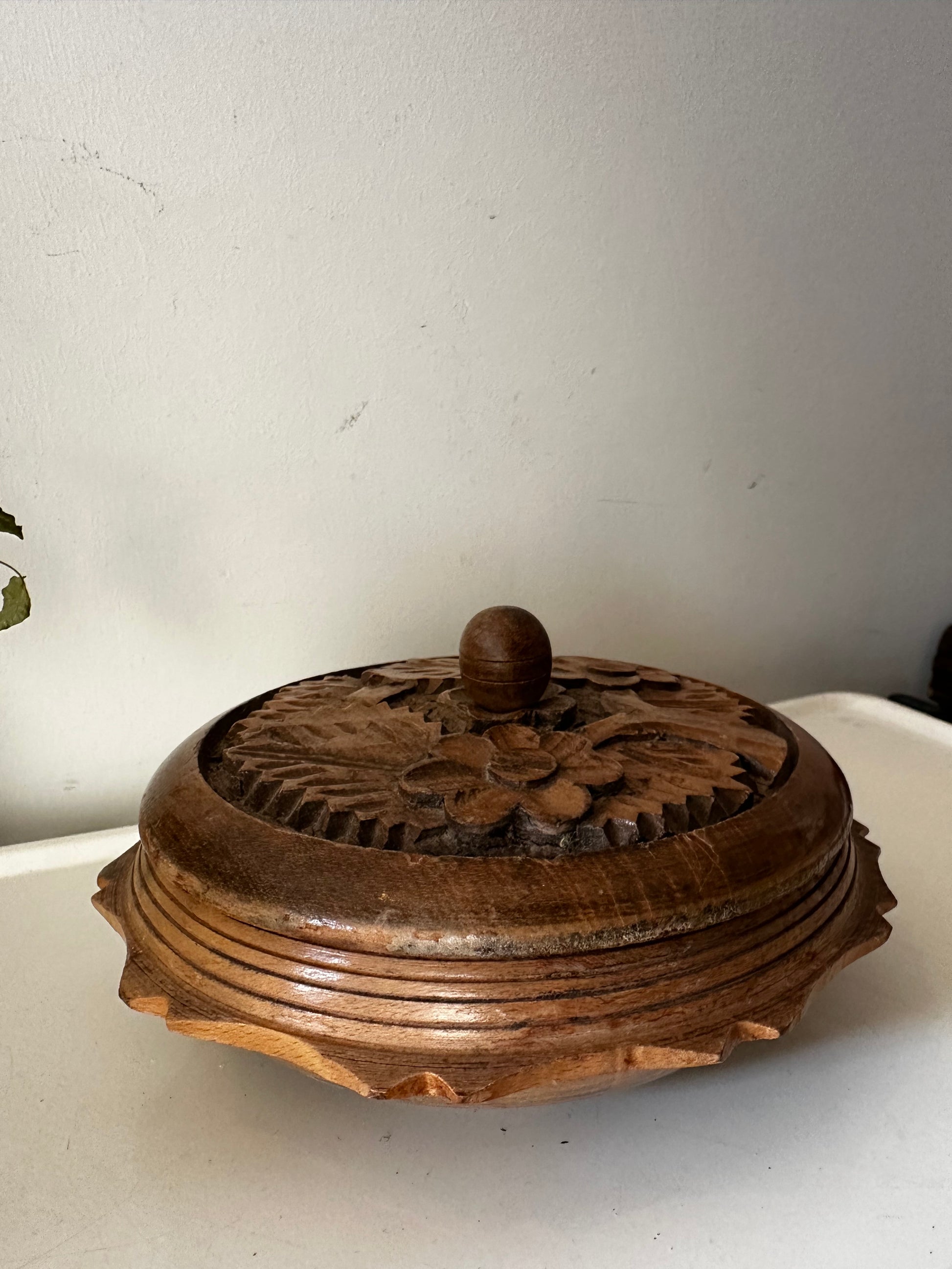 Mooi handgedraaid bakje van hout met uitgesneden bloemmotief in het deksel. Donkere warme houttint, compact formaat en volledig uit massief hout gemaakt. Q594