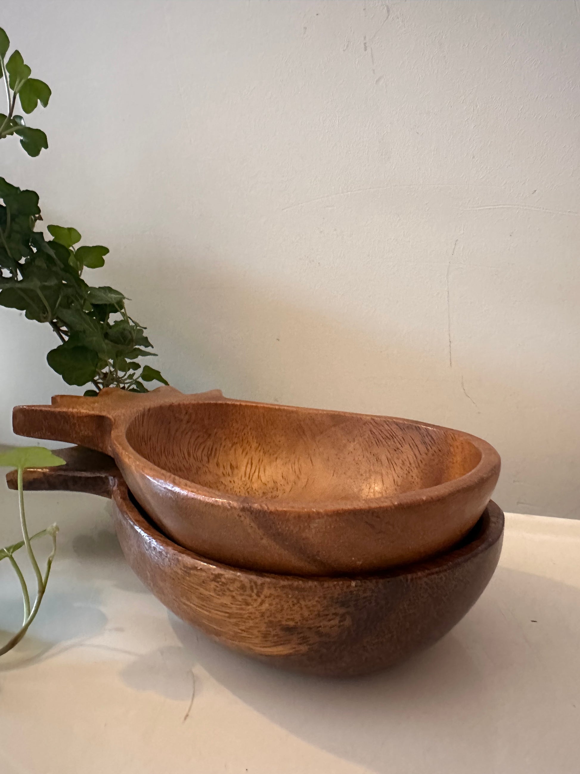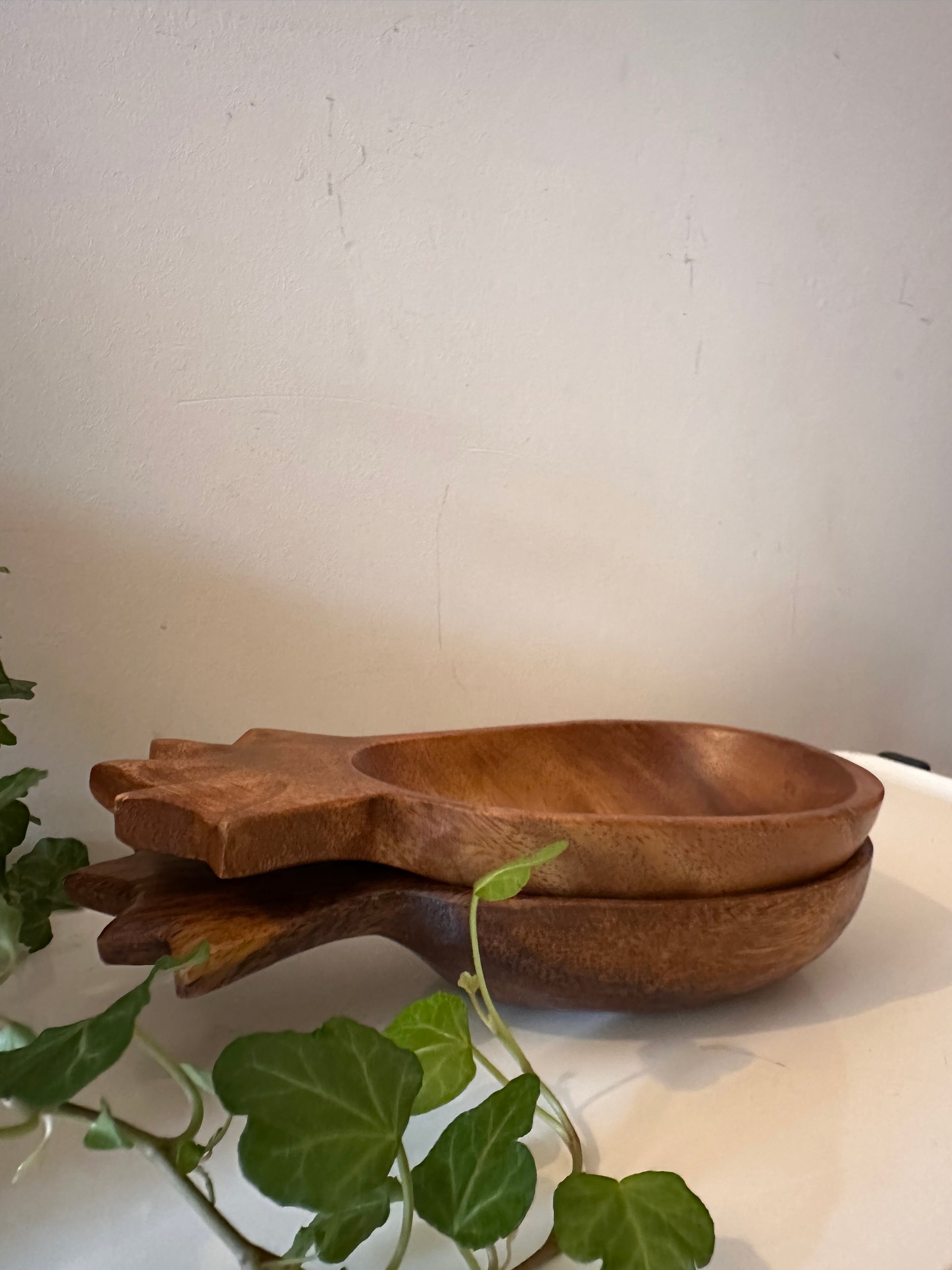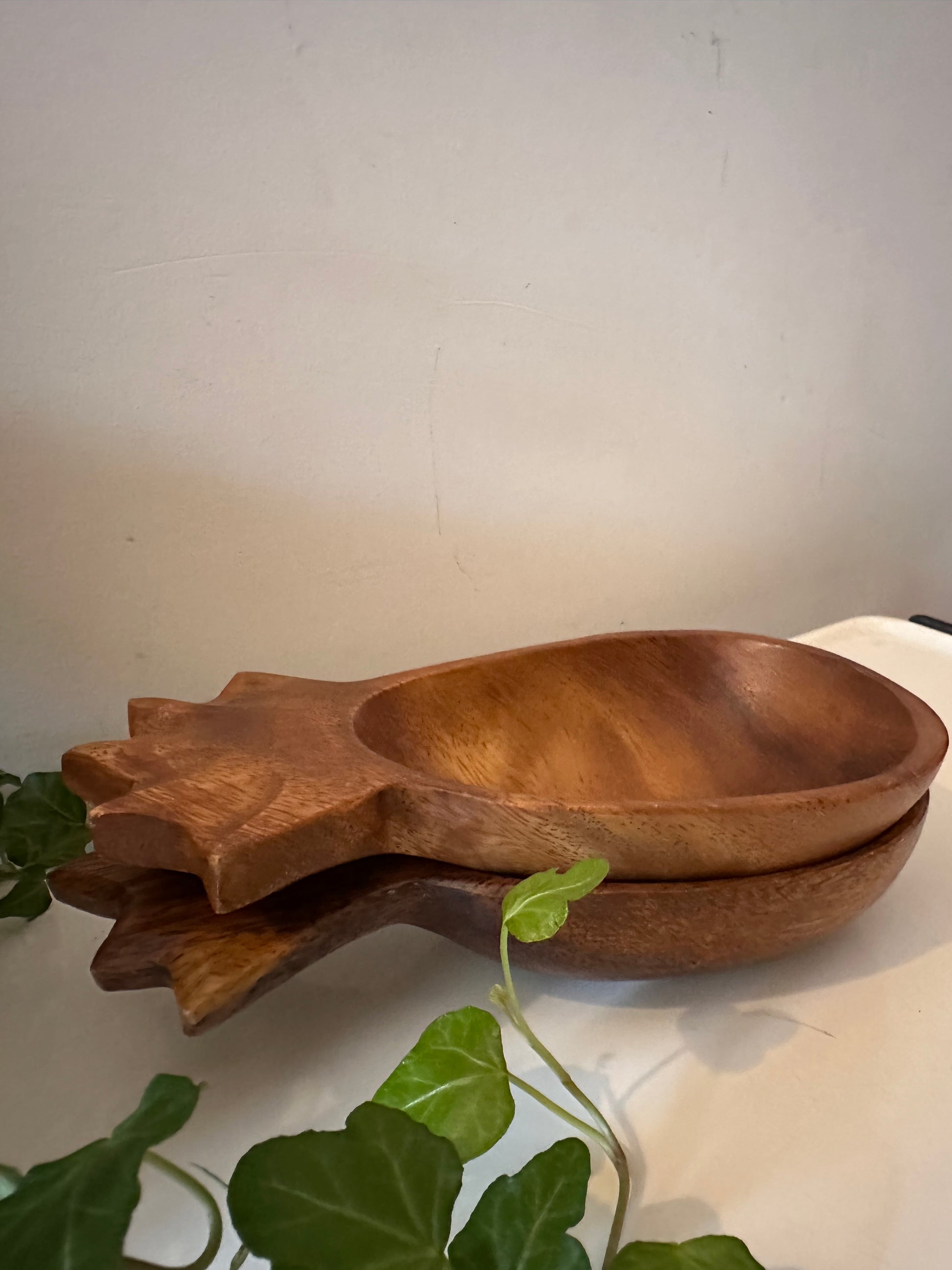 Supermooie set houten kommetjes in de vorm van een ananas π β zo leuk voor nootjes, sieraden of gewoon als stylingitem op tafel. Handgemaakt uit tropisch hout met een warme kleur en zichtbaar houtnerf, jaren 70 en nog in hele mooie vintage staat.