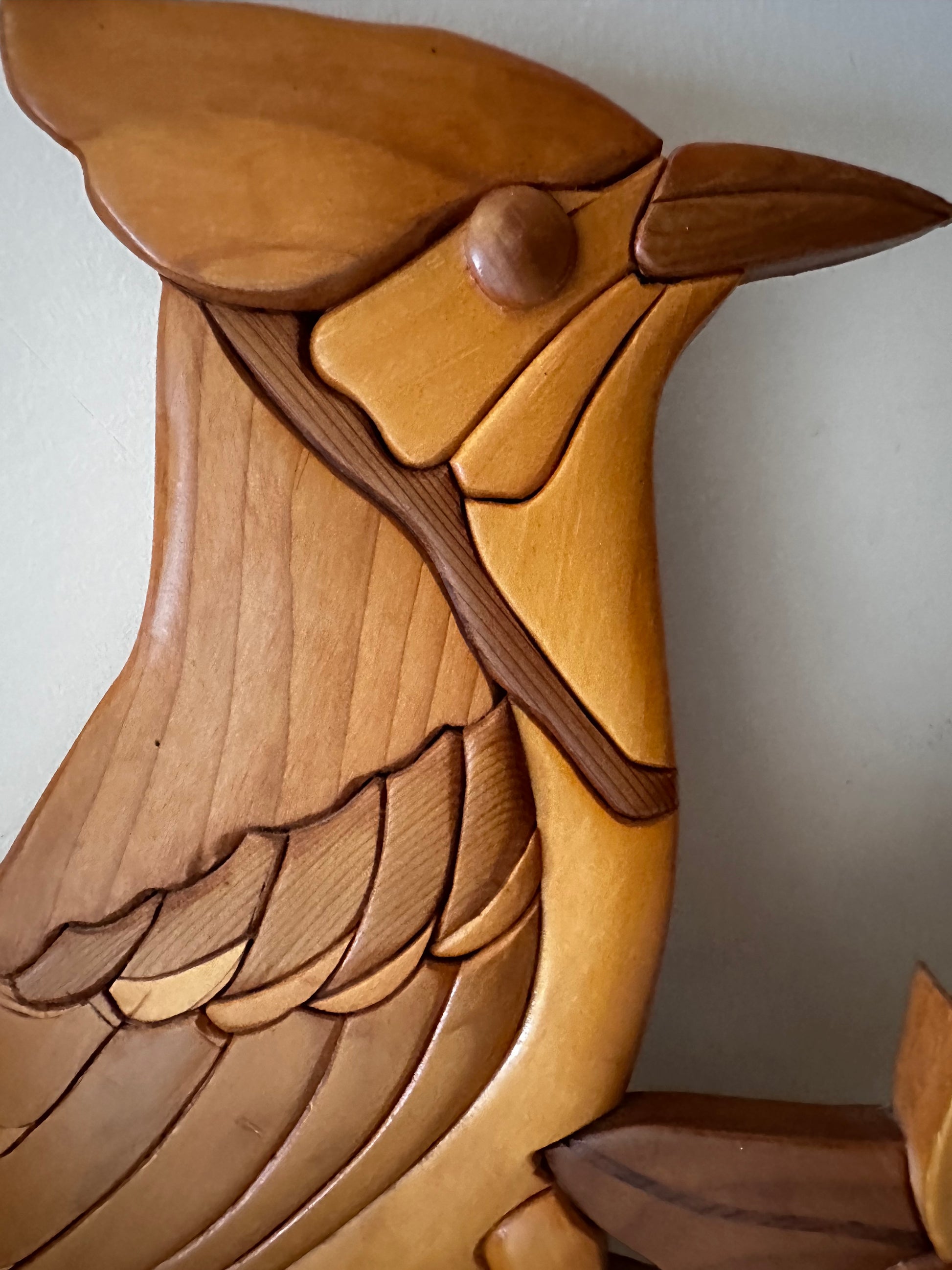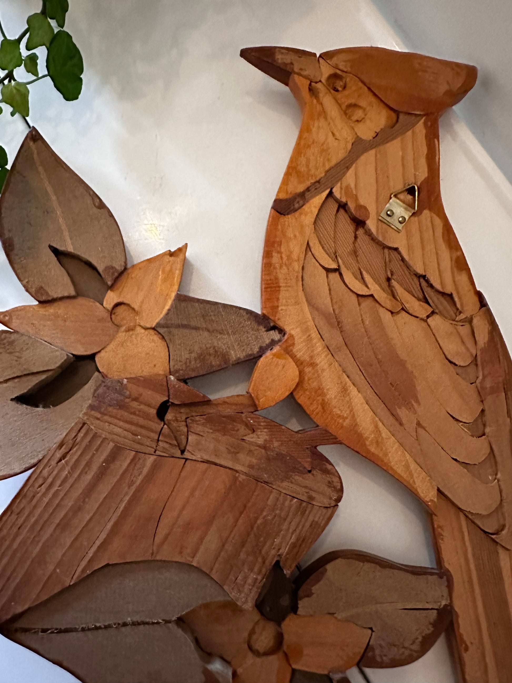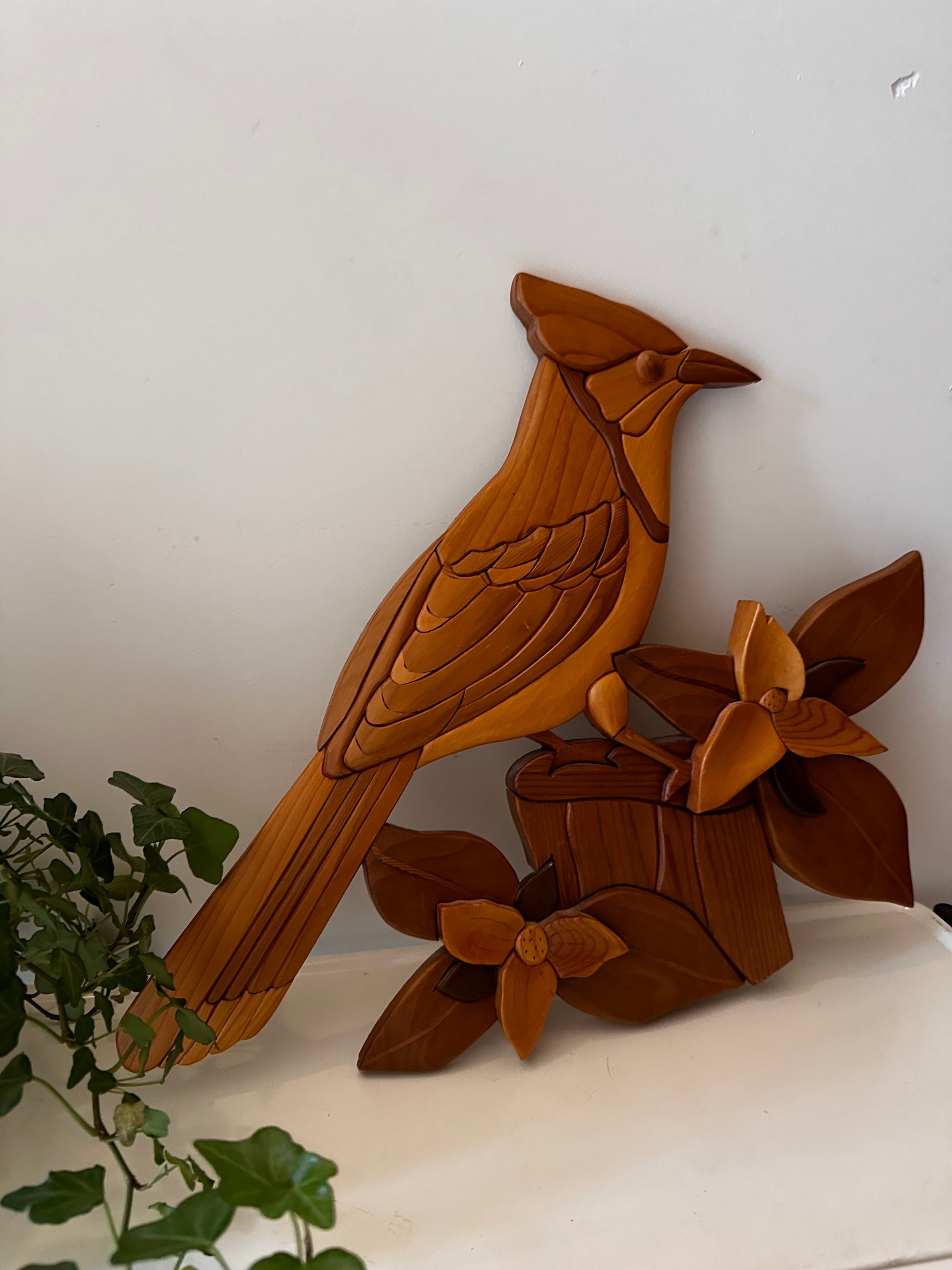 Houten wandbord in een echt nog hele mooie staat. Hout heeft verschillende tinten bruin kleur. Voorstelling van een vogel op tak. Wandbord heeft een ophangoogje