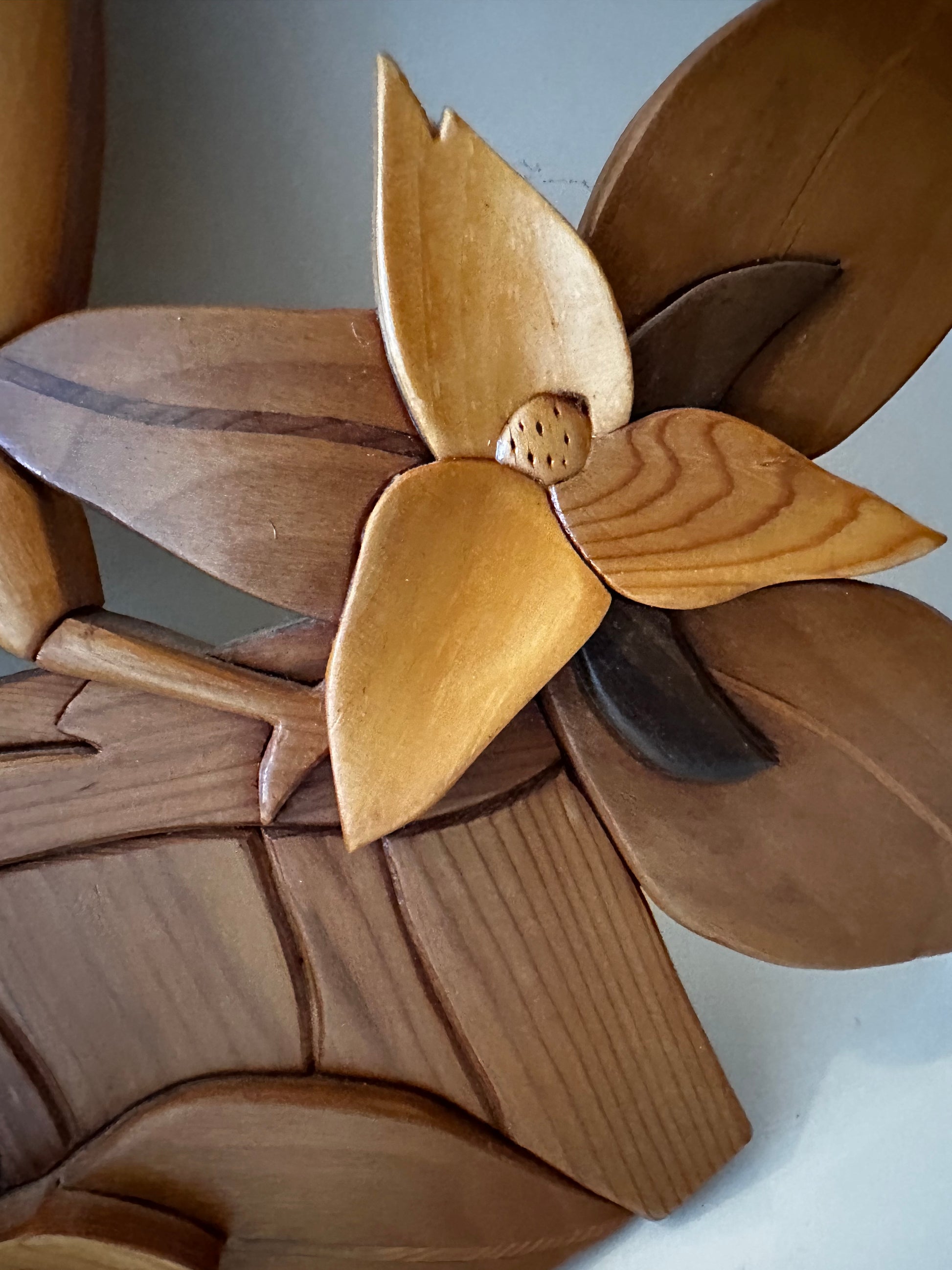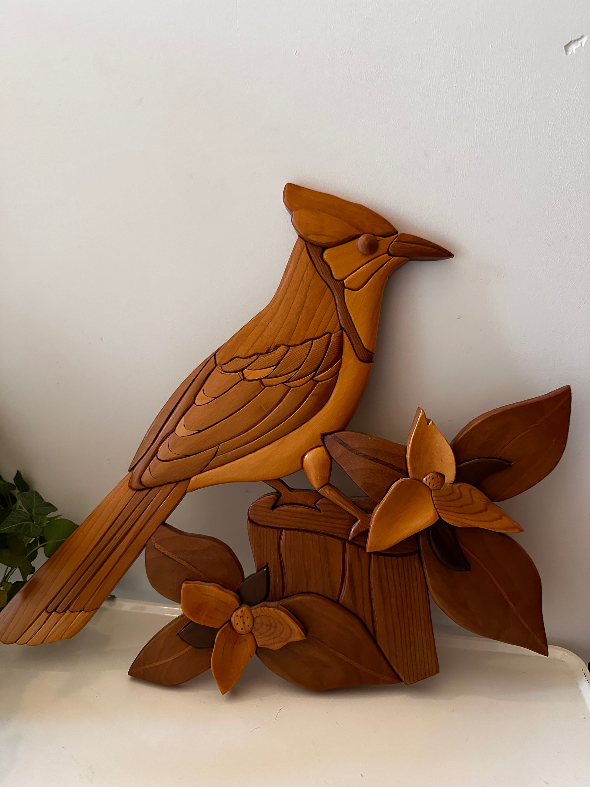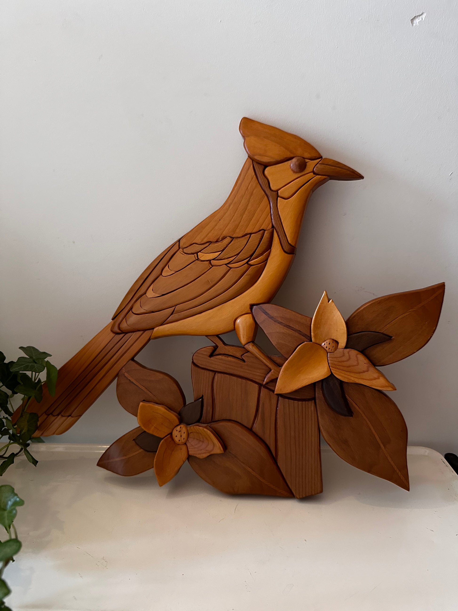 Houten wandbord in een echt nog hele mooie staat. Hout heeft verschillende tinten bruin kleur. Voorstelling van een vogel op tak. Wandbord heeft een ophangoogje