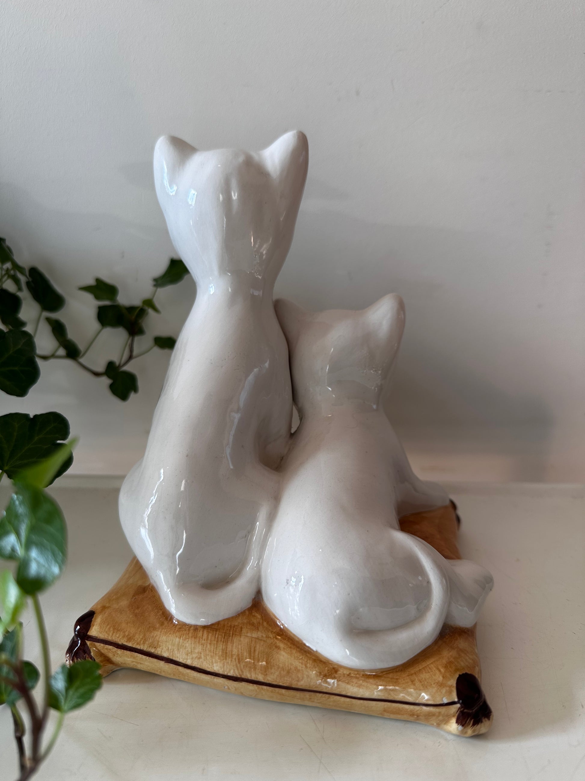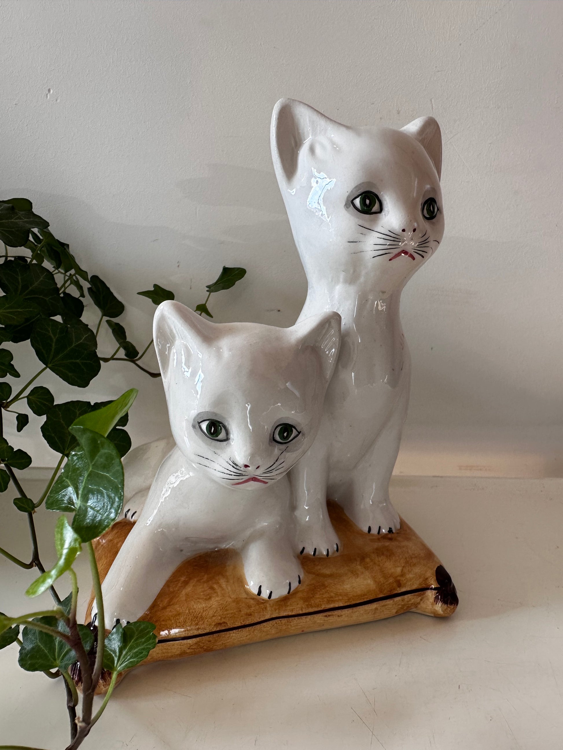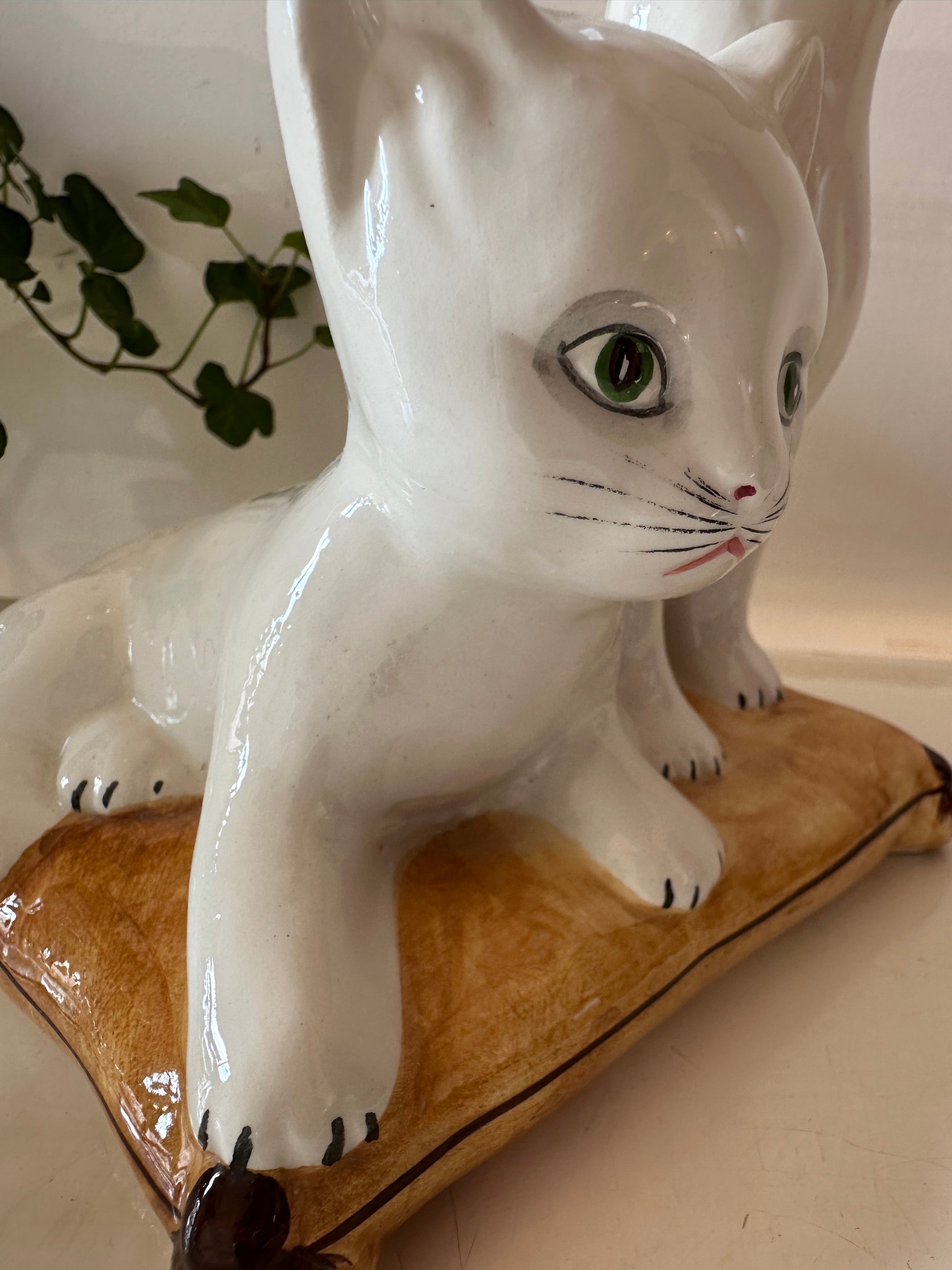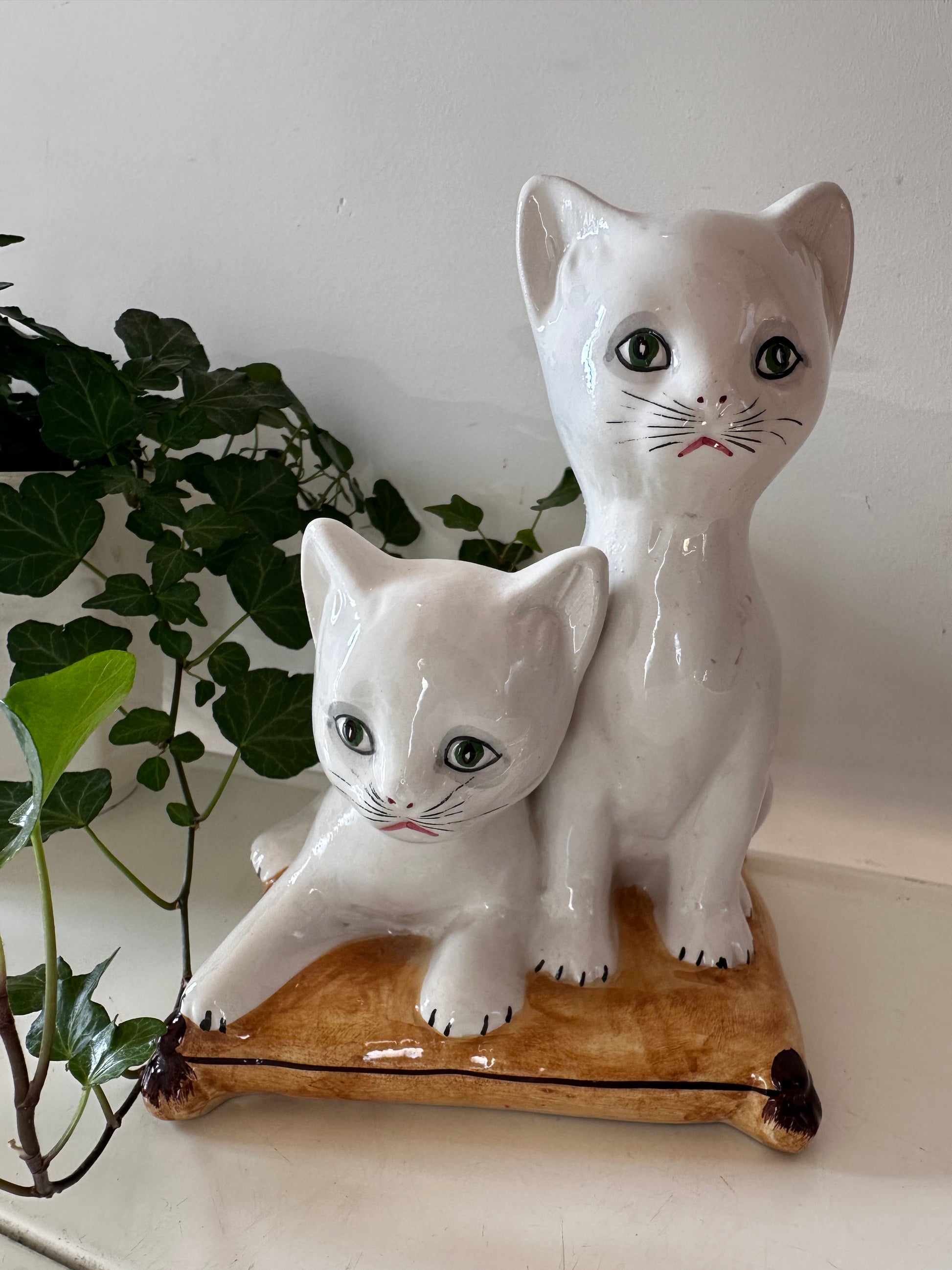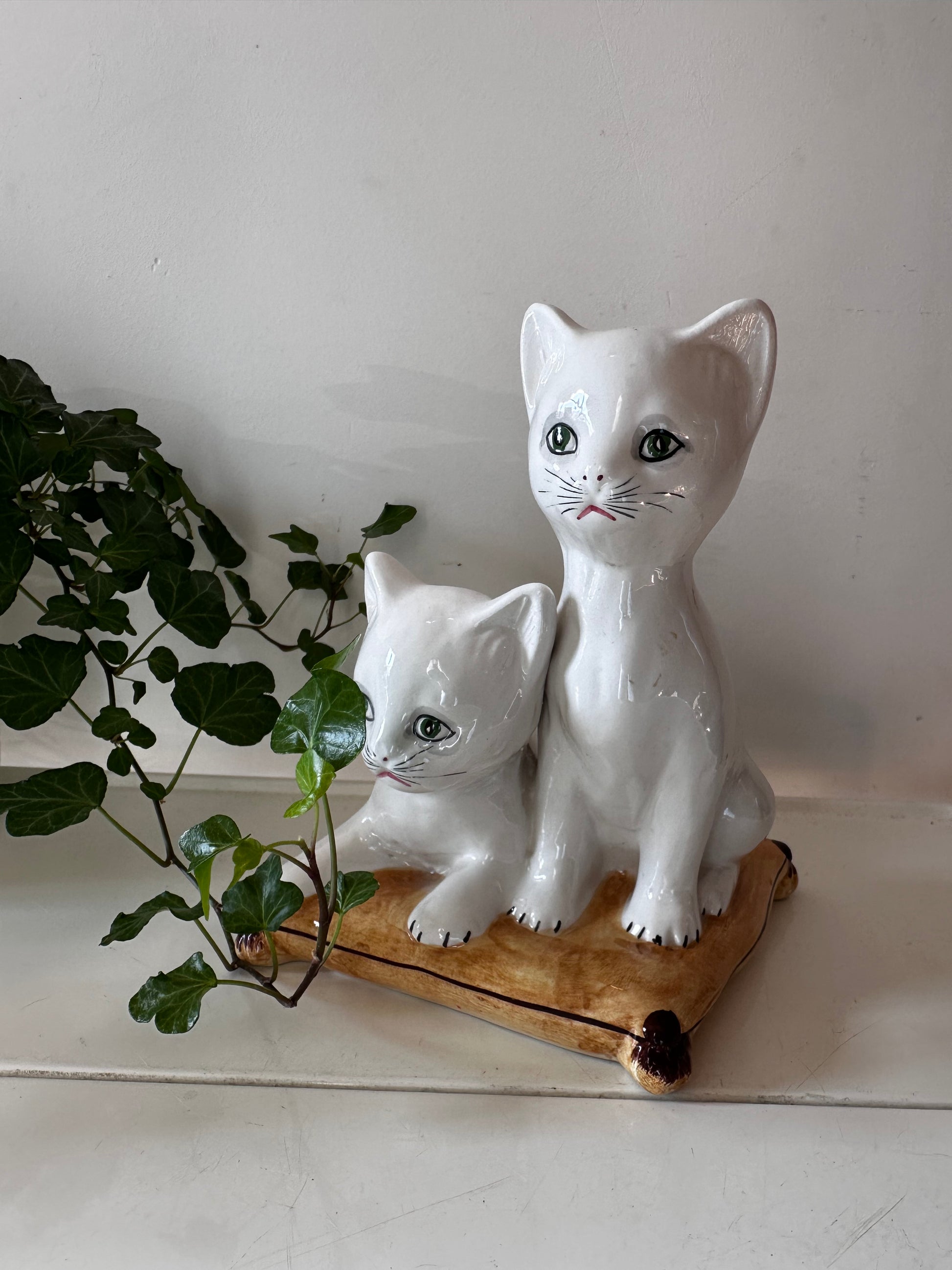 🐾 Italiaanse cuties alert! 🐾 Deze porseleinen katten met hun lieve blik en grote groene ogen verdienen een plekje in je huis. De katjes zitten op een kussentje. Beeldje is in een top vintage staat en gesigneerd. Afkomstig uit Italië en dateert jaren 70.