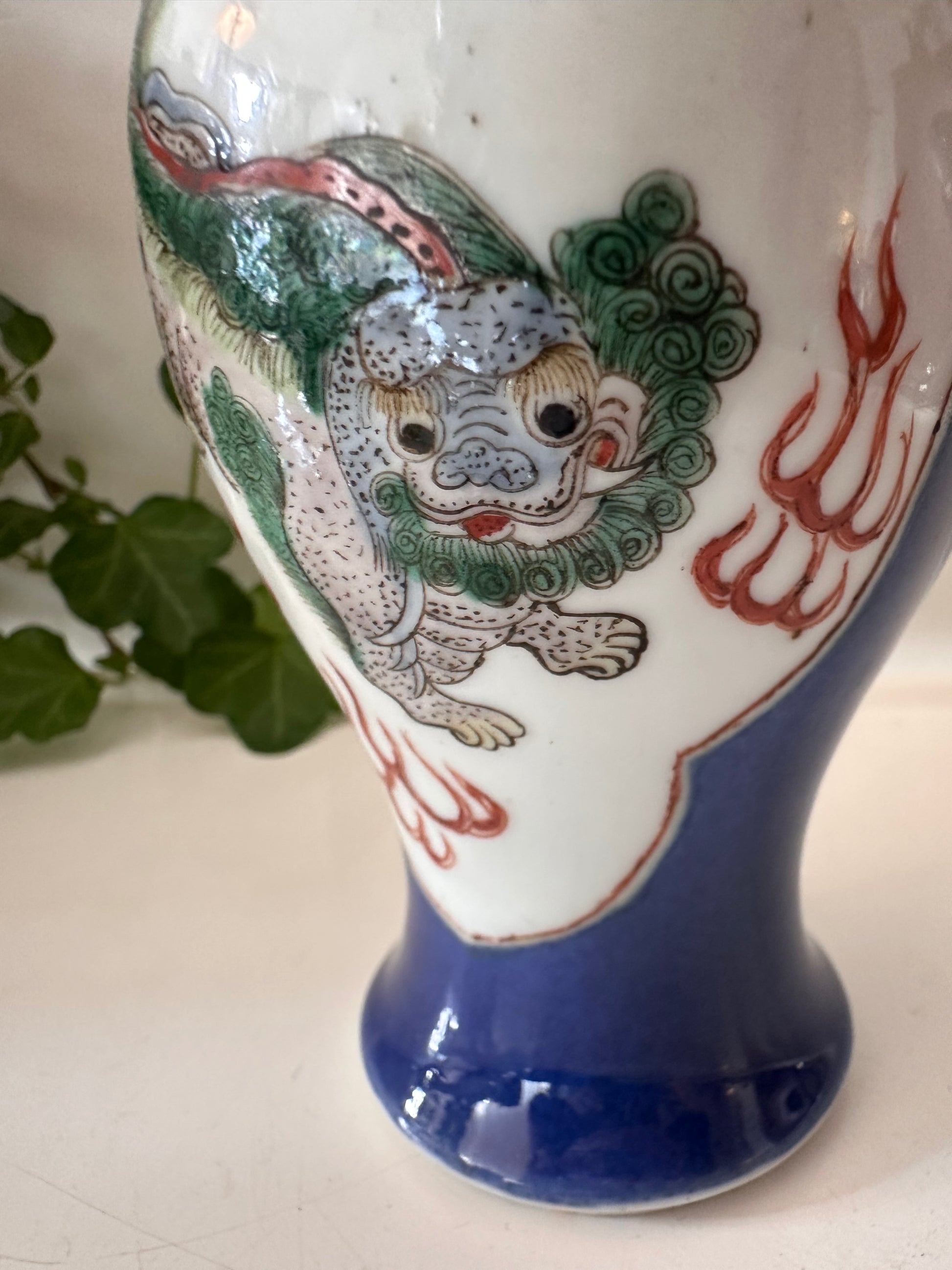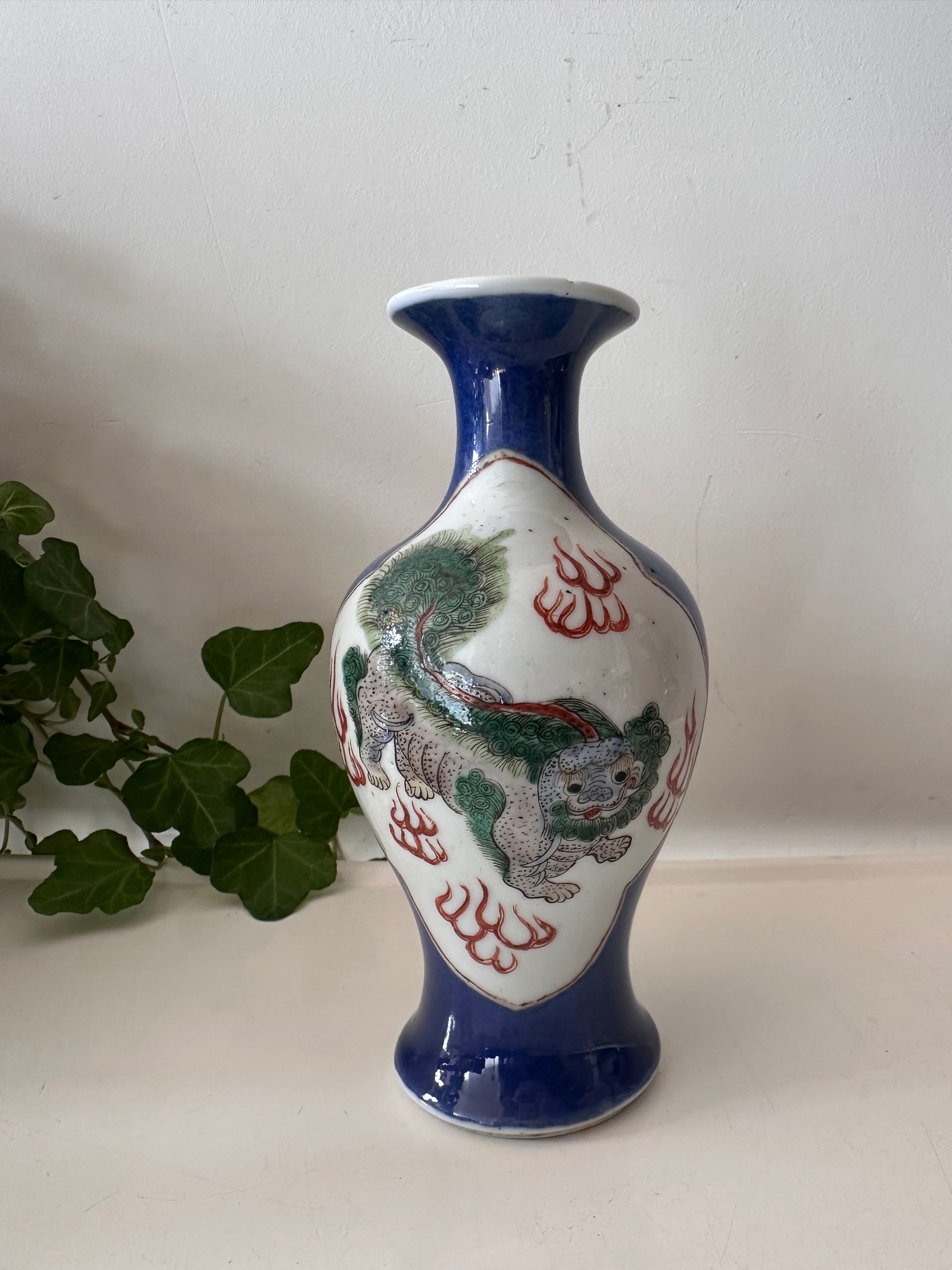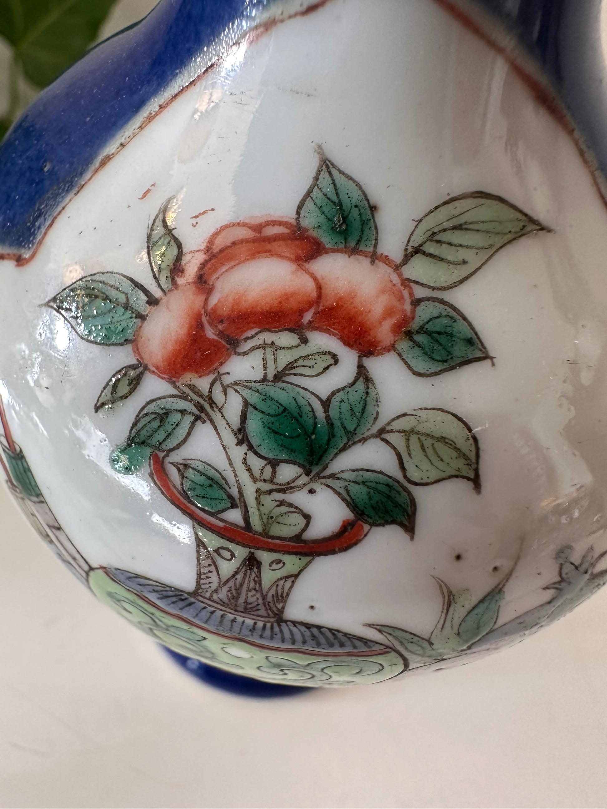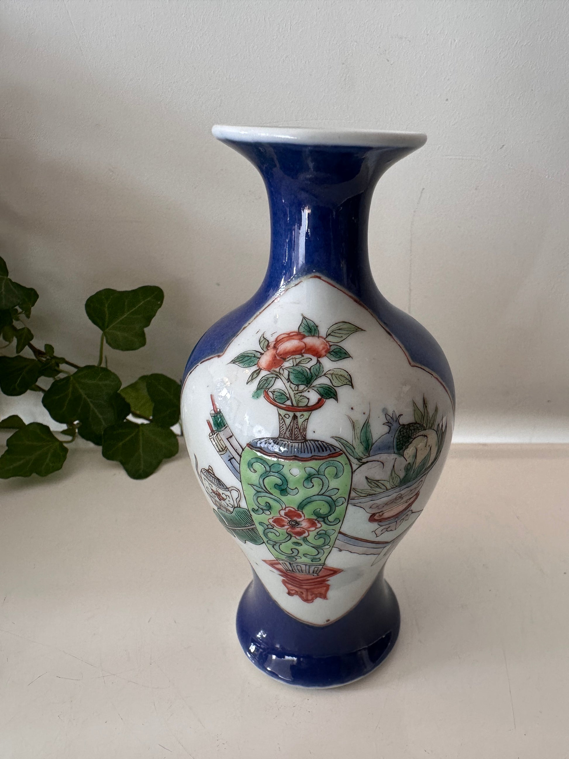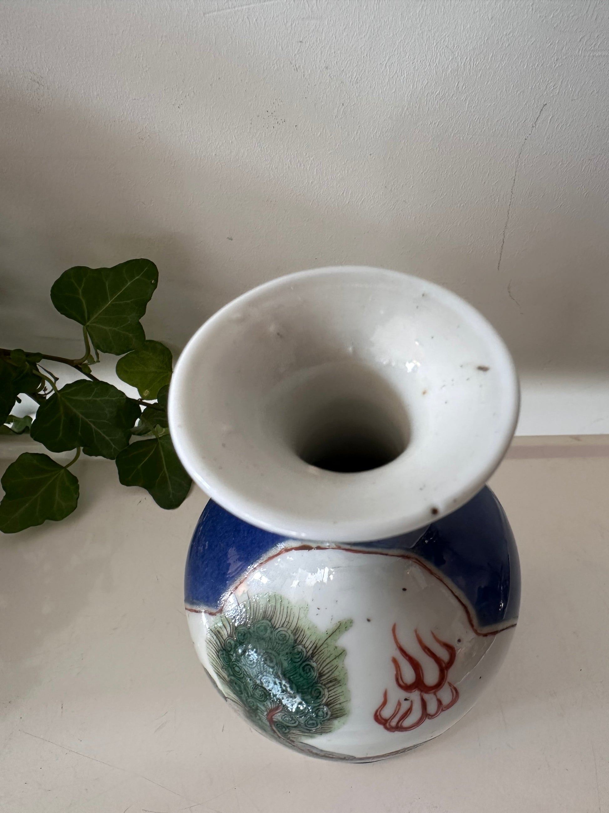 Superleuk vintage vaasje in Imari/Kutani-stijl โ met die typische mix van kobaltblauw, rood en groen en een handgeschilderde foo-hond (shi-shi) tussen vlammen. De andere zijde heeft een vaas- en bloemmotief, helemaal in die Japanse stijl van de jaren 50-60. Opvallend door de glans en de diepe kleuren.