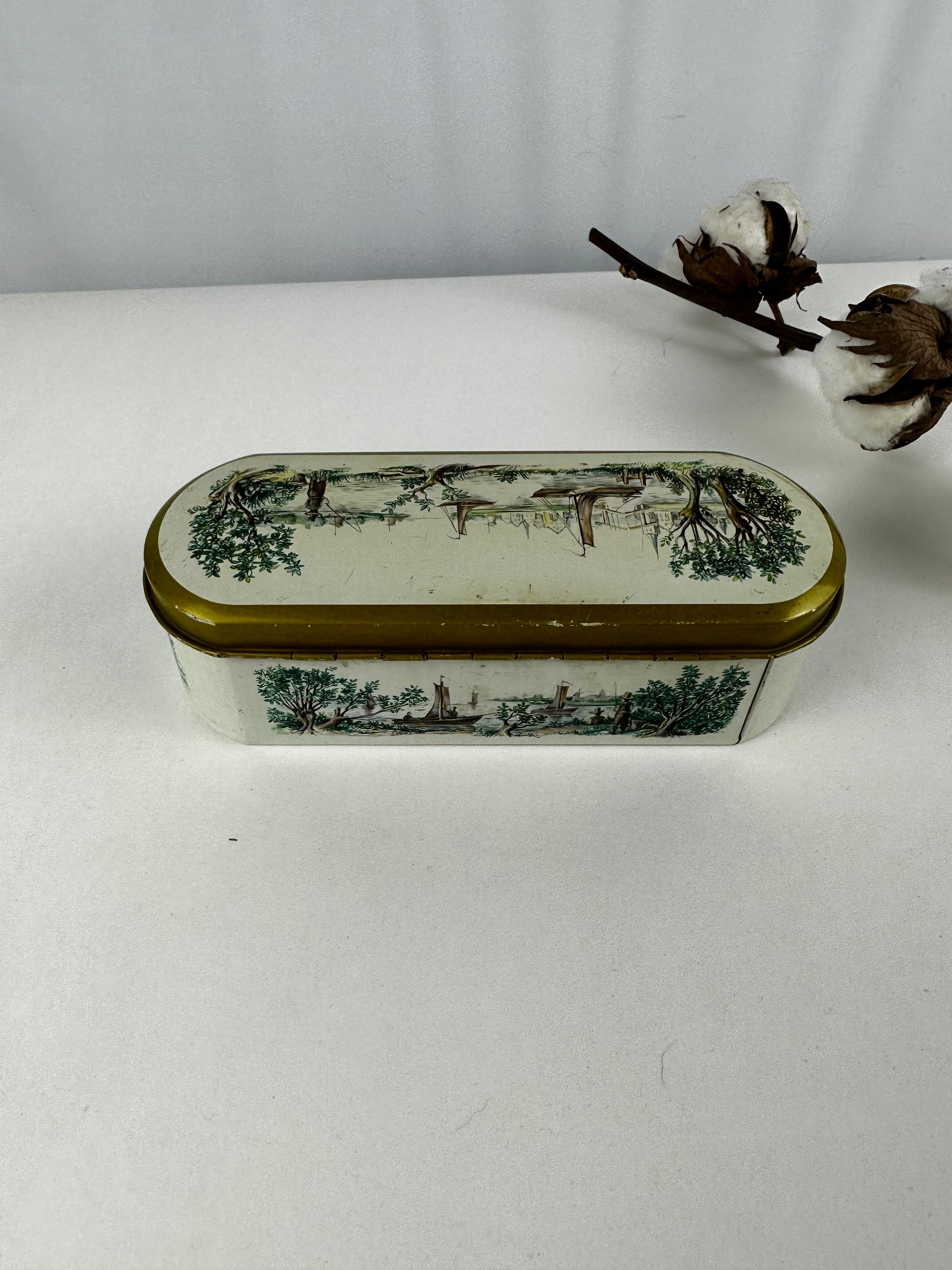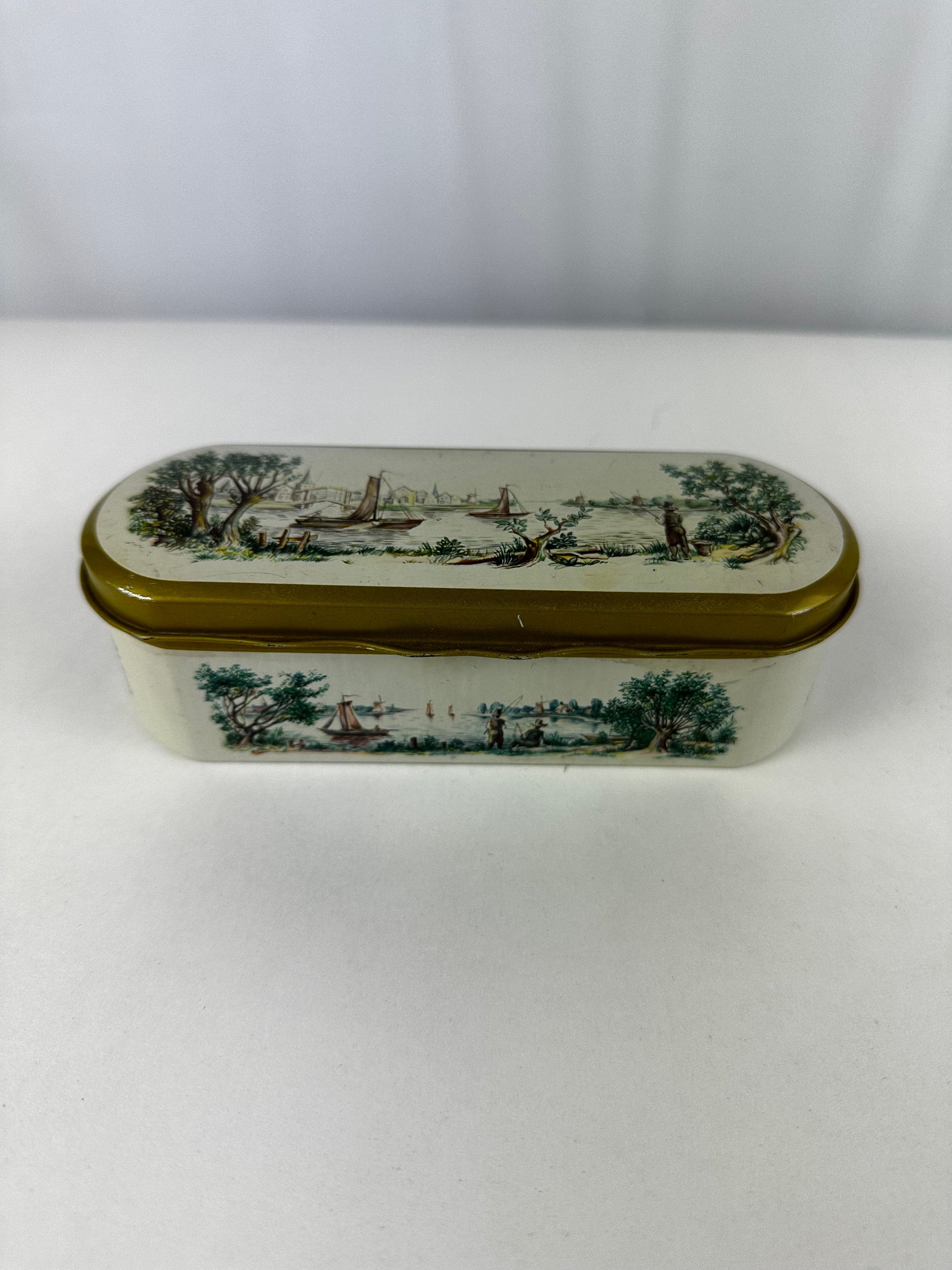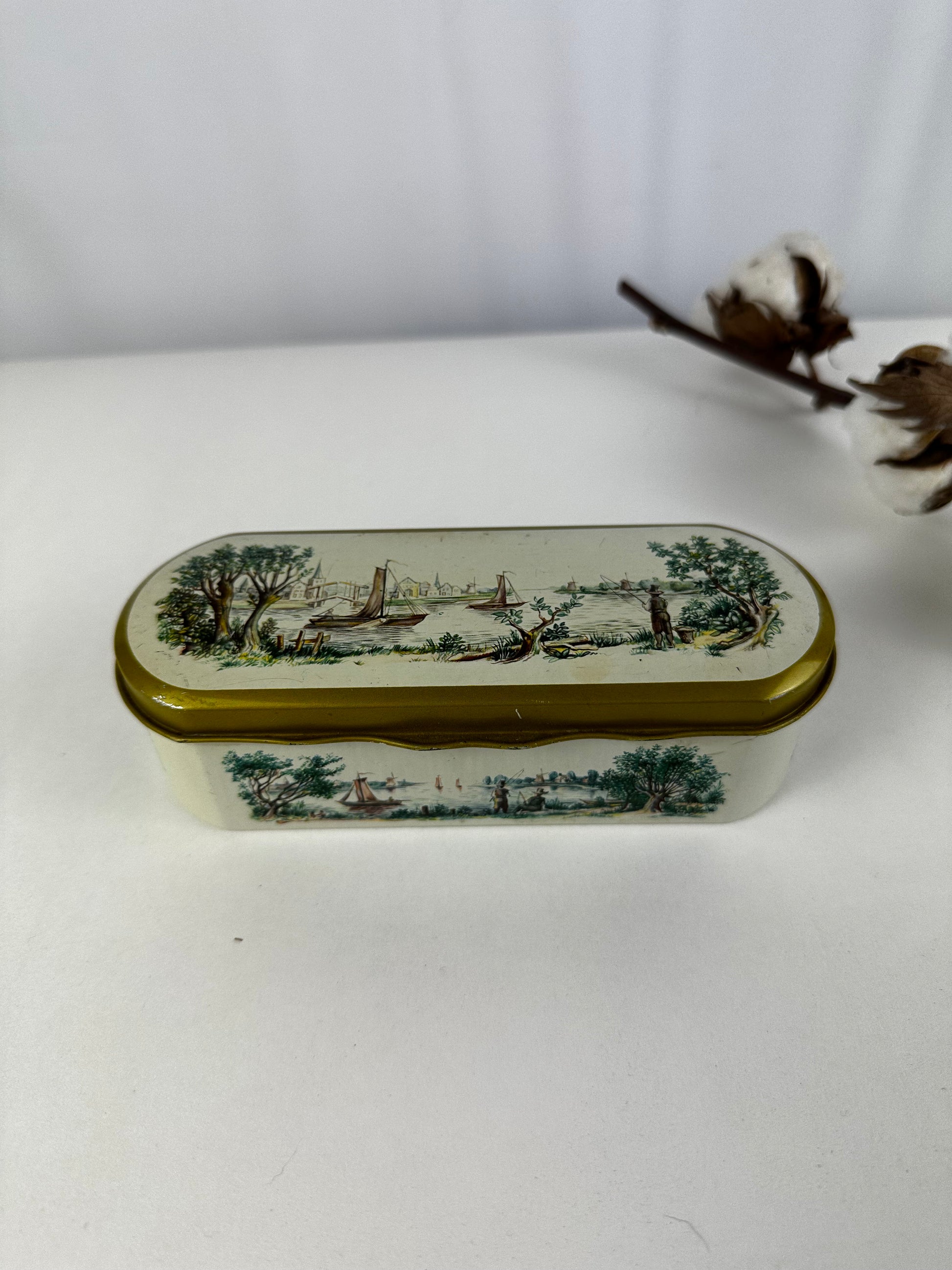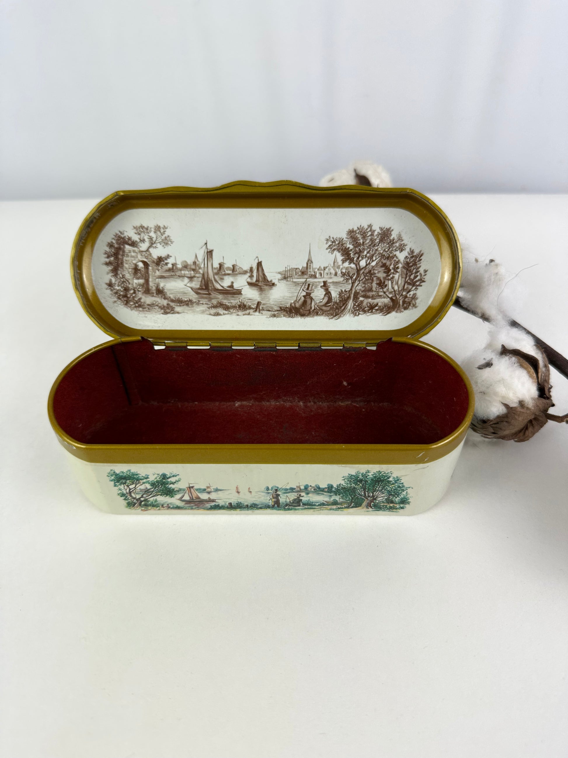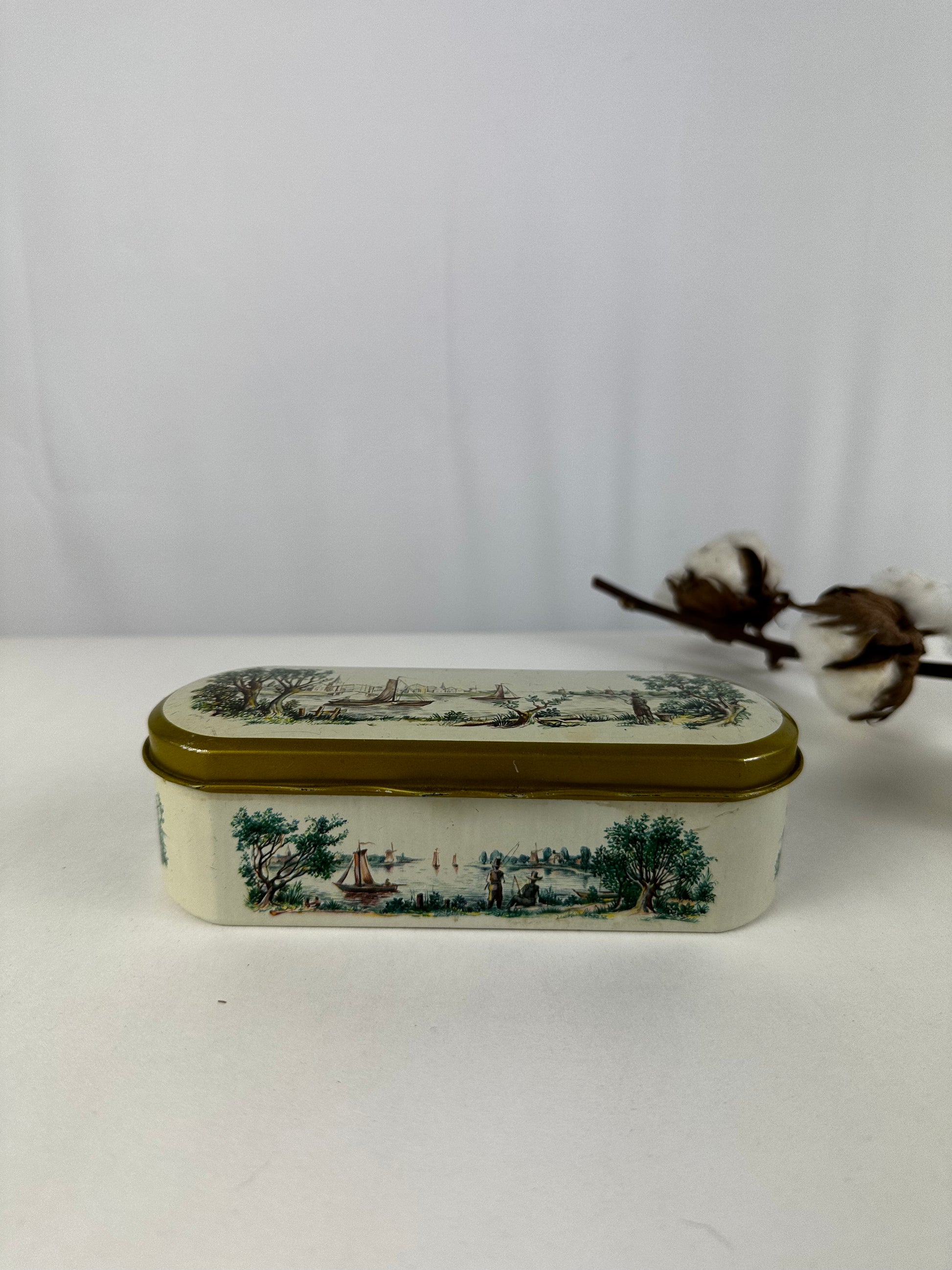 Lepeldoosje van Douwe Egberts dateert uit de jaren '50/'60. Een langwerpig ovaal blikje met een scharnierend oversluitdeksel. Het deksel heeft een crème kleurige achtergrond met afbeeldingen van een oude stad met torenspitsen, molens en een ophaalbrug. De binnenzijde is bekleed met rode stof en op de binnenzijde van de deksel is een bruin witte afbeelding.