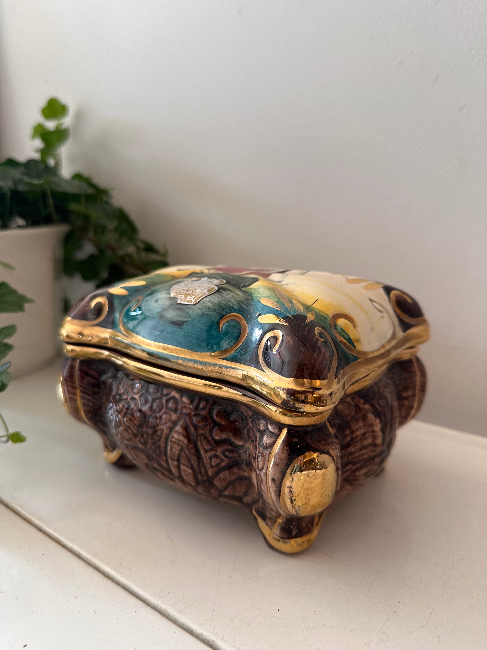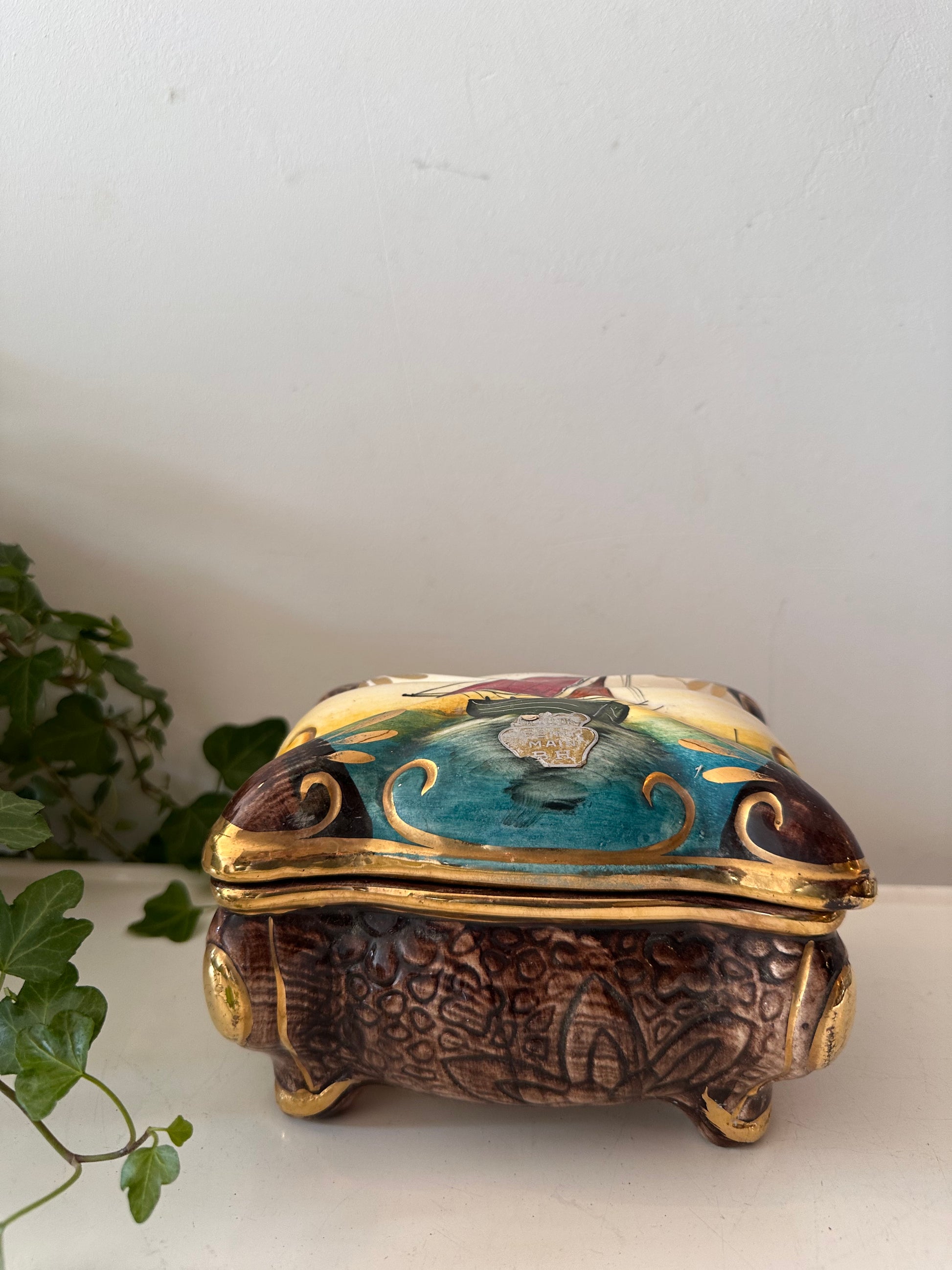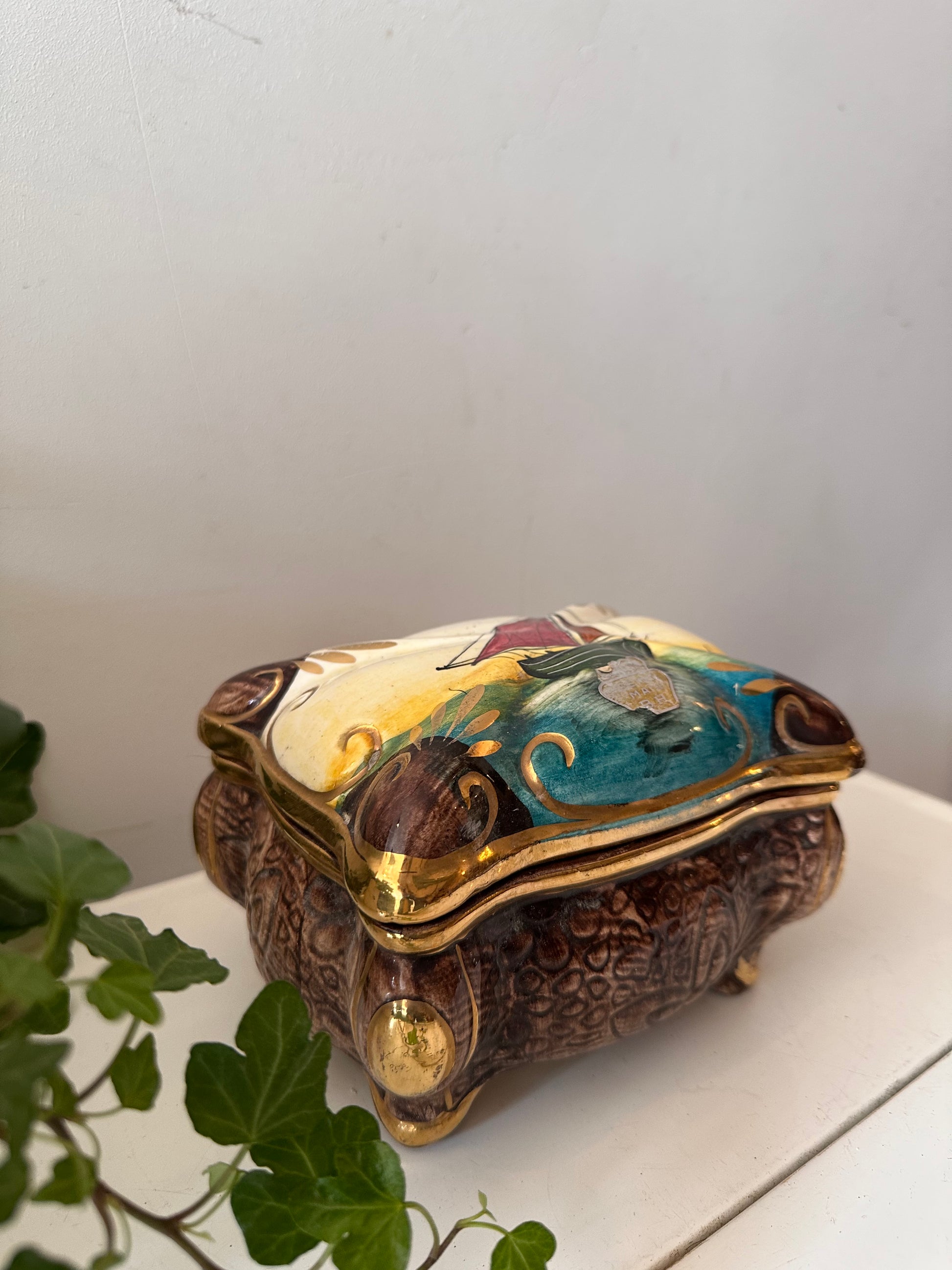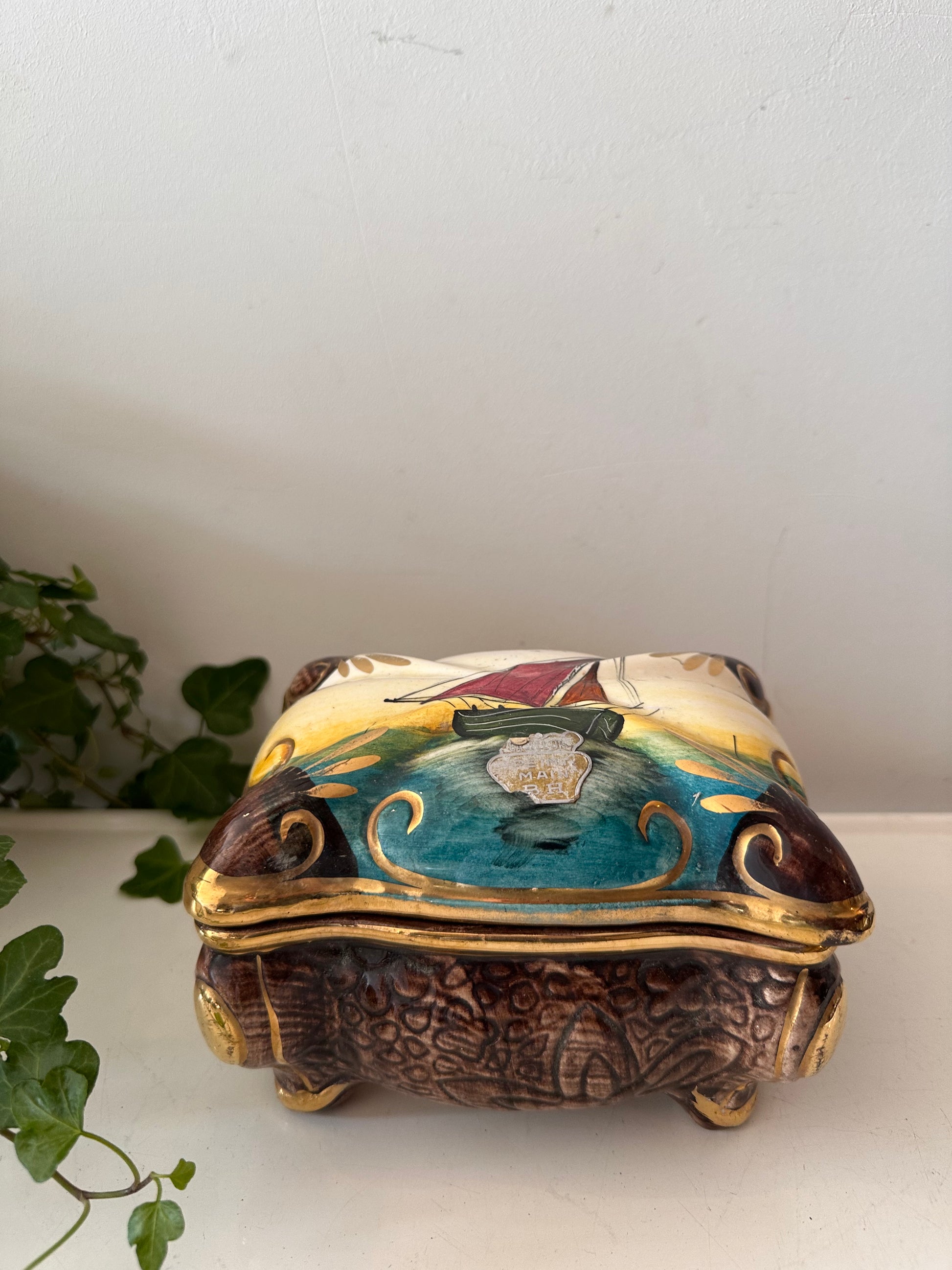 Mooi vintage bewaardoosje uit België, jaren 50/60. Handbeschilderd (peint main) met een kleurrijk tafereel van een boot, goudaccenten en reliëfdecoratie. Ideaal als sieradendoosje of klein opbergdoosje, en zeker een pronkstuk om neer te zetten. Q1