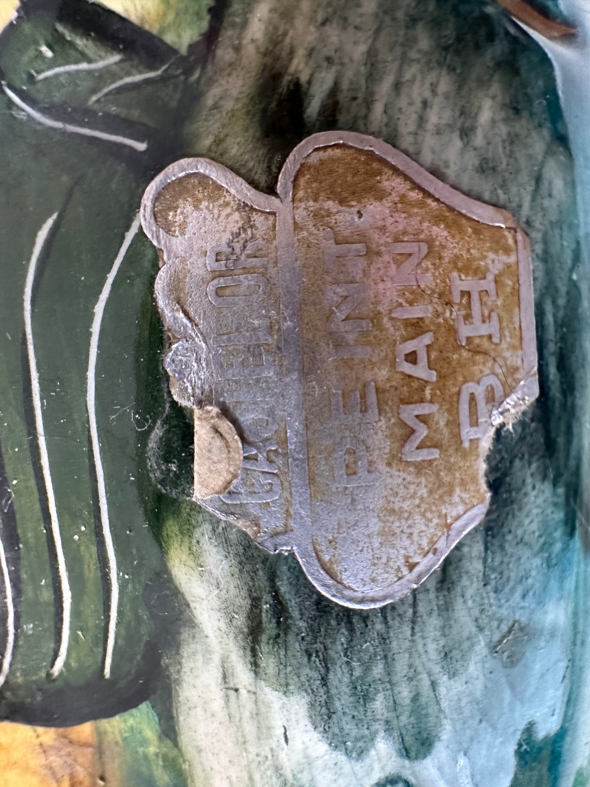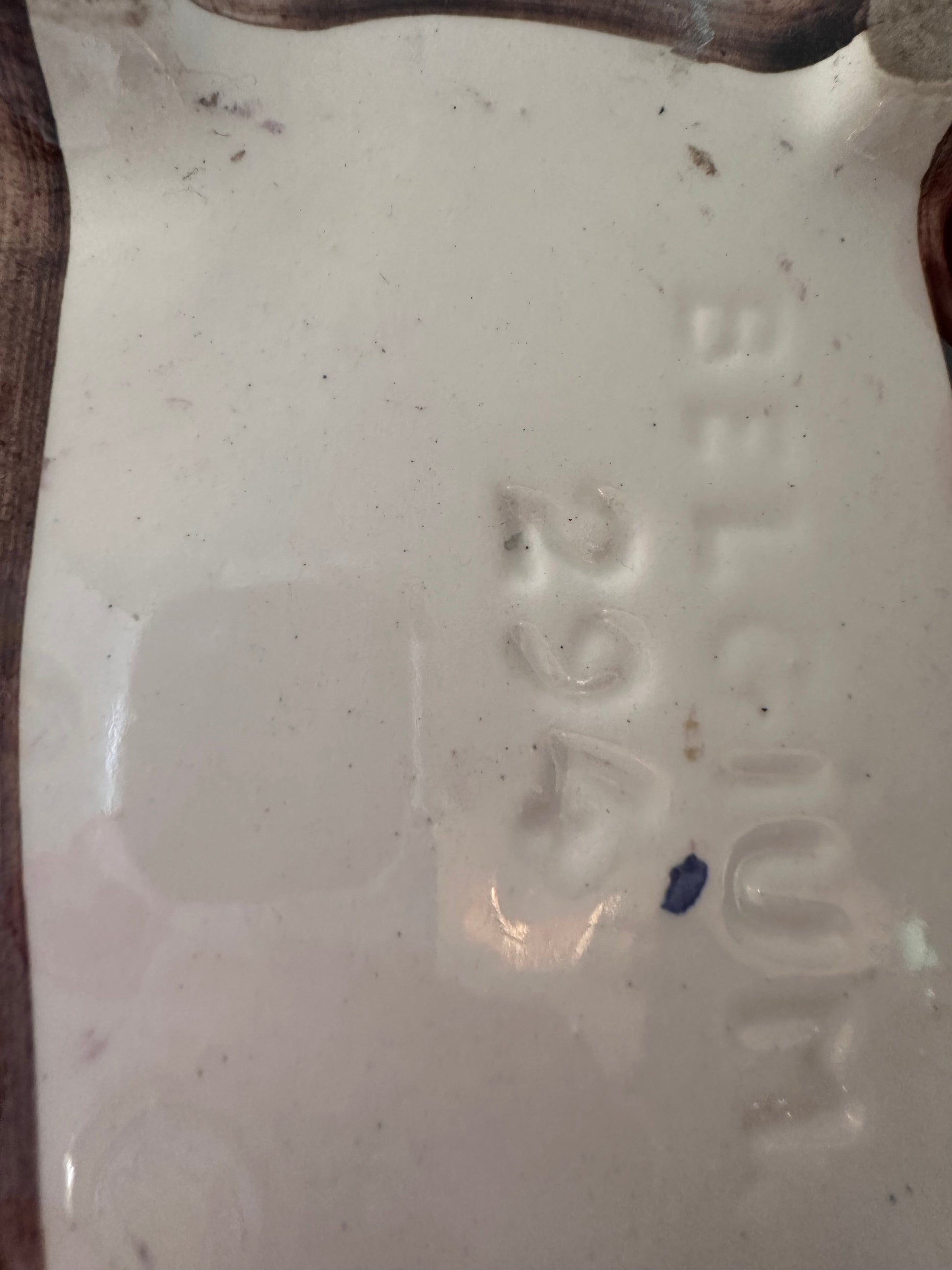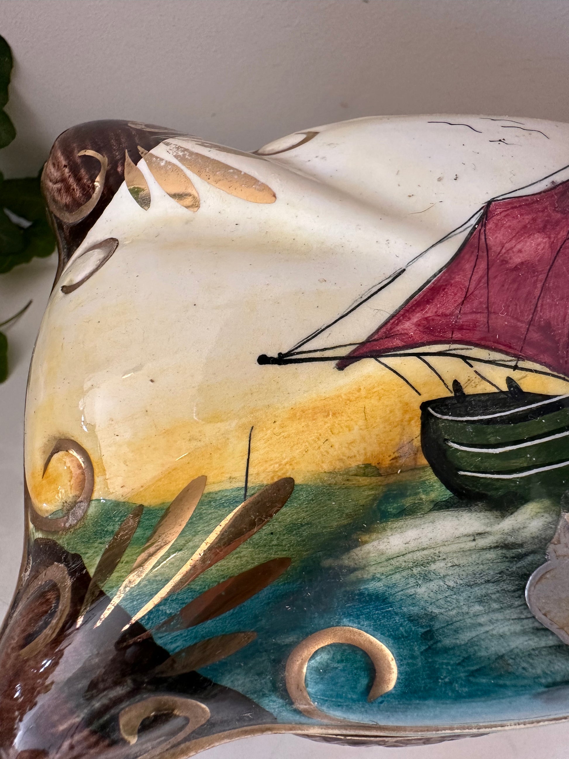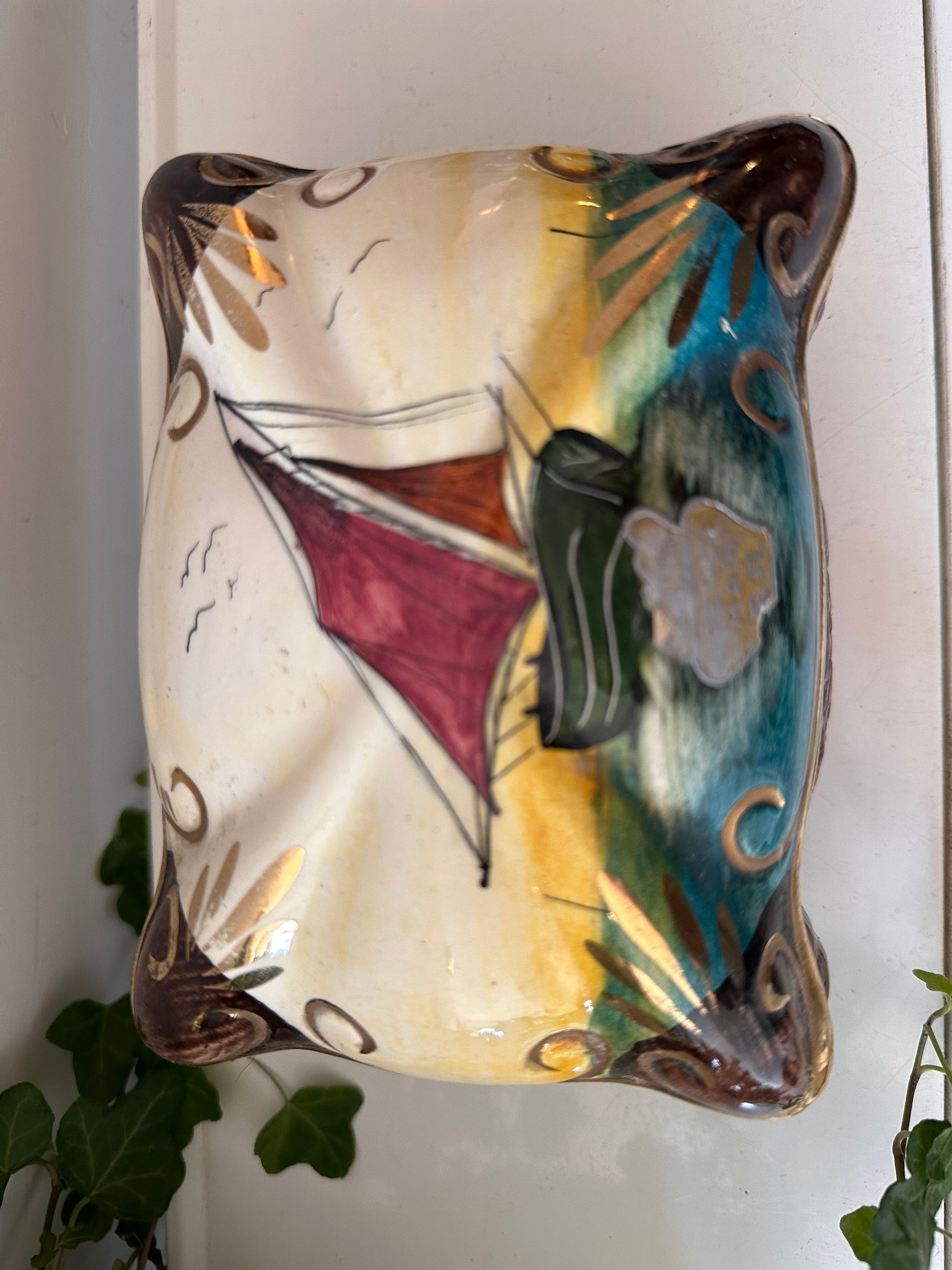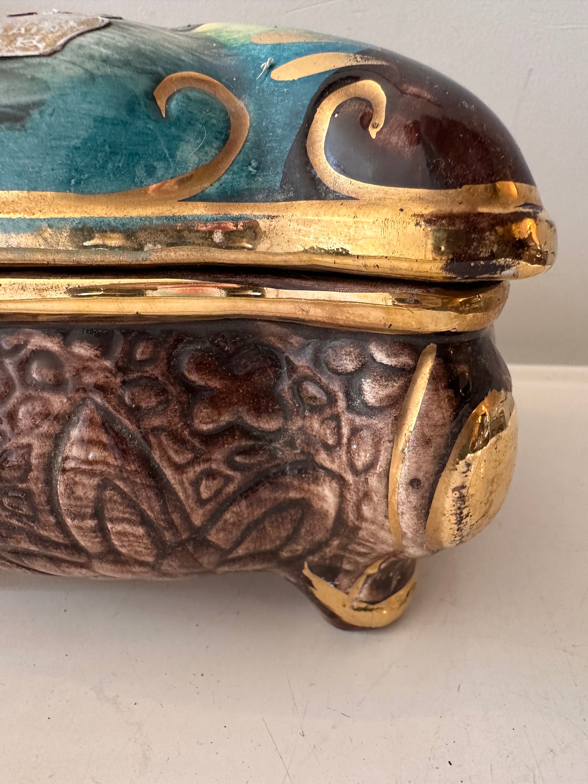 Mooi vintage bewaardoosje uit België, jaren 50/60. Handbeschilderd (peint main) met een kleurrijk tafereel van een boot, goudaccenten en reliëfdecoratie. Ideaal als sieradendoosje of klein opbergdoosje, en zeker een pronkstuk om neer te zetten. Q1