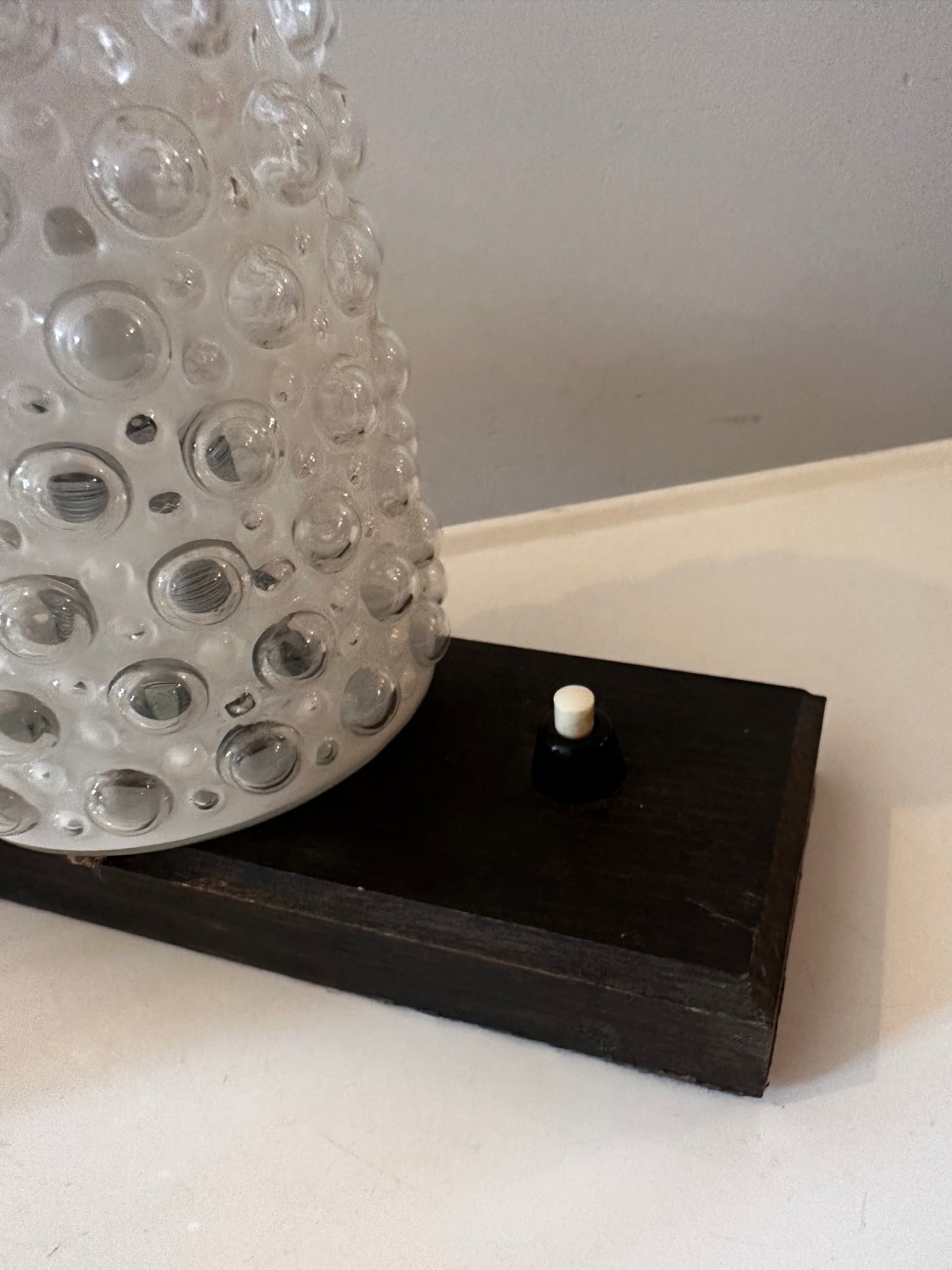 Supertof lampje met bolletjesglas op een houten voet. Het glas geeft een zacht, diffuus licht en het retro knopje maakt ’m helemaal af. Een echt jaren ’60 – minimalistisch met karakter. Werkt nog perfect. Q98