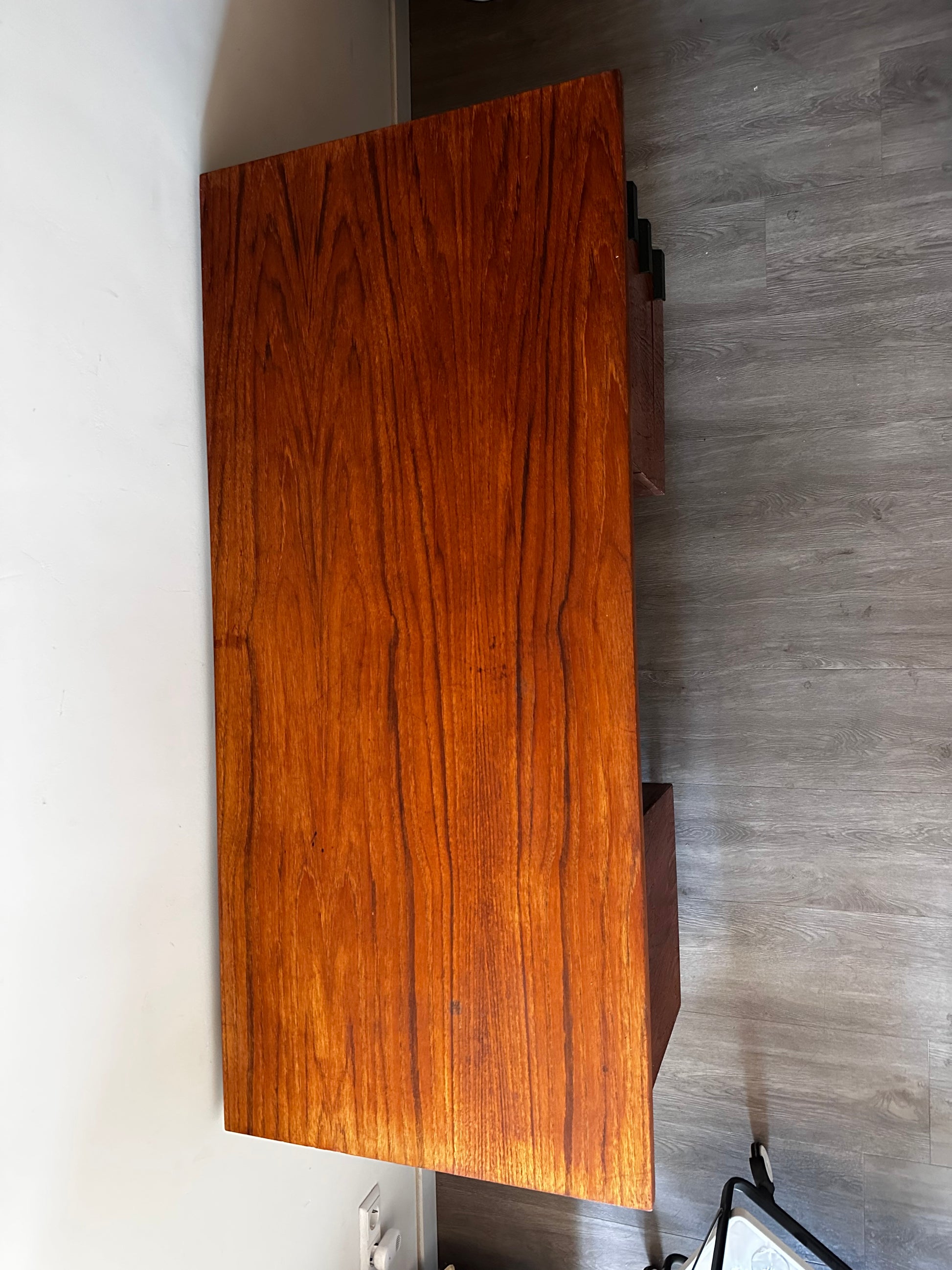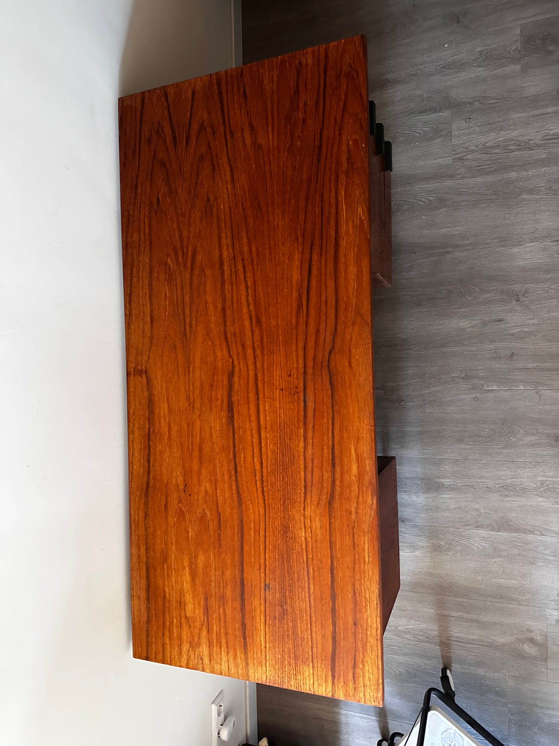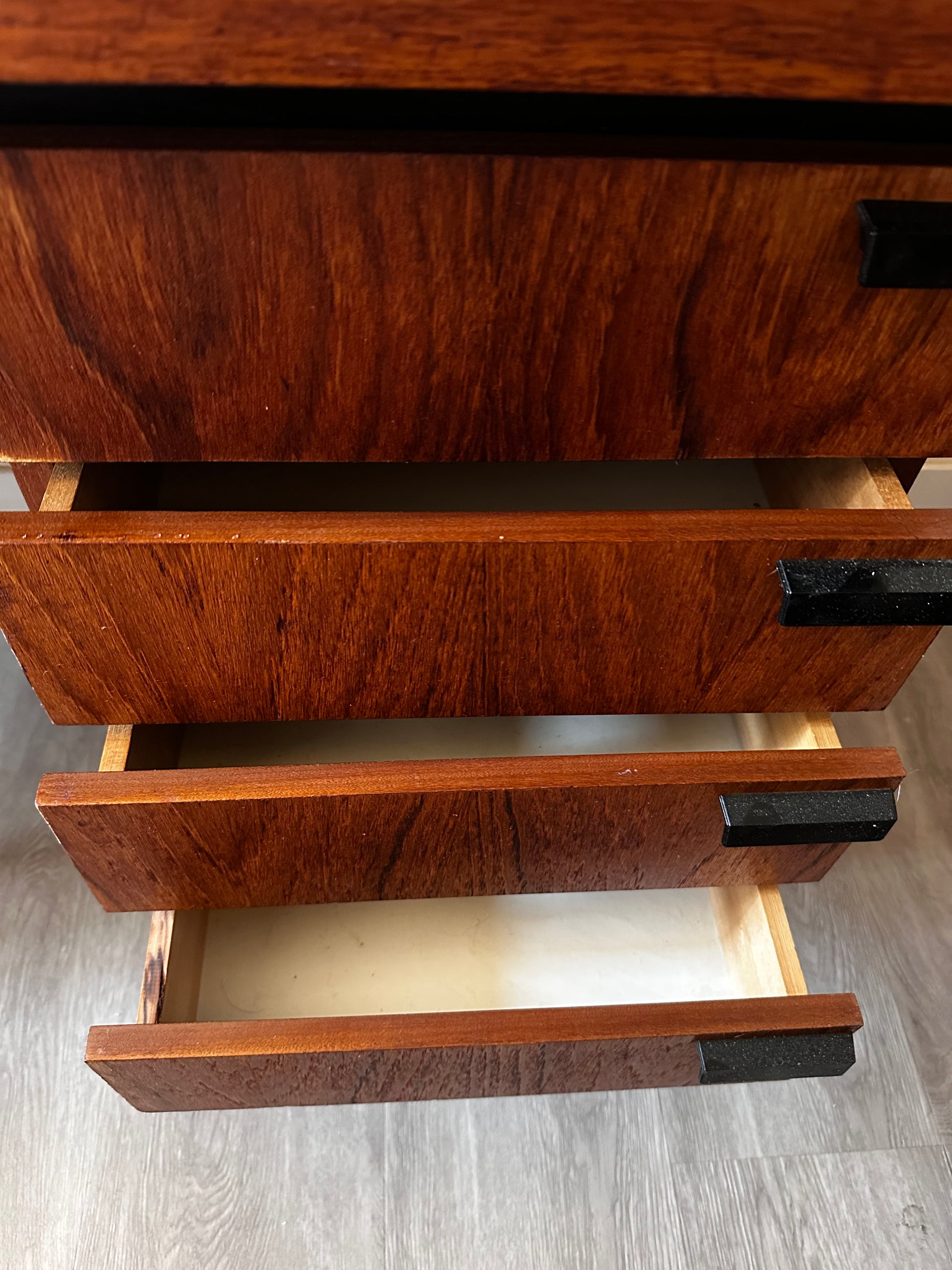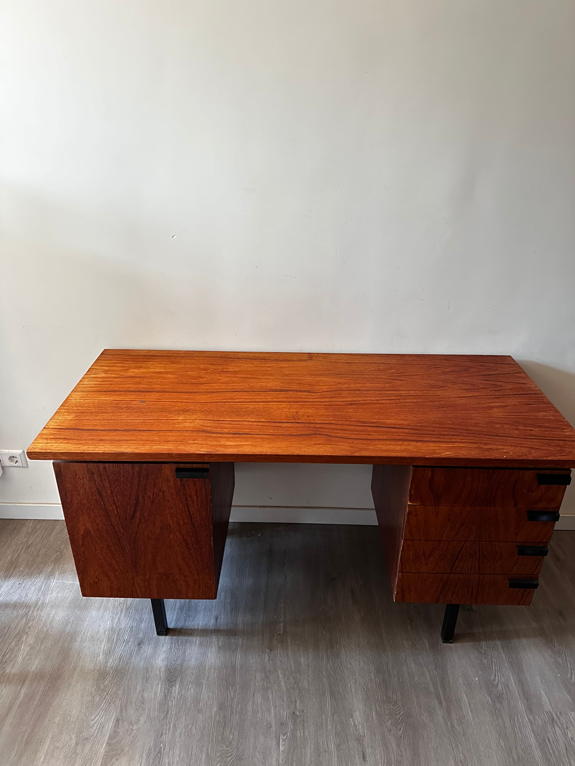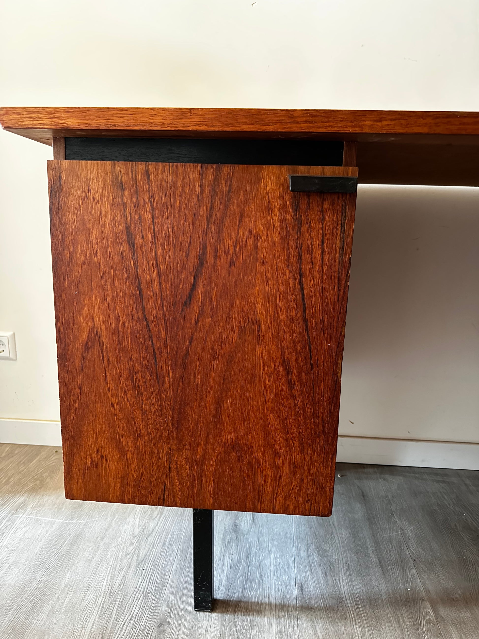 Strak en tijdloos bureau uit de jaren ’60, uitgevoerd in warm teakfineer met zwarte metalen poten. Mooi zwevend ontwerp met rechts drie lades en links een afsluitbare kast. Minimalistisch design met functionele details — typisch mid-century modern.
