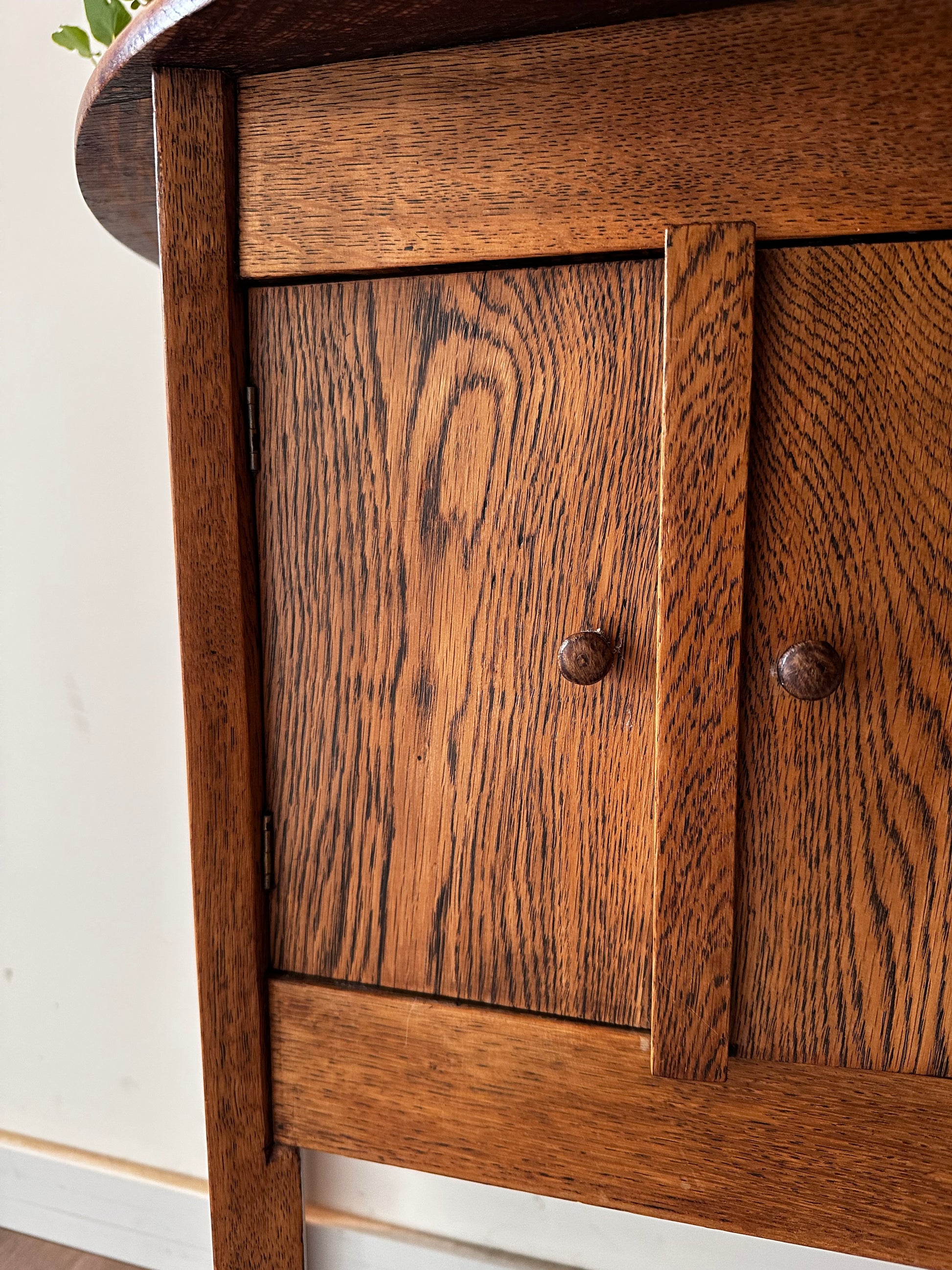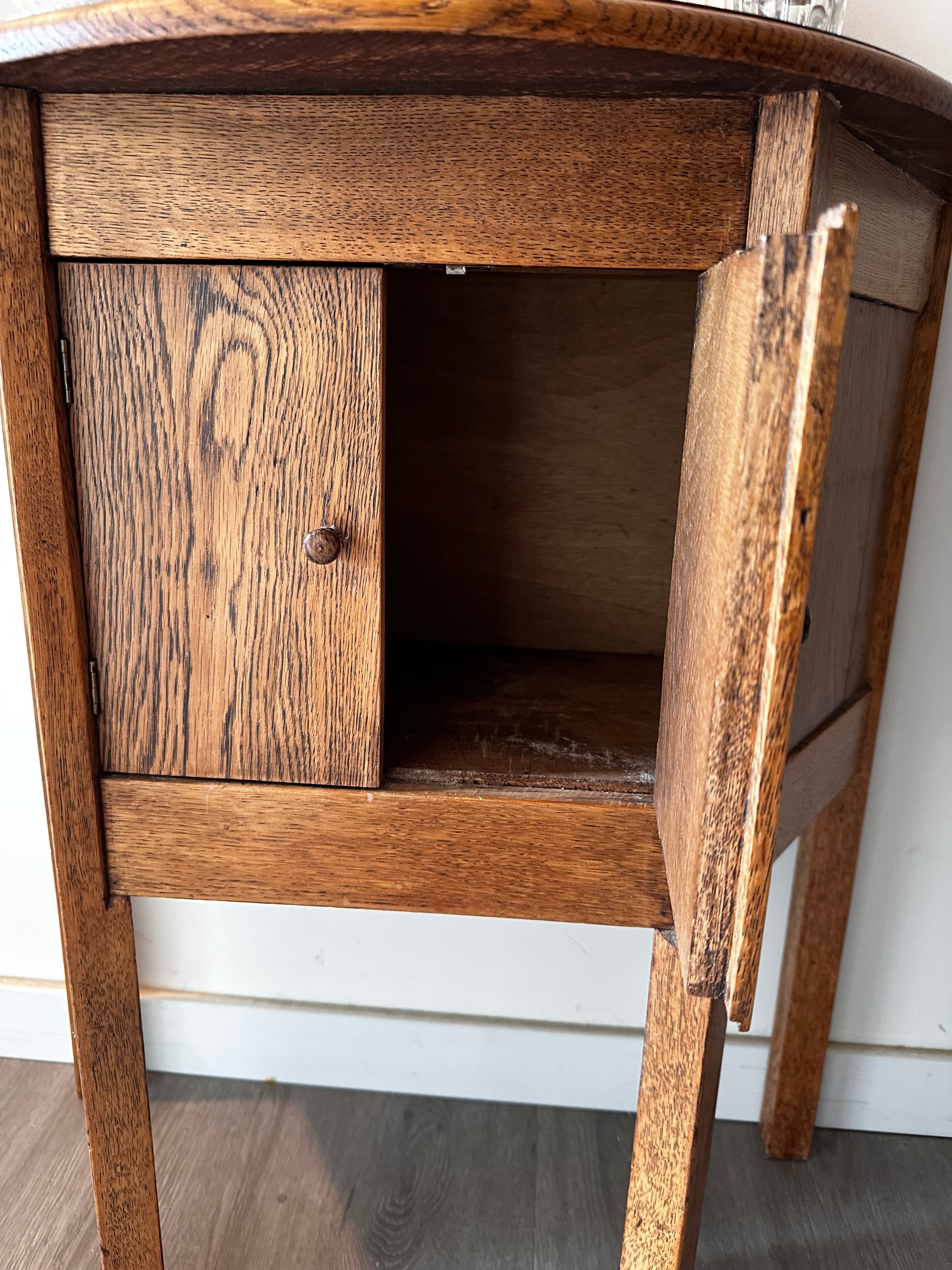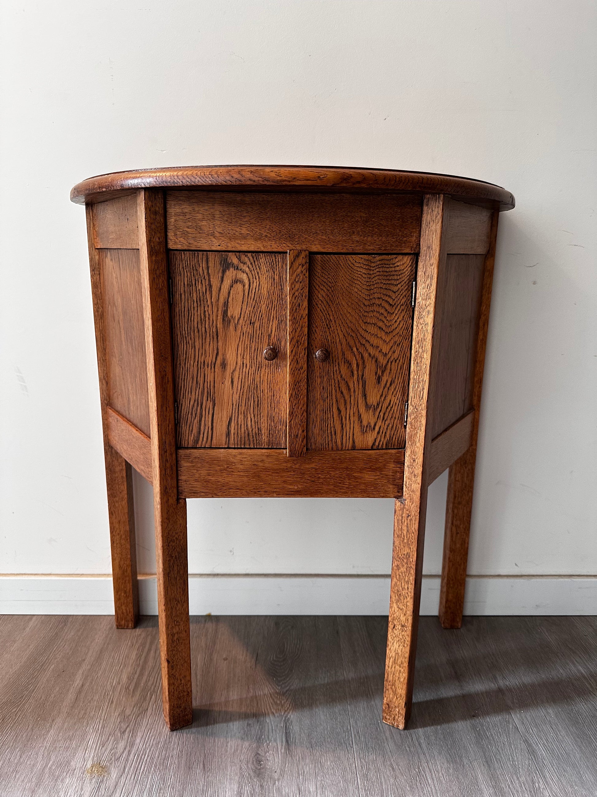 Een te gek kastje bijzettafeltje. Soort hoekige halve maan vorm. Kastje heeft twee deurtjes. In een mooie vintage staat met lichte gebruiksporen. Dateert rond de jaren 70 en afkomstig Nederland.