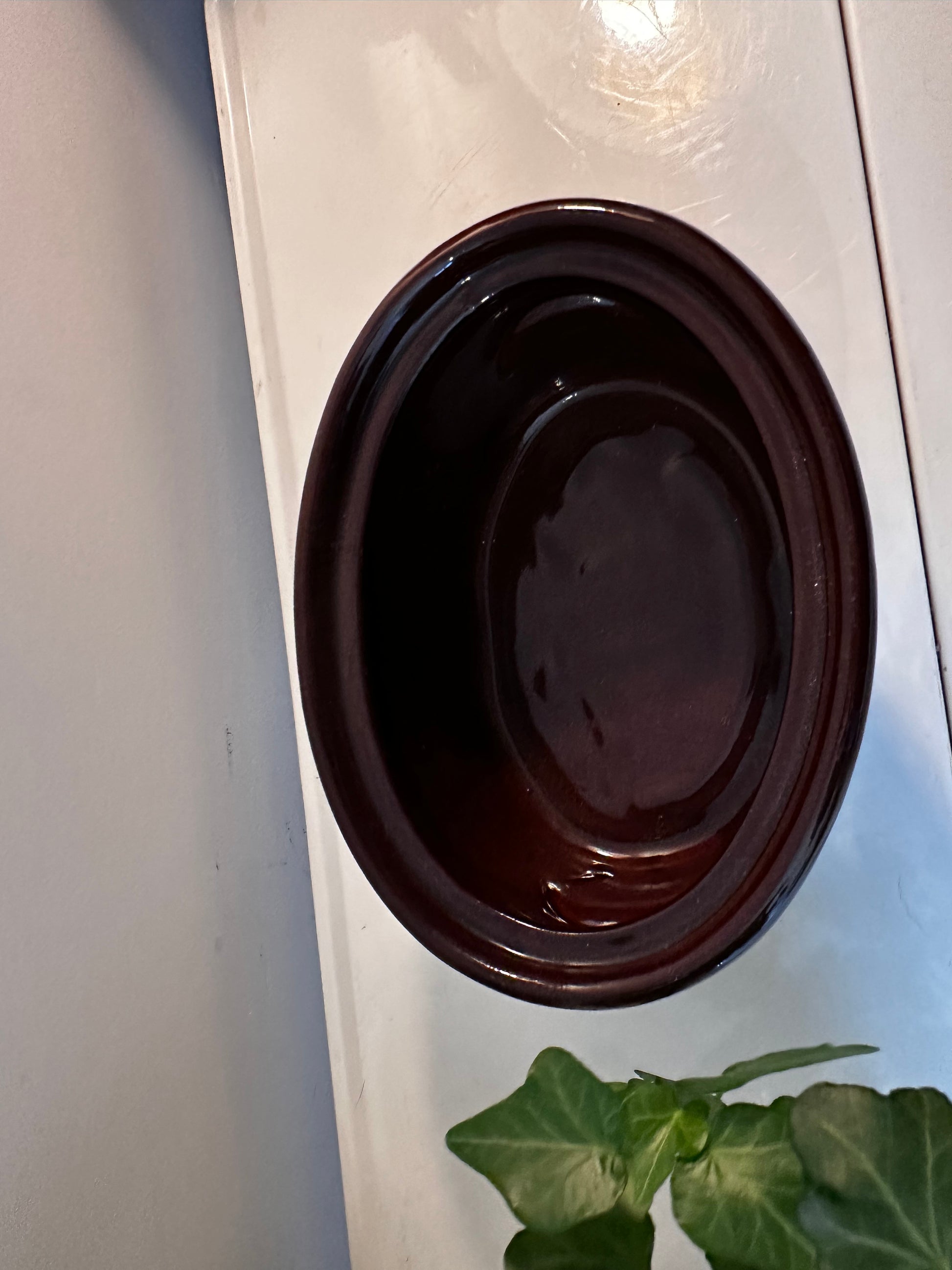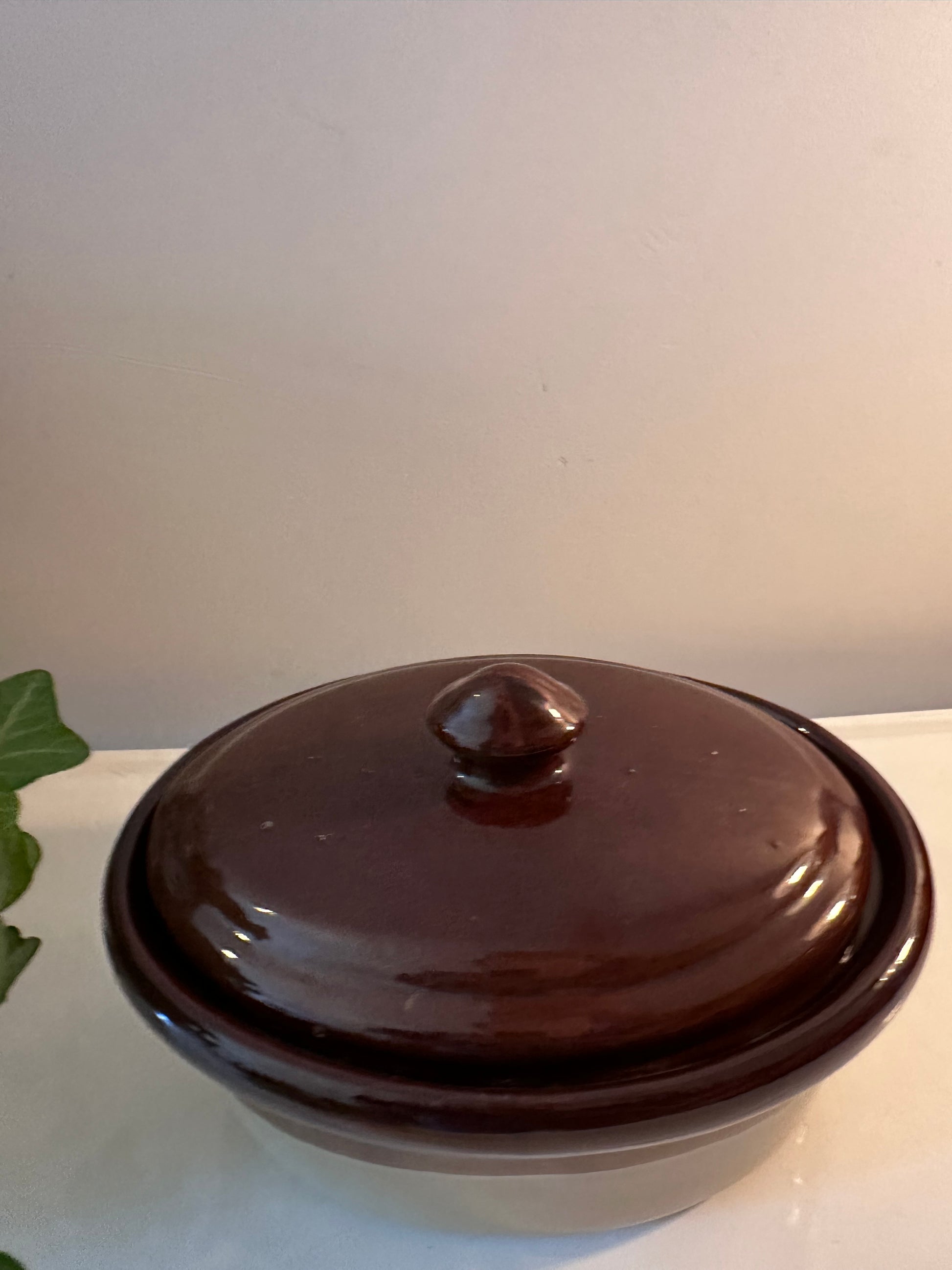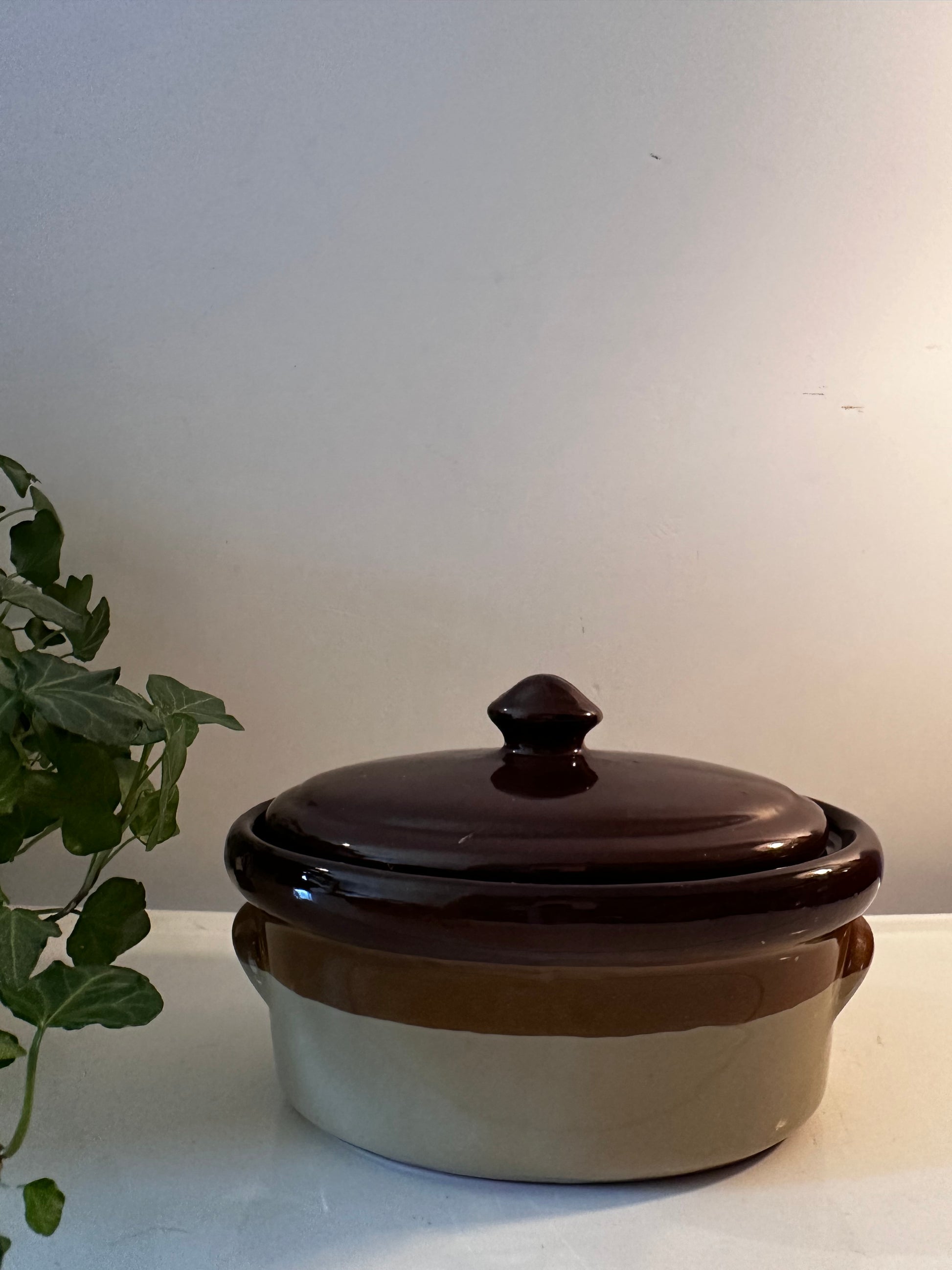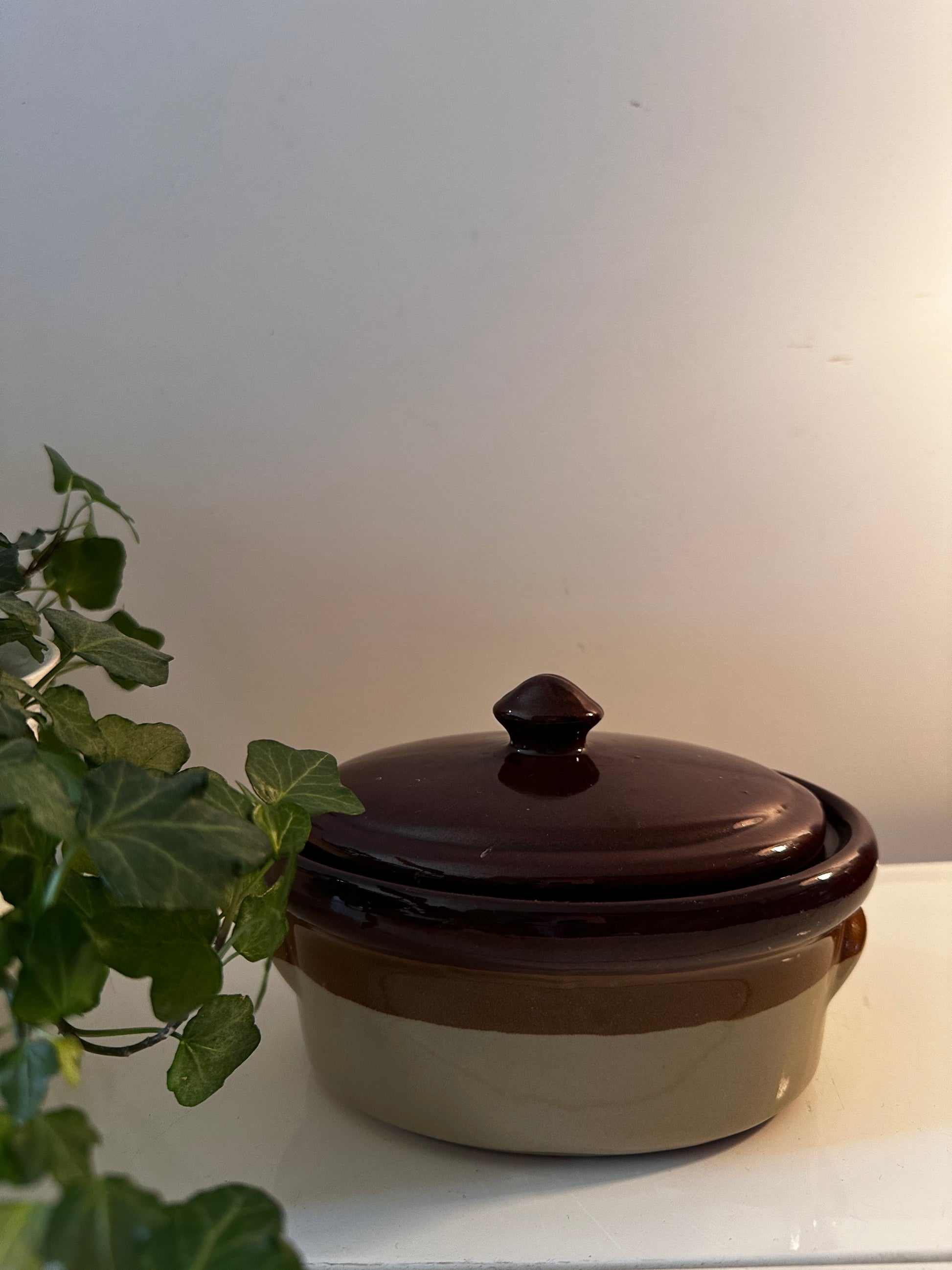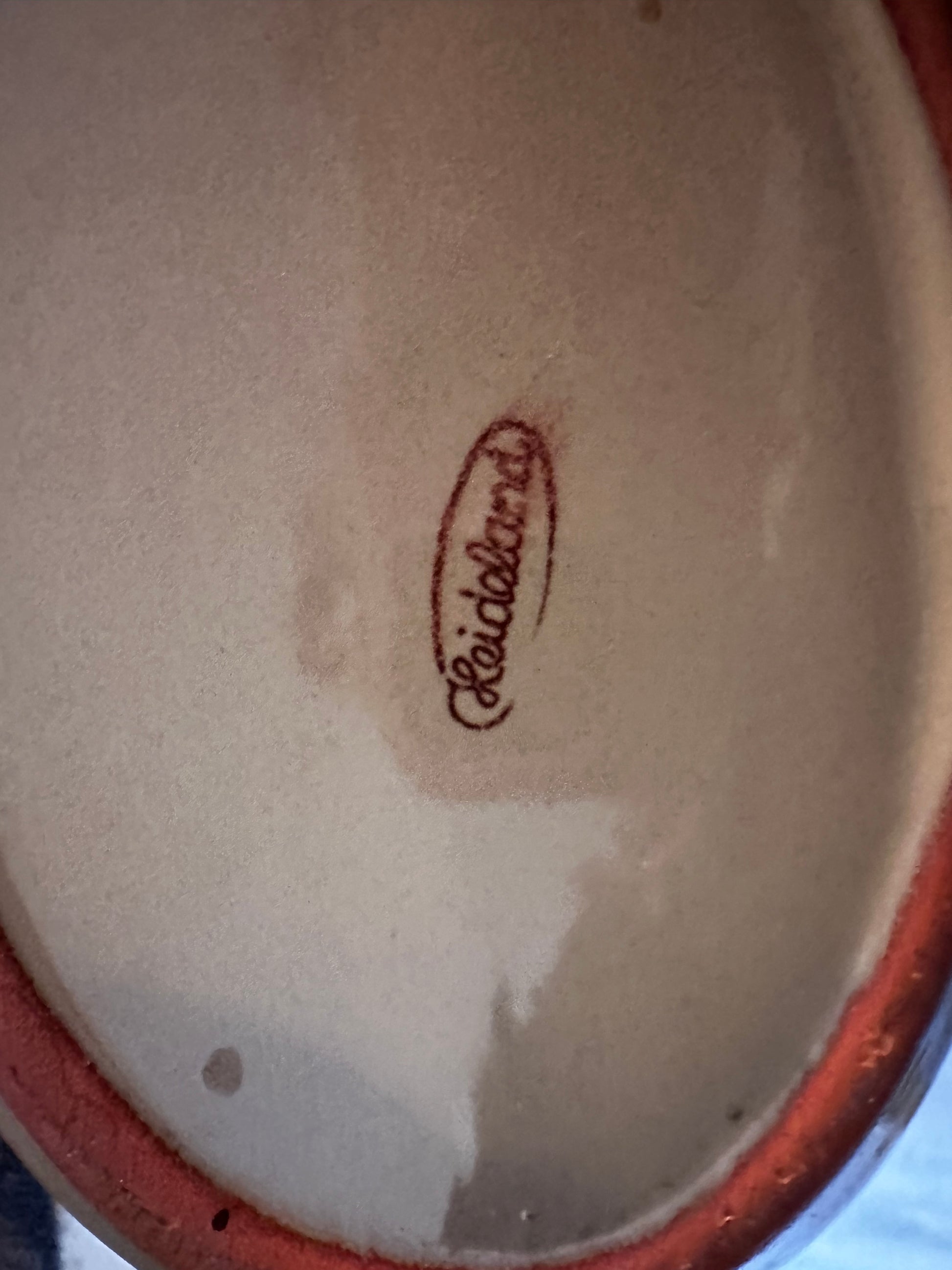 Een waanzinnig mooi ovenschaaltje. Dateert uit de jaren 70 en afkomstig uit Duitsland. De ovenschaal is van keramiek en heeft een beige kleur die overloopt in donkerbruin. De schaal is gemerkt onder Heideland.