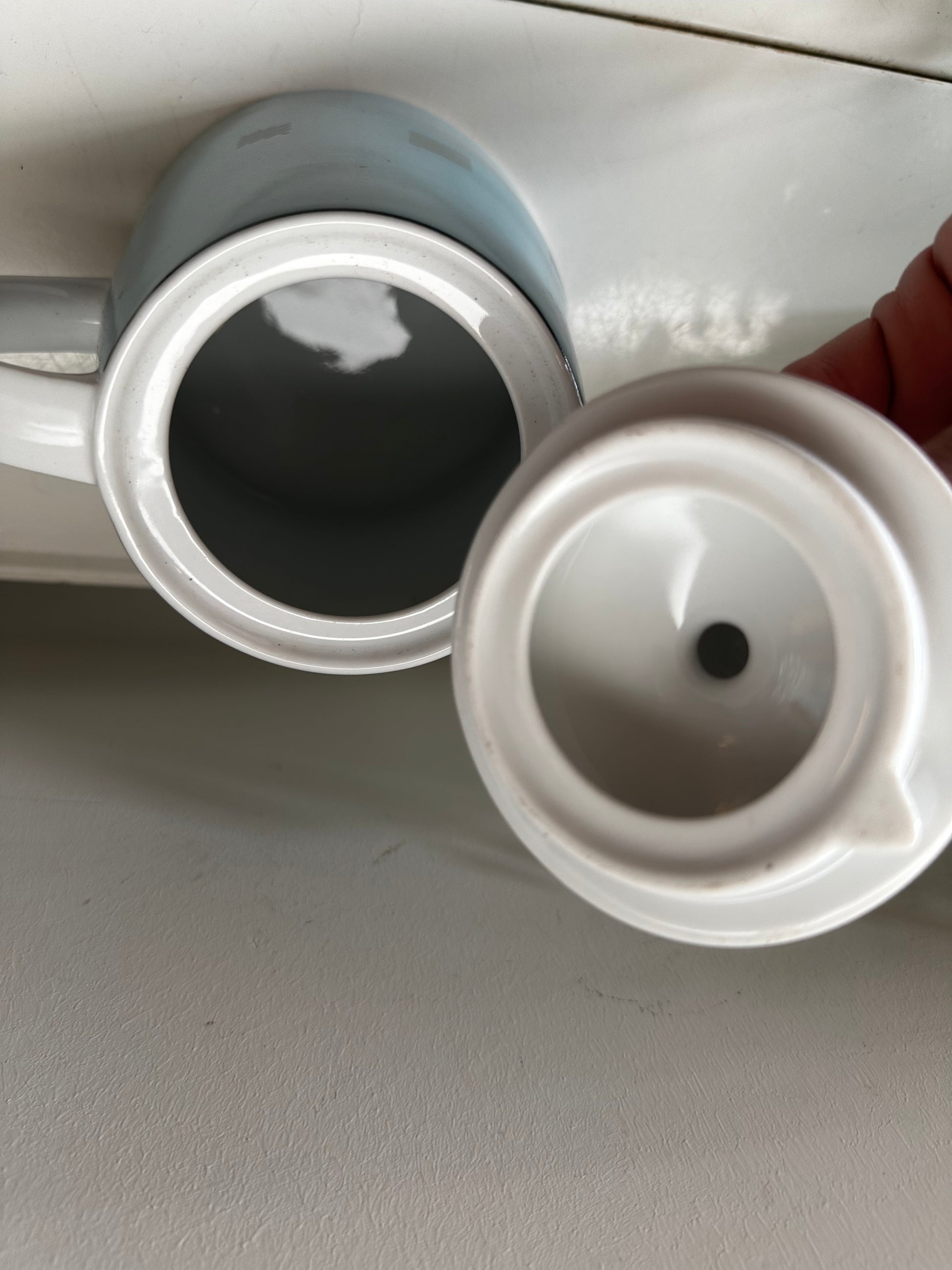 Strak vormgegeven koffiekan in zacht lichtblauw met witte details en een grafisch decor rondom. Mooie heldere vorm en compleet met deksel. Typisch jaren 80 ontwerp met een frisse uitstraling. Voorzien van merk aan de onderzijde. Q703