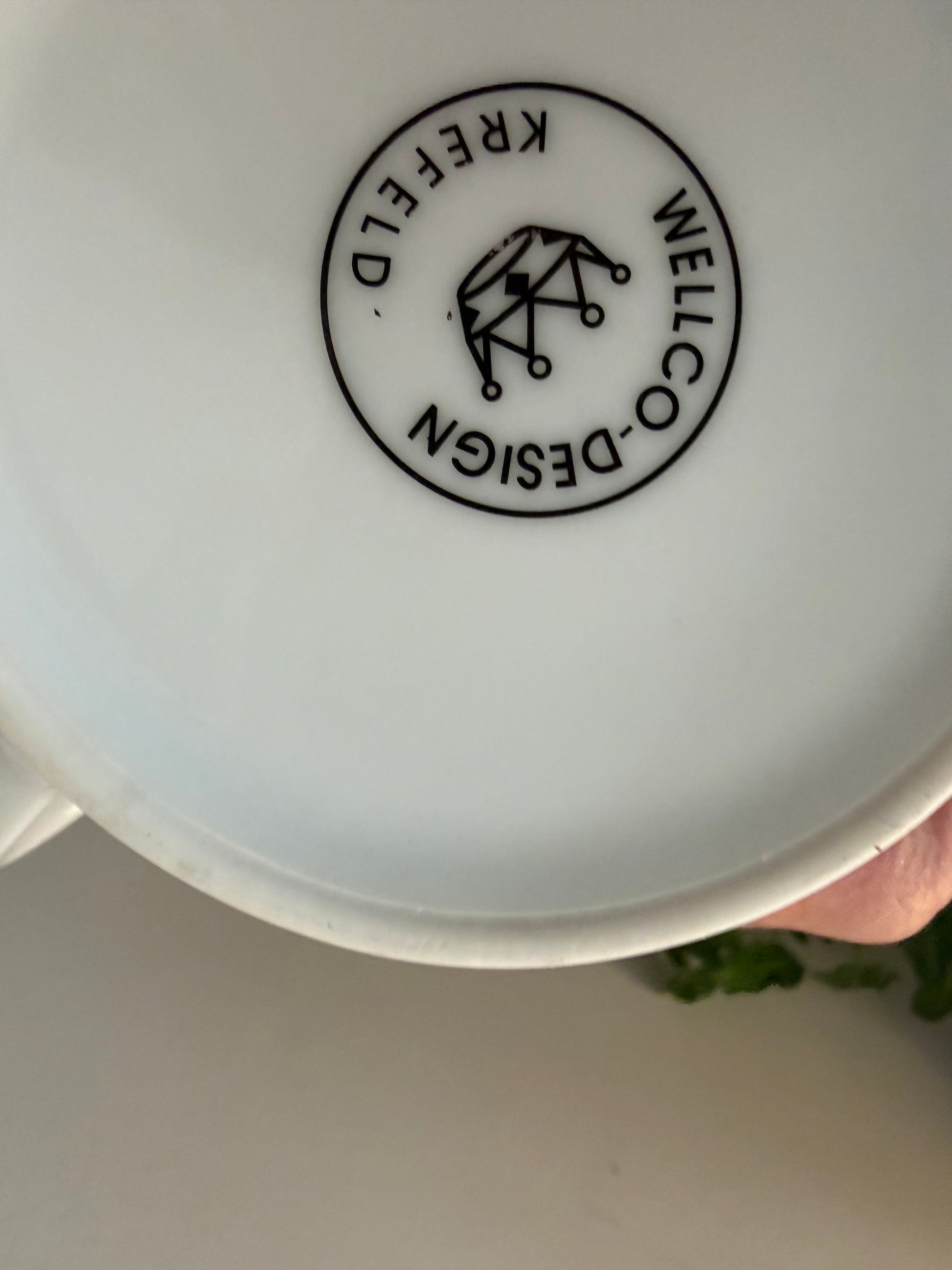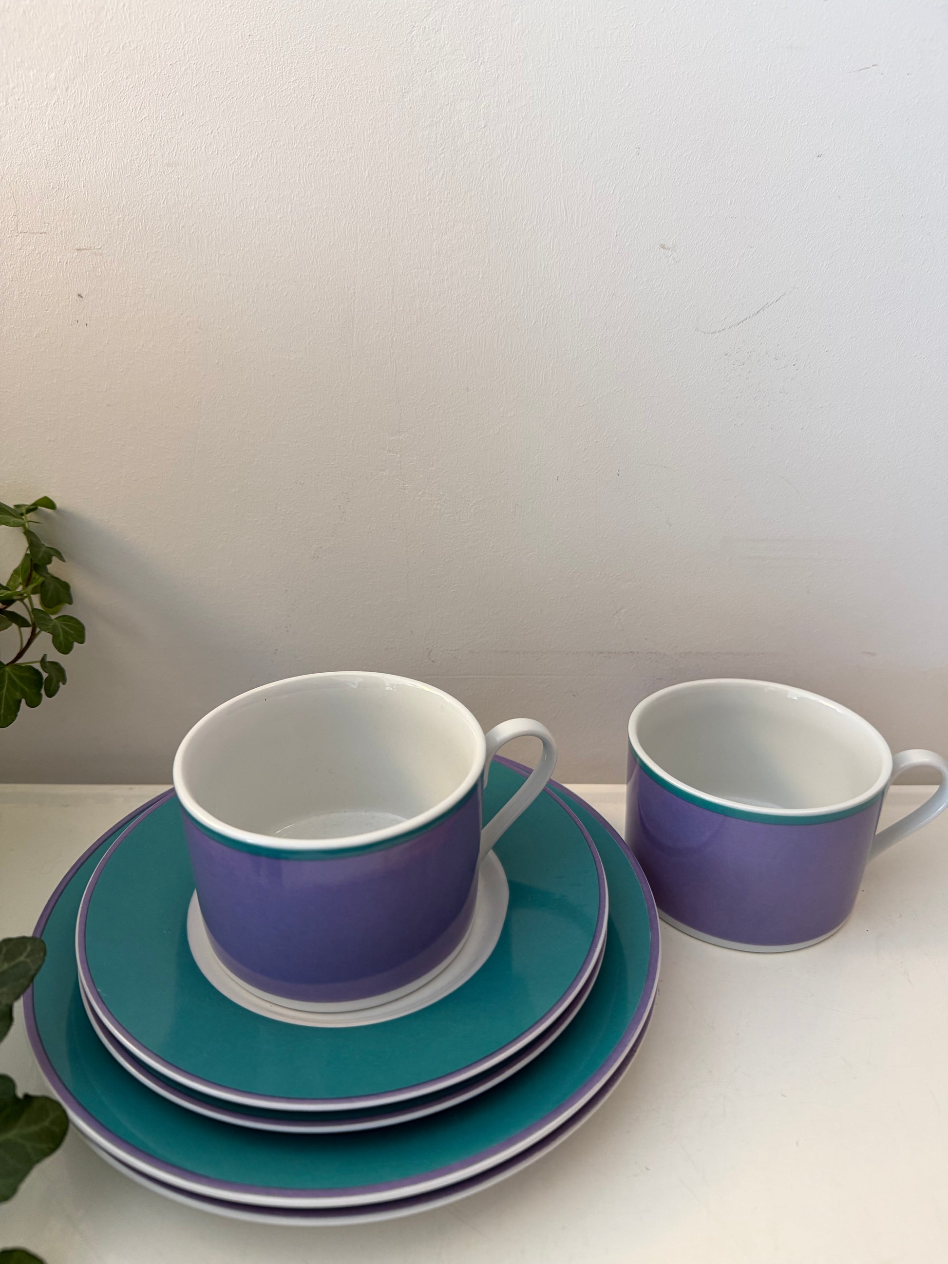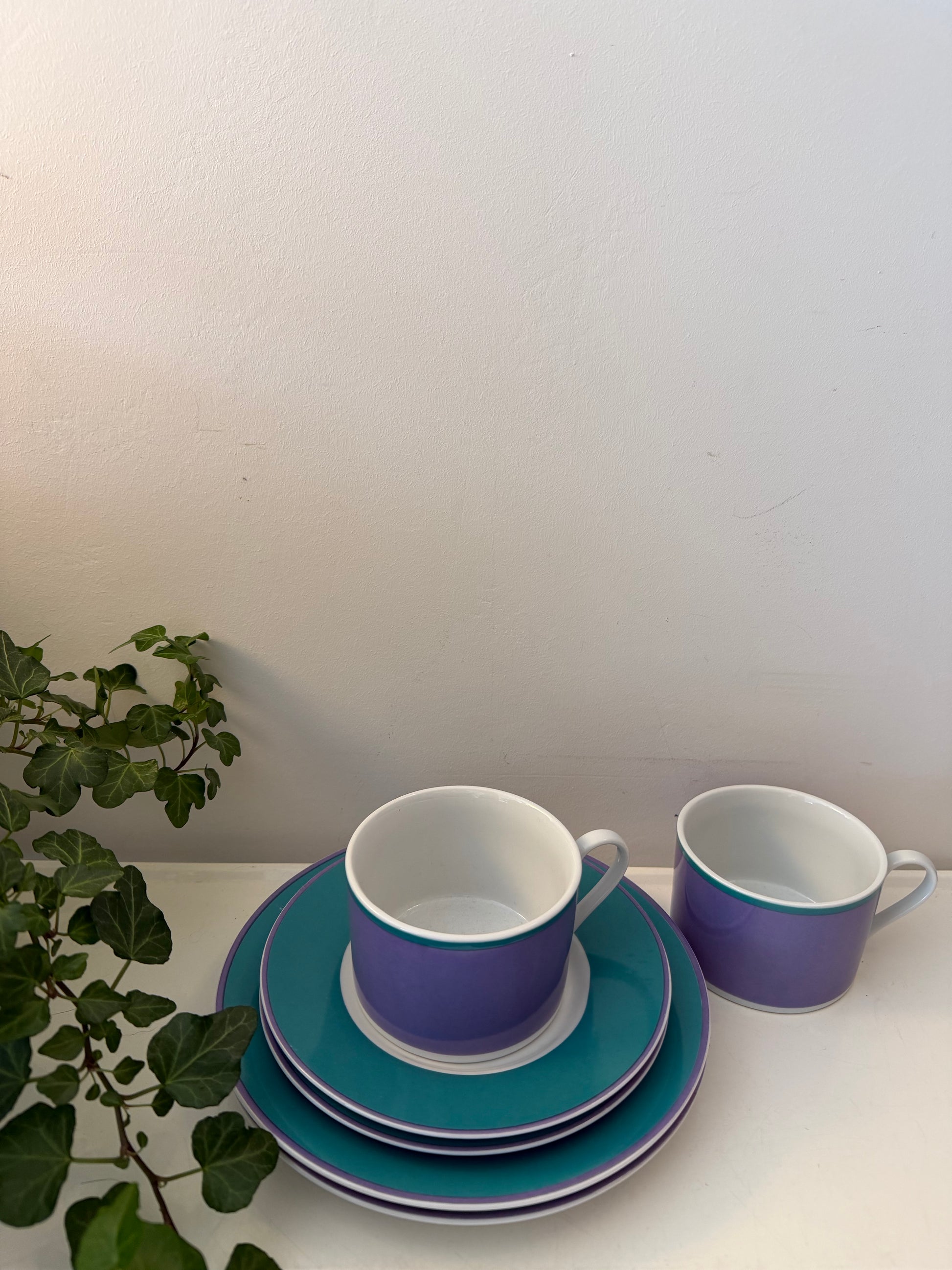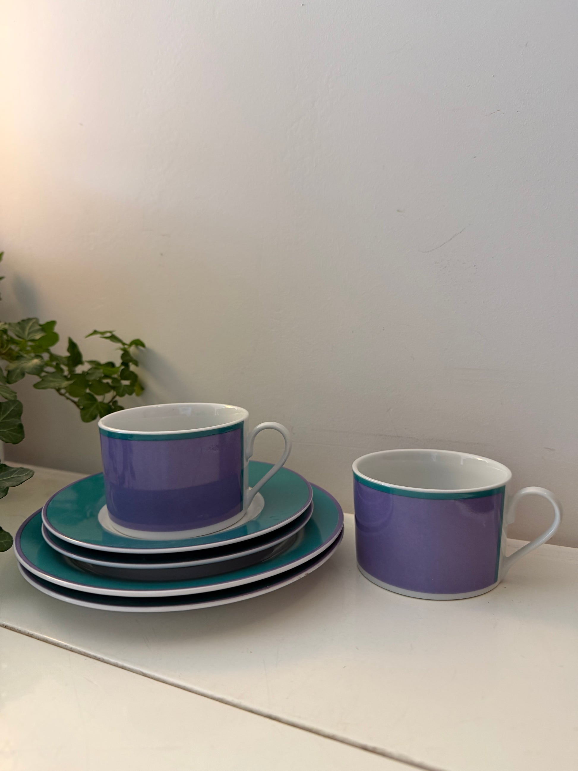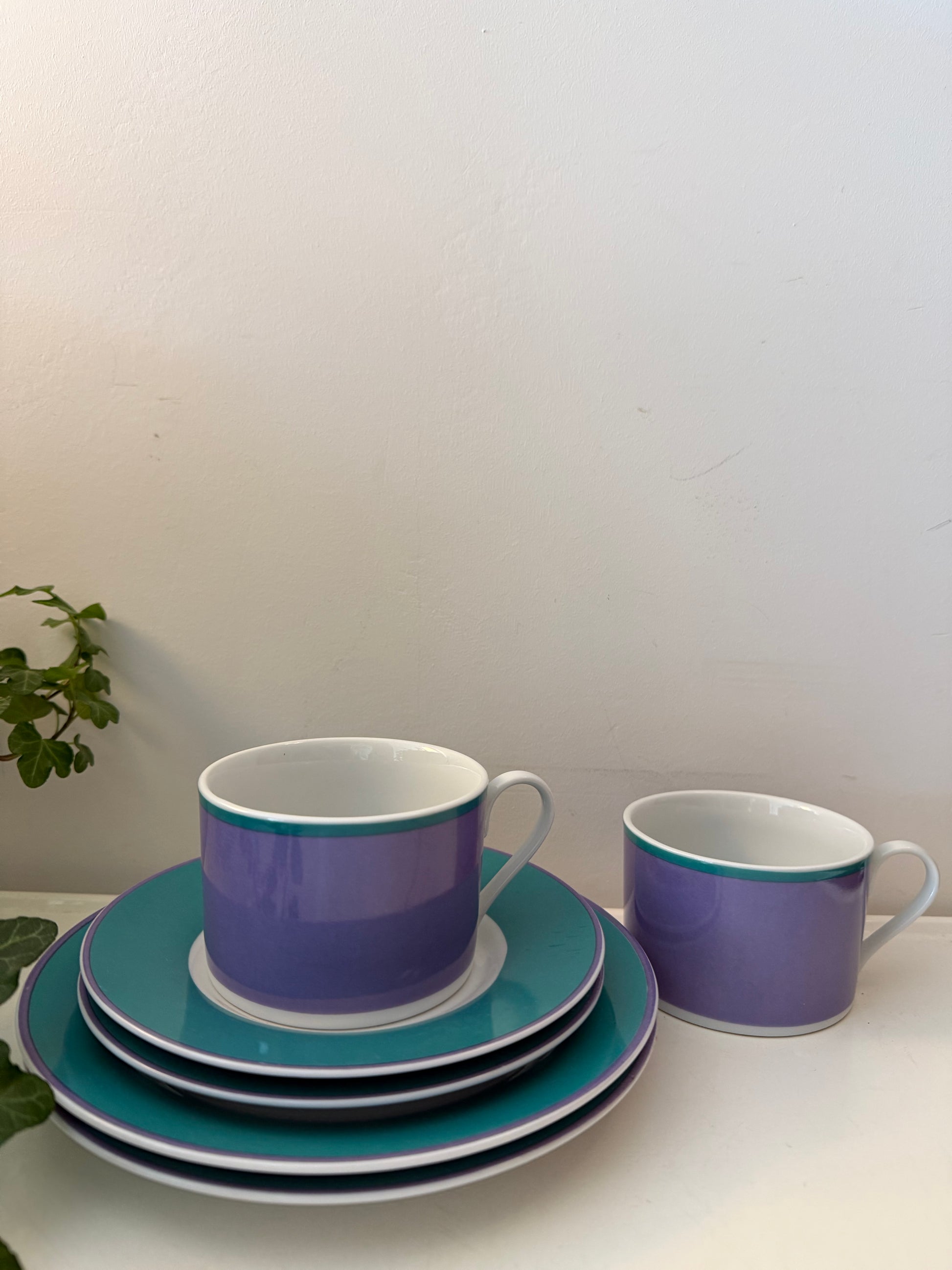 Mooi strak servies uit de jaren 80 van Wellco-Design uit Krefeld, Duitsland. Wit porselein met een brede paarse band en een turquoise rand. Typische 80’s kleurcombi. Q850