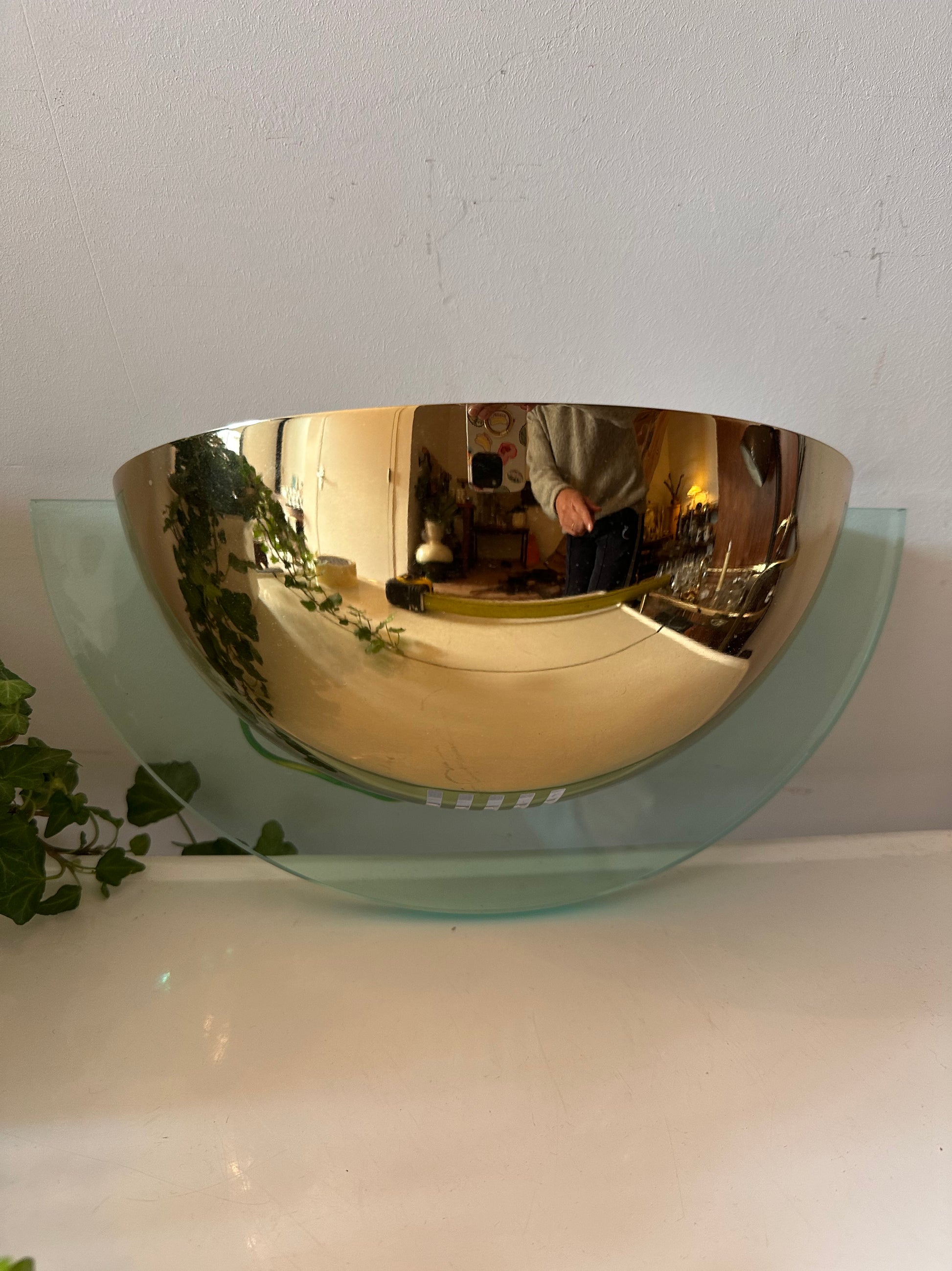 Supergave wandlamp uit de jaren 80, met een echte retro-glam look. De kap is van goudkleurig metaal met een zachte spiegelglans, gecombineerd met helder glas in een halve cirkelvorm. Die mix van materialen geeft dat typische ‘hotel chic’ gevoel uit de late eighties. Q546