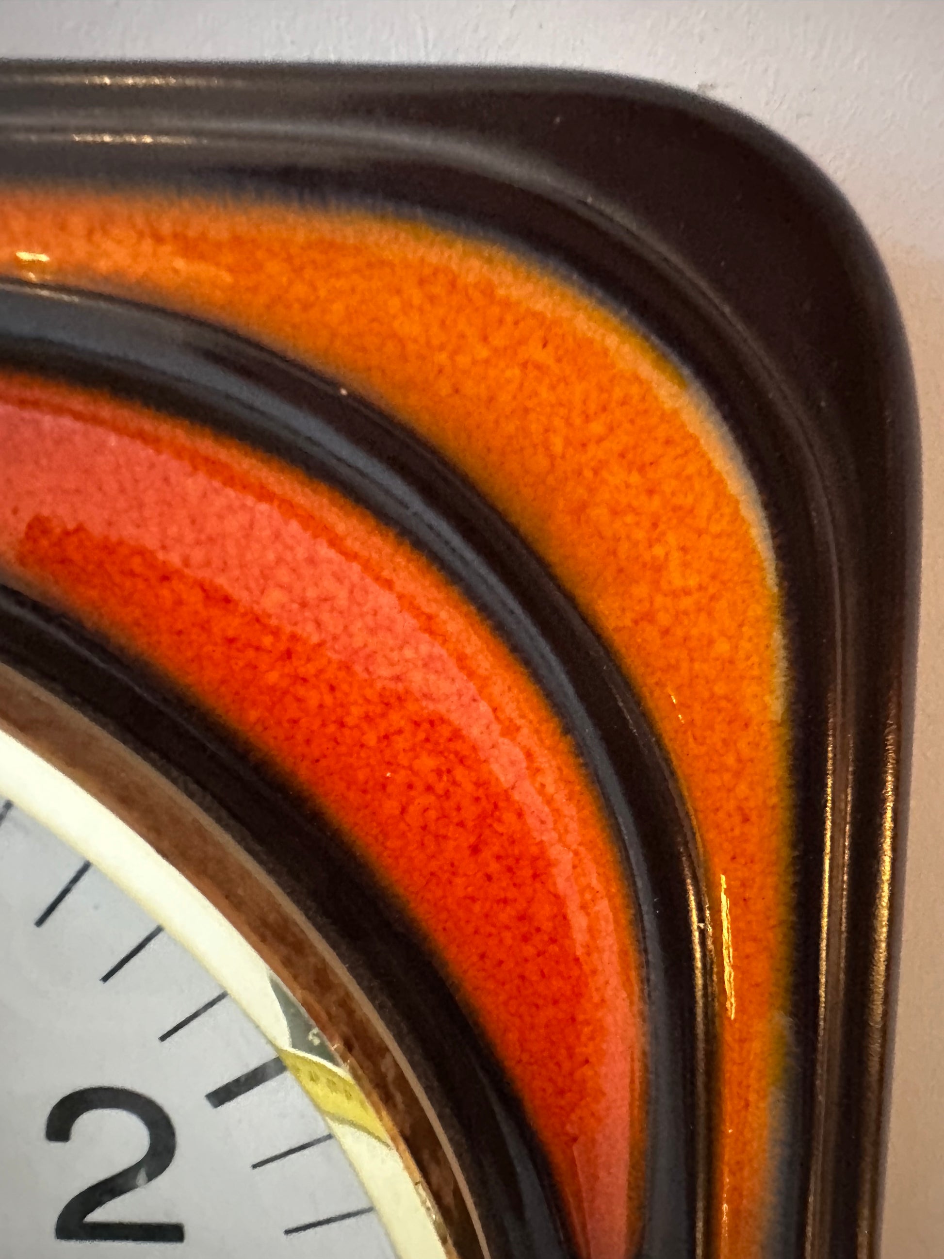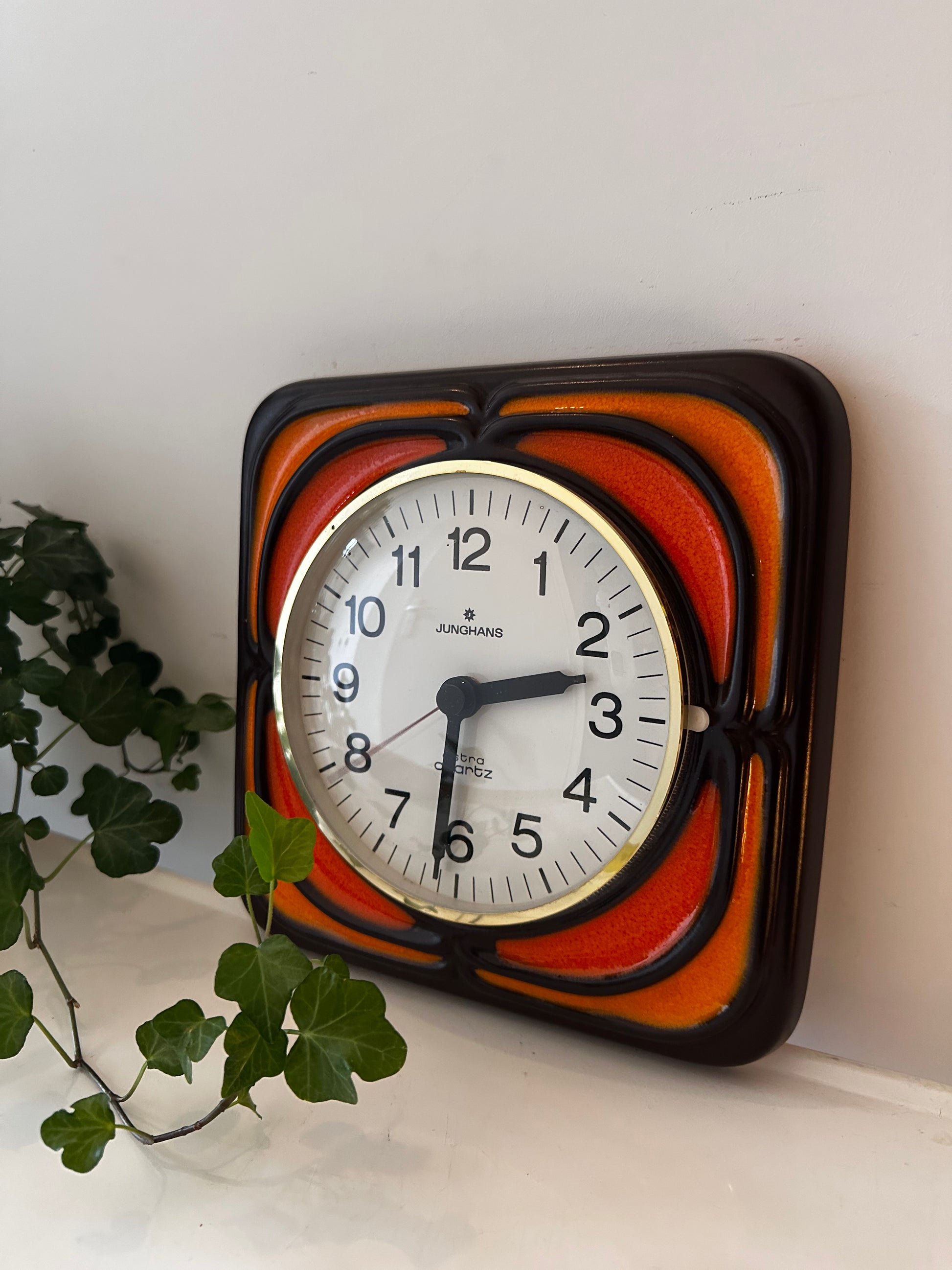 Deze keramieken wandklok van Junghans is een echte seventies blikvanger. Met de herkenbare oranje-bruin tinten in glazuur en het strakke design is dit echt een jaren 70 topper. In een supermooie vintage staat. Q938