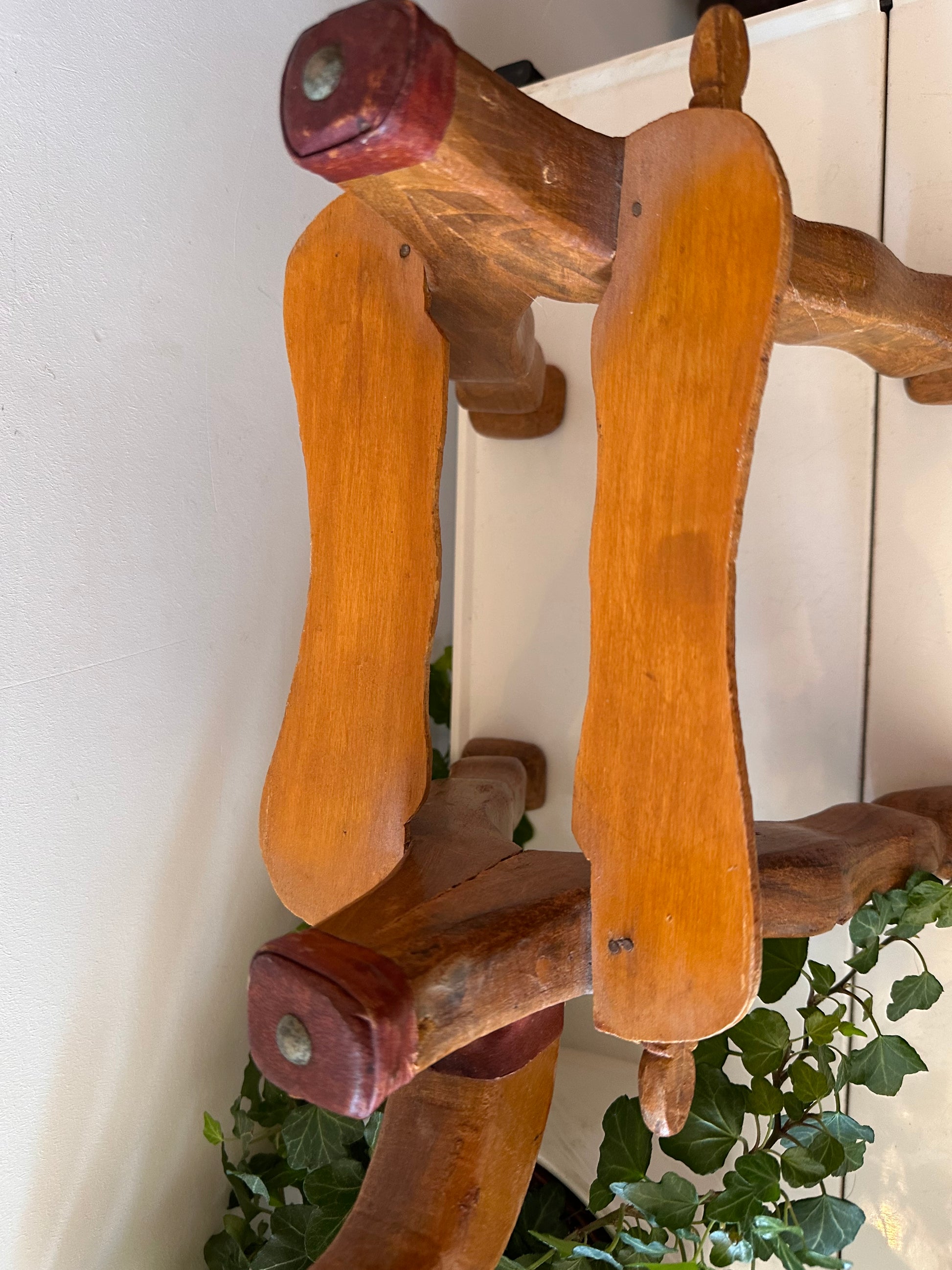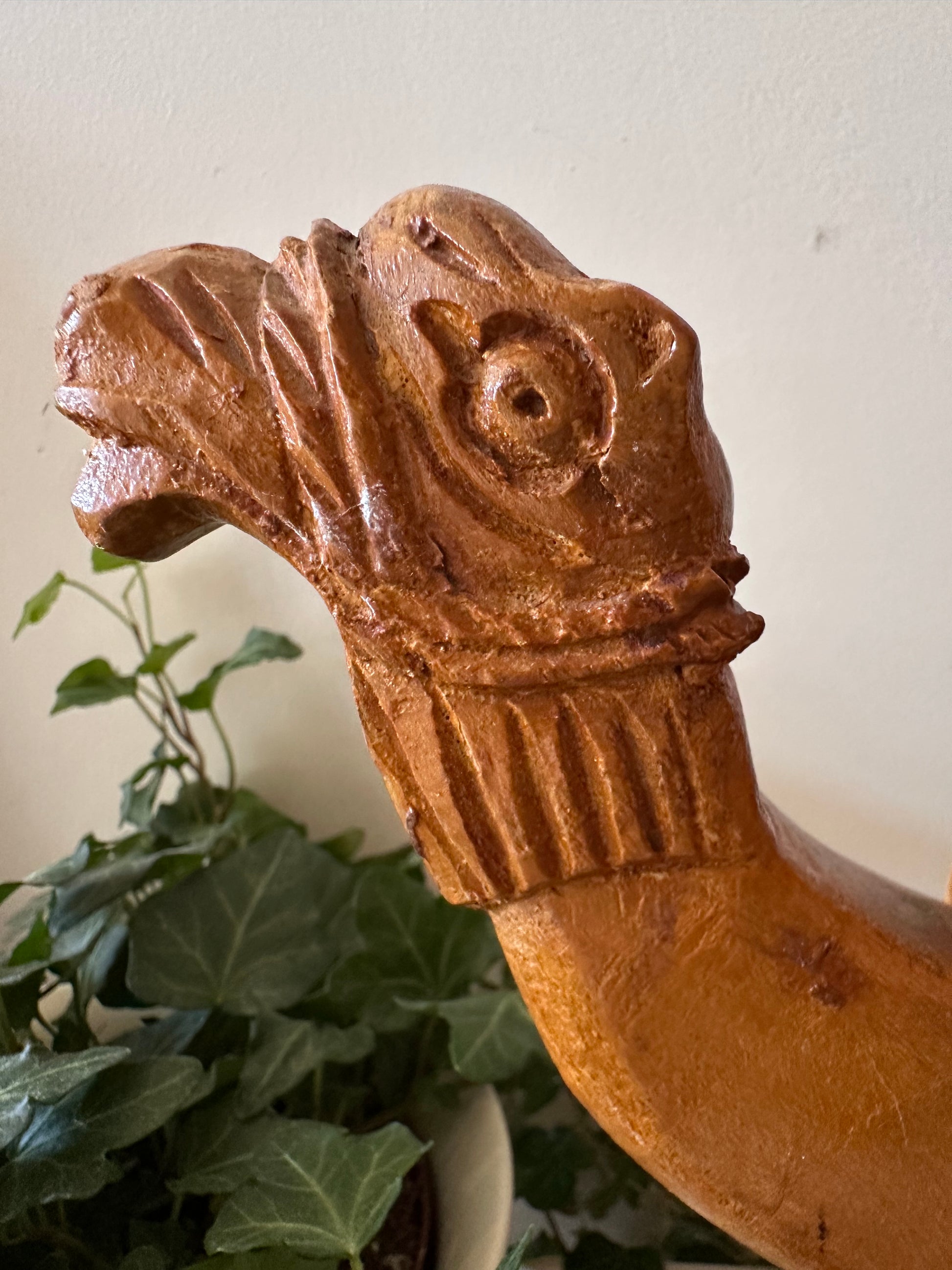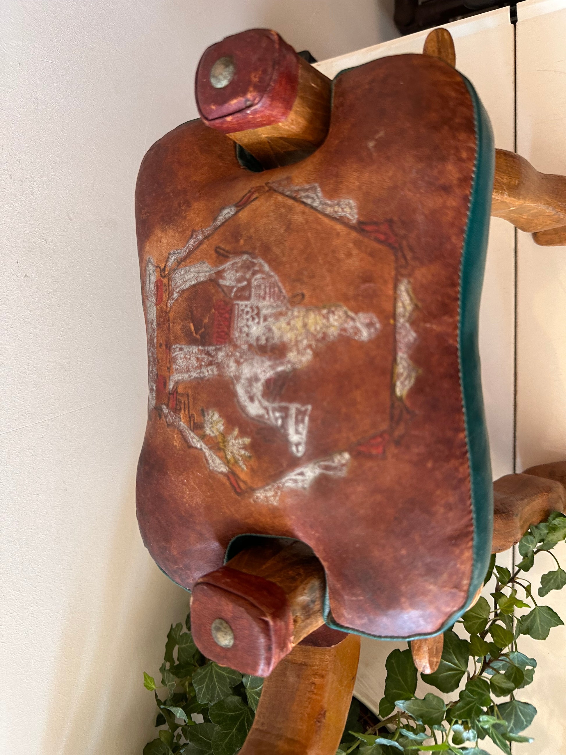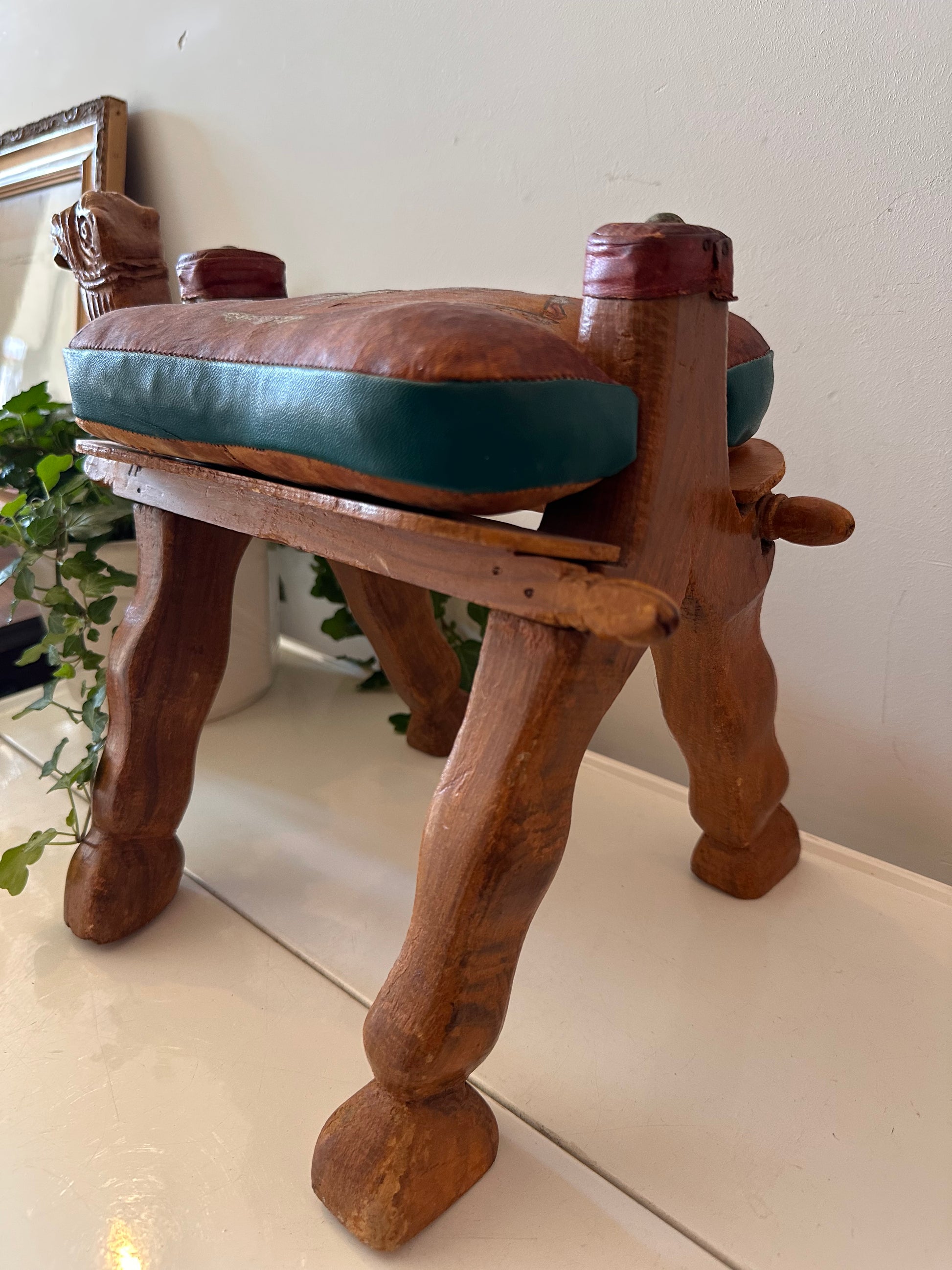 Hoe leuk is dit handgemaakte tafeltje in de vorm van een kameel? Gemaakt van hout met uitgesneden details en een leren zadel als blad, ooit bedoeld als souvenir maar nu perfect als klein plantentafeltje. Het zadel is nog voorzien van beschildering en heeft wat gebruikssporen, wat juist bijdraagt aan de charme en het vintage karakter. Q343