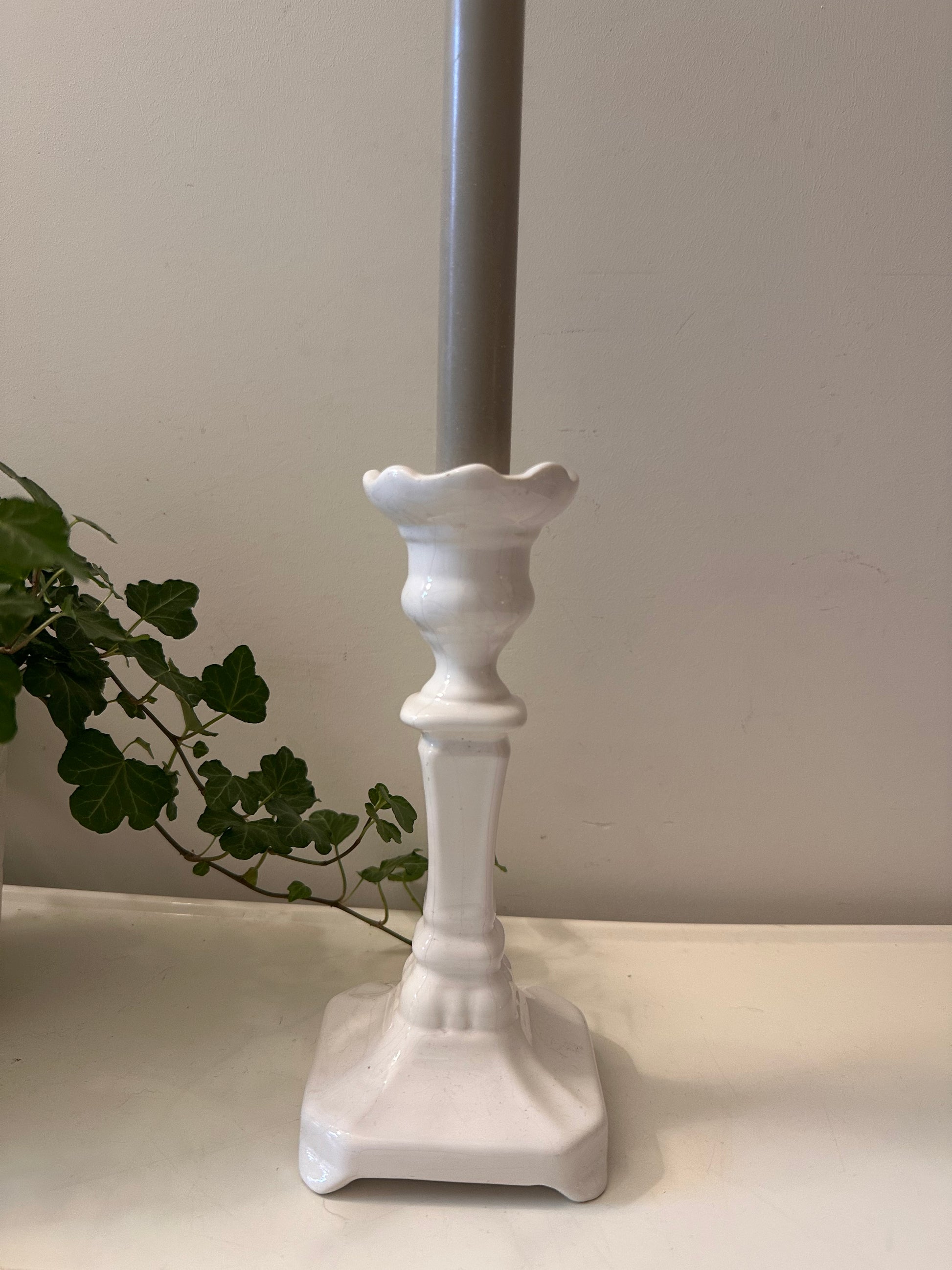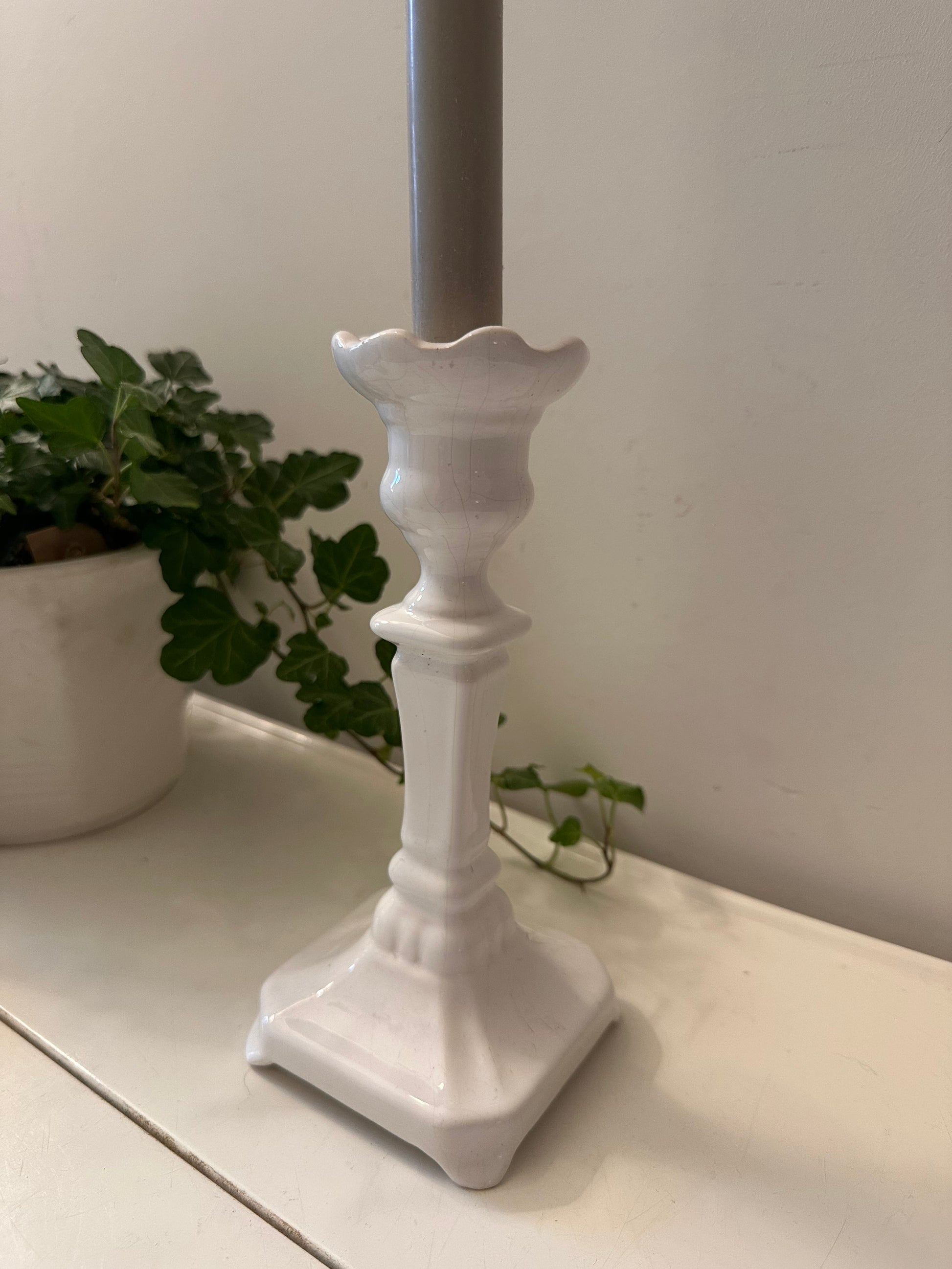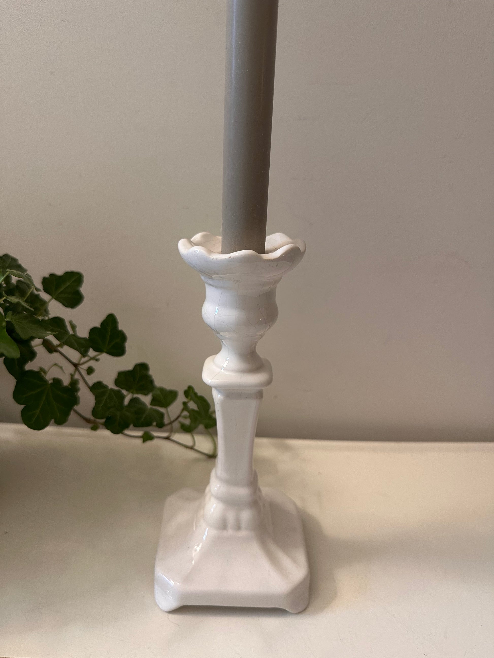 Superleuke klassieke kandelaar in Delfts wit. Mooie glans, subtiele craquelé en een sierlijke voet. De kandelaar is gemerkt onder Delfts Holland 1694. Q625