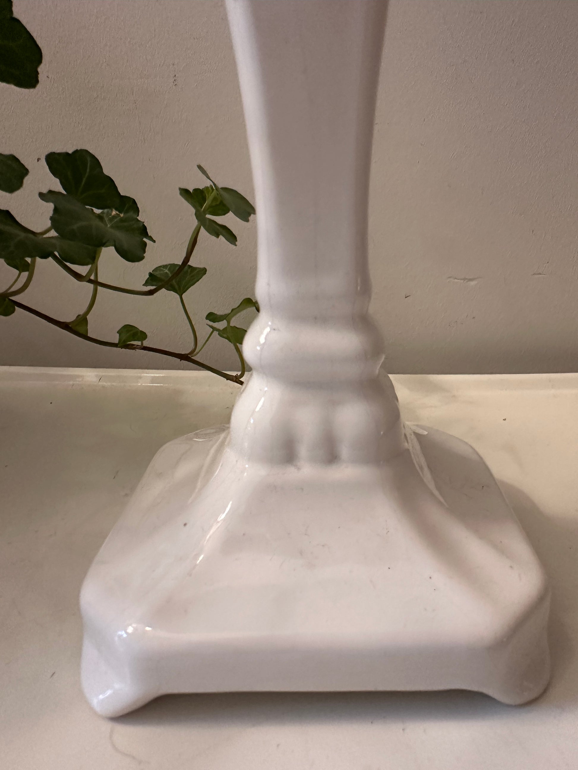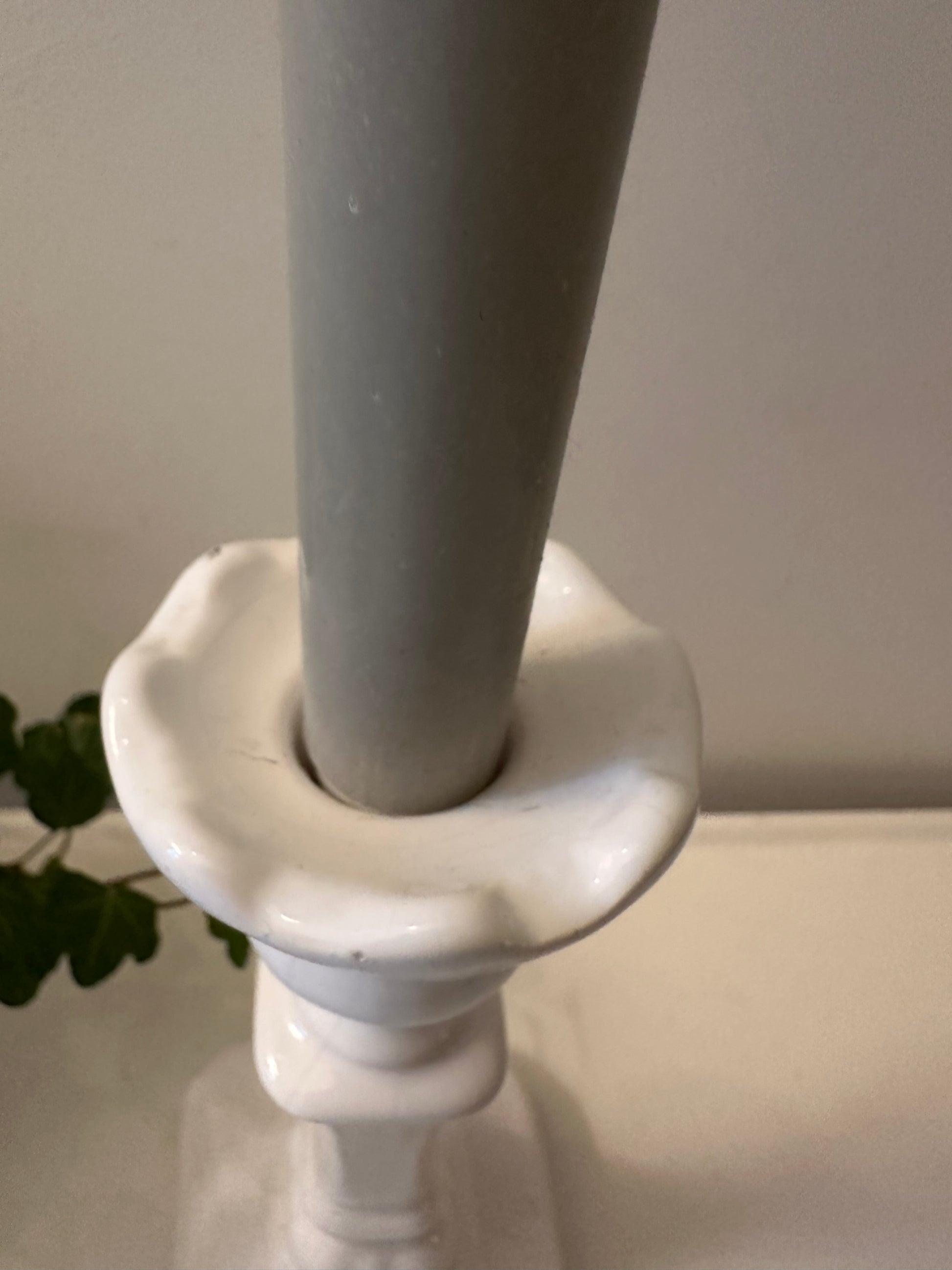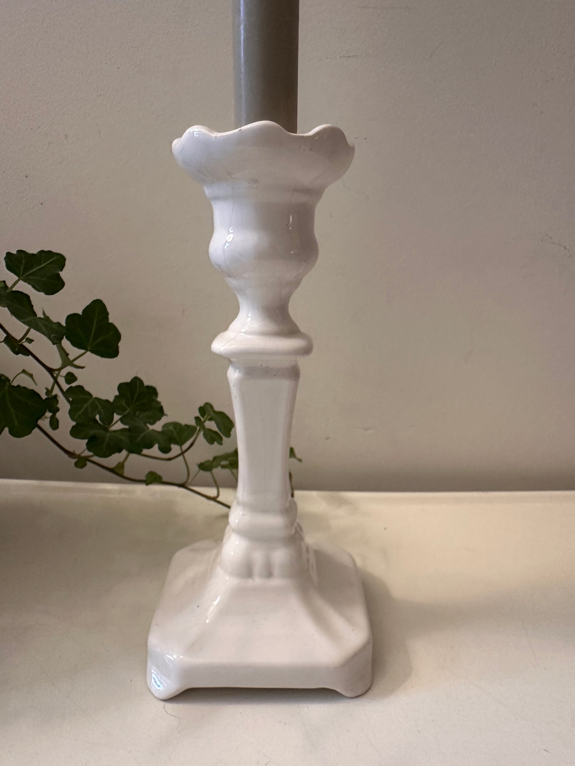 Superleuke klassieke kandelaar in Delfts wit. Mooie glans, subtiele craquelé en een sierlijke voet. De kandelaar is gemerkt onder Delfts Holland 1694. Q625