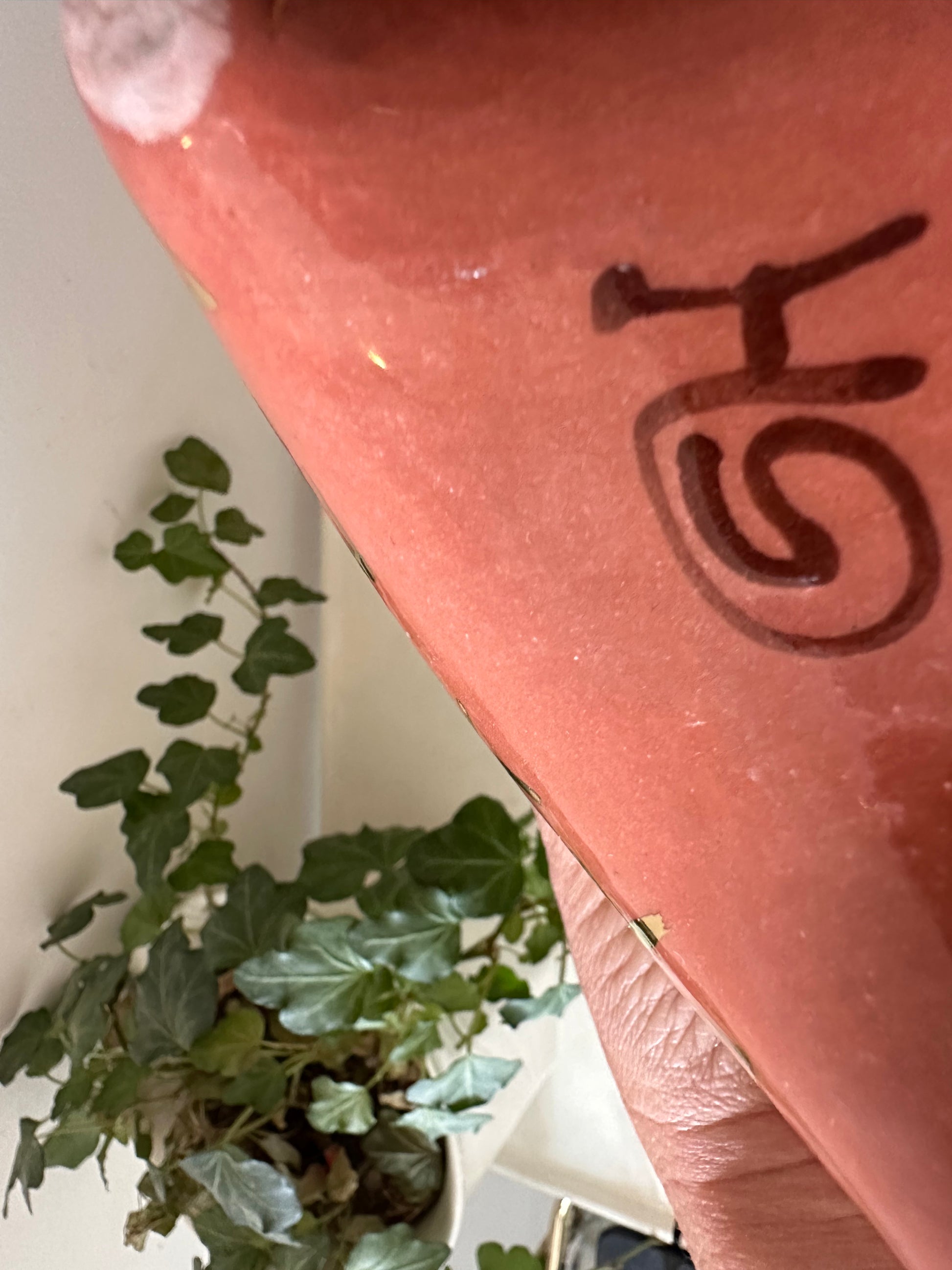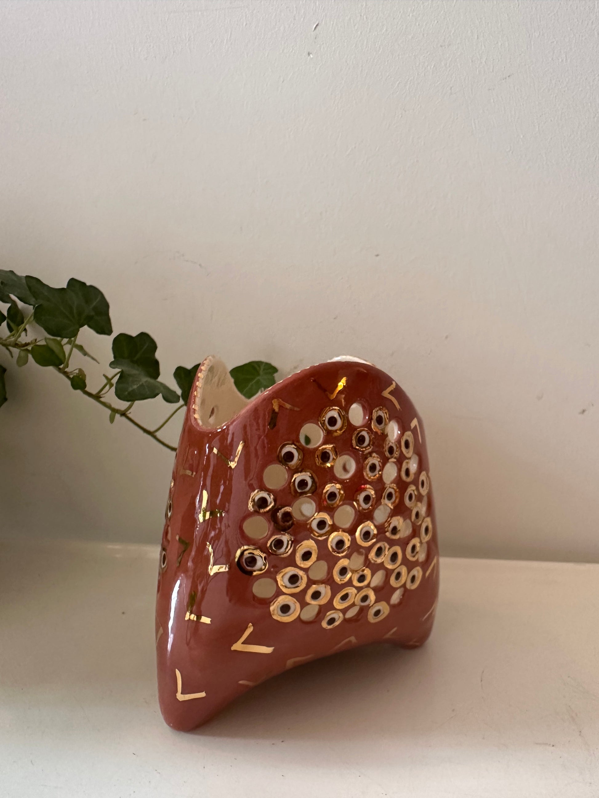 Geweldig voor wie van funky keramiek houdt: dit handgemaakte vaasje/bakje met een hele aparte vorm en dieprode glazuurlaag is versierd met glimmende goudaccenten en doorkijk-ogen. De binnenkant is crème en ook voorzien van openingen. Onderop gesigneerd.