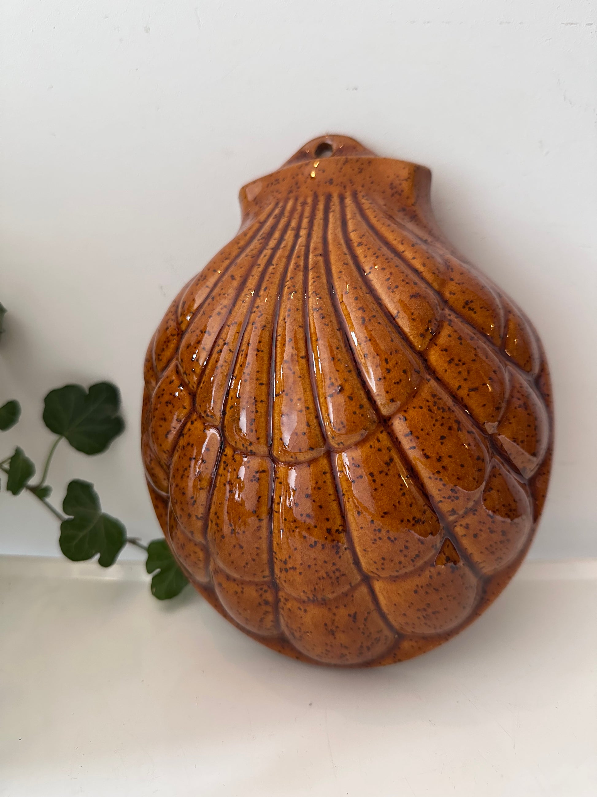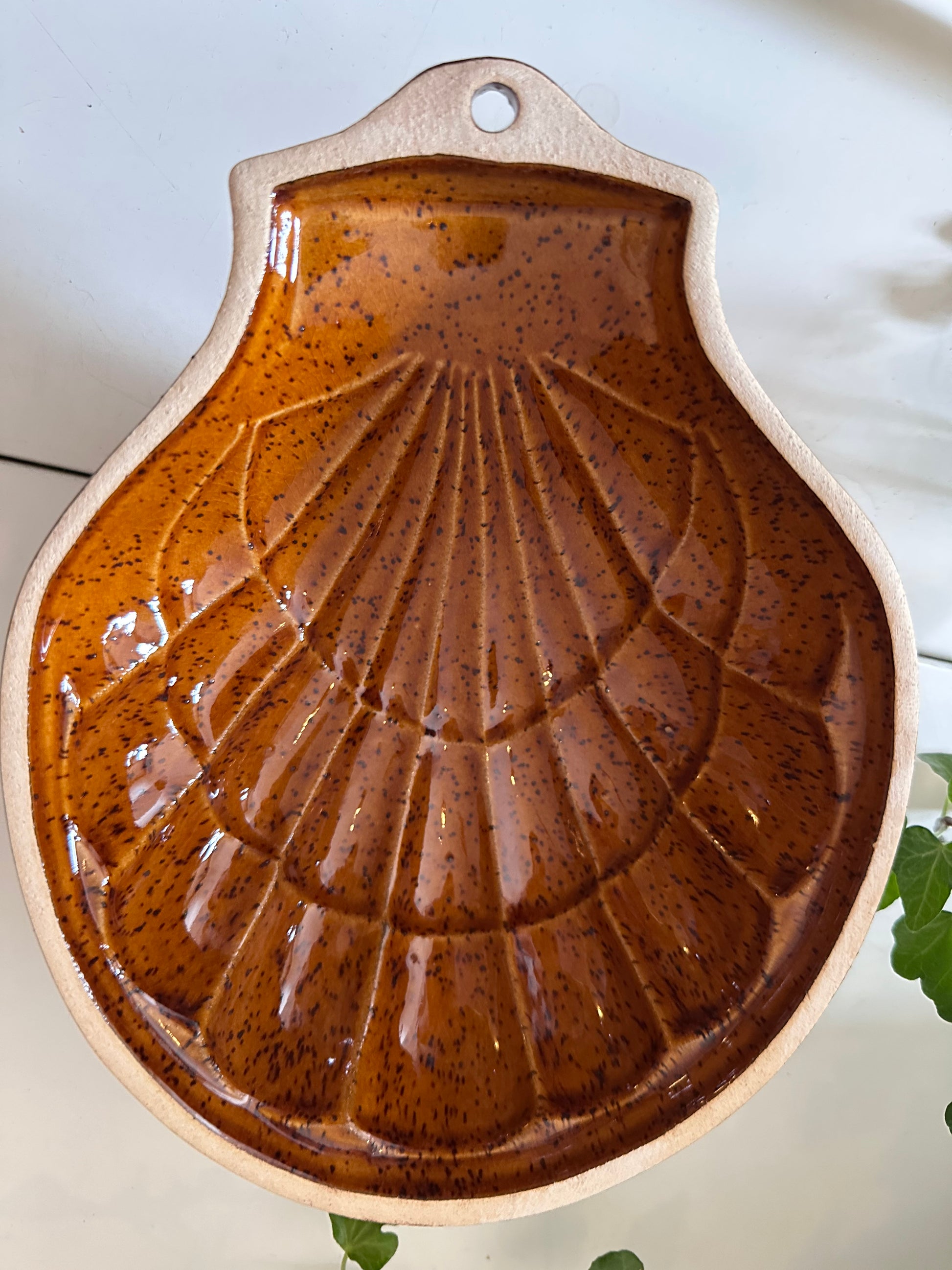 Bruine keramieken vintage bakvorm in de vorm van een schelp – super decoratief aan de muur of leuk als unieke keukenvondst. Met gaatje bovenin om makkelijk op te hangen. Mooie glanzende afwerking met spikkelglazuur. Q941