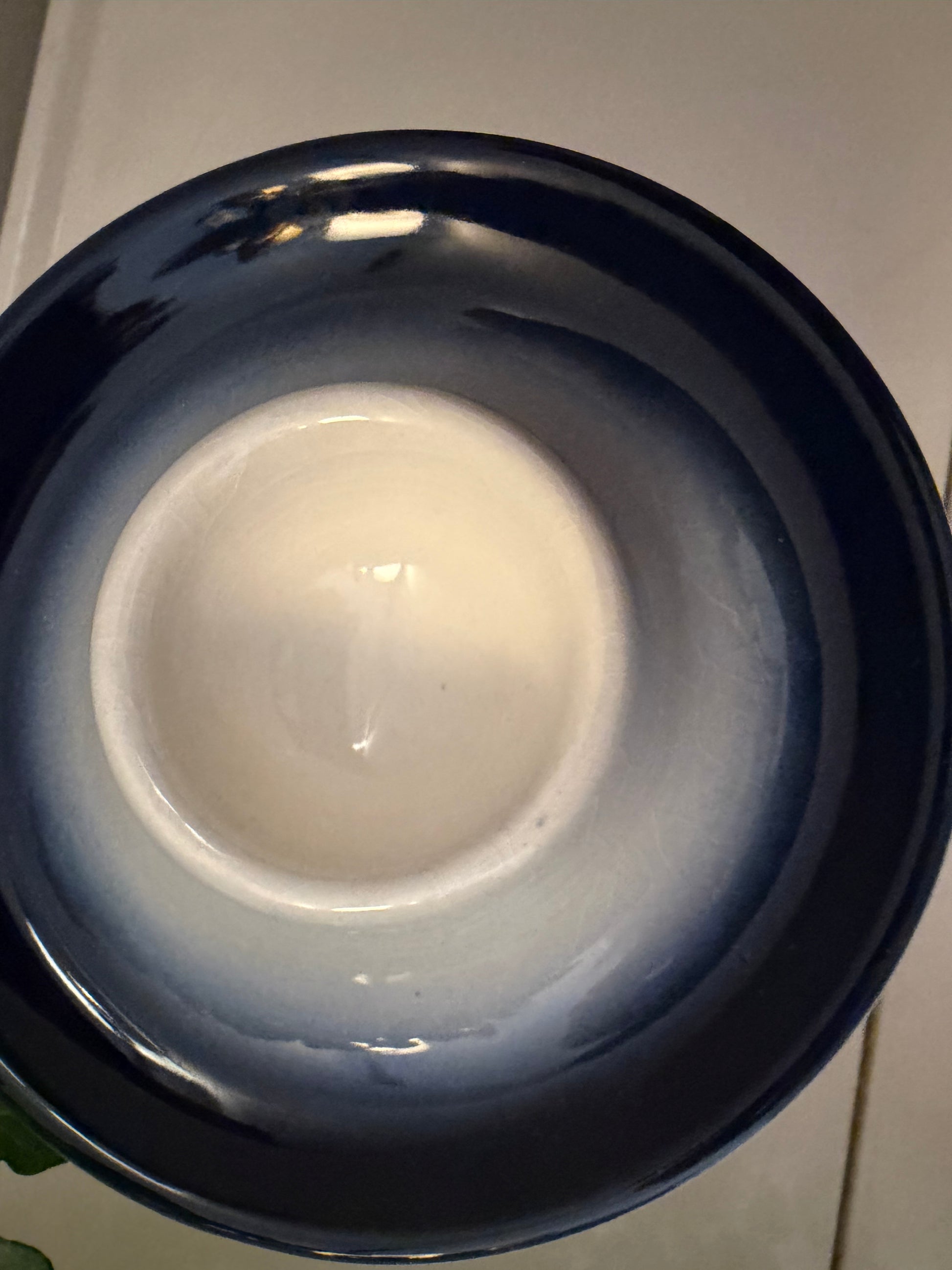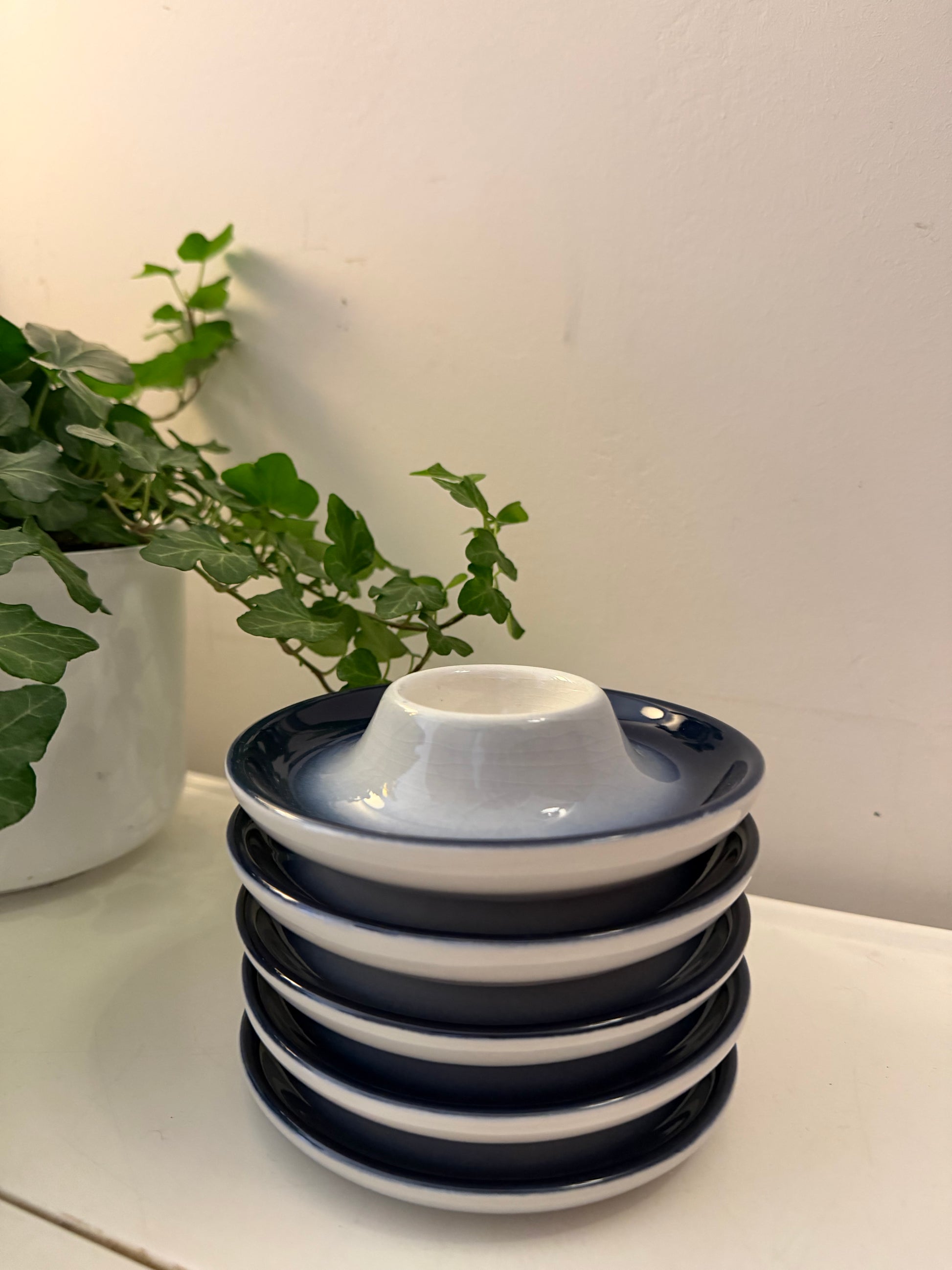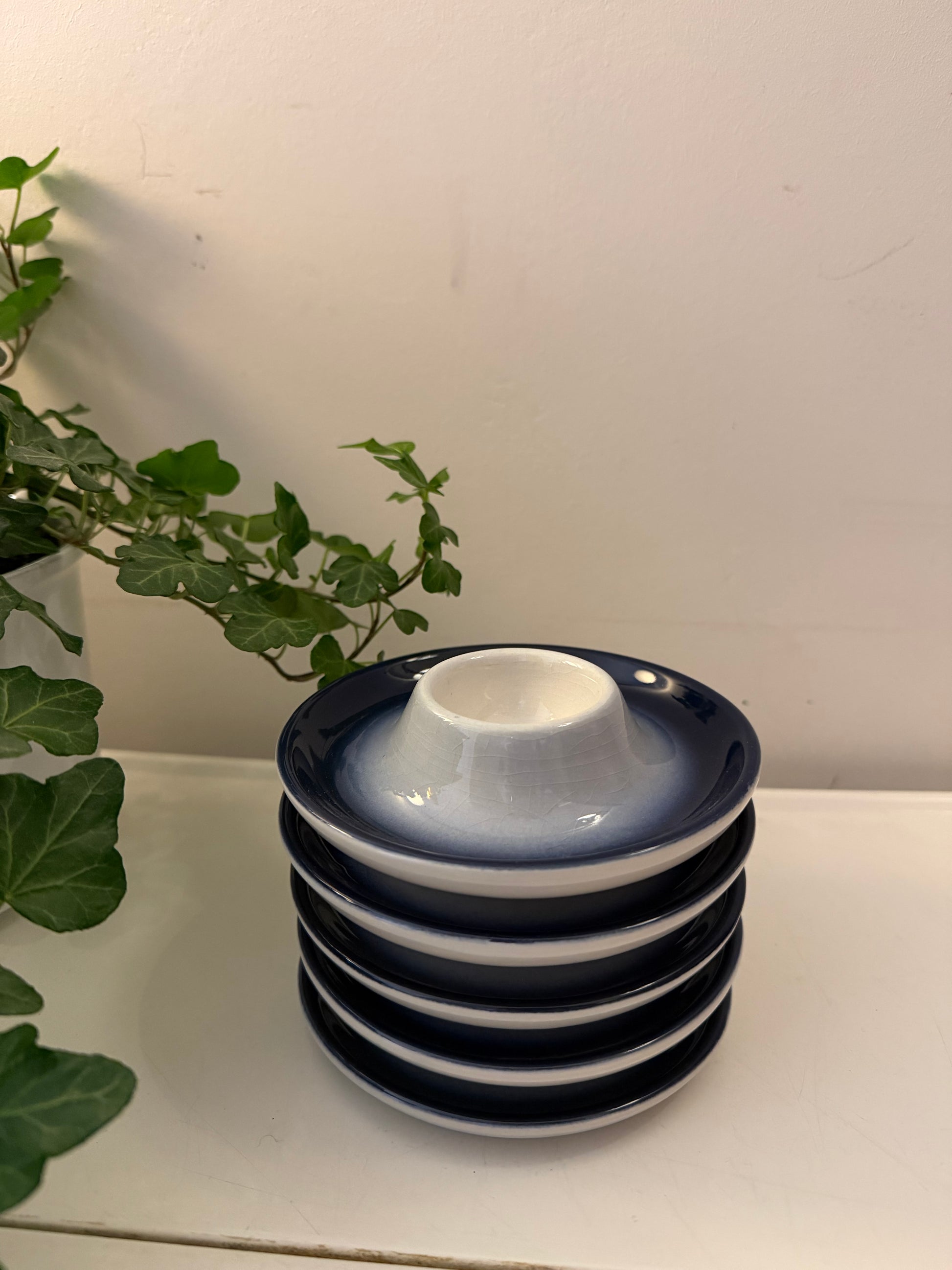 Hele leuke set eierdopjes in dat mooie diepblauw met een zachte overloop naar wit. Mooi glanzend glazuur en lekker stevig keramiek. Onderop gemerkt, afkomstig uit Duitsland. Dateert rond de jaren 70. Q848