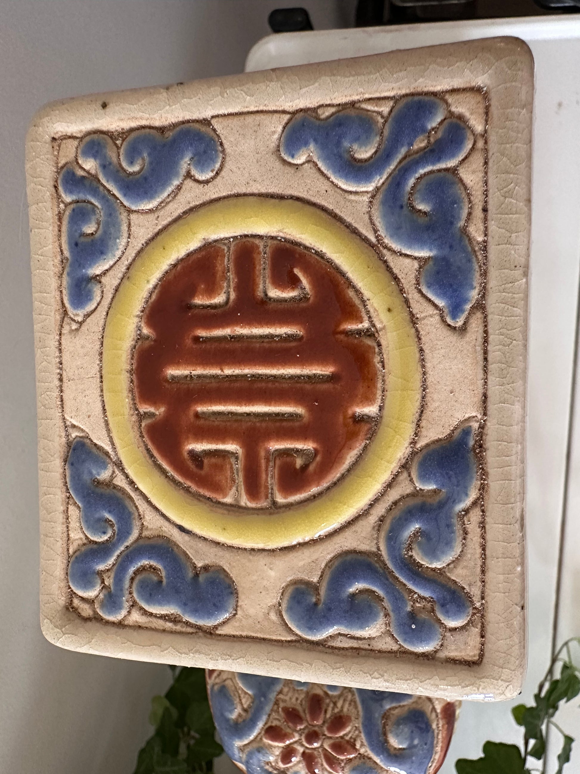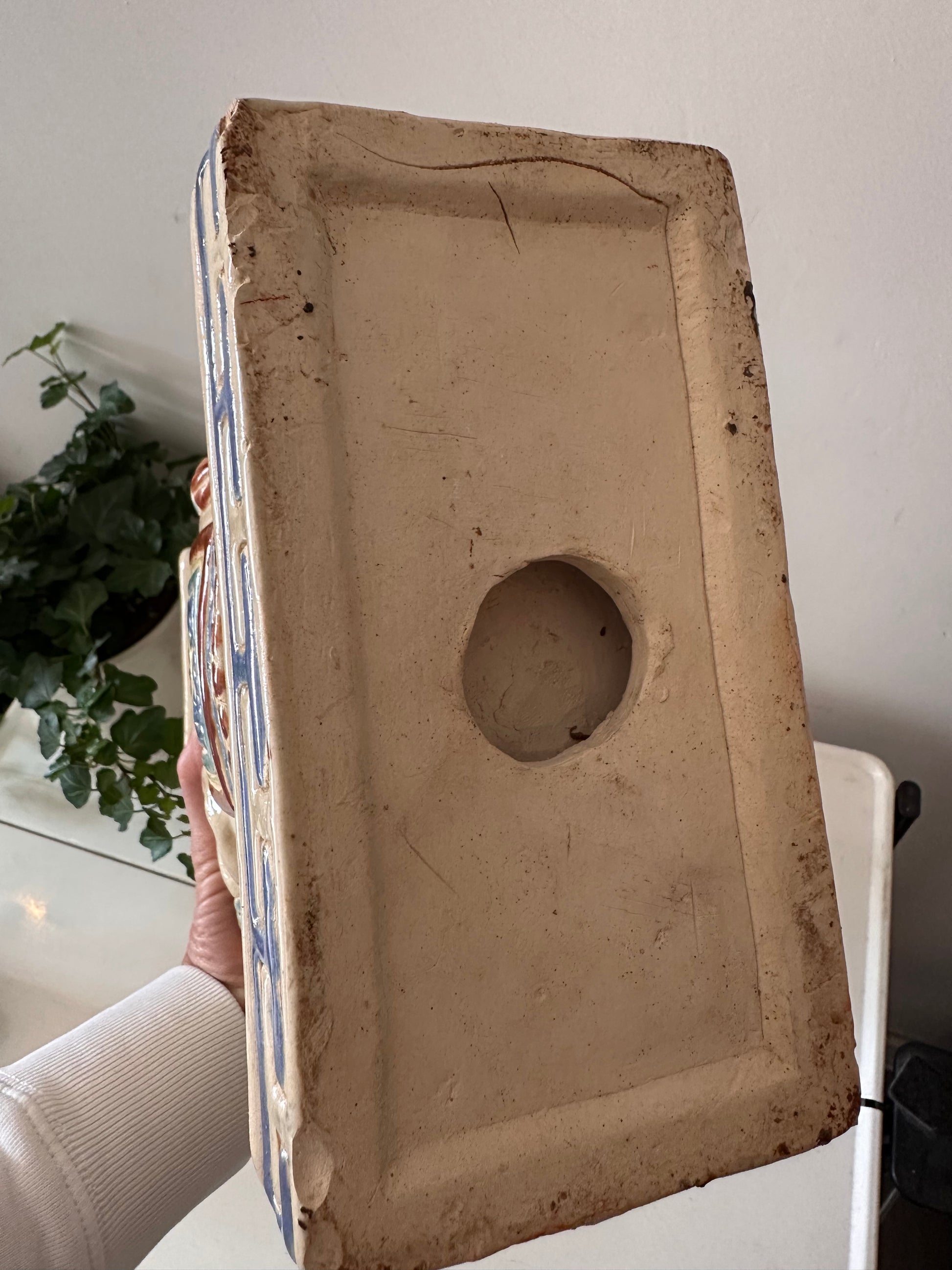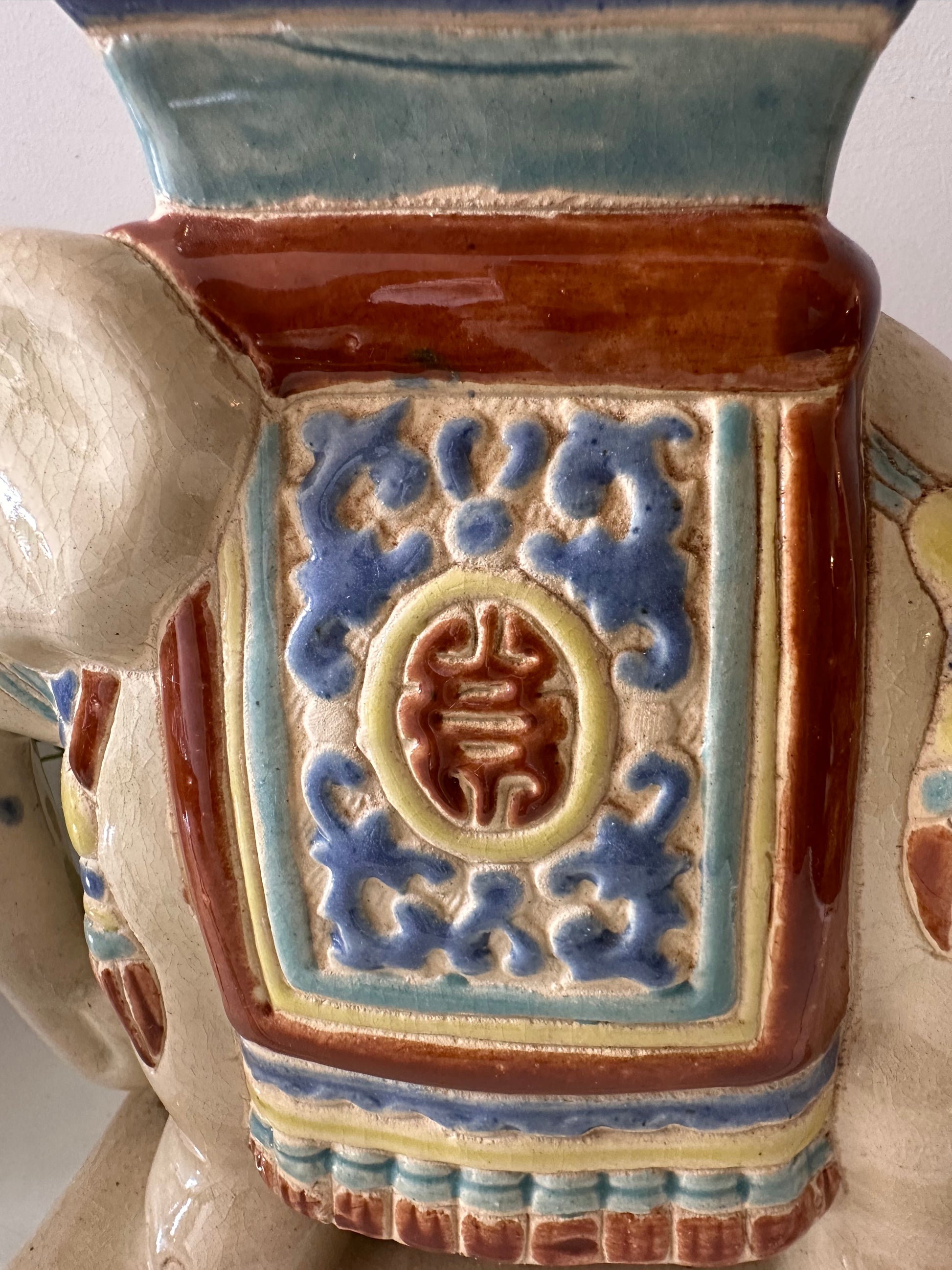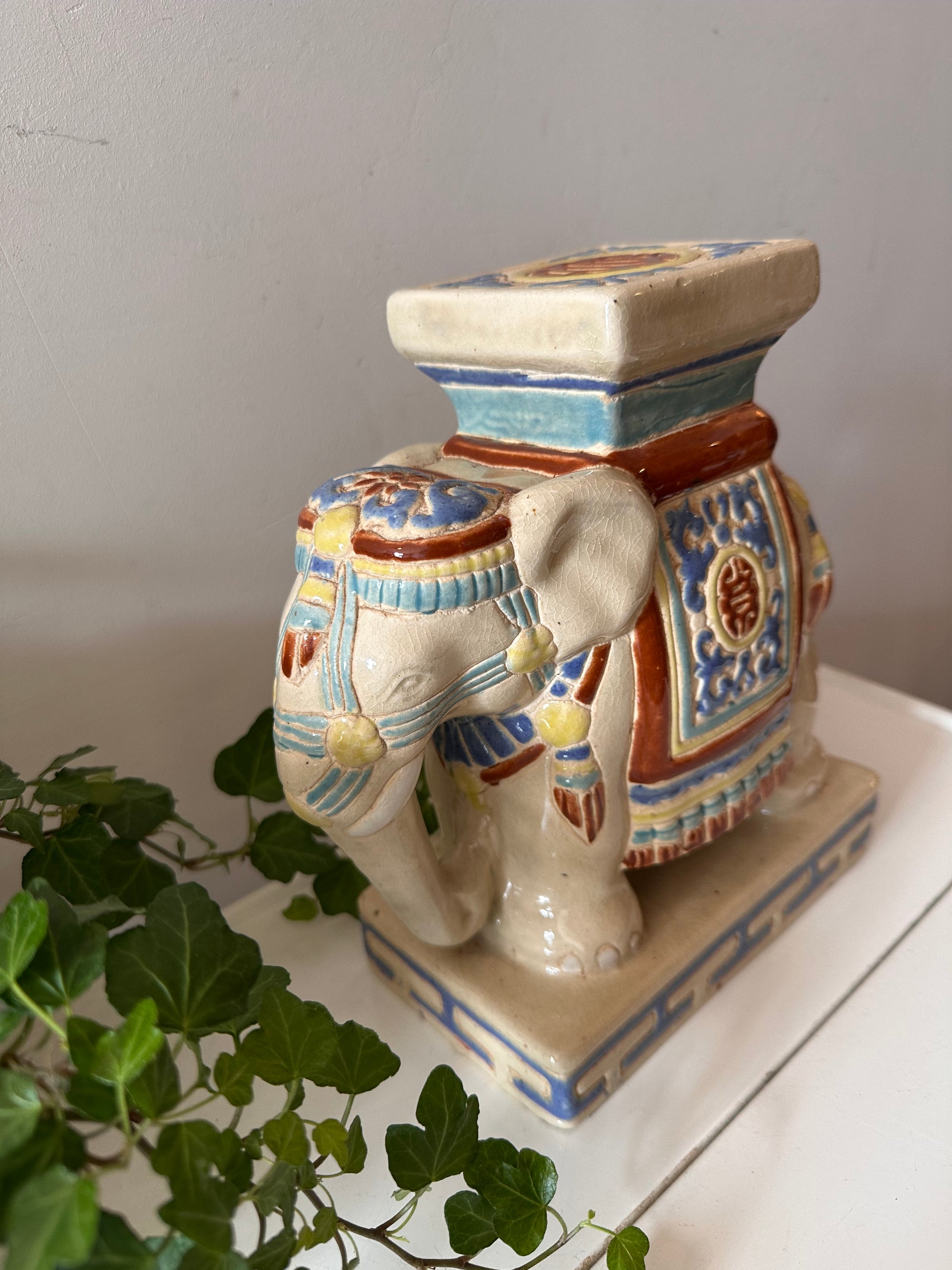 Bijzonder vintage olifantje van geglazuurd keramiek in warme kleuren blauw, geel, rood en crème. Met zijn platte rug en stevige vorm is dit een ideaal plantentafeltje of sokkeltje voor een vaas of beeld. Het craquelé in het glazuur geeft ‘m charme. Q376
