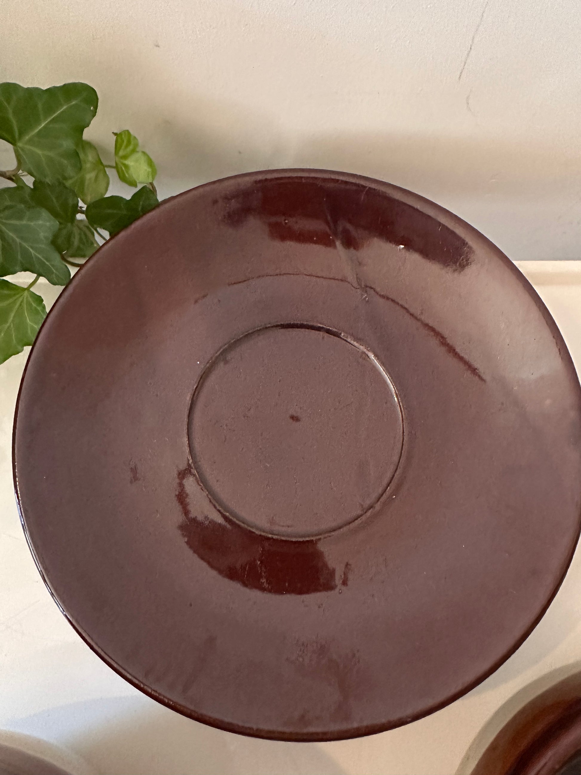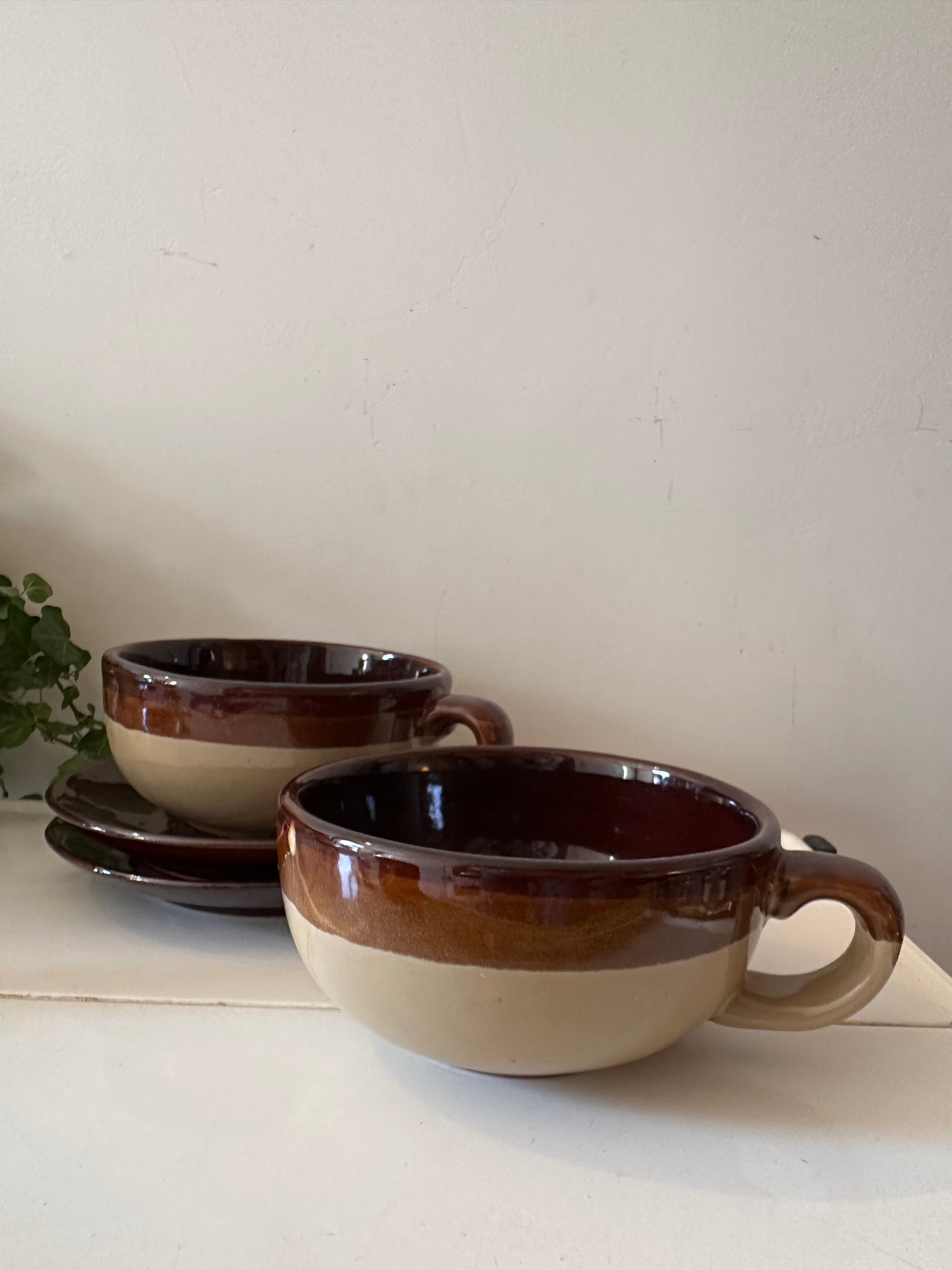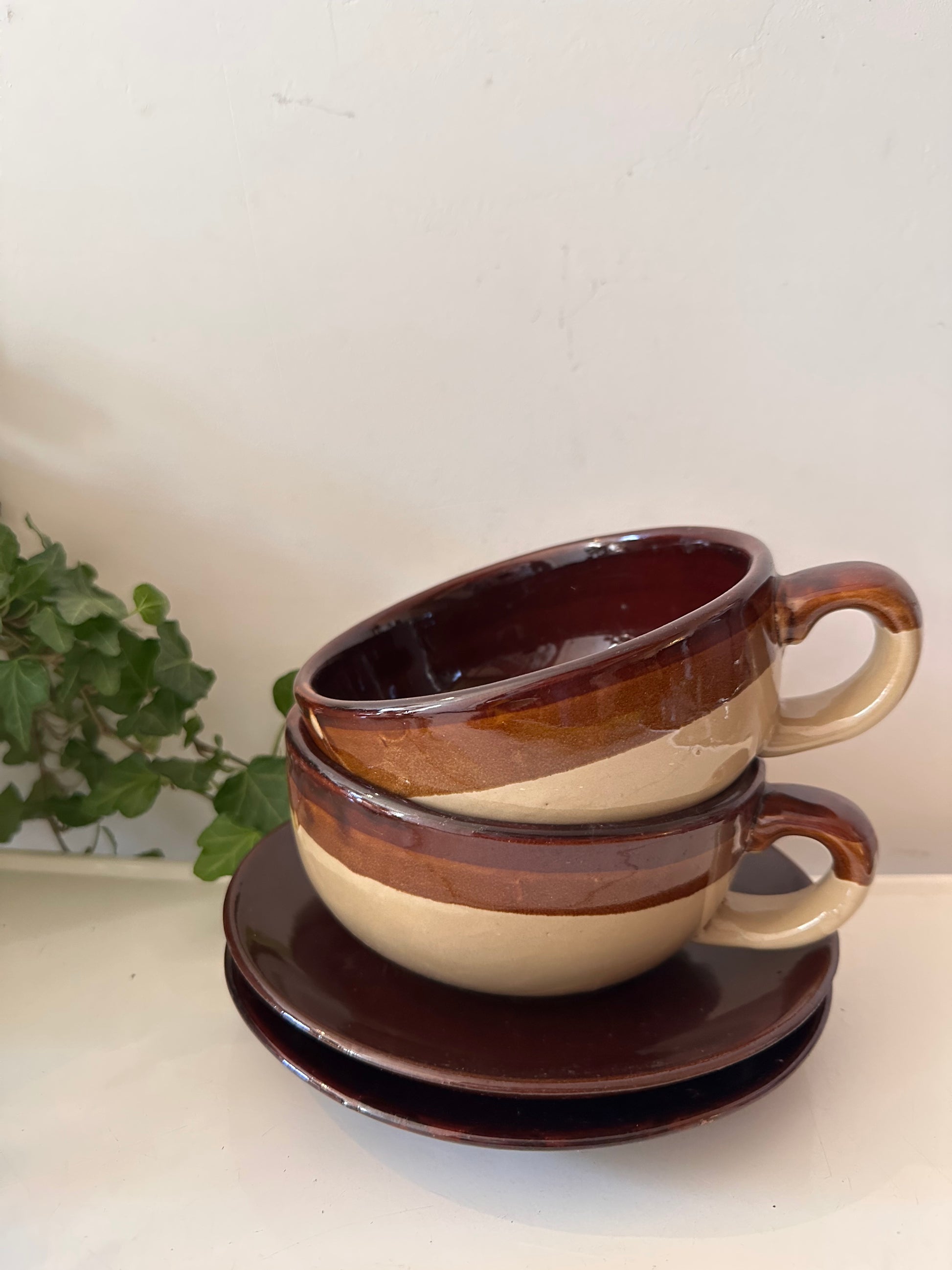 Toffe set bruine keramieken soepkommen met bijpassende schotels😍 De diepe bruine glazuurlaag loopt mooi over in een lichtere zandtint, precies dat jaren 70 aardewerk waar je blij van wordt. Heerlijk voor soep! Q557