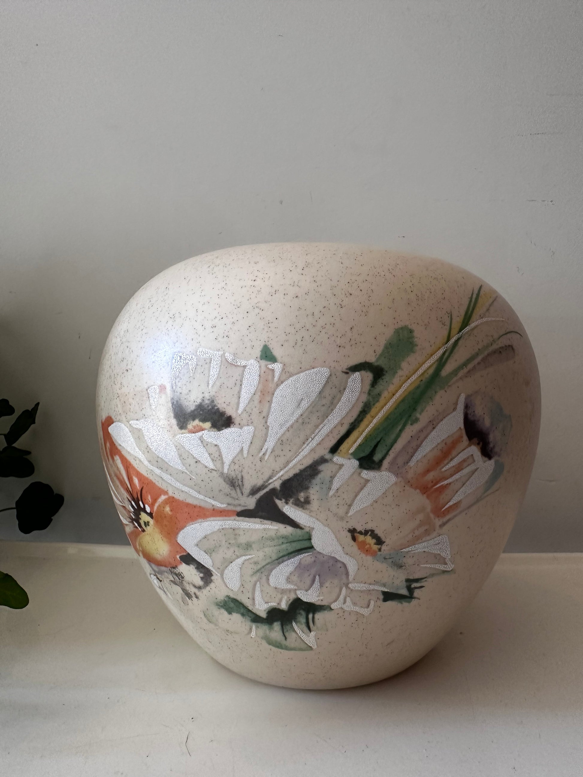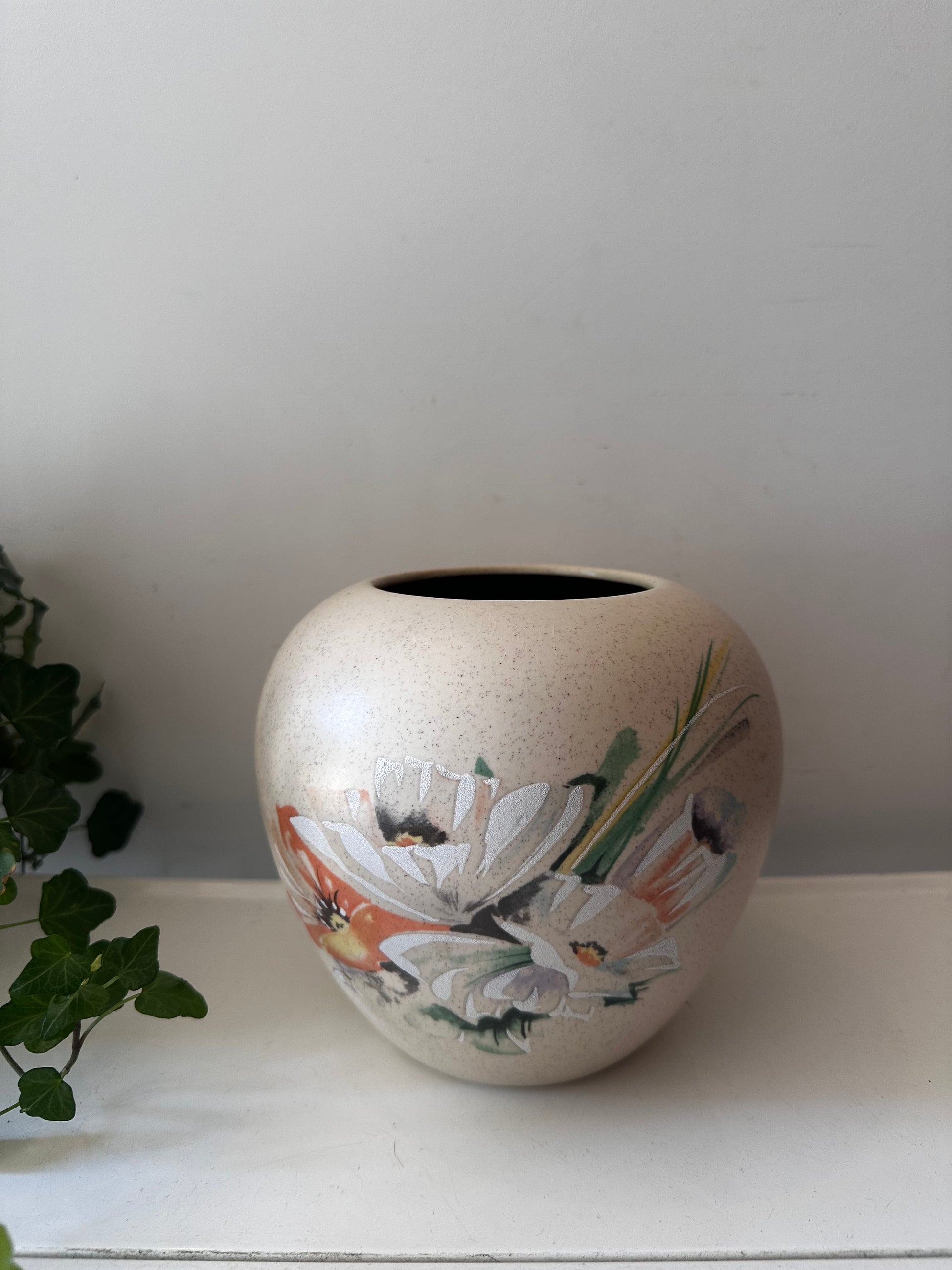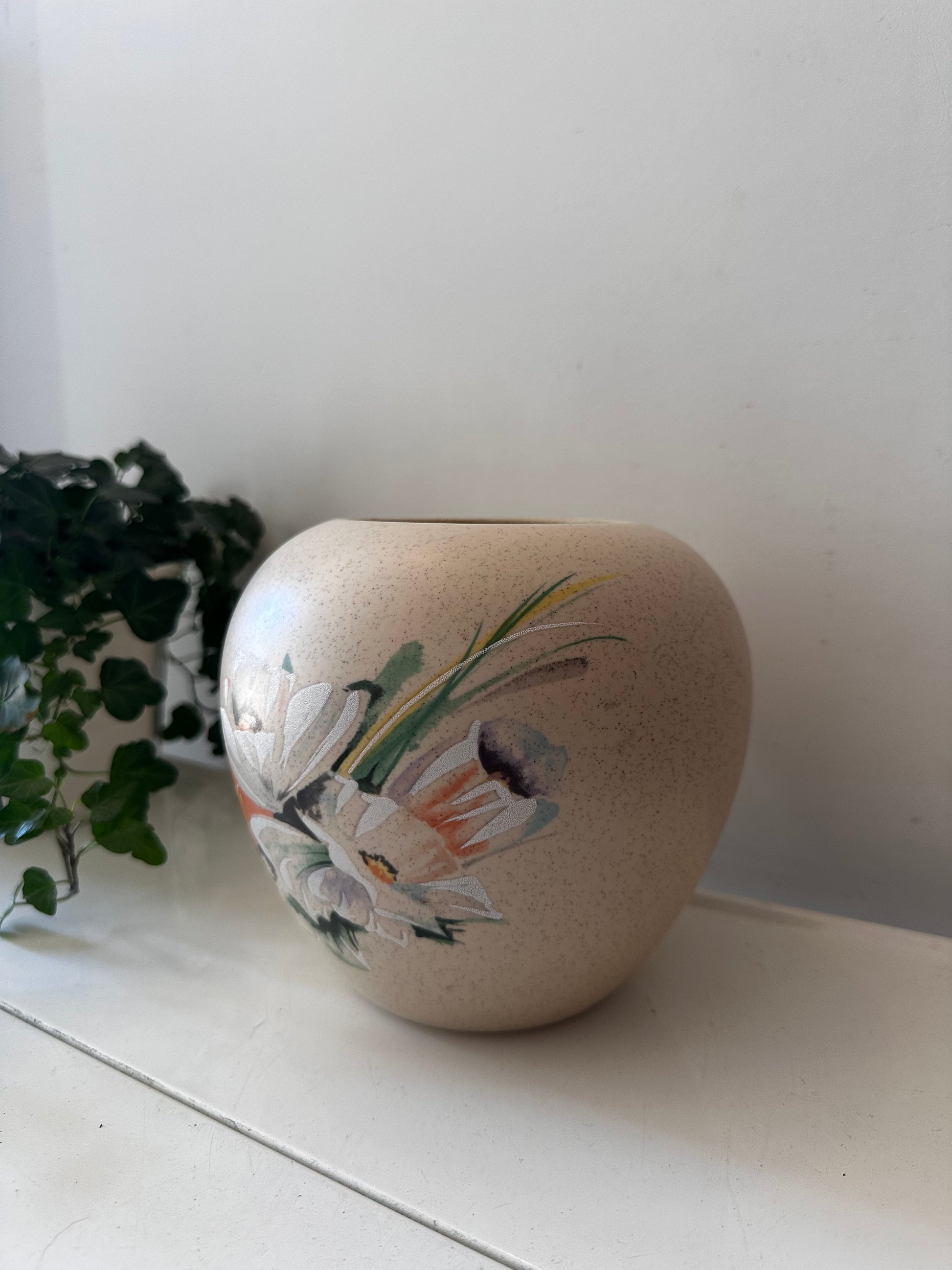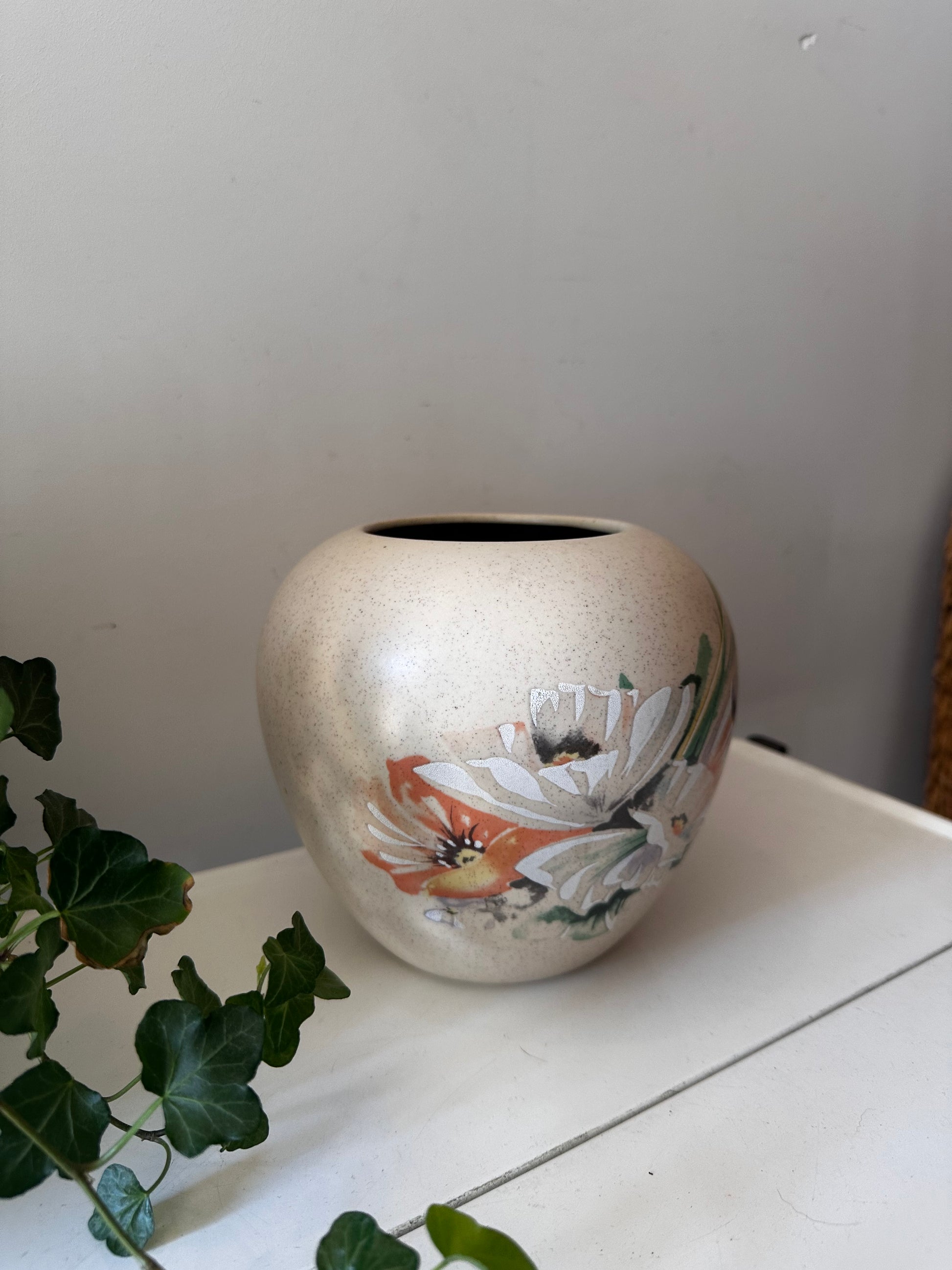 Keramieken vaas uit de jaren 80 met handgeschilderde bloemen en een zacht gespikkelde finish. Bol model in pastelkleuren – helemaal retro en lekker opvallend. Q934