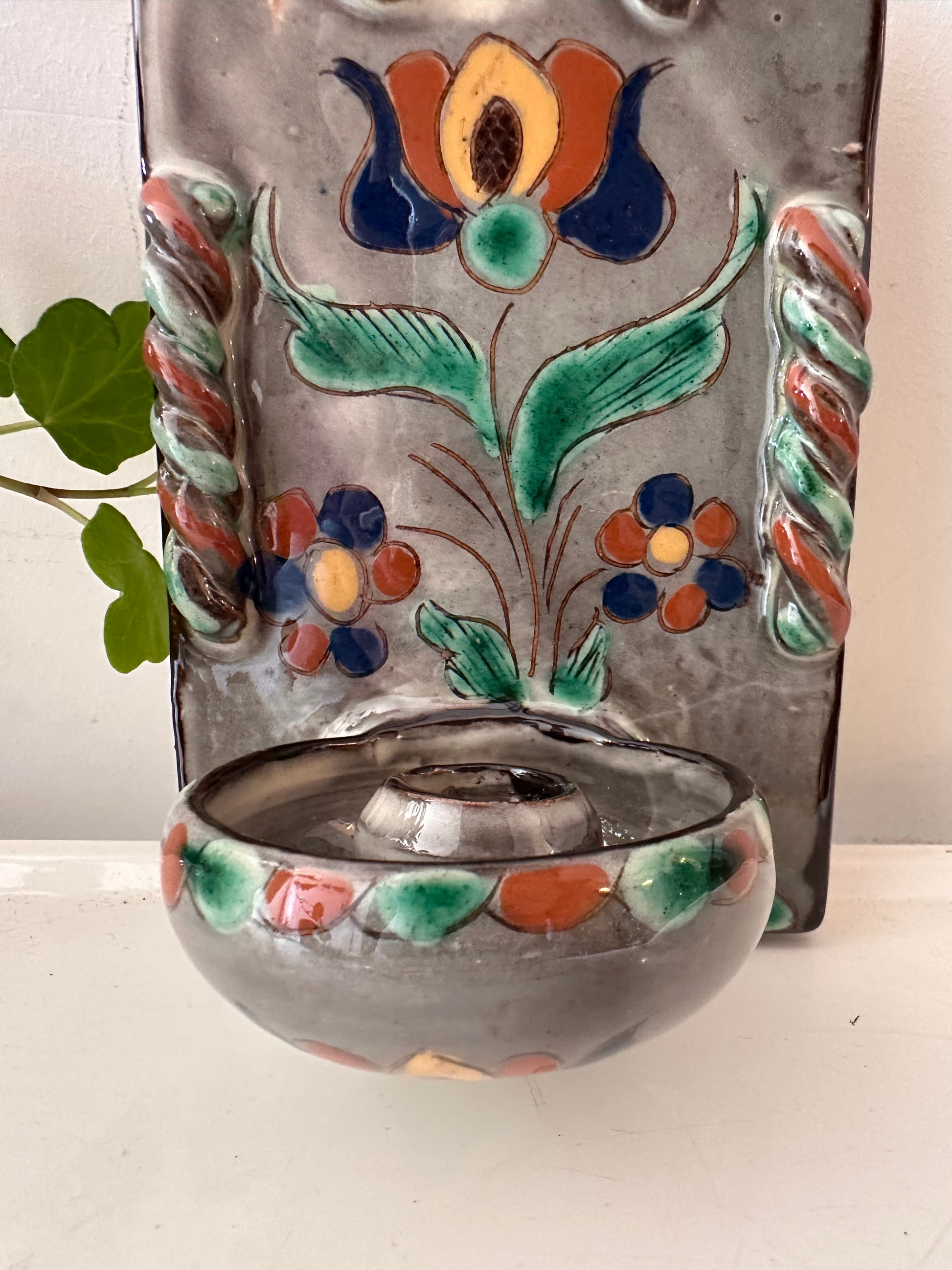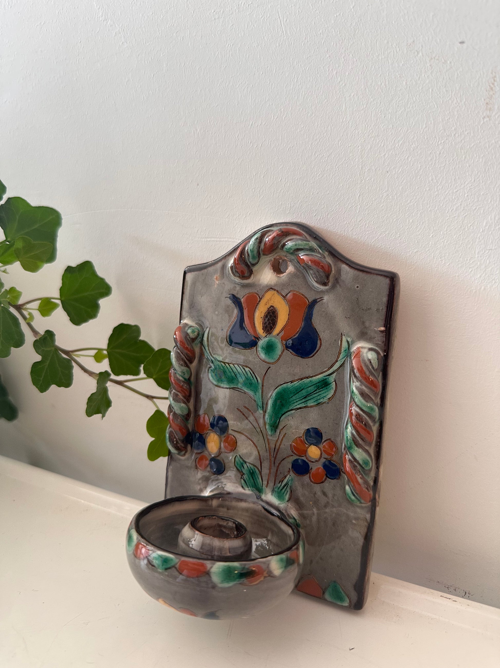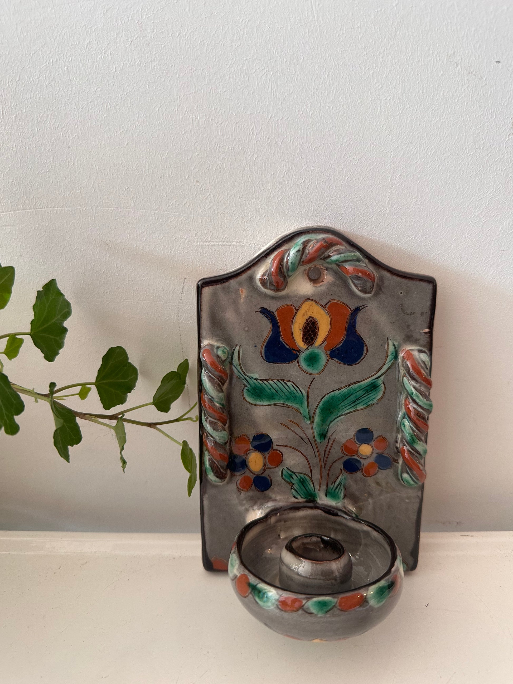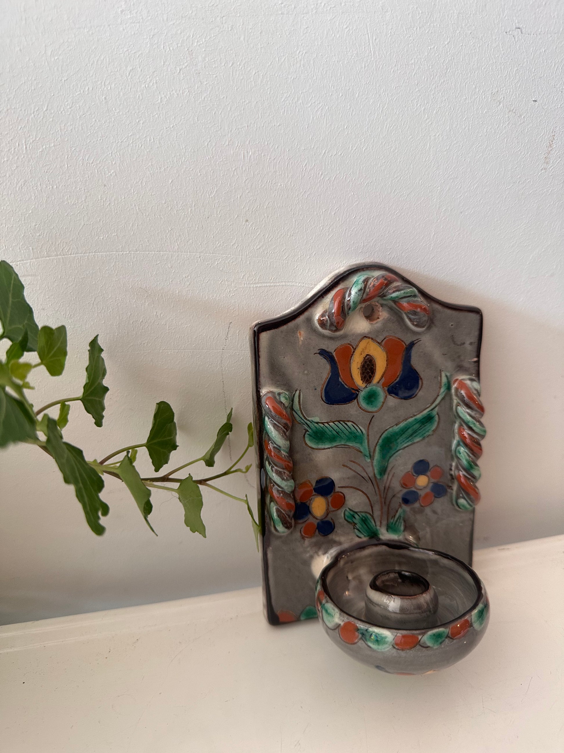 Super charmant wandkandelaartje van keramiek, met de hand beschilderd in frisse kleuren oranje, groen, blauw en geel. De wandkandelaar heeft gedraaide randen en bloemenprint. Q340