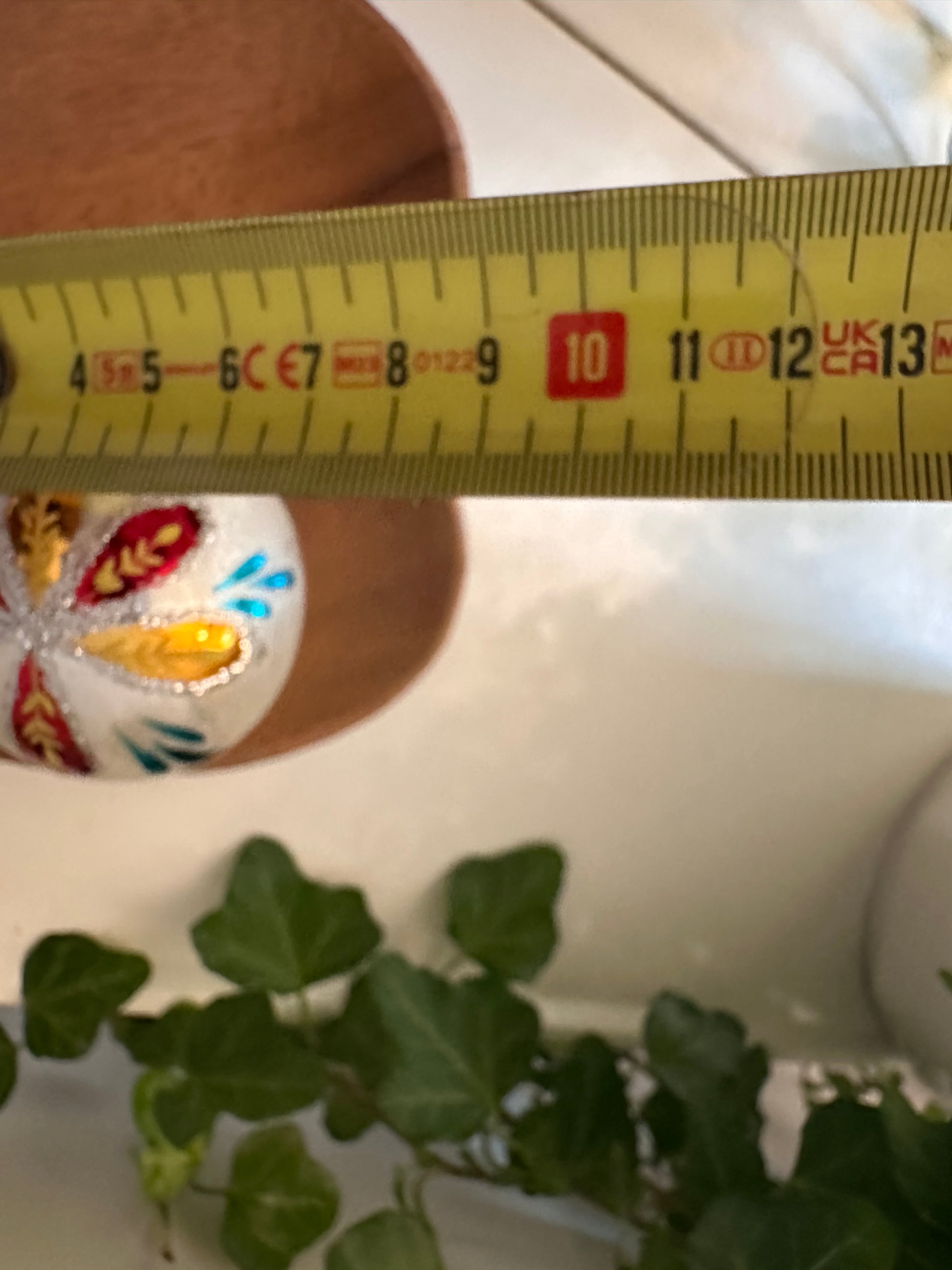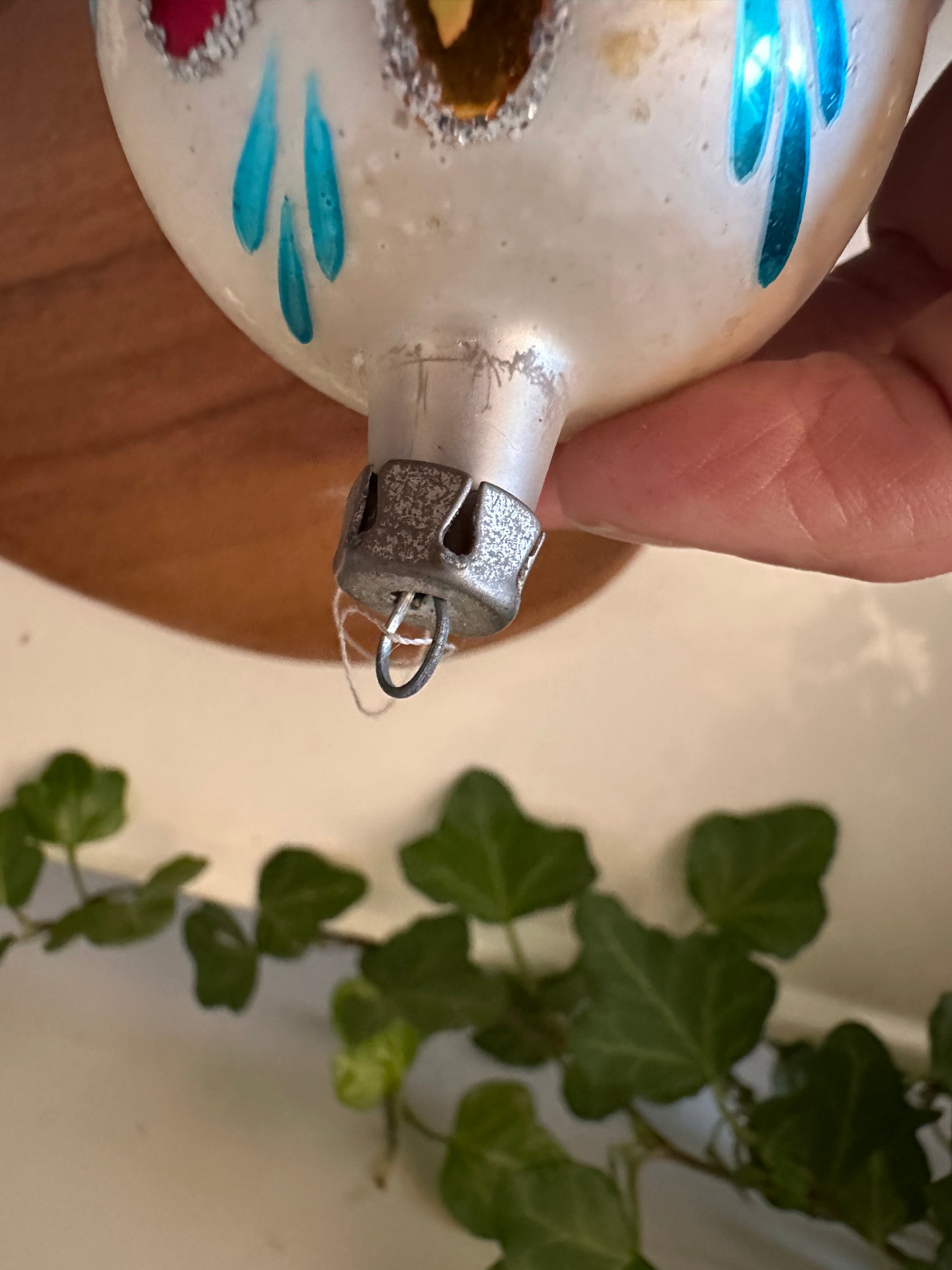 Onwijs leuke kerstbal van dun glas met handgeschilderde bloemmotieven in rood, goud en turquoise. De zilverkleurige basis en glitteraccenten geven dat echte oldschool kerstgevoel. Oorsprong jaren 50–60, uit Duitsland. Een plaatje voor in een nostalgische boom of bij een vintage kerstschaal.