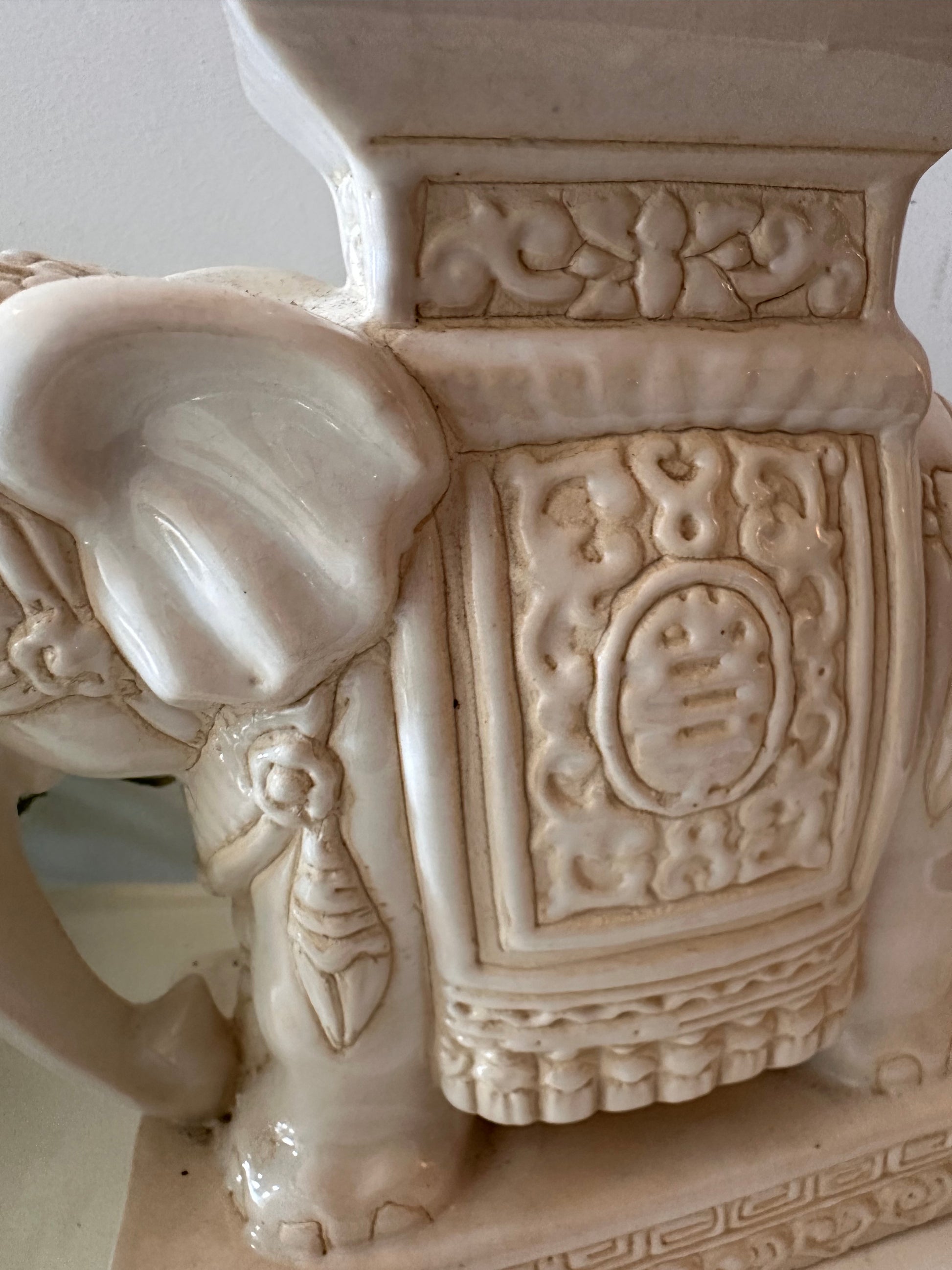 Hoe leuk is dit kleine keramieken tafeltje in de vorm van een olifant? Het heeft crème glazuur en fijne details in reliëf. Mooi om een plantje, kaars of beeldje op te zetten – plantentafeltje is in een mooie vintage staat.