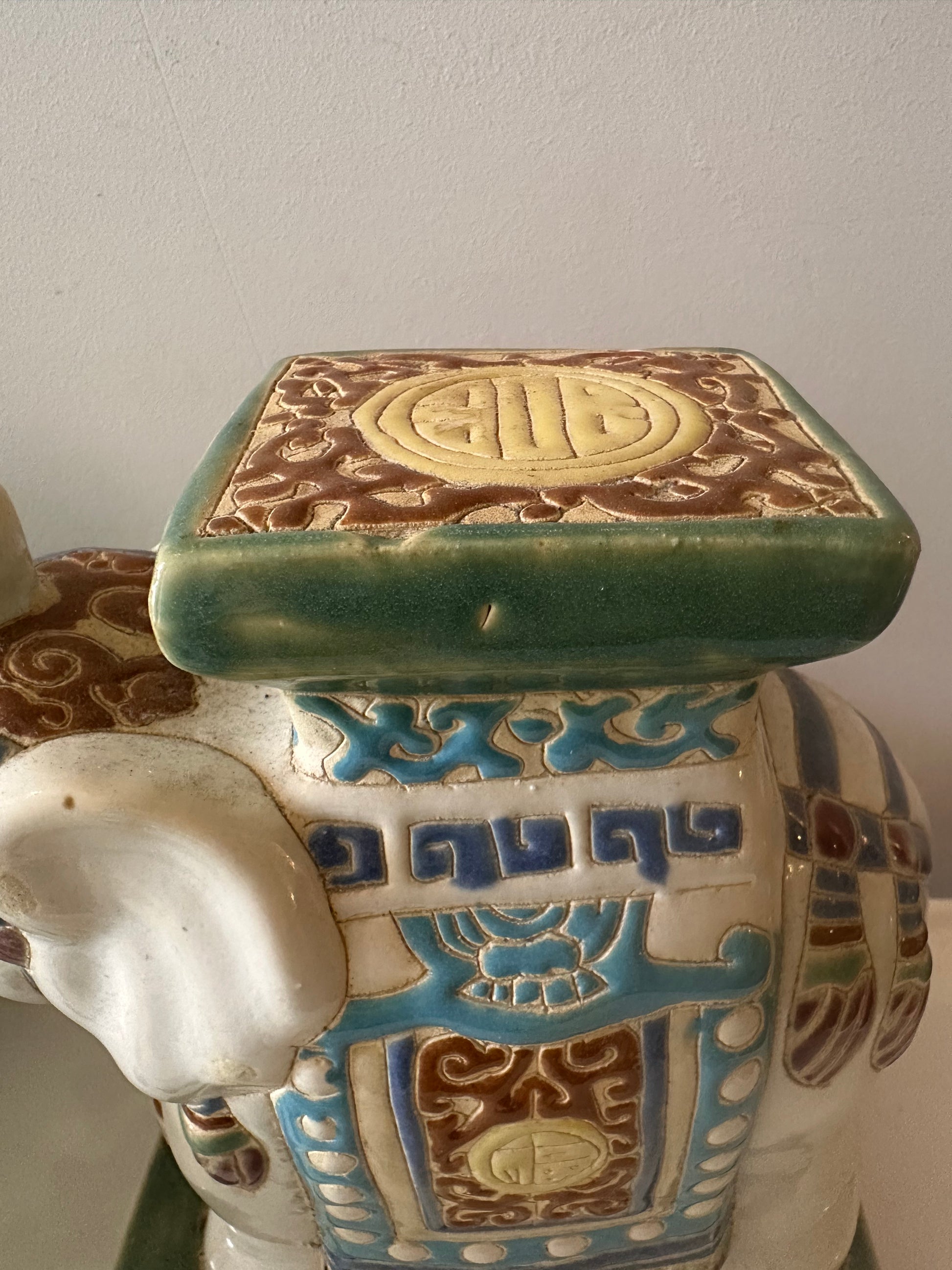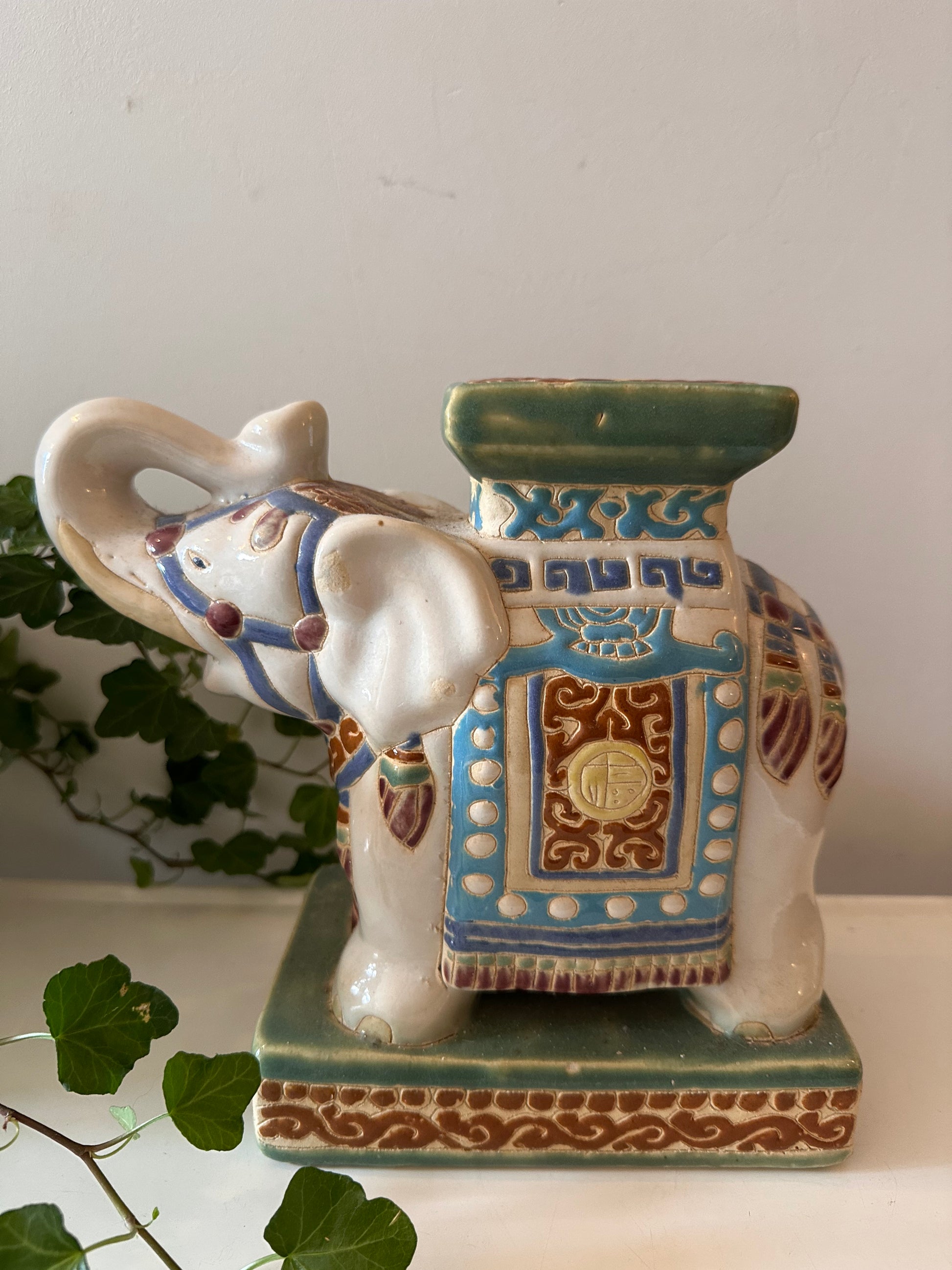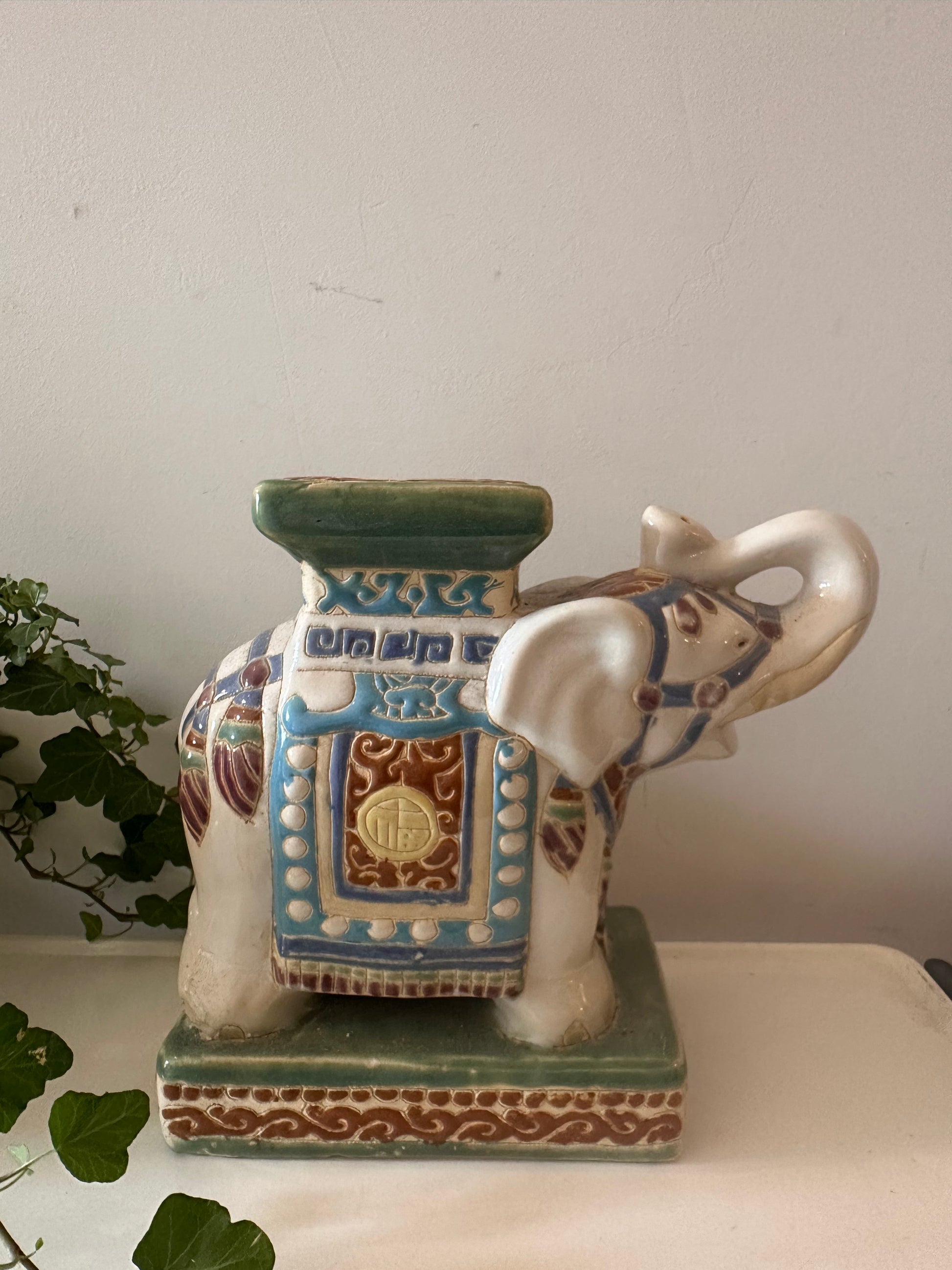Hoe tof is dit keramieken olifantje? Heeft een kleurrijke glazuur en Oosterse details. Leuk als plantenstandaard of om een kaars of beeldje op te zetten. In een mooie vintage staat met hier en daar lichte craquelé, wat juist extra charme geeft. In een mooie vintage staat. Q315