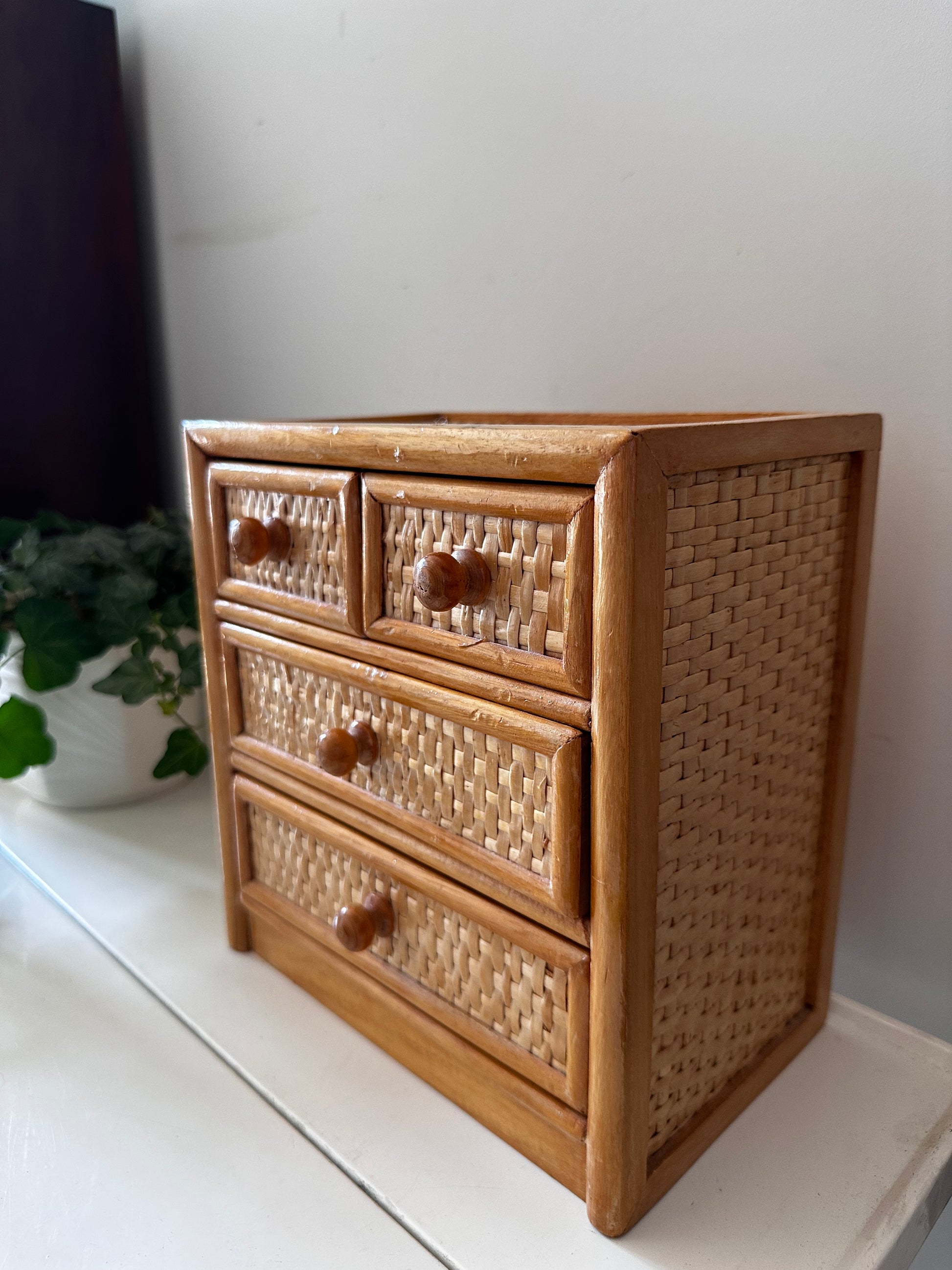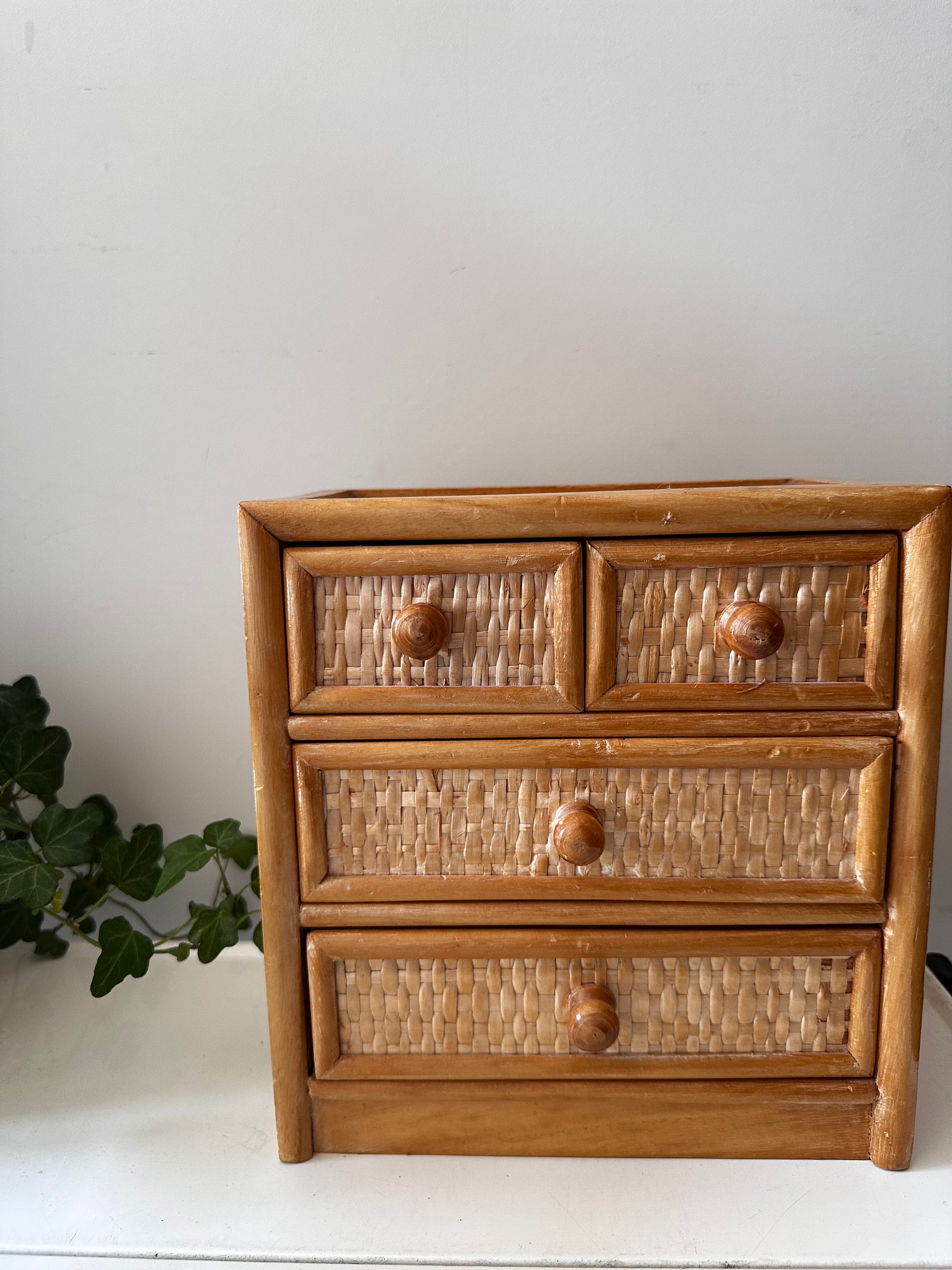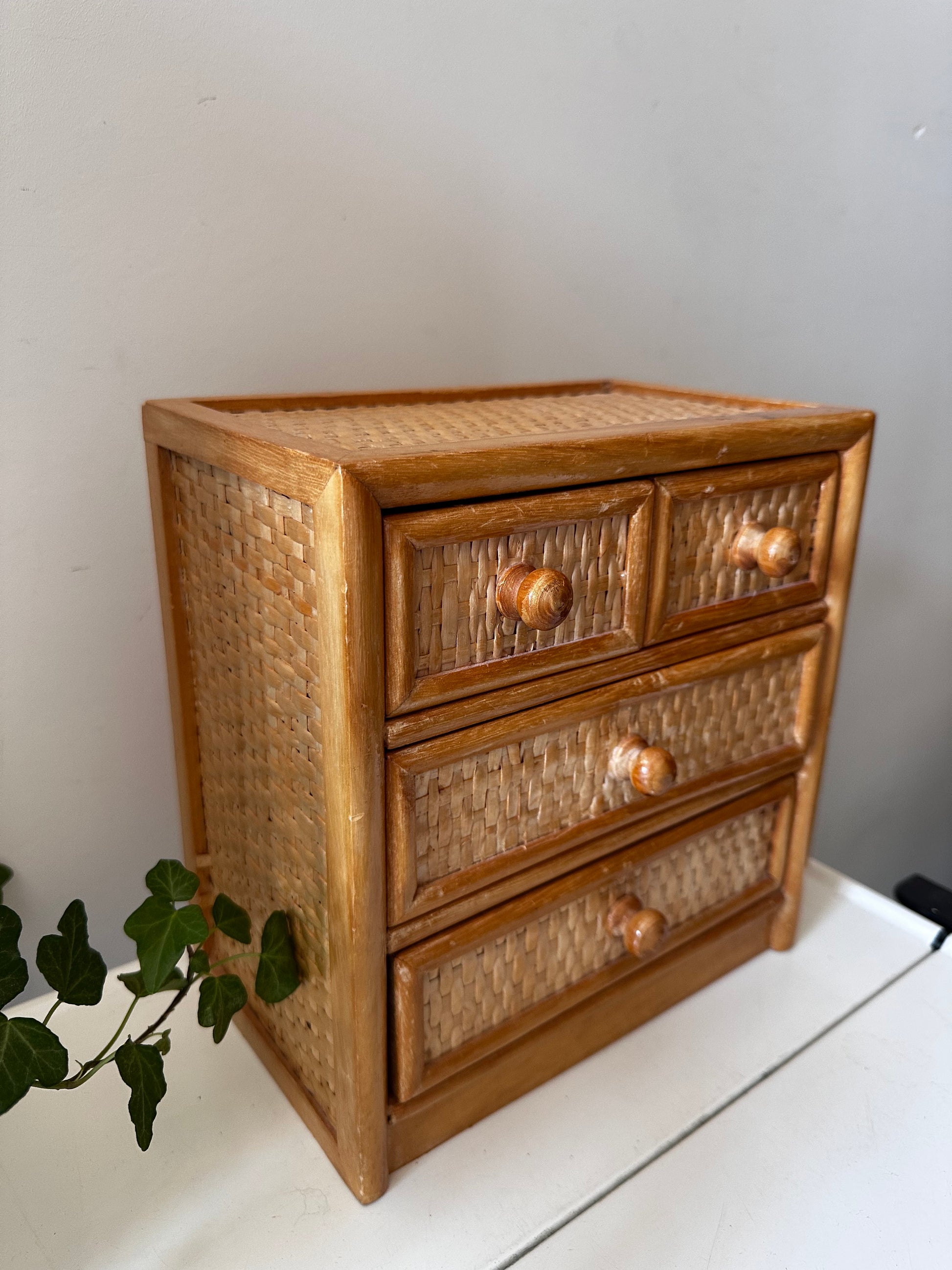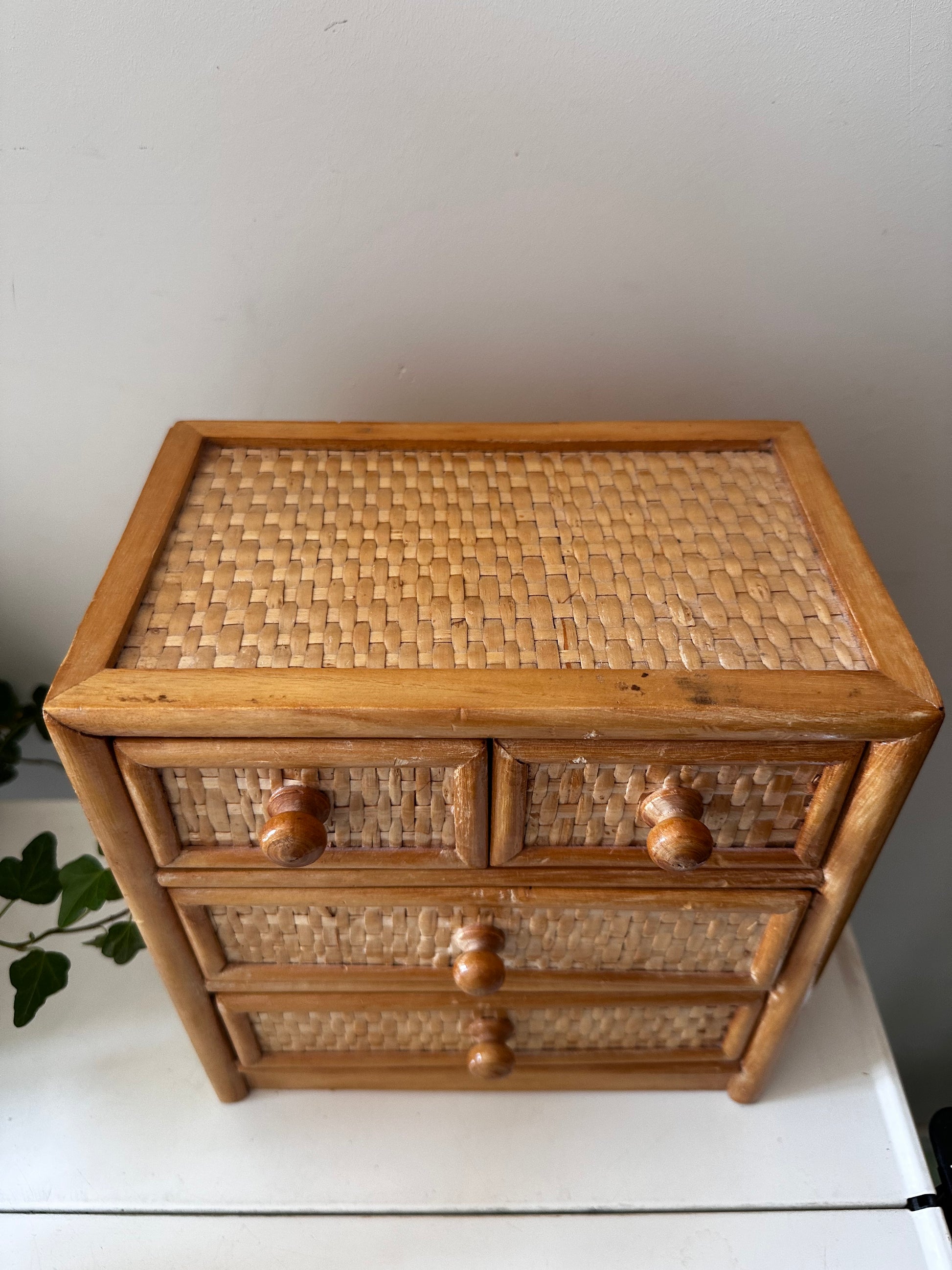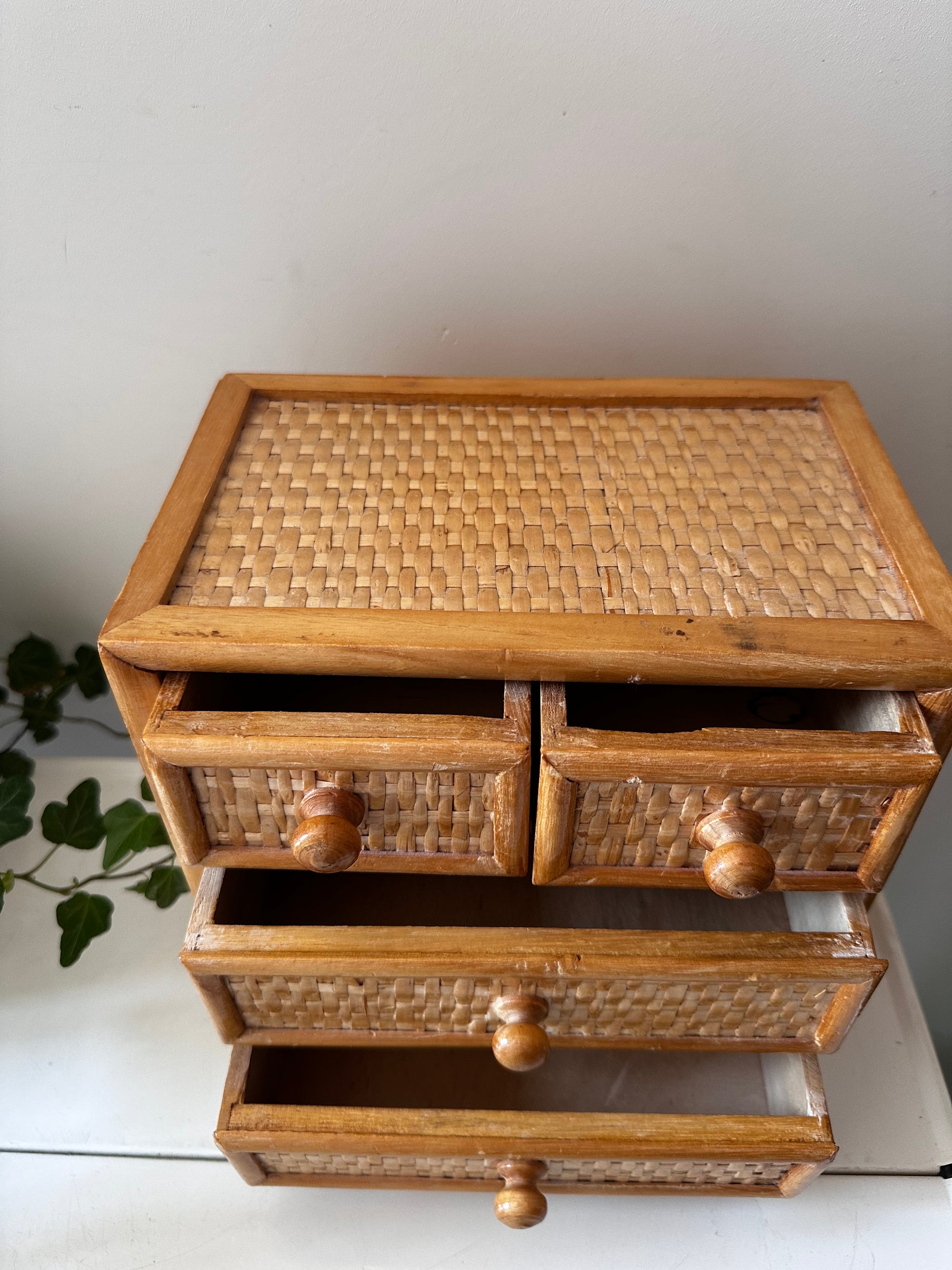 Tof klein kastje met vier lades, gemaakt van hout met gevlochten rotan panelen. Ideaal voor sieraden, knutselspullen of op je bureau. Heeft wat lichte gebruikssporen, maar dat maakt ’m alleen maar gezelliger.