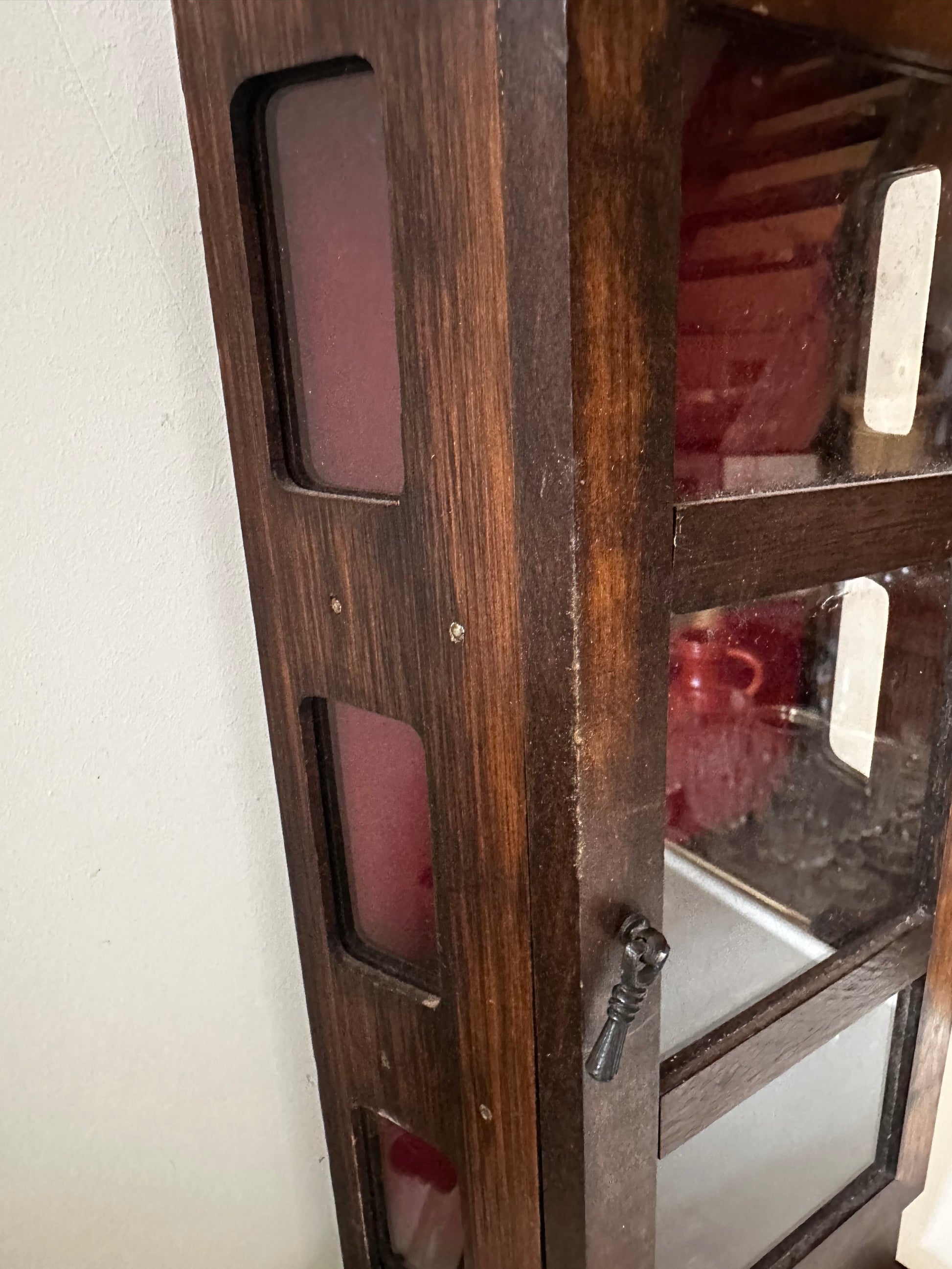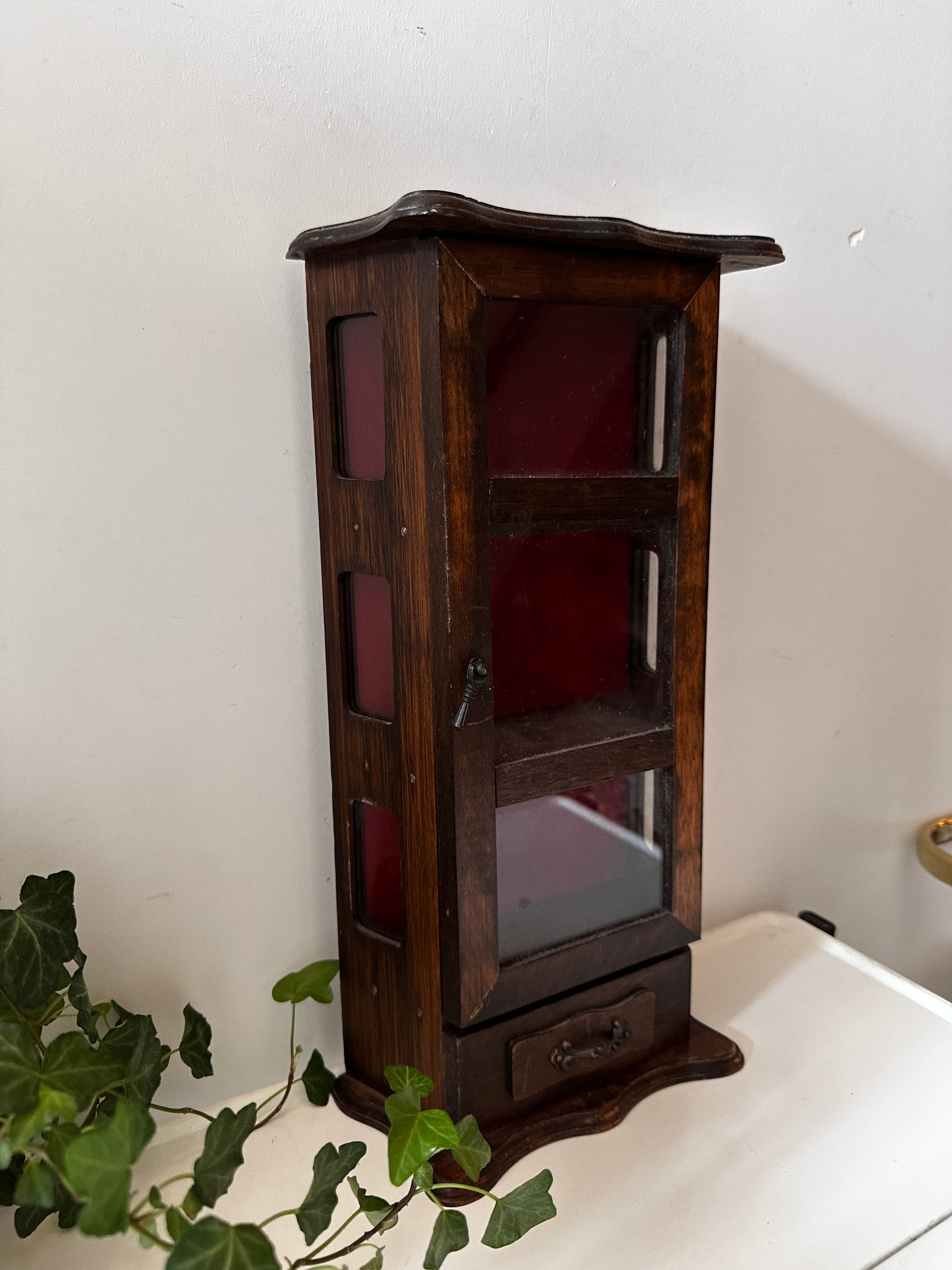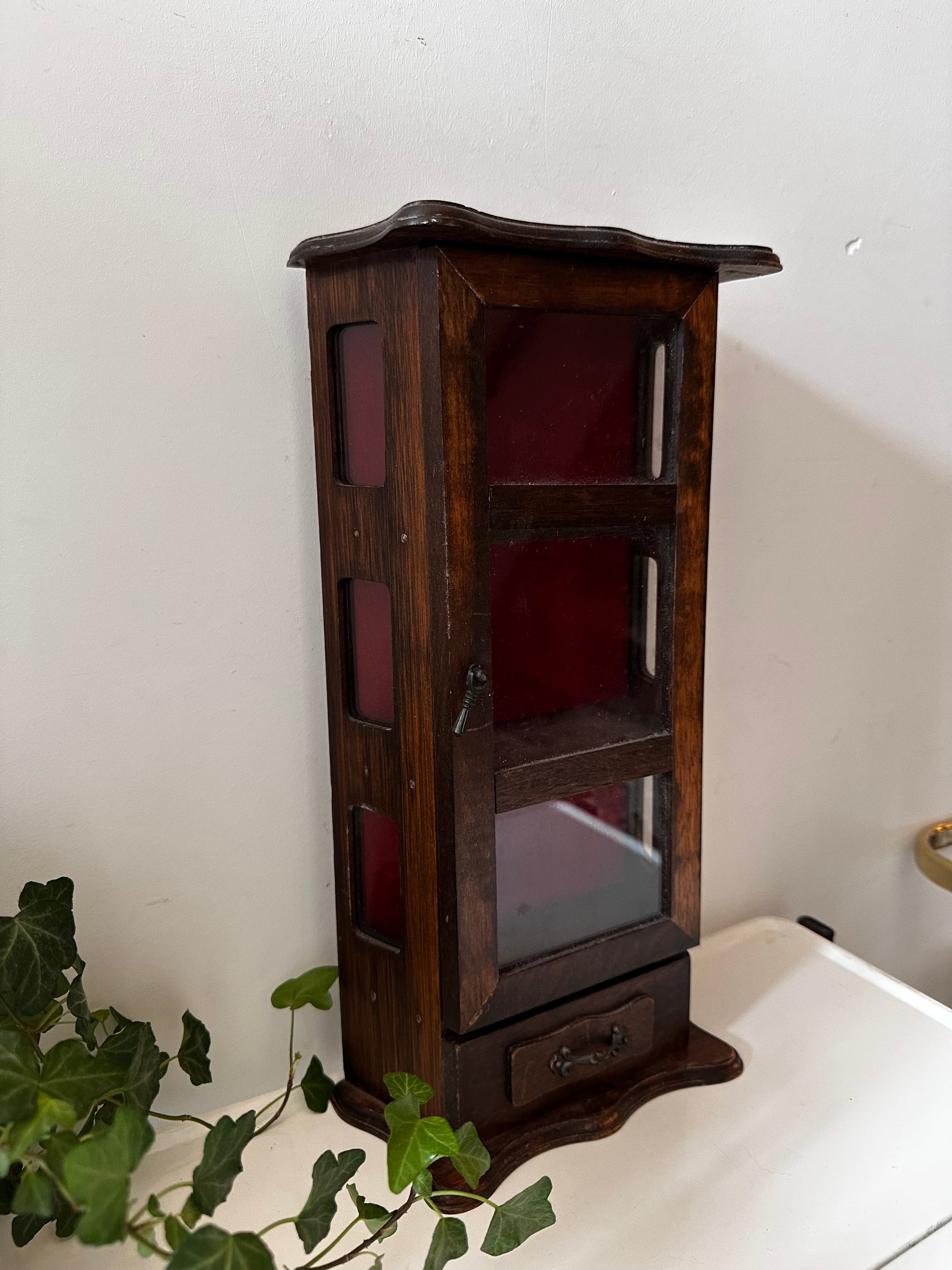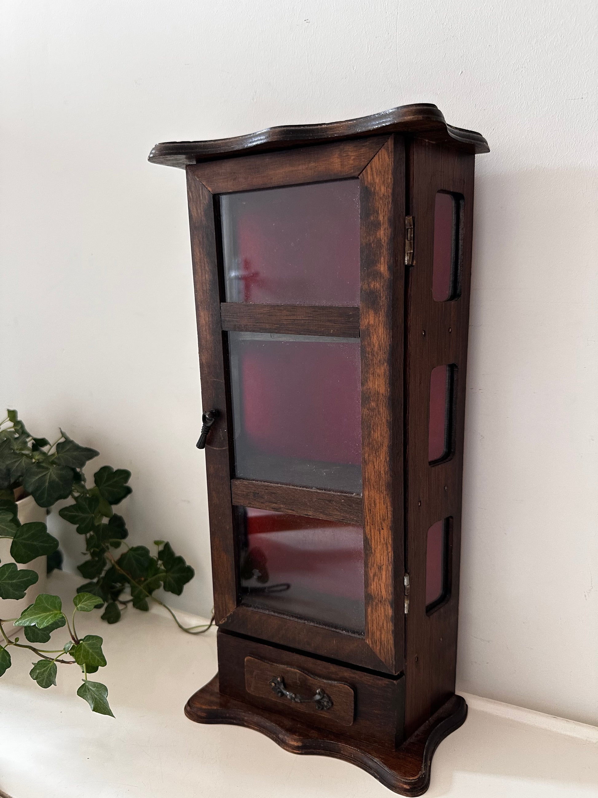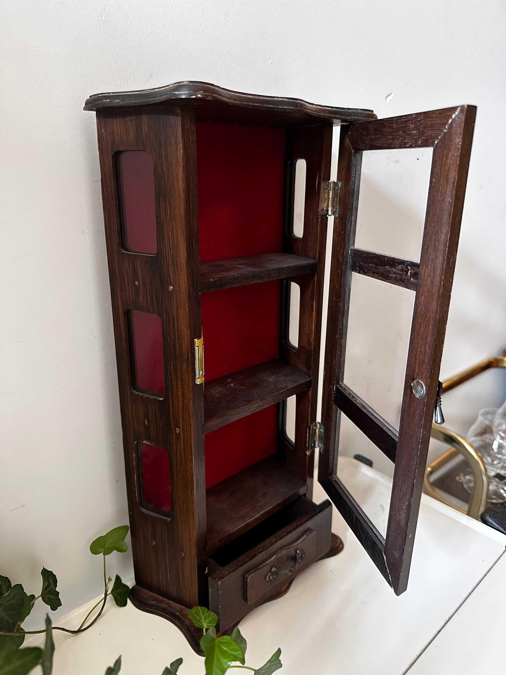 Supertof compact vitrinekastje van donker hout met glazen deur en zijruitjes. Binnenin drie plankjes en onderin een klein laatje – handig voor sieraden, kleine vondsten of curiosa. De rode achterwand geeft ‘m een mooie uitstraling. In mooie vintage staat met wat lichte sporen van gebruik. Q106