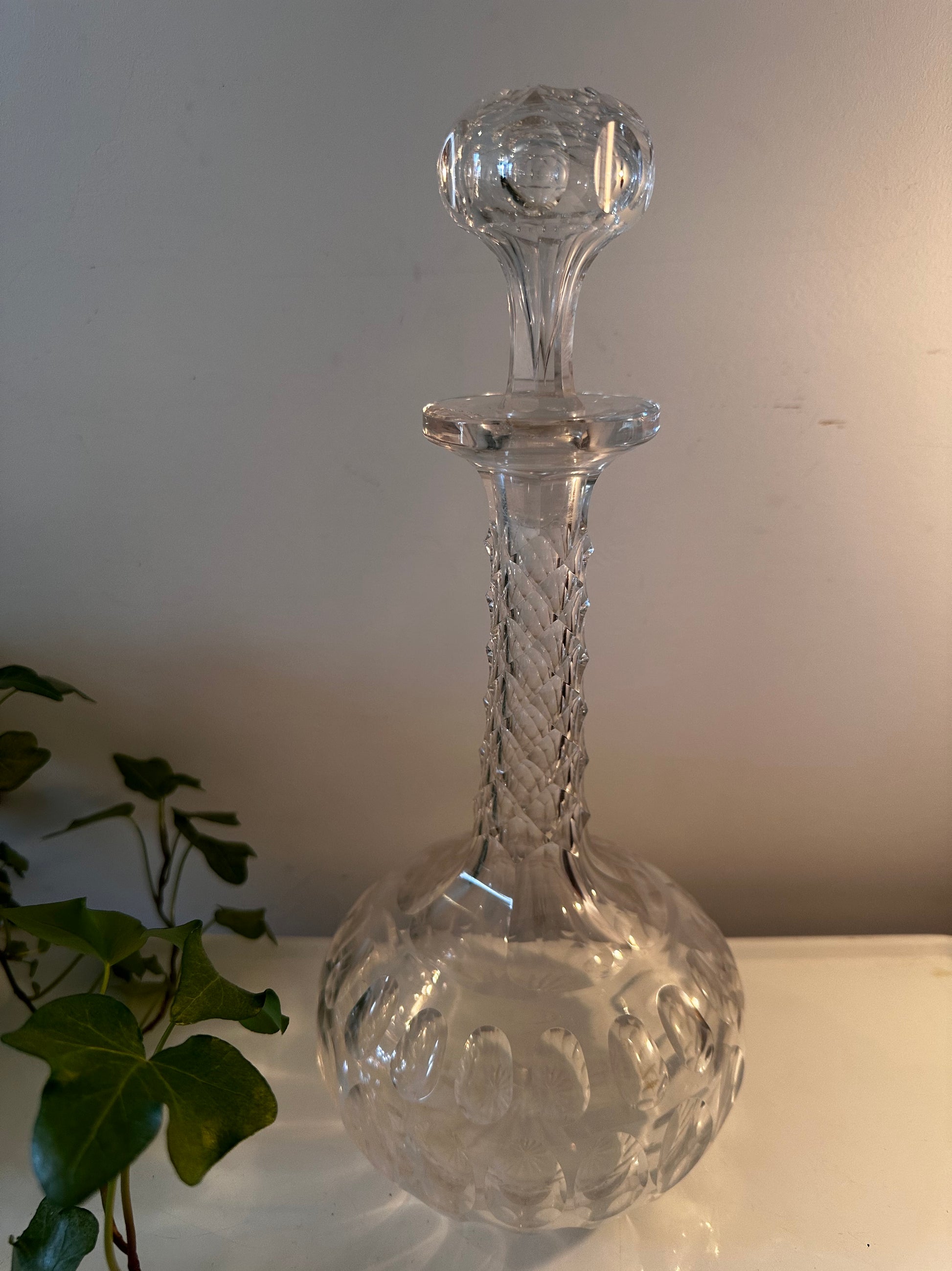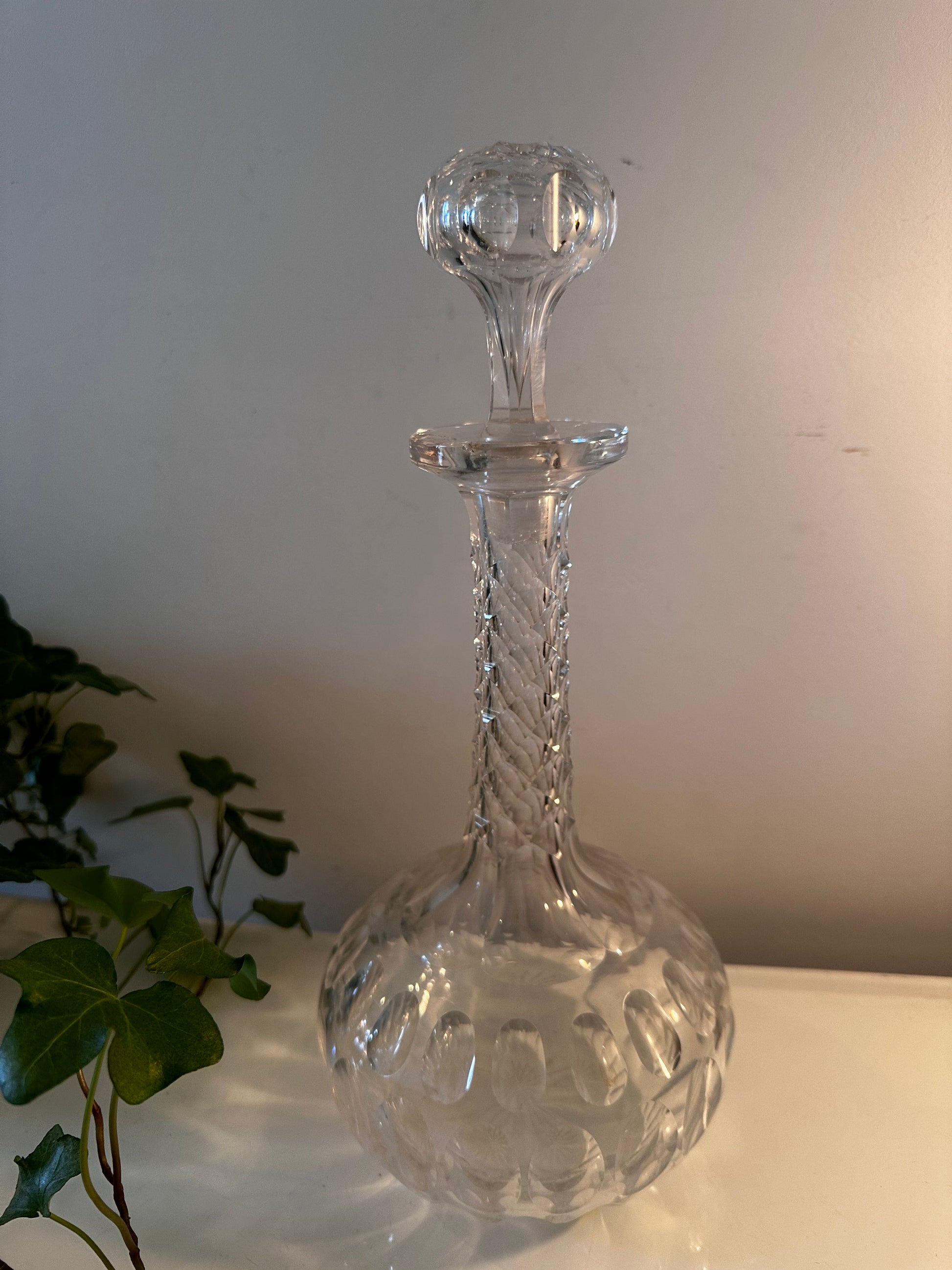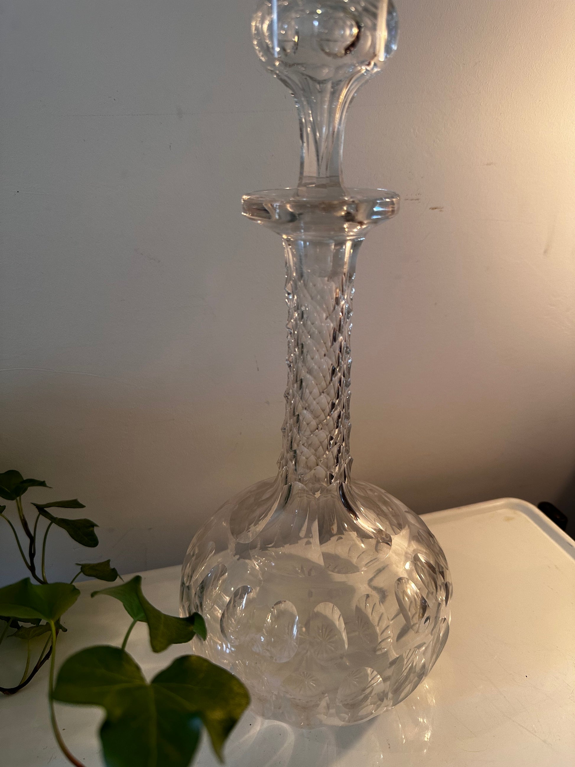 Een pracht van een kristallen karaf. In een supermooie vintage staat. De karaf heeft een wonderschoon design en de hals een gedraaid design. De sluitknop heeft aan de onderkant wat chipjes maar daar zie je natuurlijk niks van als de dop in de fles zit. Karaf is gemaakt van kristal en is een wat zwaarder model