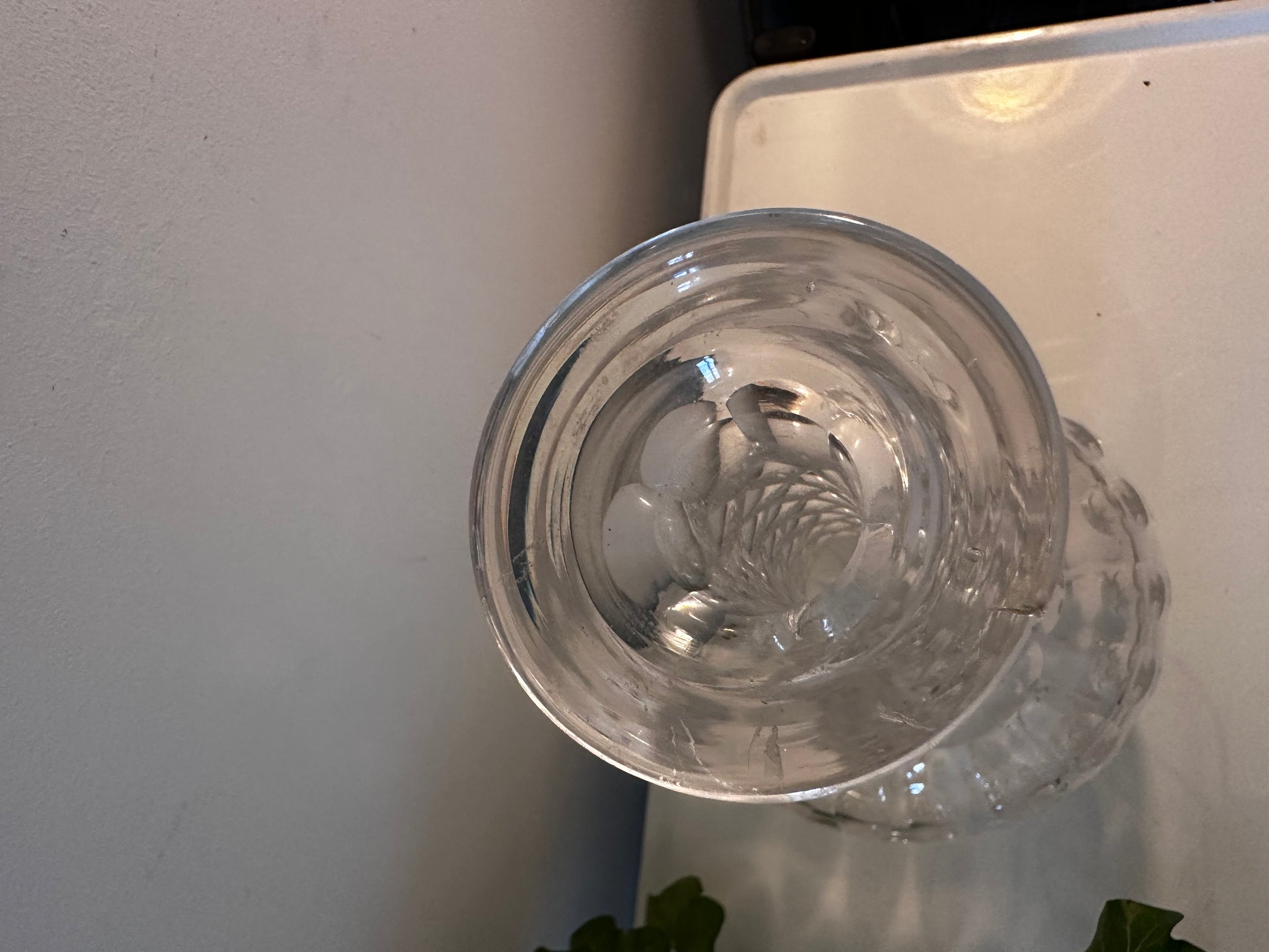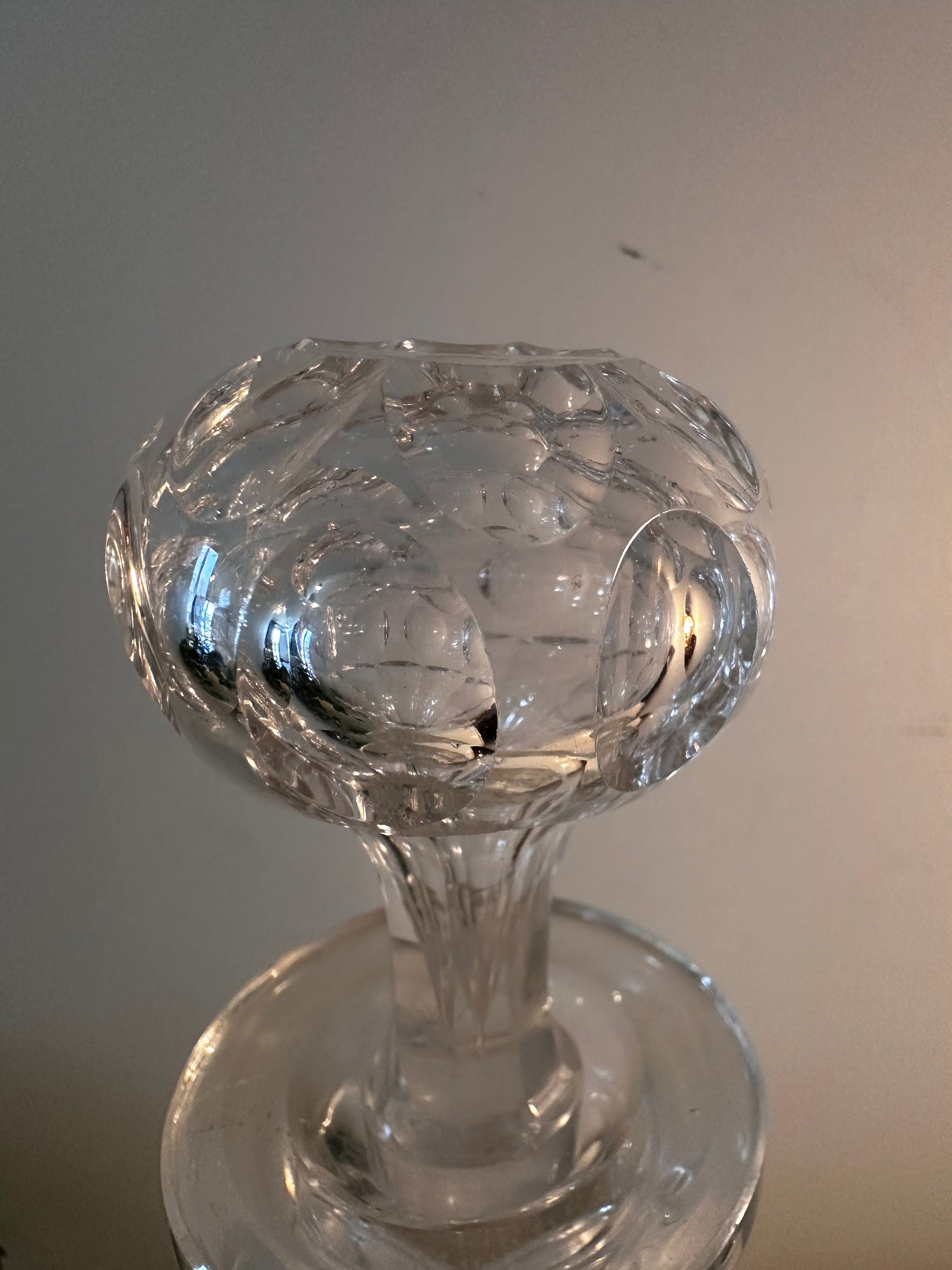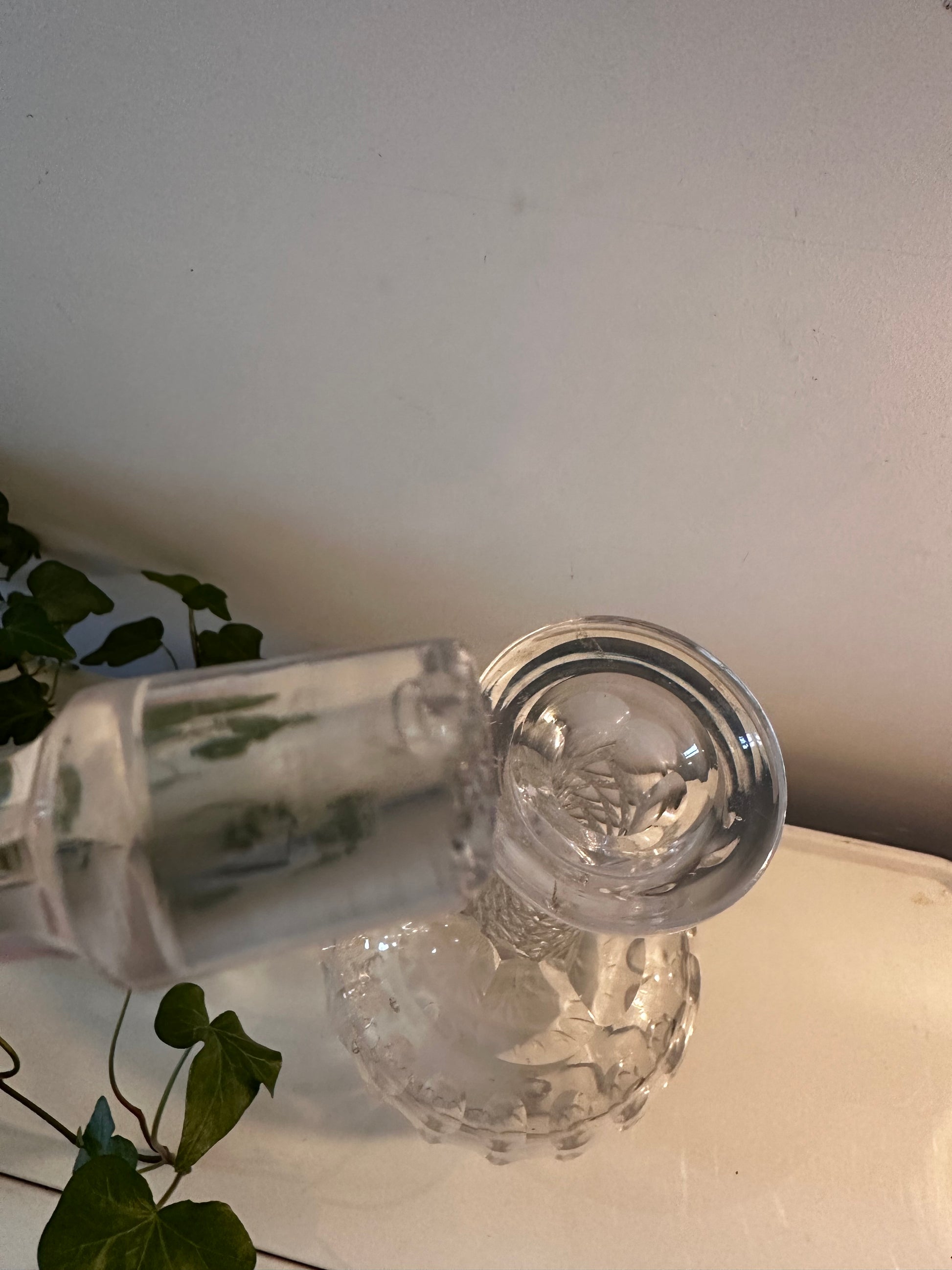 Een pracht van een kristallen karaf. In een supermooie vintage staat. De karaf heeft een wonderschoon design en de hals een gedraaid design. De sluitknop heeft aan de onderkant wat chipjes maar daar zie je natuurlijk niks van als de dop in de fles zit. Karaf is gemaakt van kristal en is een wat zwaarder model