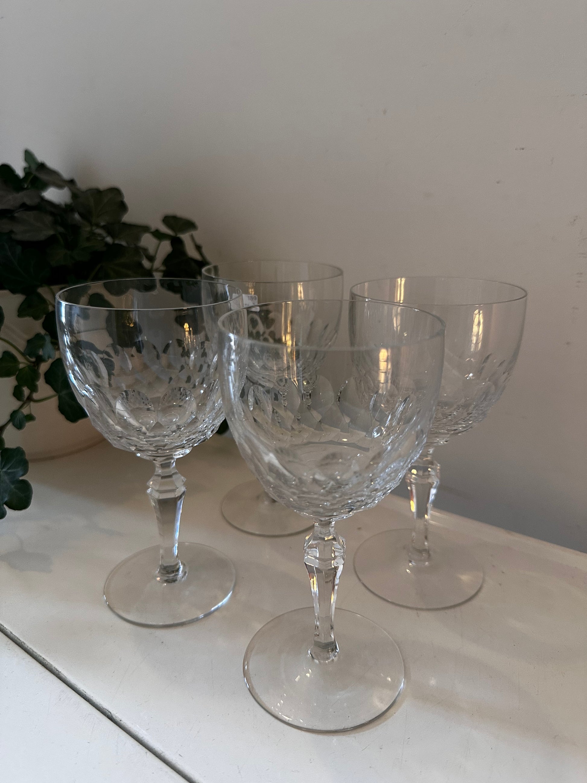Prachtige vintage wijnglazen van helder kristal, met een verfijnd geslepen patroon en elegante steel. In een supermooie vintage staat. Q831