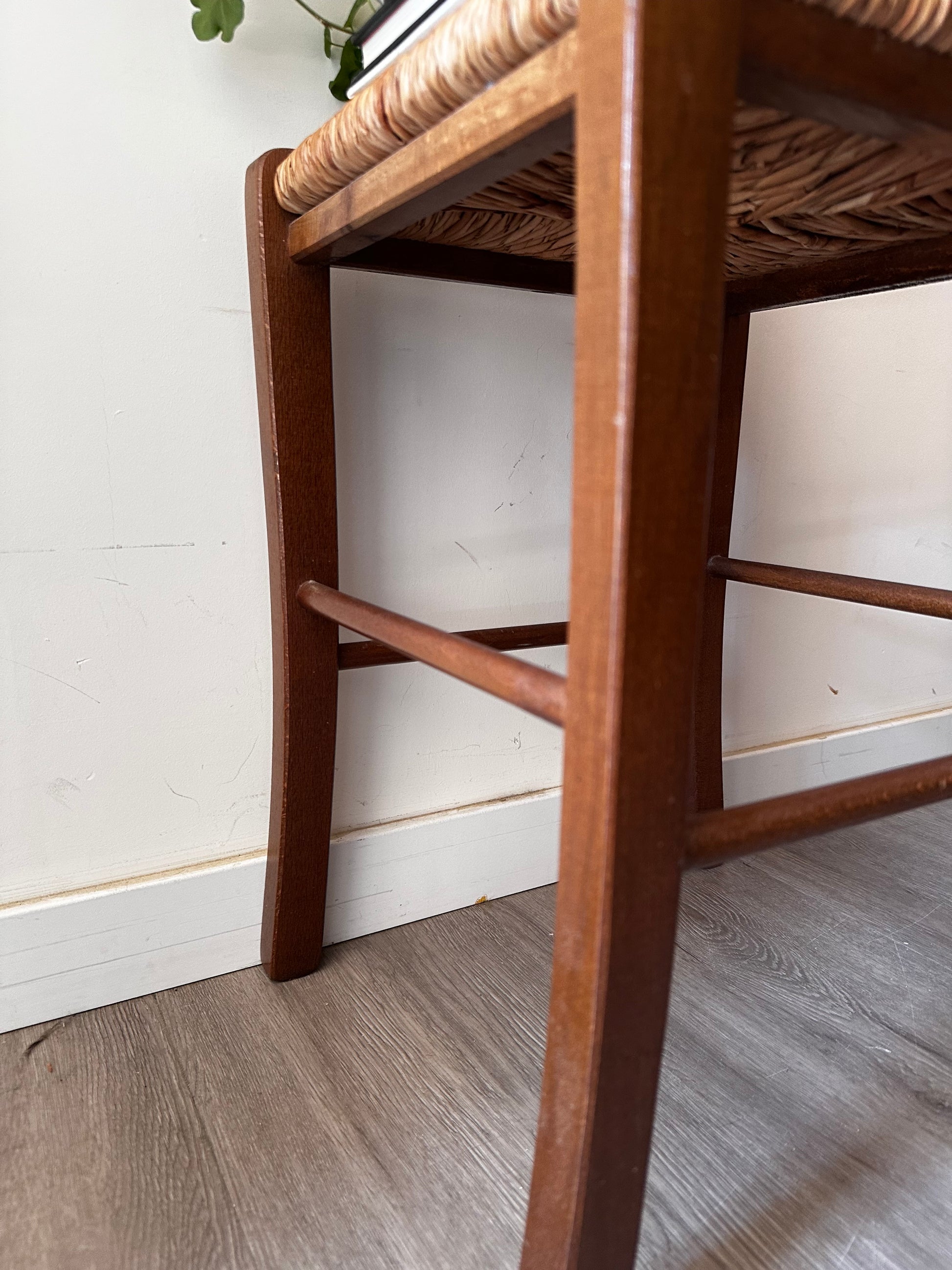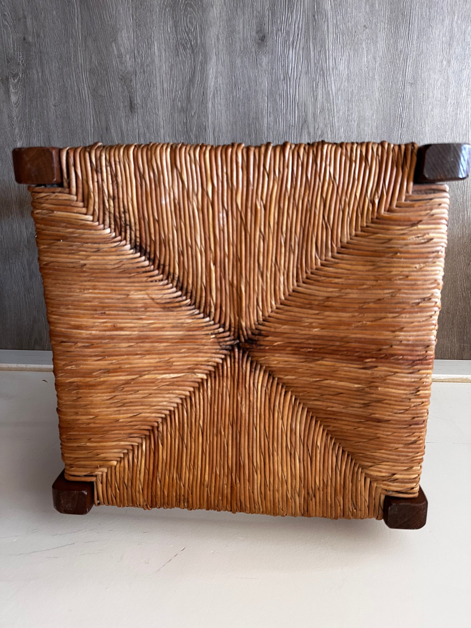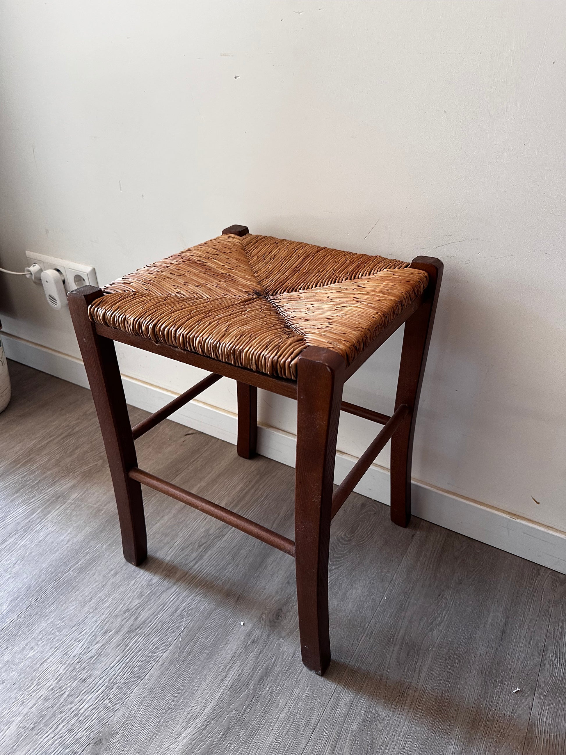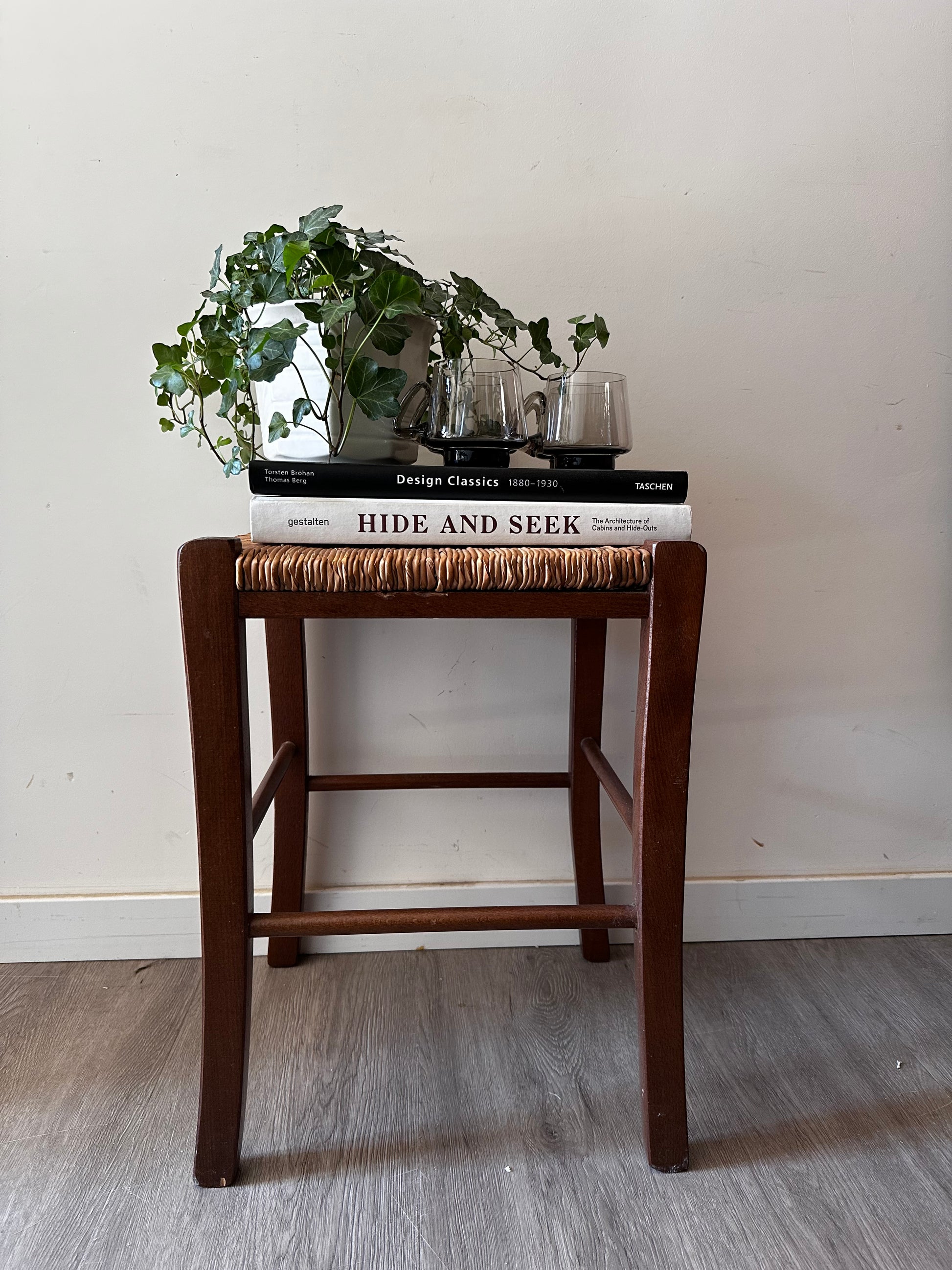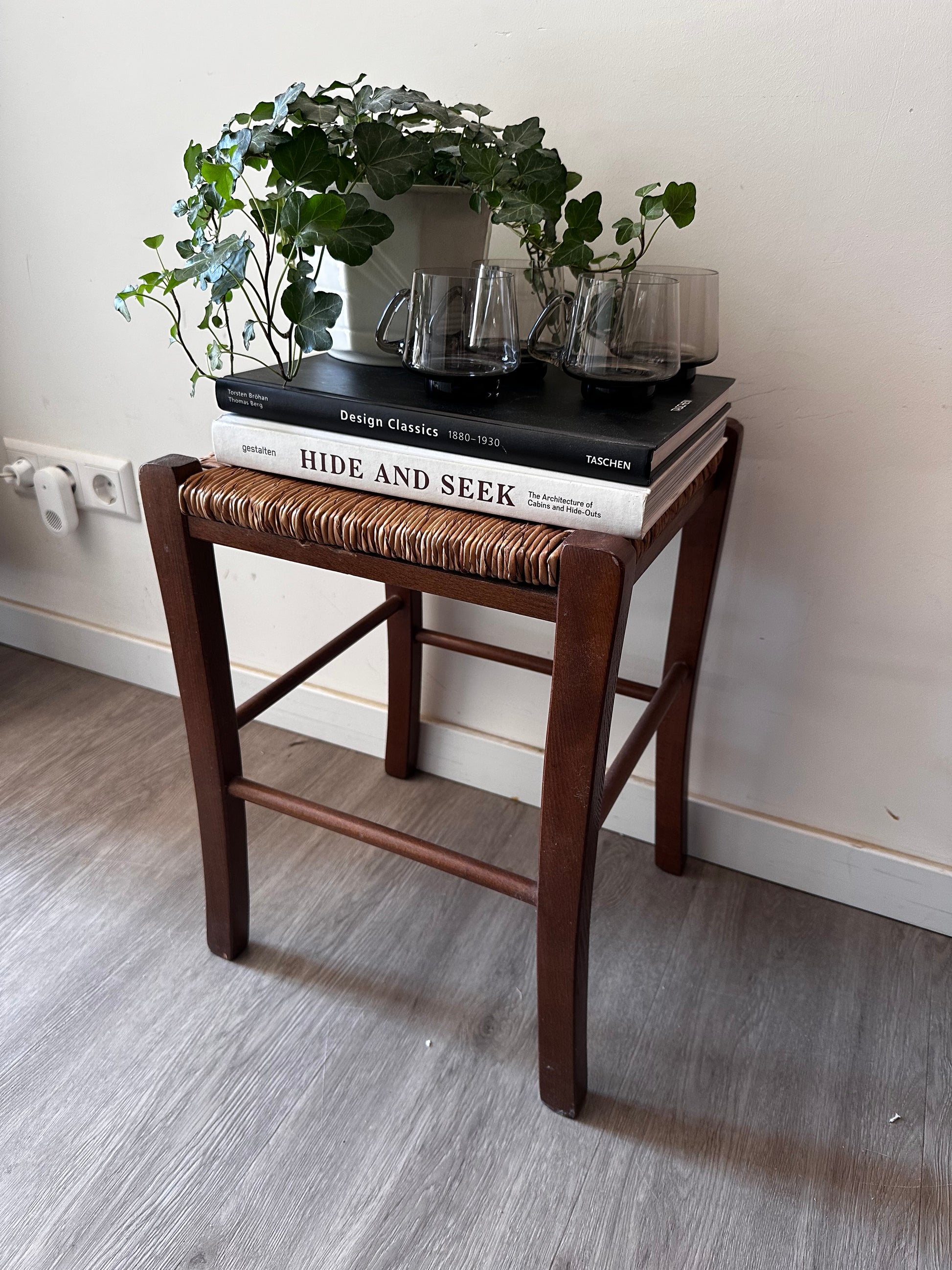 Superleuk houten krukje met gevlochten rieten zitting. Het krukje heeft een warme houtkleur en een stevige constructie. Gebruik ’m als bijzettafel of te gek plantentafeltje.