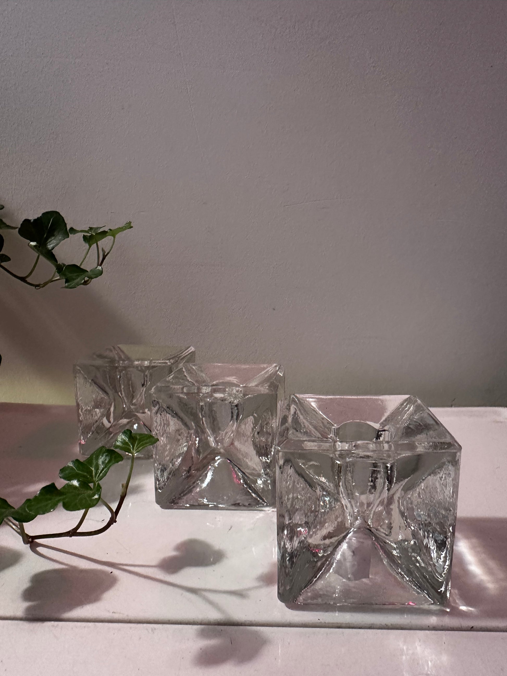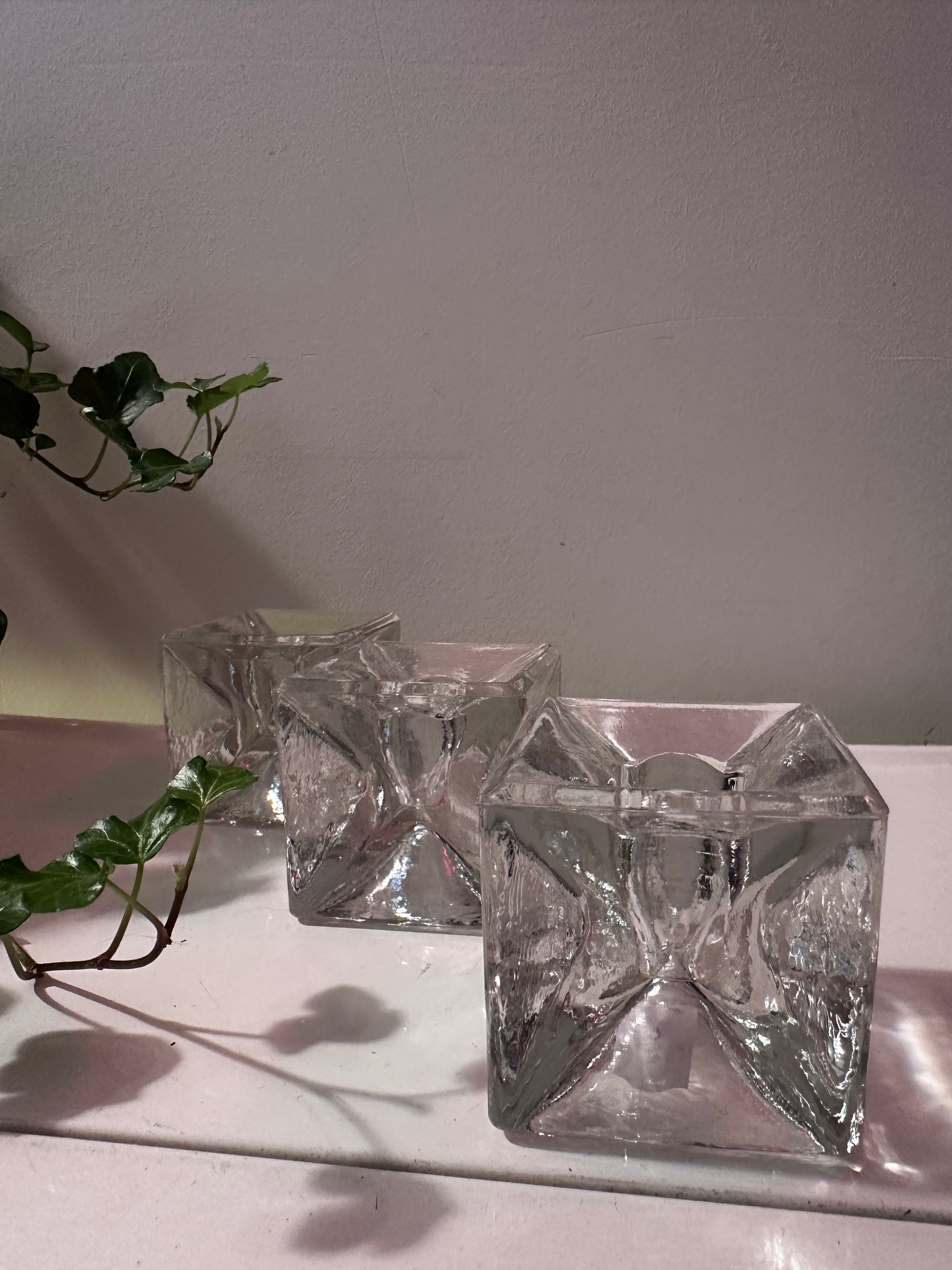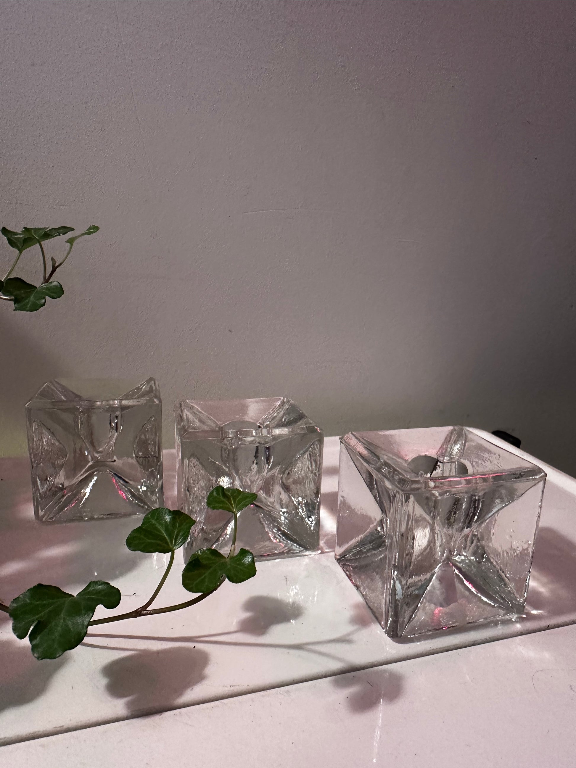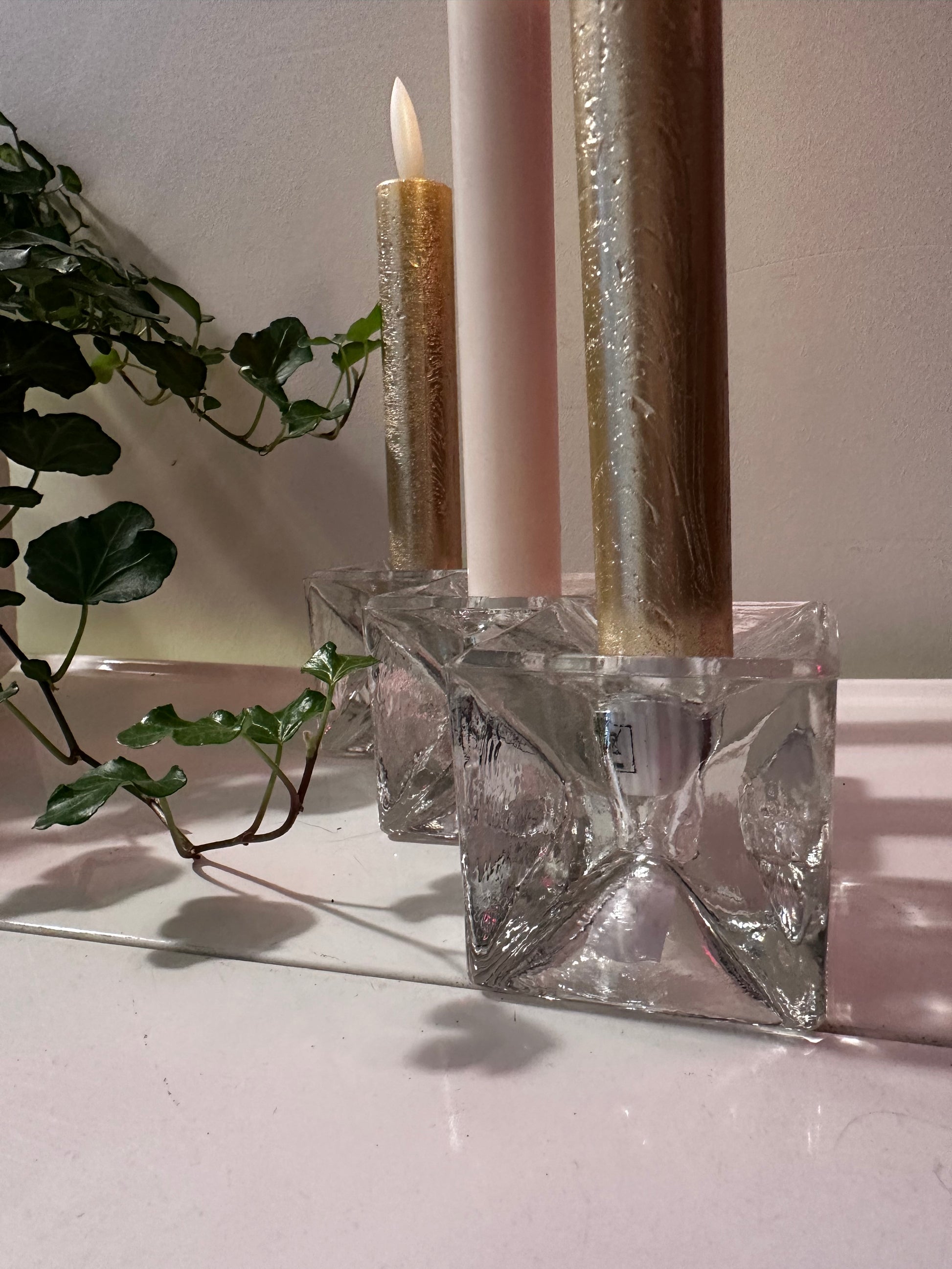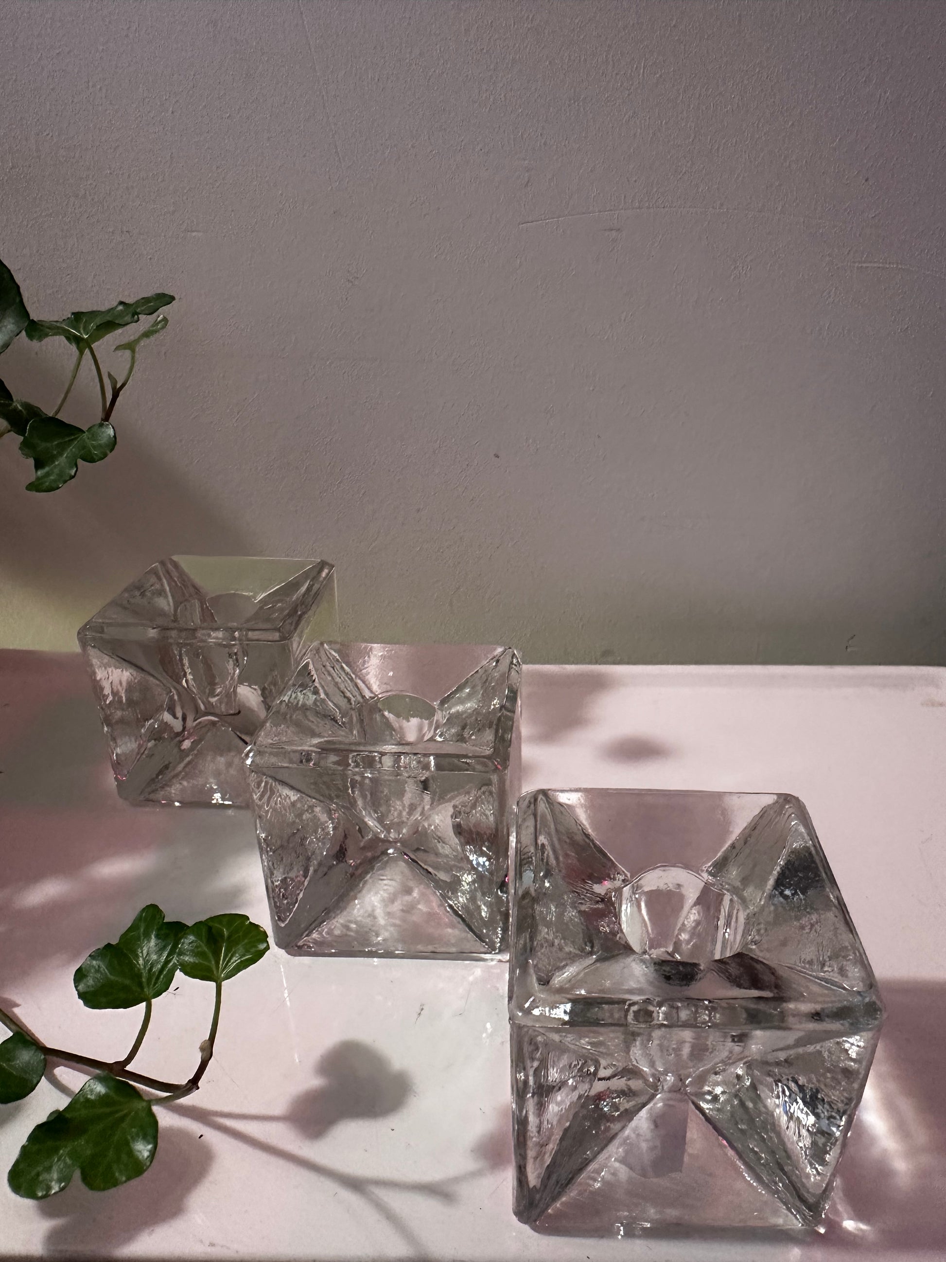 Prachtige set Scandinavisch design kandelaars. Kandelaars zijn van kristal. Kandelaars hebben een space age design. Deze kubuskandelaars zijn in een uitstekende staat. Dateren jaren 70