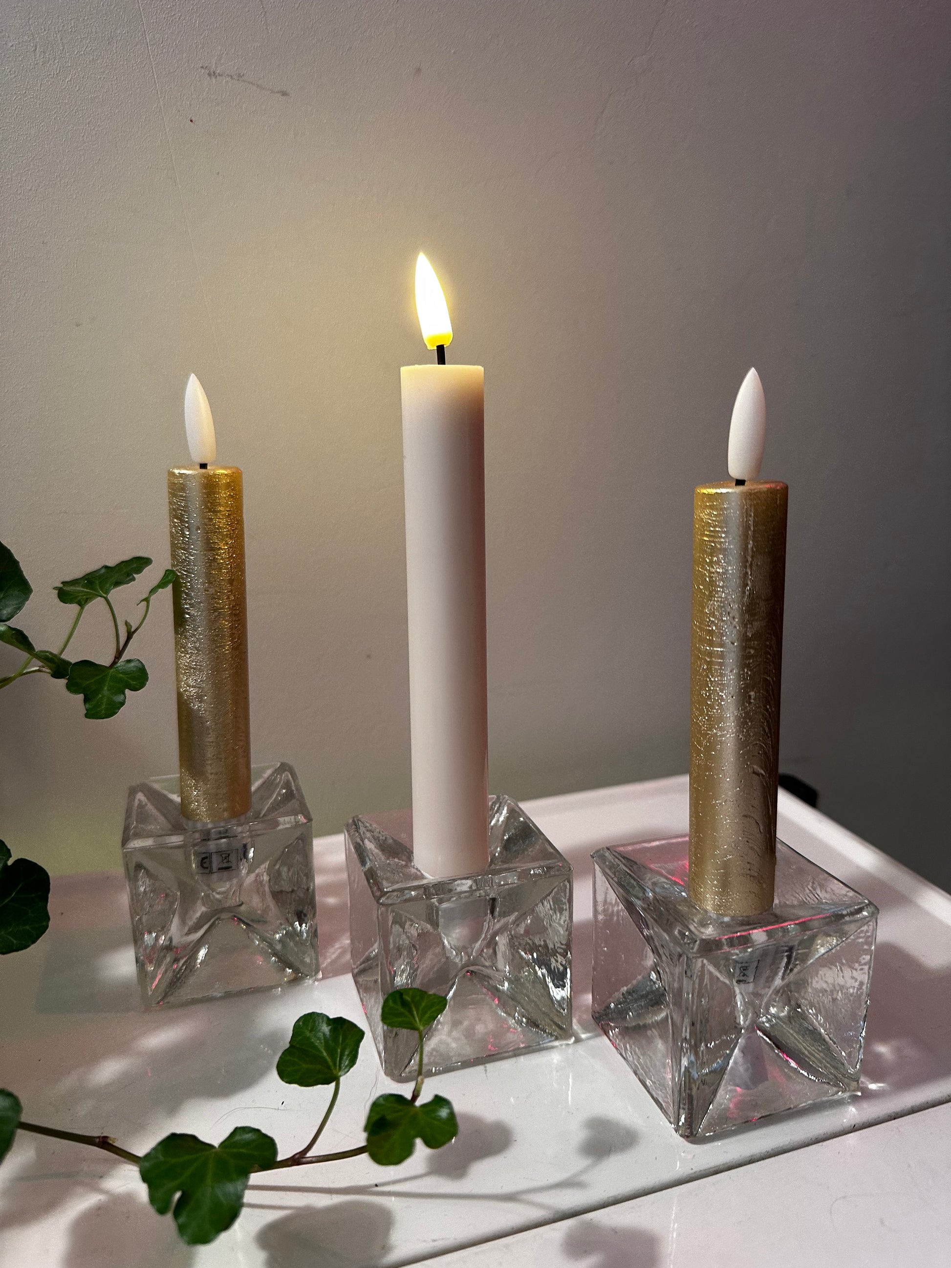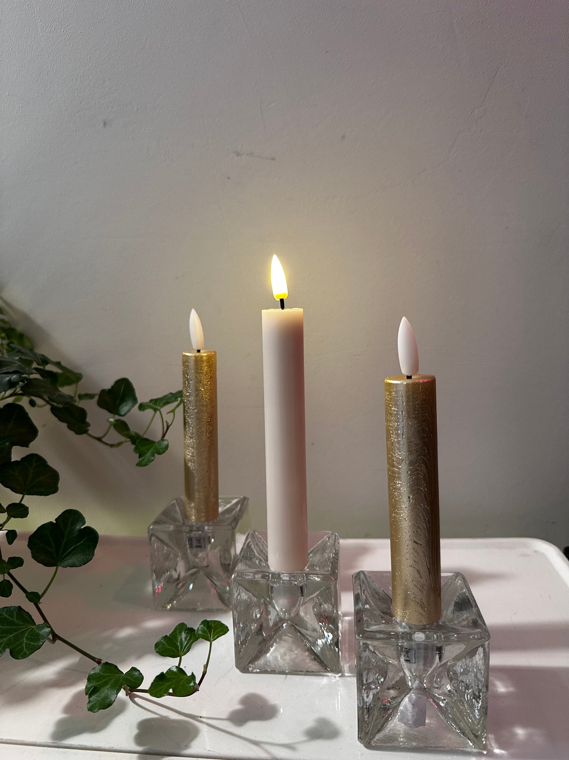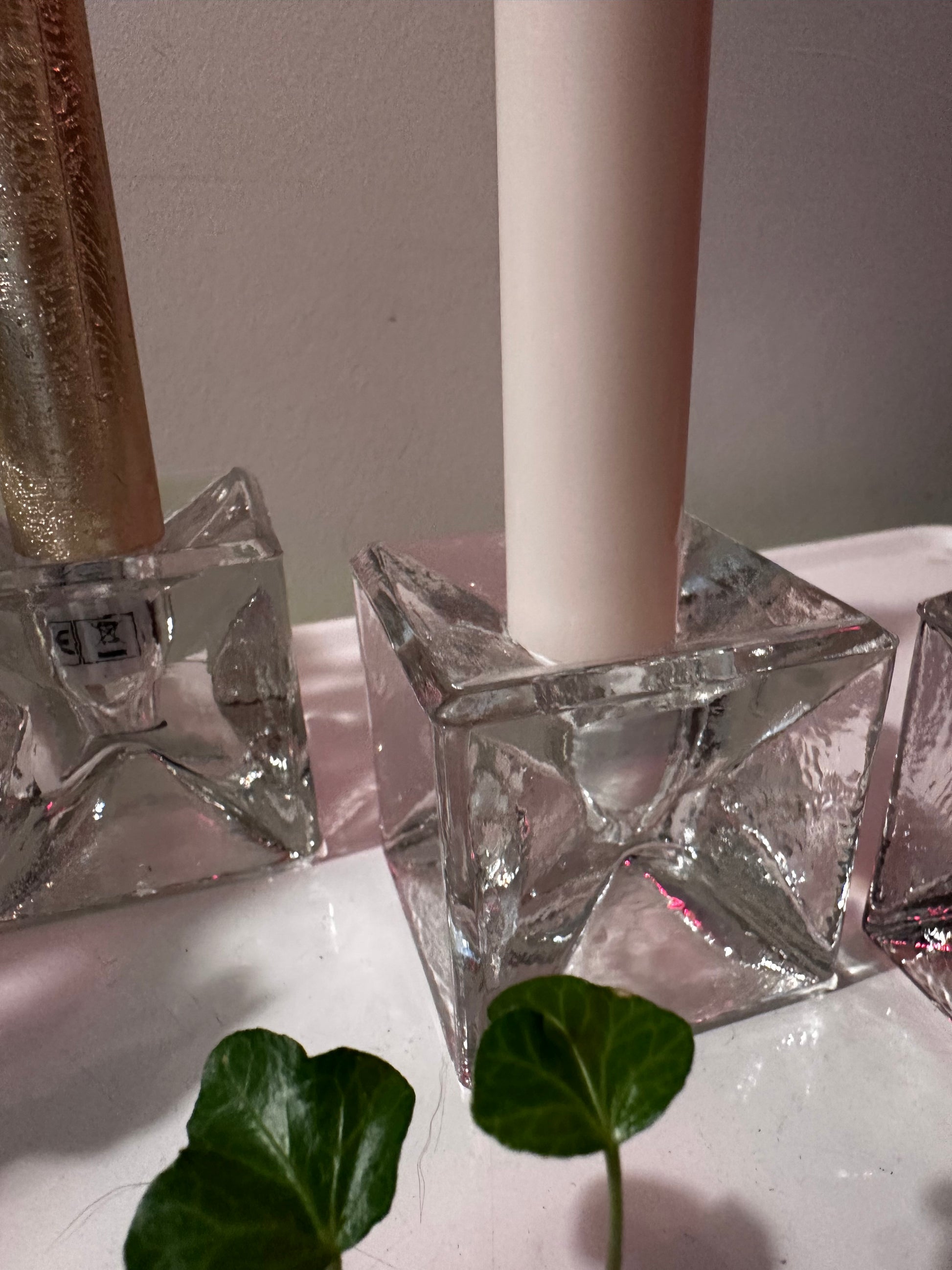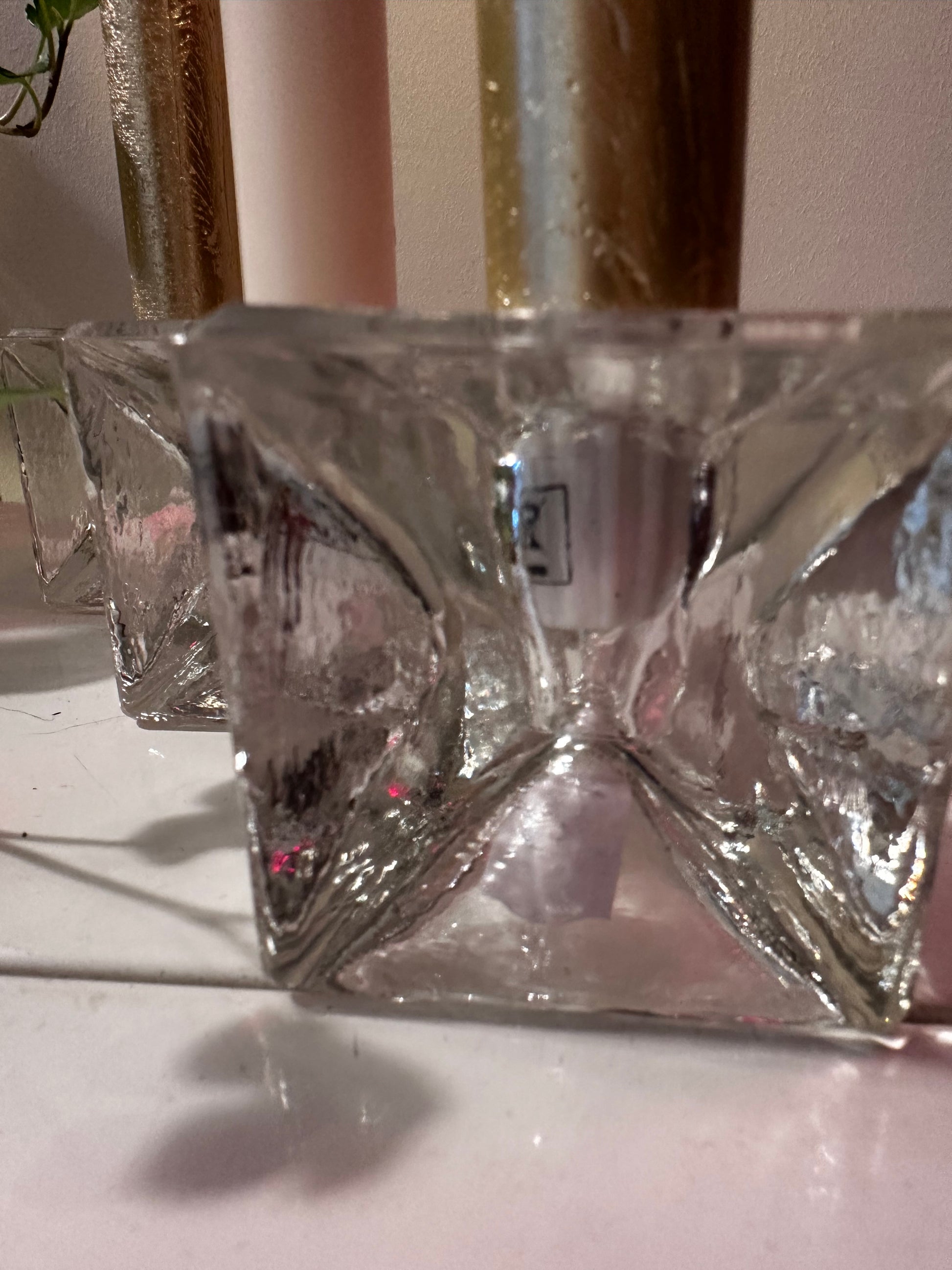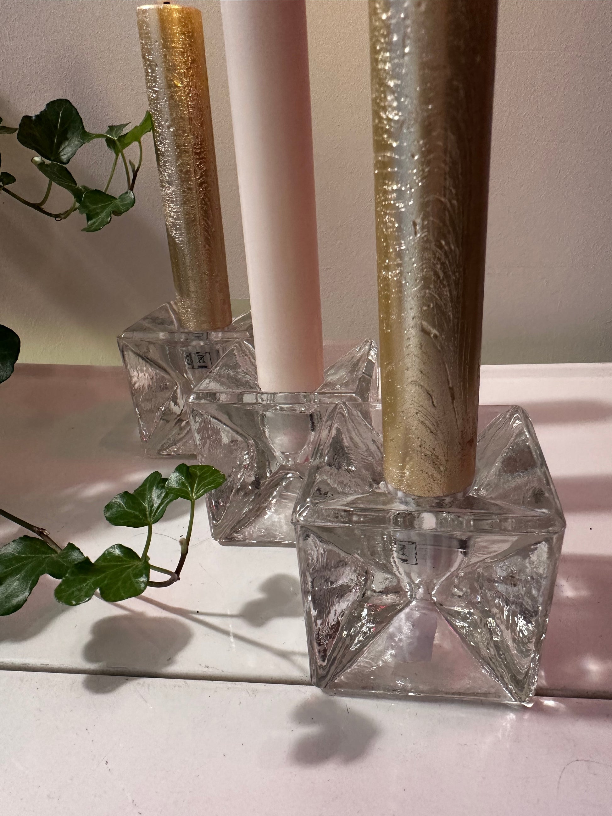 Prachtige set Scandinavisch design kandelaars. Kandelaars zijn van kristal. Kandelaars hebben een space age design. Deze kubuskandelaars zijn in een uitstekende staat. Dateren jaren 70