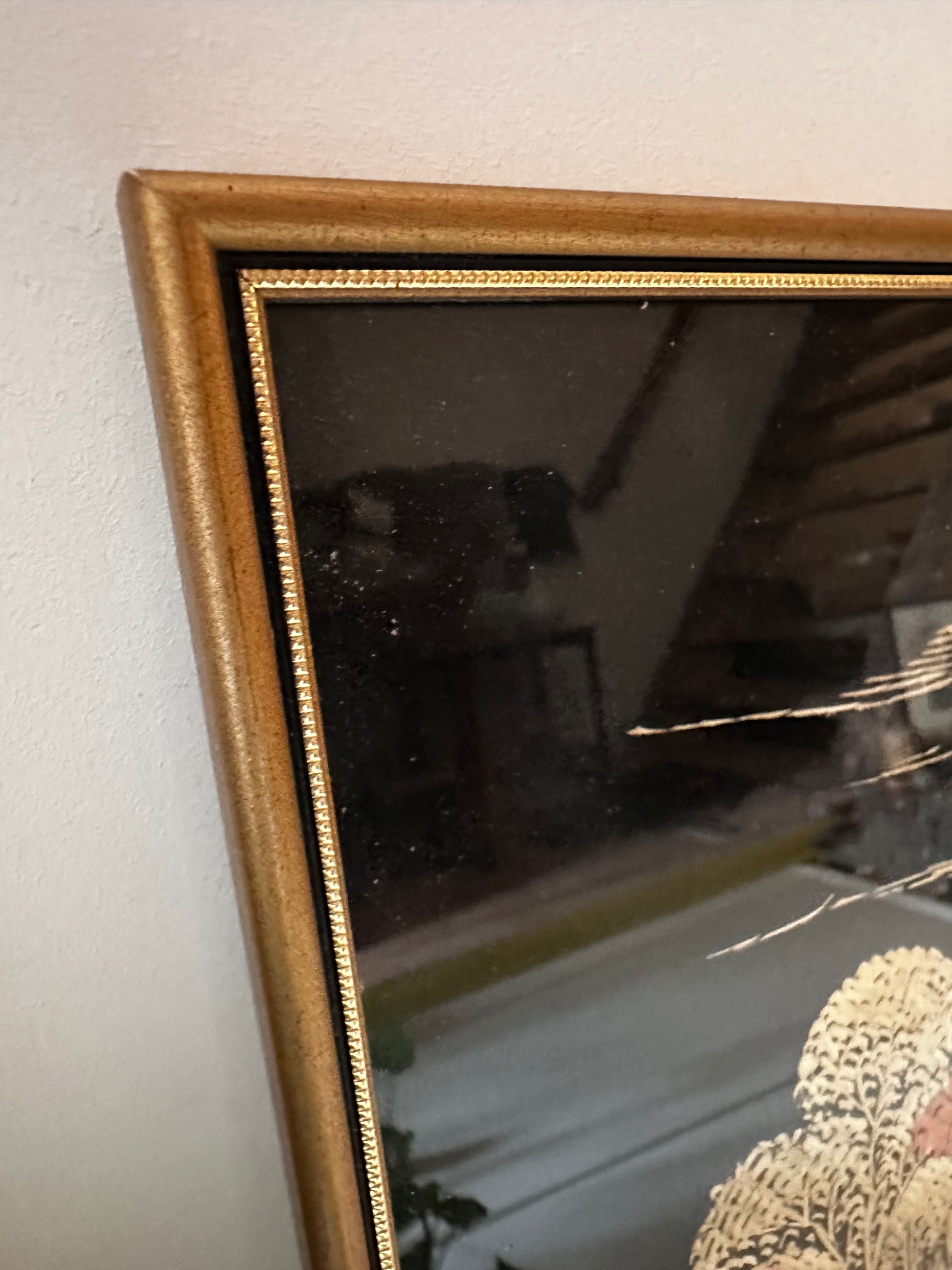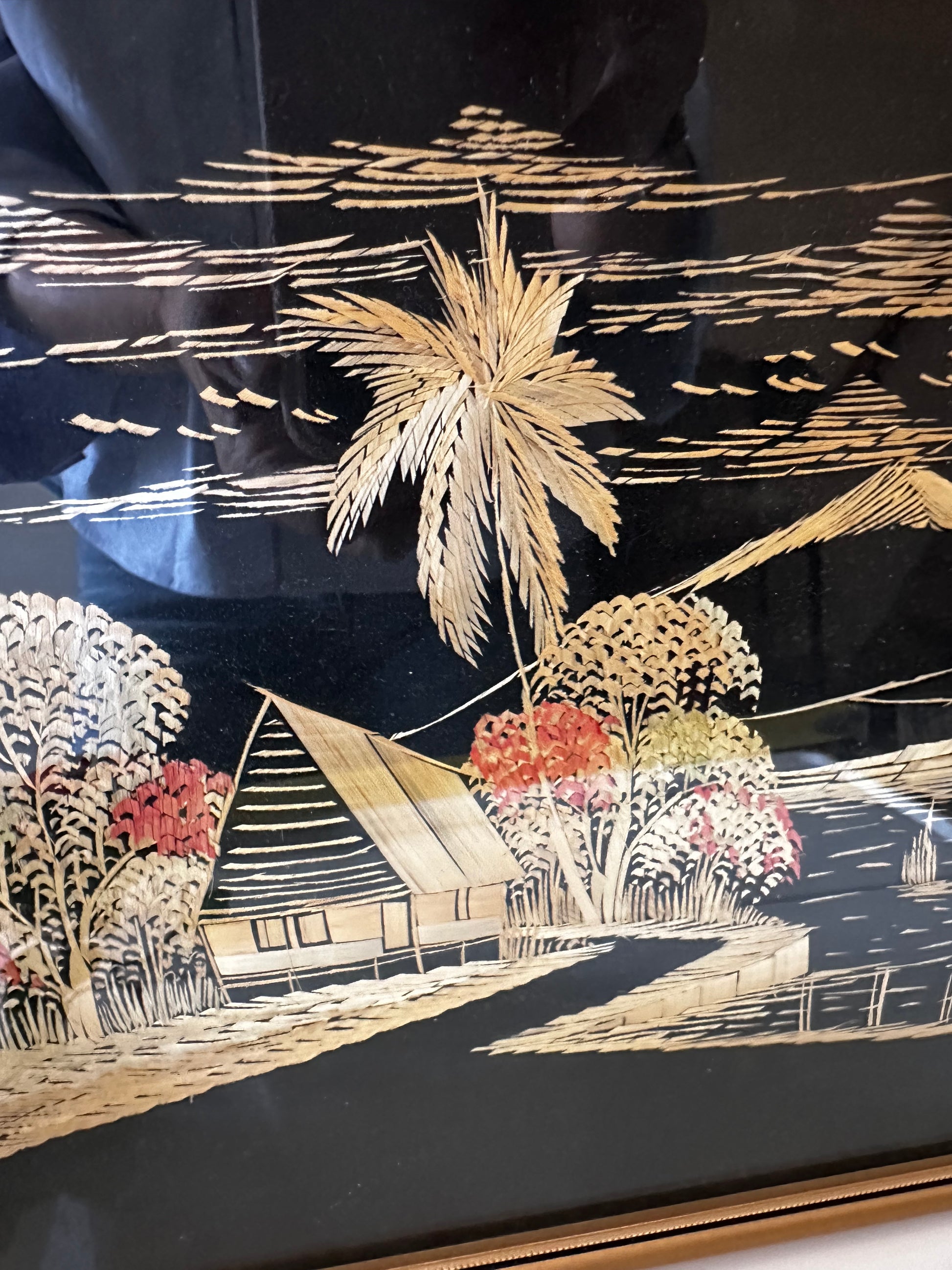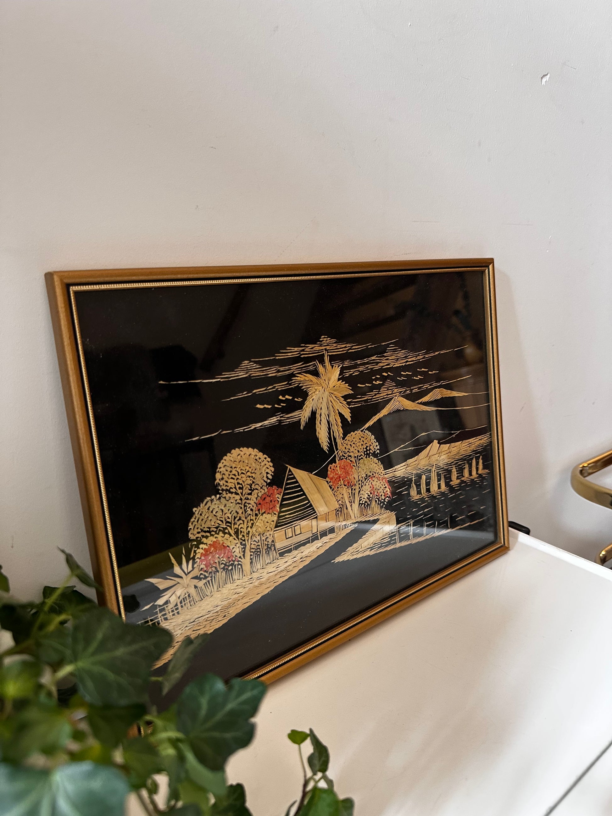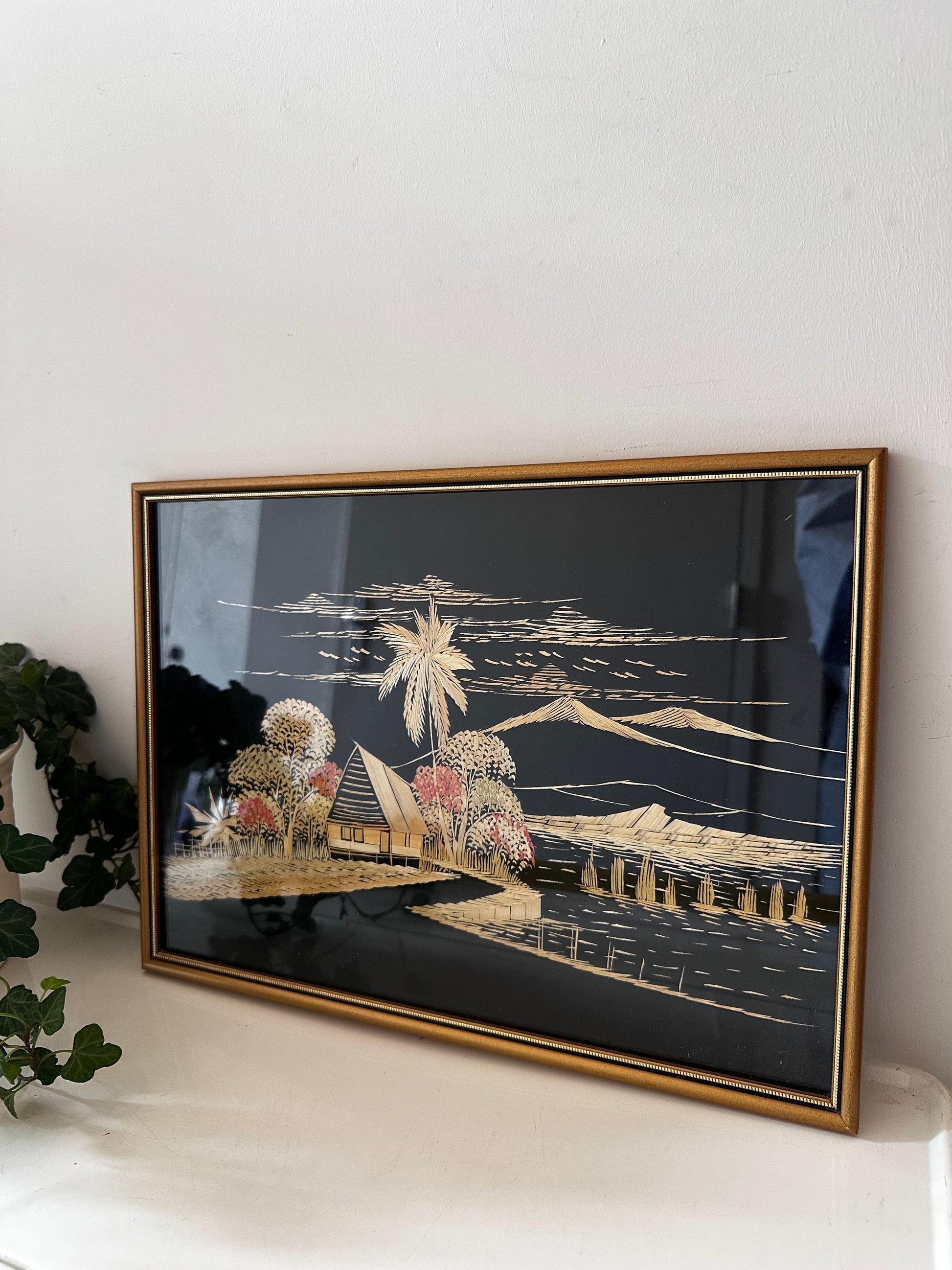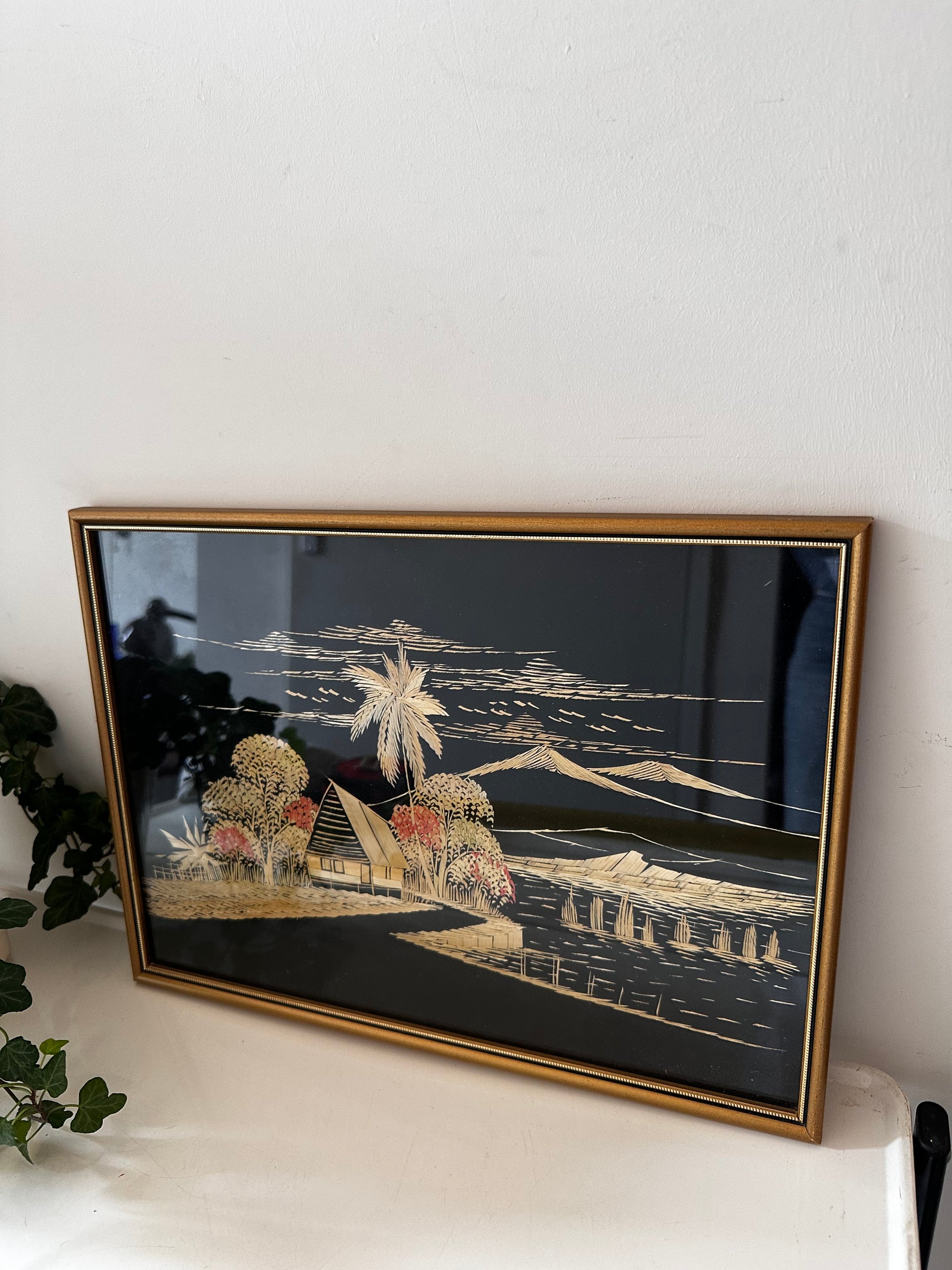 Bijzondere prent gemaakt van inlegwerk met echt stro. Tropisch landschap met een hutje, palmbomen, rijstvelden en bergen op een zwarte achtergrond. Reflecteert prachtig in het licht en is ingelijst in een gouden vintage lijst.